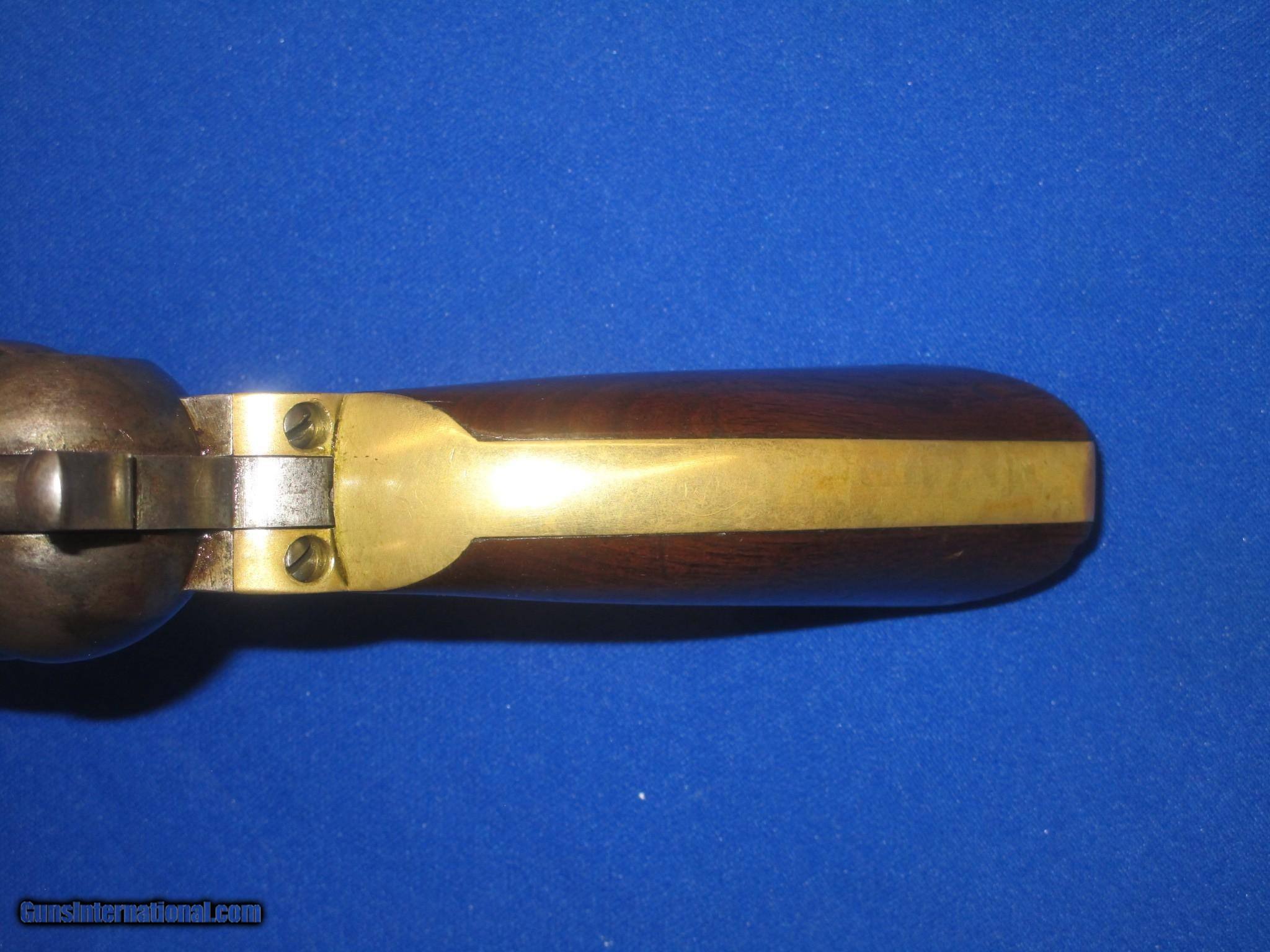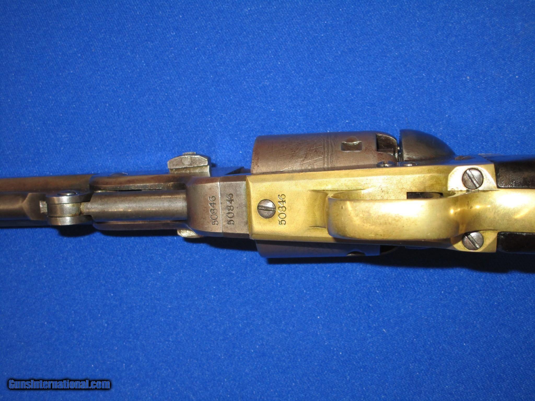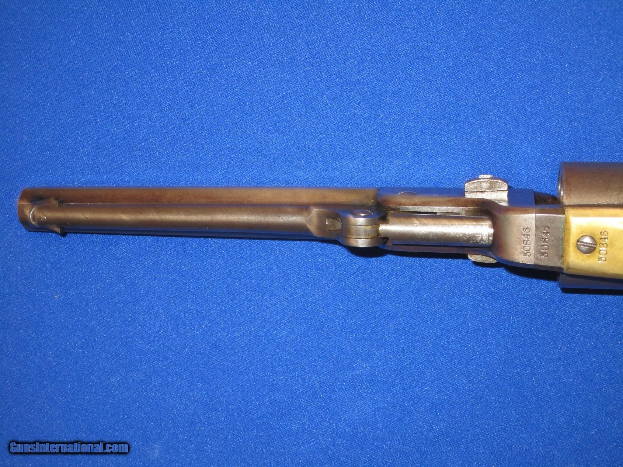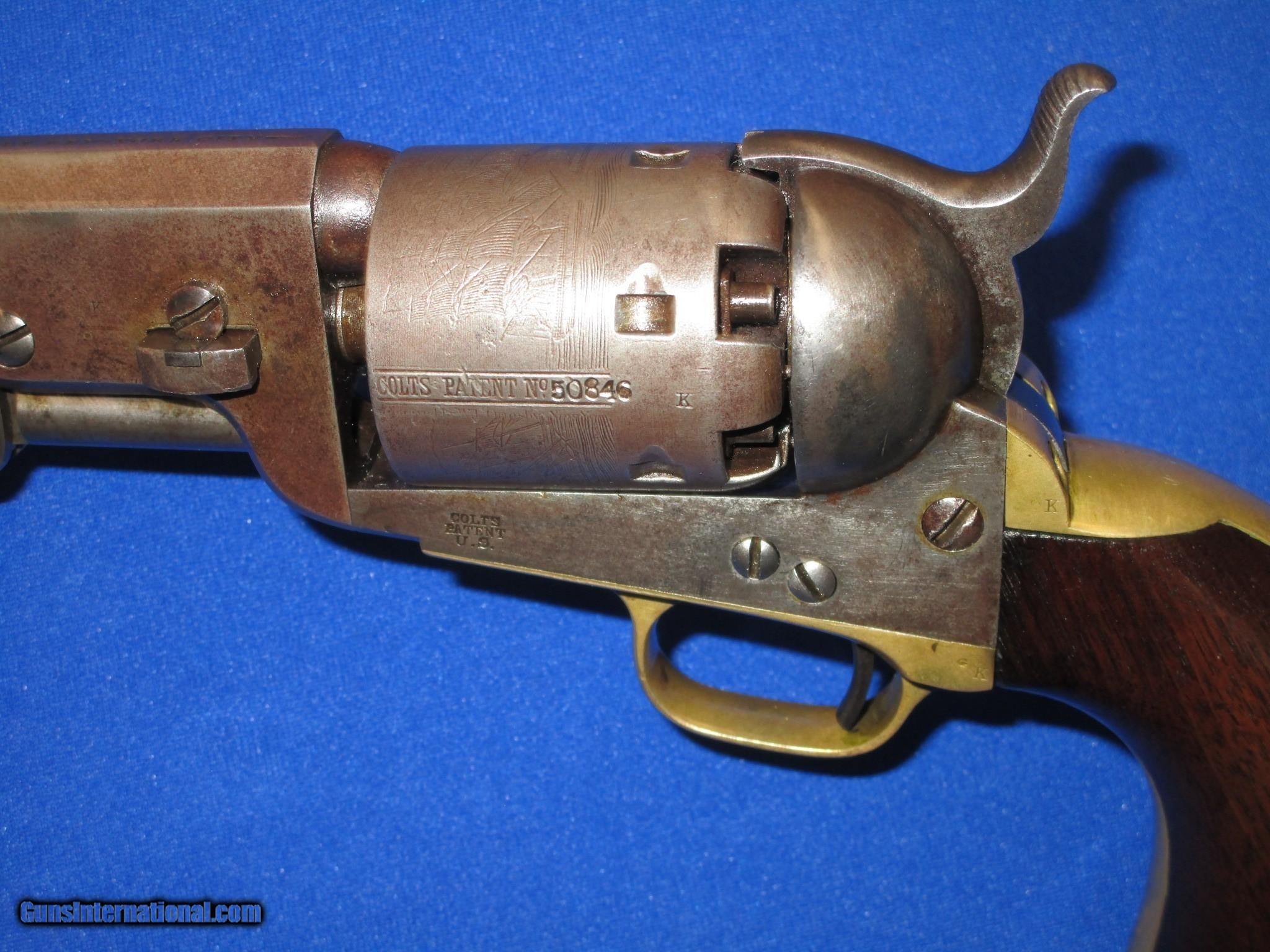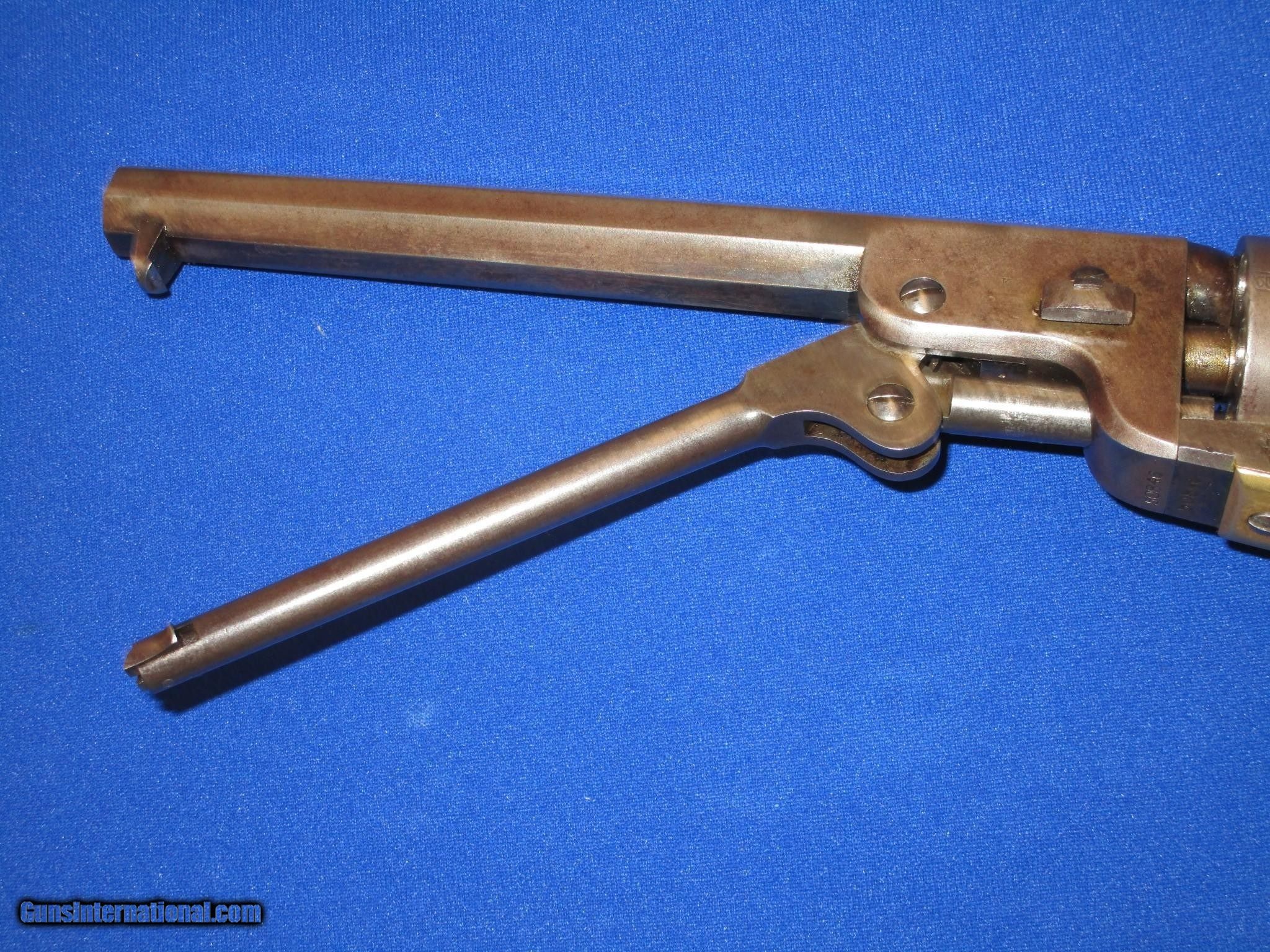 Description: AN EARLY CIVIL WAR MILITARY ISSUED COLT MODEL 1851 PERCUSSION NAVY REVOLVER IN FINE UNTOUCHED CONDITION. SERIAL #50,846, ALL MATCHING NUMBERS INCLUDING THE WEDGE. ALL ORIGINAL & COMPLETE, MADE IN 1856. IT HAS THE NEW YORK ADDRESS ON THE BARREL. THE REVOLVER HAS FINE METAL, MARKINGS AND EDGES. IT IS FULLY U.S. SUB INSPECTED. IT HAS A CLEAR AND FULL CYLINDER SCENE. ALL OF THE METAL ON THE GUN HAS A NATURAL LIGHT TO DARK PATINA ON IT. THE BRASS BACKSTRAP & TRIGGER GUARD HAVE AN UNTOUCHED MELLOW COLOR TO THEM. ALL SCREWS ARE FINE. THE GRIPS ARE VERY FINE THROUGHOUT AND FIT PERFECTLY. THEY HAVE THE CORRECT CLEAR U.S. INSPECTORS CARTOUCHE ON BOTH SIDES. THEY ARE U.S. SUB INSPECTED ON THE BOTTOM. IT HAS A VERY TIGHT ACTION & FINE BORE. THIS IS AN UNTOUCHED AND VERY FINE LOOKING ALL ORIGINAL U.S. CIVIL WAR MILITARY ISSUED COLT MODEL 1851 PERCUSSION NAVY REVOLVER MADE IN 1856! SOLD Antique: Yes Manufacturer: COLT Model: U.S. MILITARY MODEL 1851 NAVY Serial Number: 50,846 Caliber Info: .36 Condition: FINE & UNTOUCHED Metal Condition: FINE Wood Condition: FINE Bore Condition: FINE |