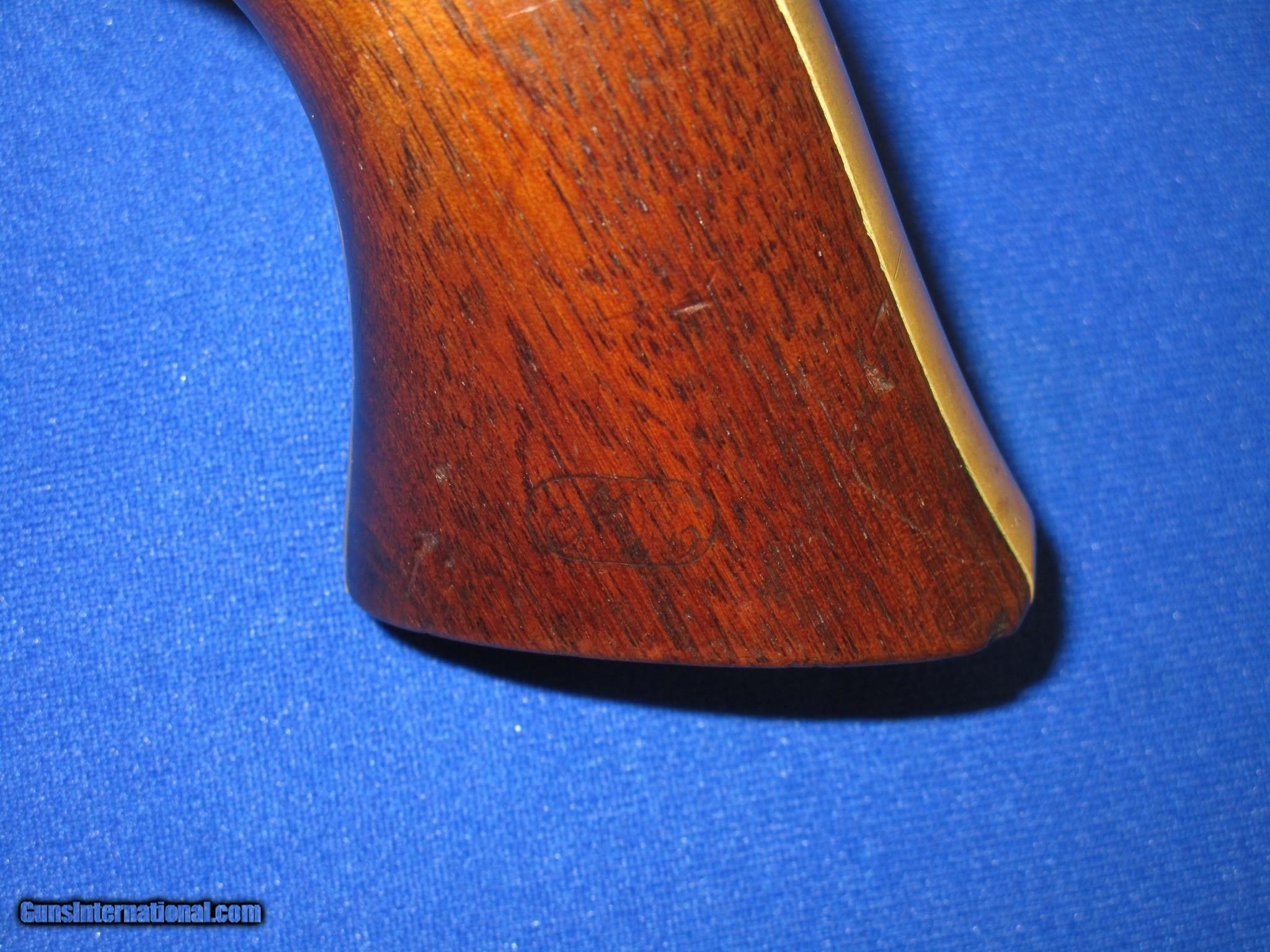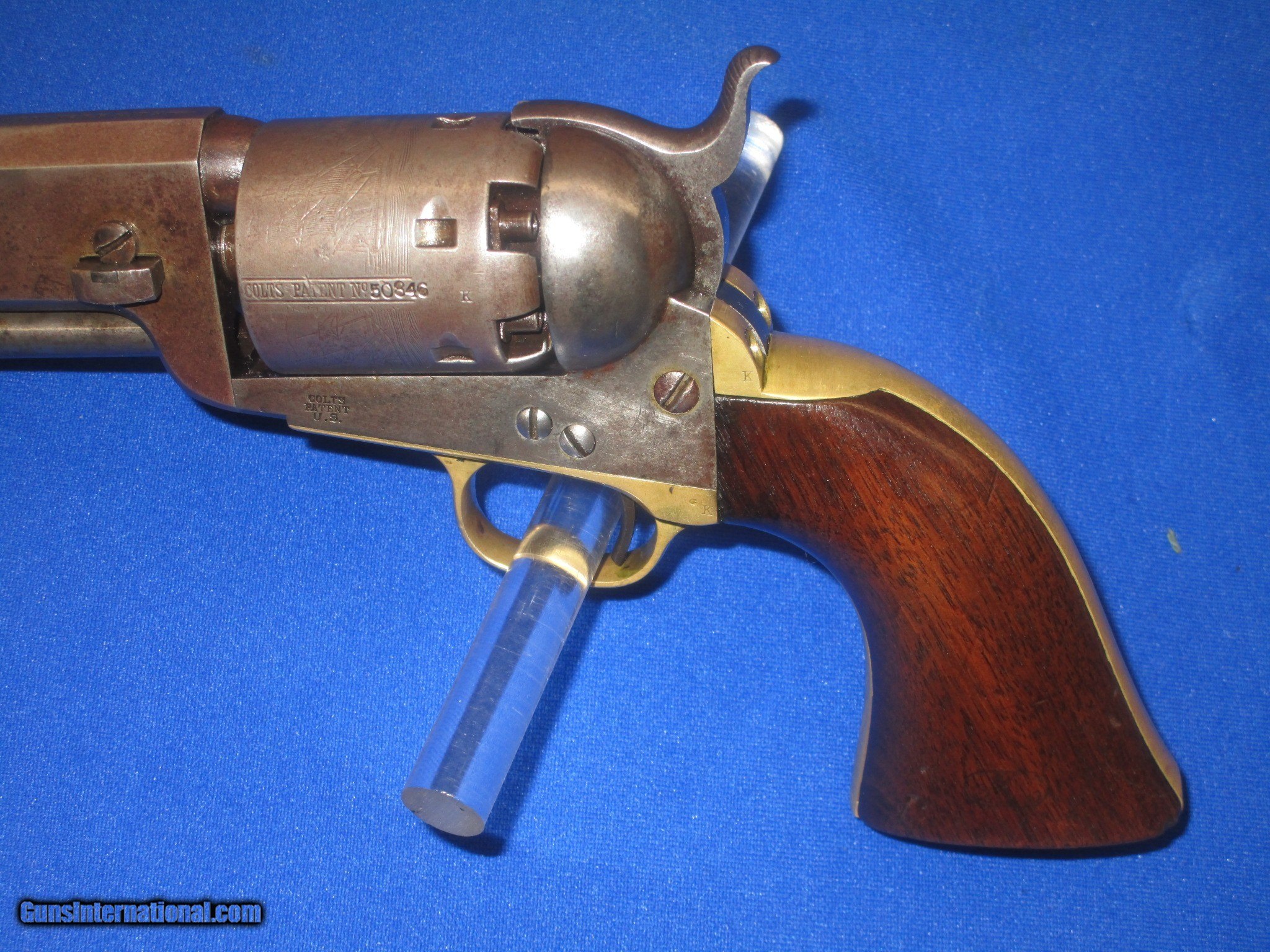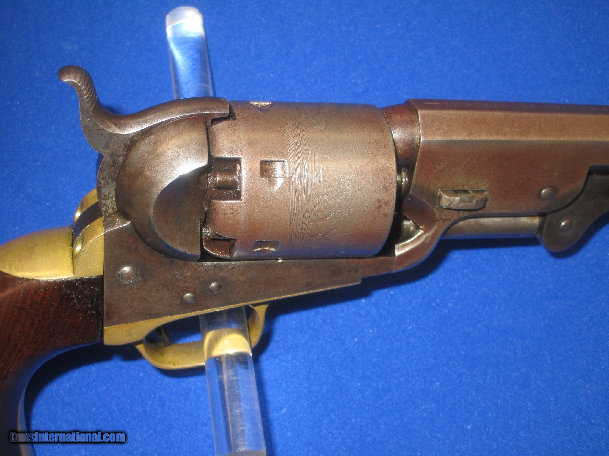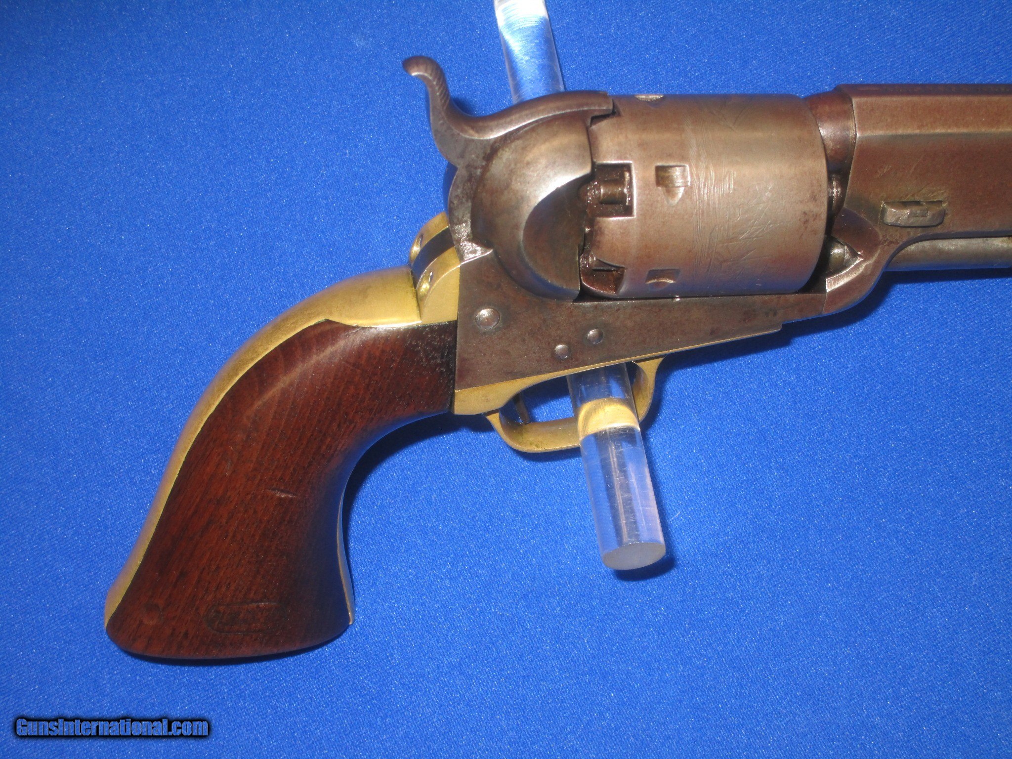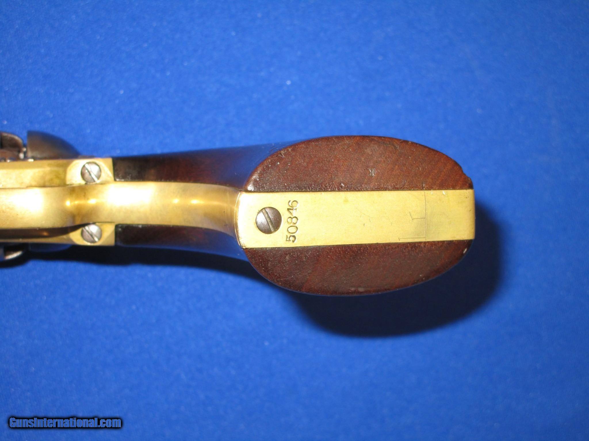 Description: AN EARLY CIVIL WAR MILITARY ISSUED COLT MODEL 1851 PERCUSSION NAVY REVOLVER IN FINE UNTOUCHED CONDITION. SERIAL #50,846, ALL MATCHING NUMBERS INCLUDING THE WEDGE. ALL ORIGINAL & COMPLETE, MADE IN 1856. IT HAS THE NEW YORK ADDRESS ON THE BARREL. THE REVOLVER HAS FINE METAL, MARKINGS AND EDGES. IT IS FULLY U.S. SUB INSPECTED. IT HAS A CLEAR AND FULL CYLINDER SCENE. ALL OF THE METAL ON THE GUN HAS A NATURAL LIGHT TO DARK PATINA ON IT. THE BRASS BACKSTRAP & TRIGGER GUARD HAVE AN UNTOUCHED MELLOW COLOR TO THEM. ALL SCREWS ARE FINE. THE GRIPS ARE VERY FINE THROUGHOUT AND FIT PERFECTLY. THEY HAVE THE CORRECT CLEAR U.S. INSPECTORS CARTOUCHE ON BOTH SIDES. THEY ARE U.S. SUB INSPECTED ON THE BOTTOM. IT HAS A VERY TIGHT ACTION & FINE BORE. THIS IS AN UNTOUCHED AND VERY FINE LOOKING ALL ORIGINAL U.S. CIVIL WAR MILITARY ISSUED COLT MODEL 1851 PERCUSSION NAVY REVOLVER MADE IN 1856! SOLD Antique: Yes Manufacturer: COLT Model: U.S. MILITARY MODEL 1851 NAVY Serial Number: 50,846 Caliber Info: .36 Condition: FINE & UNTOUCHED Metal Condition: FINE Wood Condition: FINE Bore Condition: FINE |