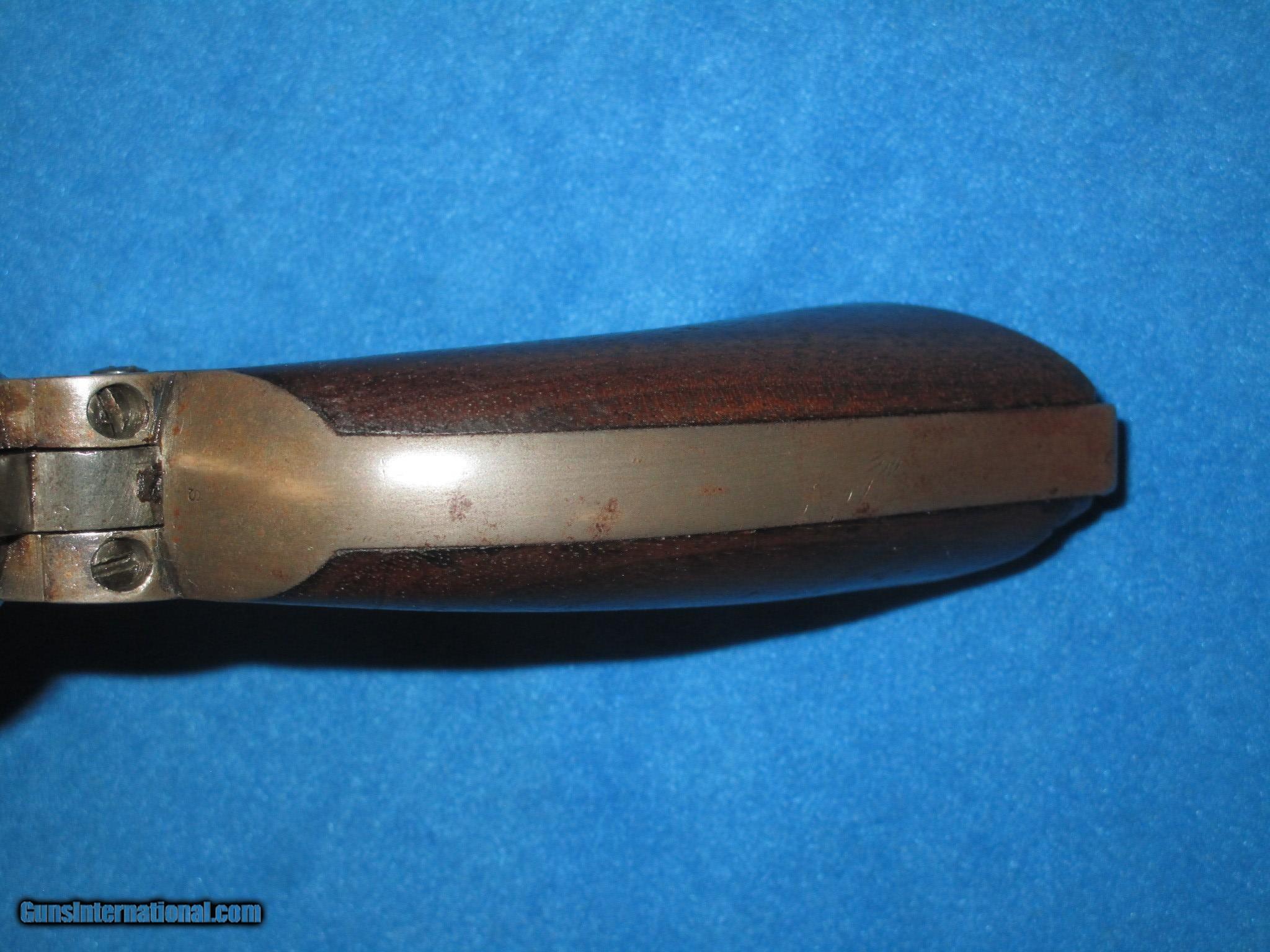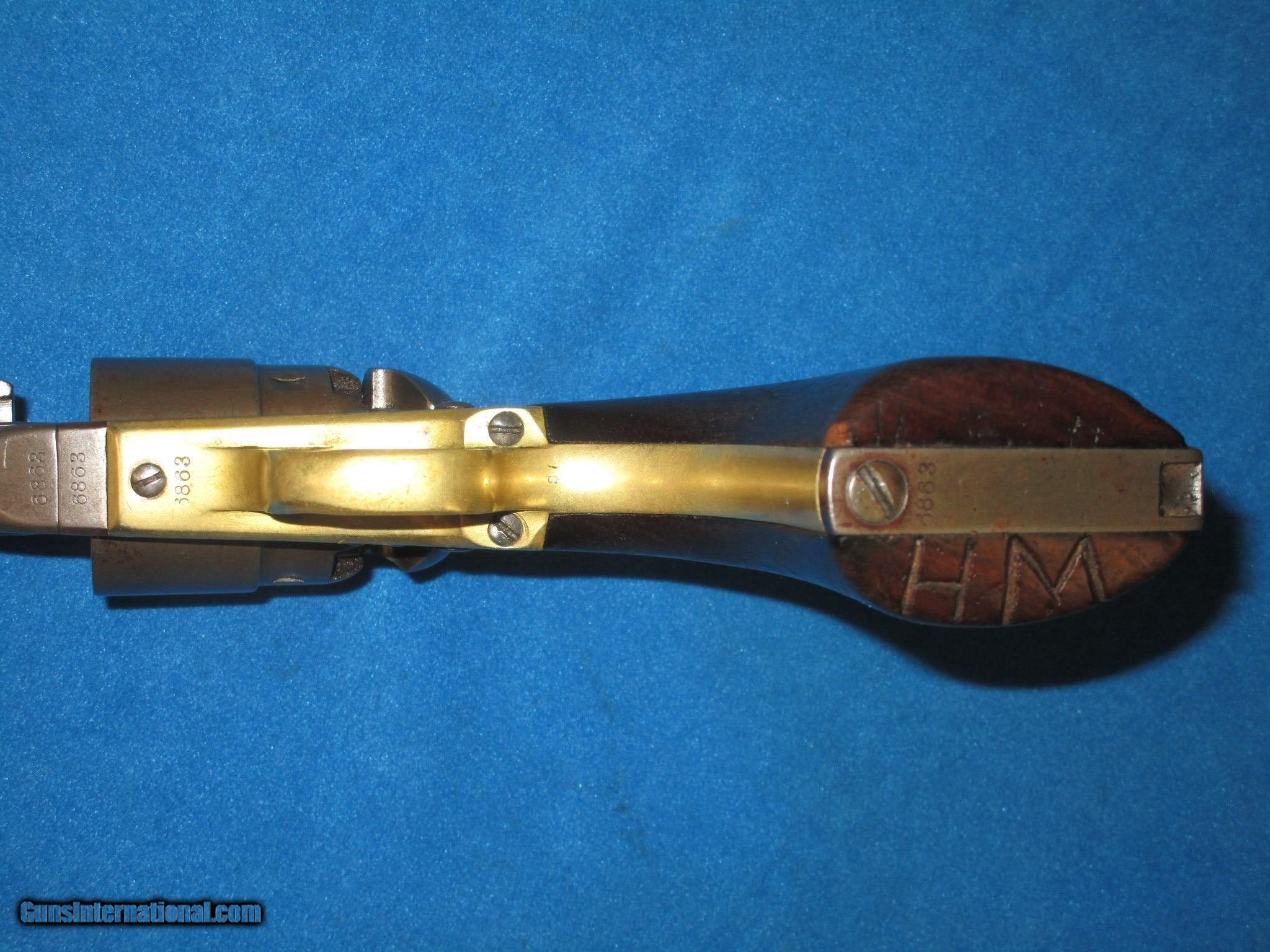 Description: AN EARLY U.S. CIVIL WAR MILITARY ISSUED COLT PERCUSSION MODEL 1860 FOUR SCREW ARMY REVOLVER IN NICE CONDITION. SERIAL #6,863, ALL MATCHING NUMBERS. MADE IN EARLY 1861, ALL ORIGINAL & COMPLETE WITH FACTORY COLT LETTER. THE GUN HAS NICE METAL, MARKINGS, & EDGES INCLUDING A LIGHT BUT FULL CYLINDER SCENE. IT IS FULLY U.S. SUB INSPECTED. THE BARREL, CYLINDER, & BACKSTRAP ON THE GUN HAVE A NICE NATURAL PATINA ON THEM. THE FRAME, LEVER, & HAMMER ALL SHOW SOME DARKENING ORIGINAL CASE COLORS ON THEM. ALL SCREWS ARE ALL NICE. THE BRASS TRIGGER GUARD HAS A NICE MELLOW COLOR TO IT. THE FACTORY GRIPS ARE NICE THROUGHOUT & FIT PERFECTLY. THEY ARE U.S. SUB INSPECTED ON THE BOTTOM WITH VISIBLE CARTOUCHES ON BOTH SIDES. THE GUN HAS A VERY GOOD ACTION & BORE. THIS IS A VERY NICE LOOKING, EARLY, & ALL ORIGINAL EXAMPLE OF A U.S. CIVIL WAR U.S. ISSUED FOUR SCREW COLT PERCUSSION MODEL 1860 ARMY REVOLVER! SOLD Antique: Yes Manufacturer: COLT Model: U.S. COLT 1860 PERCUSSION ARMY REVOLVER Serial Number: 6,863 Caliber Info: .44 |