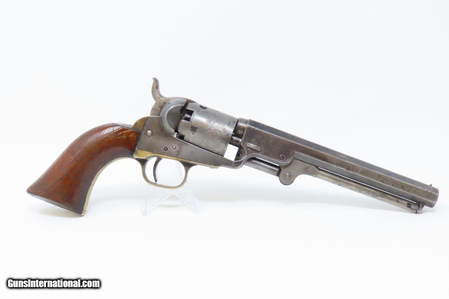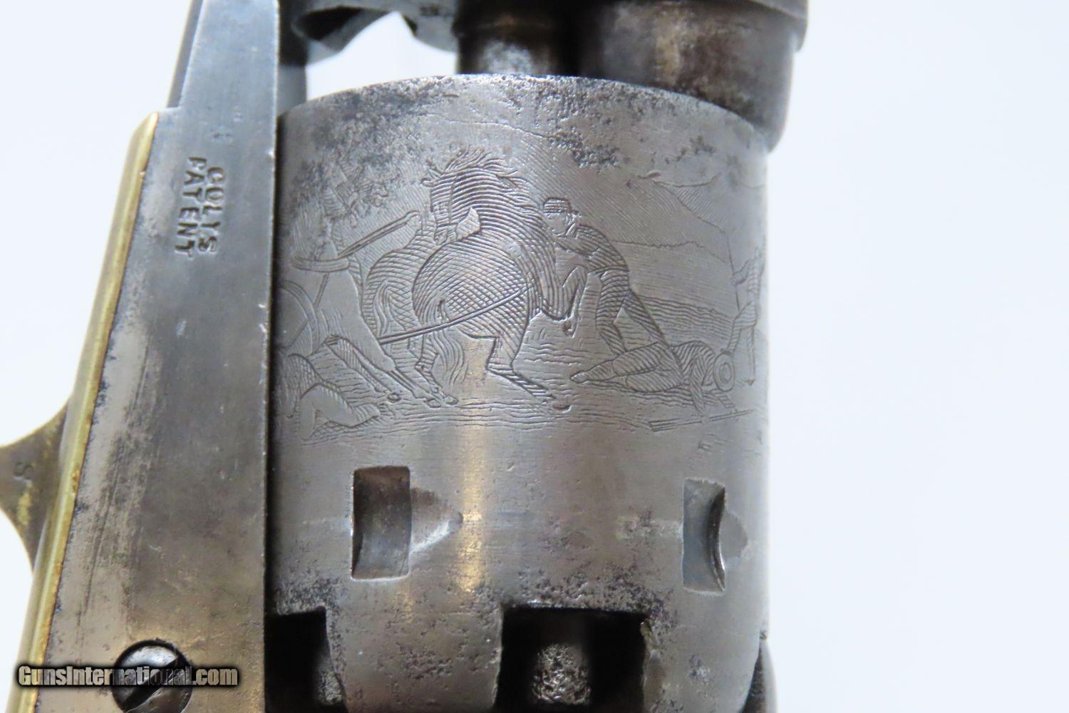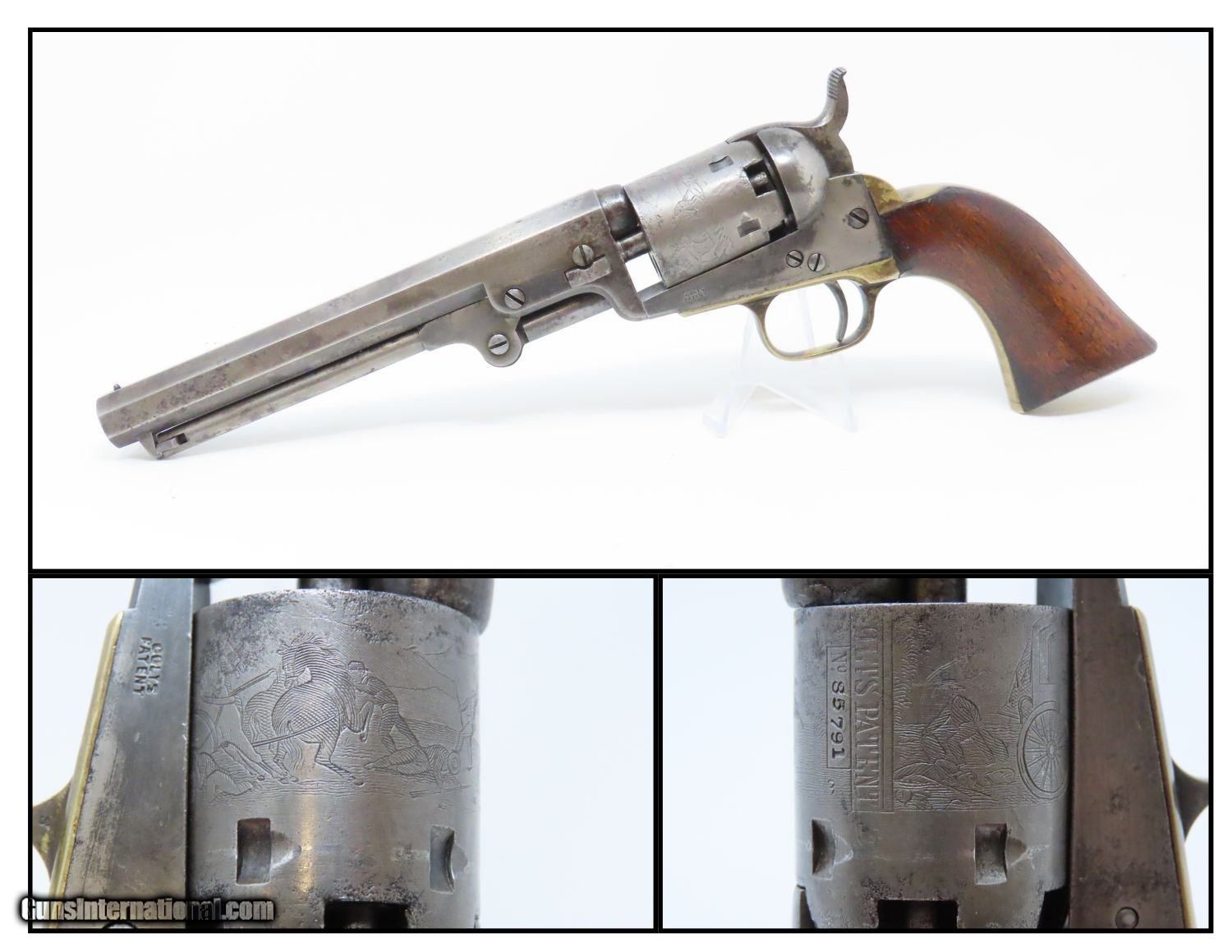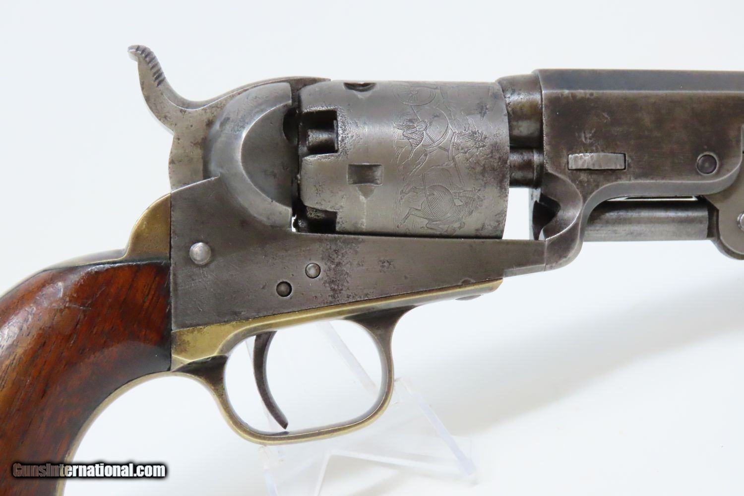 Description: ANTEBELLUM Antique COLT Model 1849 POCKET .31 Caliber PERCUSSION Revolver Manufactured In 1854! Here we present an antique percussion Colt Model 1849 Pocket Revolver, made in 1854 in Hartford, Connecticut. The Model 1849 Pocket, the replacement for the Baby Dragoon, was the most widely produced of any Colt percussion pistol. Nearly 340,000 were manufactured during its 23-year production run that ended in 1873. Over 280,000 of these were produced by Colt’s factory at Hartford by the end of the American Civil War in 1865. These were extremely popular and saw a lot of use on the battlefield, on the home front and in the West. These were some of the smallest, handiest pocket revolvers of the time. One of the most aesthetically pleasing aspects of the 1849 Pocket is its cylinder scene. Cylinder scenes during this period were common, especially for Colt, not only for their visual appeal, but because it made a revolver more difficult to forge. The scene on the 1849 Pocket is that of a stagecoach robbery. The focal point is the stagecoach drawn by four horses. A woman in a dress is seen framed in the doorway of the side of the coach. The driver is standing alongside wielding his pistol against multiple assailants as the horses rear and struggle against their harnesses. Several of the bandits lay dying on the ground, one tries to control the horses, two are running away and one is in the process of falling dead after being shot. Not a bad way to show interested buyers what a pistol like this would be good for. It did a fine job as a self-defense handgun for the average citizen in 19th Century America. The overall condition is very good. There are traces of the silver plate finish on the brass grip frame and trigger guard. The action is strong and tight all the way around. The bore is in good shape with good rifling. The walnut grip is firm with expected wear. Number match. The wagon robbery cylinder scene is quite clear! A very nice example of one of Samuel Colt’s most prolific inventions! Own the original! This is a legitimate antique and not a reproduction. Barrel is 6 inches. Caliber: .31 Percussion Overall condition as seen in photos. Very Fast. Very Safe. FREE SHIPPING WORLDWIDE. Delivered directly to your door by express mail! Guaranteed AUTHENTIC & Includes CERTIFICATE OF AUTHENTICITY. ancestryguns $1685 #210813 SOLD Antique: Yes |