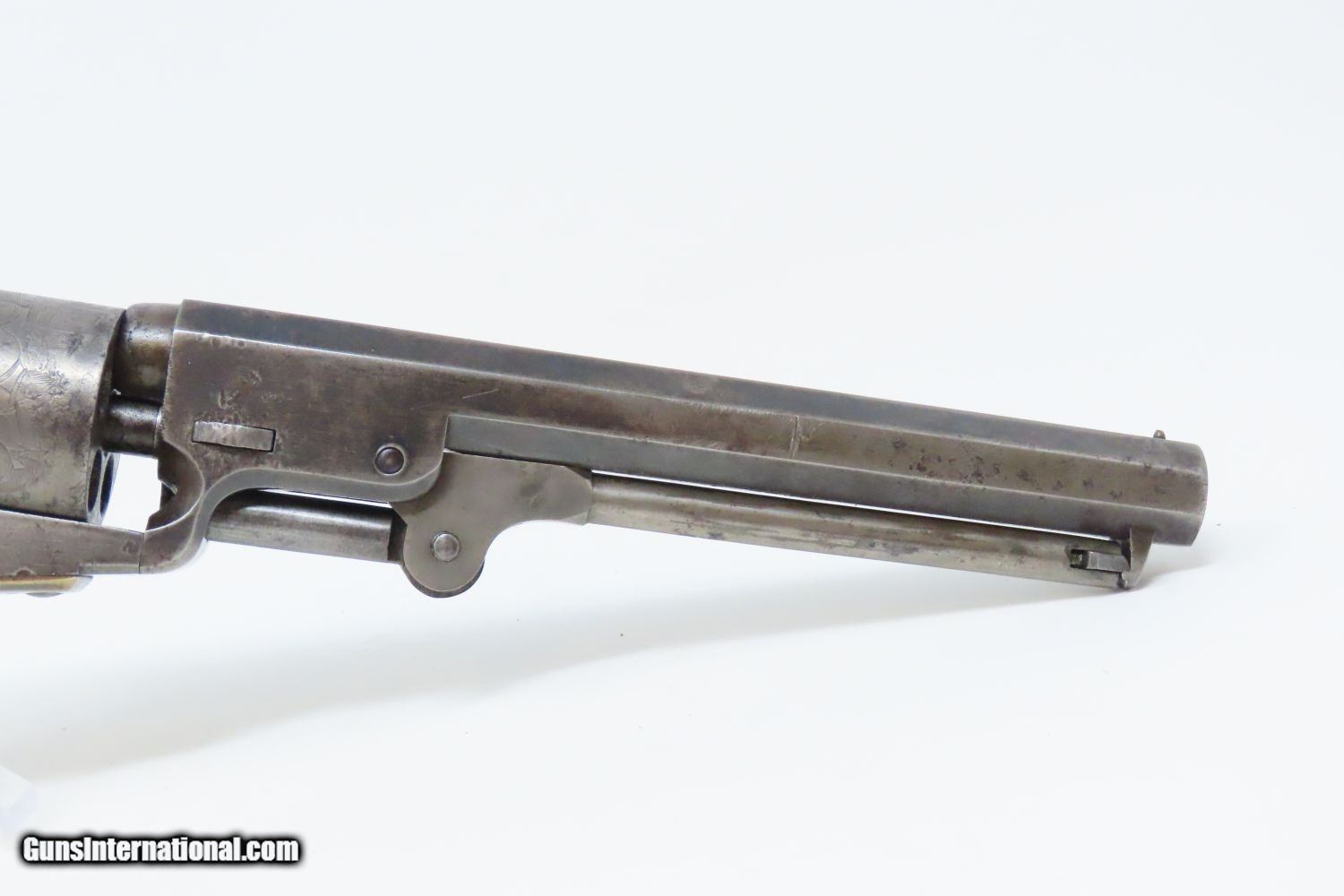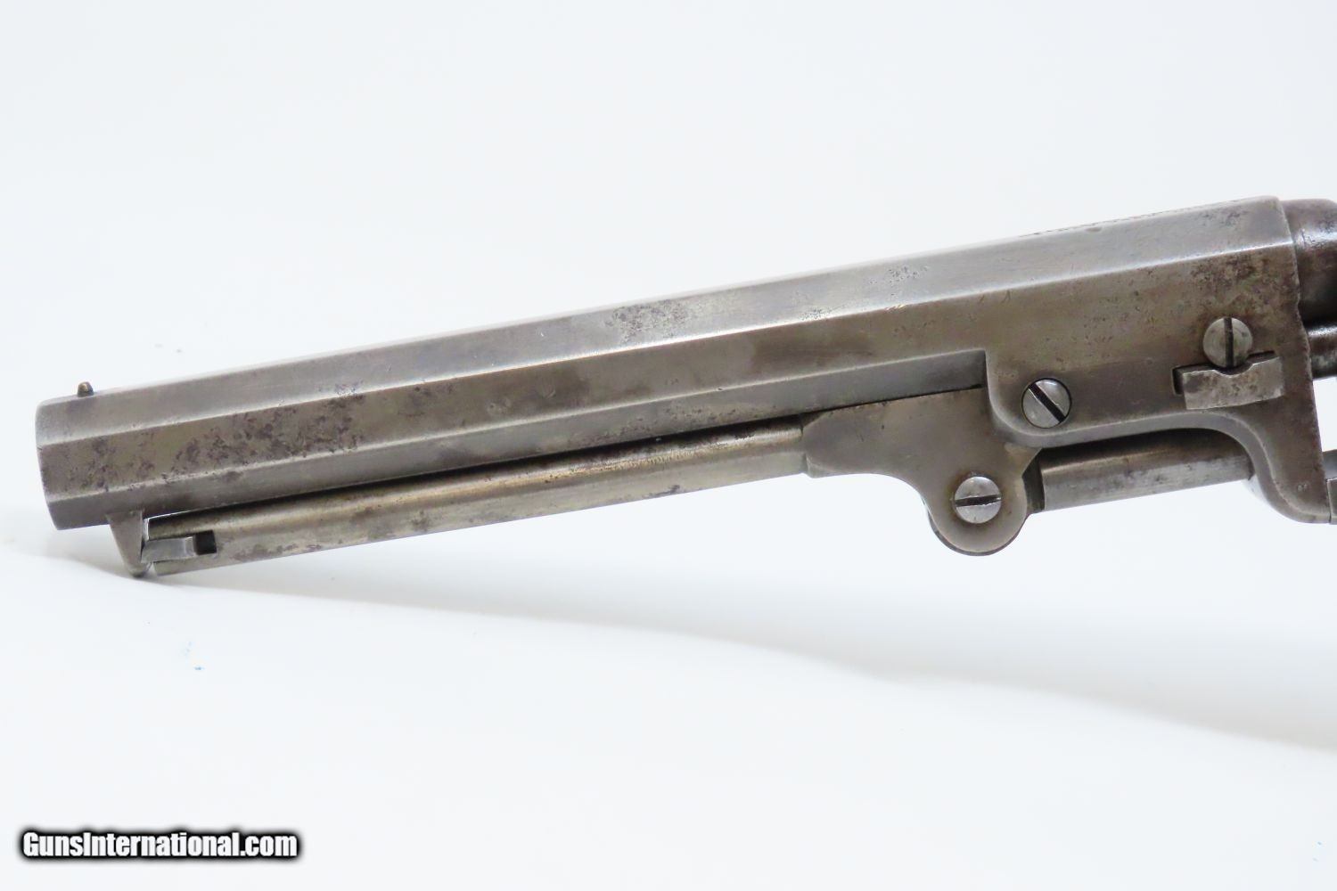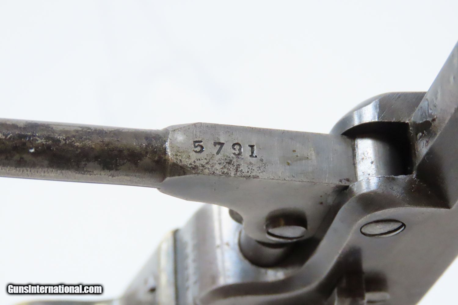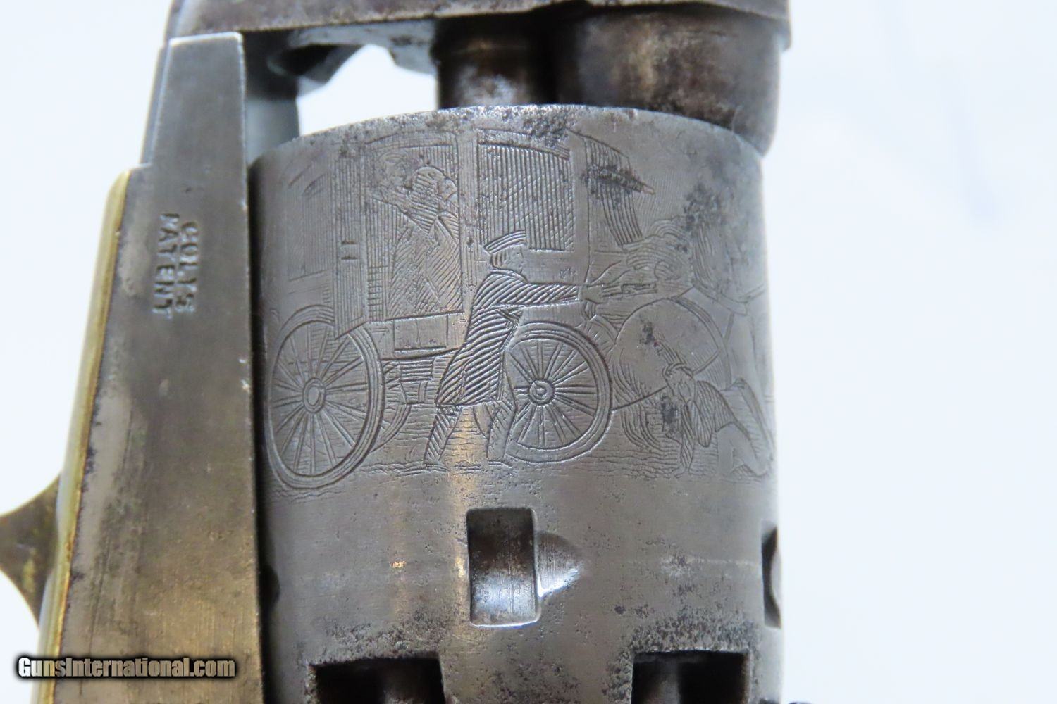 Description: ANTEBELLUM Antique COLT Model 1849 POCKET .31 Caliber PERCUSSION Revolver Manufactured In 1854! Here we present an antique percussion Colt Model 1849 Pocket Revolver, made in 1854 in Hartford, Connecticut. The Model 1849 Pocket, the replacement for the Baby Dragoon, was the most widely produced of any Colt percussion pistol. Nearly 340,000 were manufactured during its 23-year production run that ended in 1873. Over 280,000 of these were produced by Colt’s factory at Hartford by the end of the American Civil War in 1865. These were extremely popular and saw a lot of use on the battlefield, on the home front and in the West. These were some of the smallest, handiest pocket revolvers of the time. One of the most aesthetically pleasing aspects of the 1849 Pocket is its cylinder scene. Cylinder scenes during this period were common, especially for Colt, not only for their visual appeal, but because it made a revolver more difficult to forge. The scene on the 1849 Pocket is that of a stagecoach robbery. The focal point is the stagecoach drawn by four horses. A woman in a dress is seen framed in the doorway of the side of the coach. The driver is standing alongside wielding his pistol against multiple assailants as the horses rear and struggle against their harnesses. Several of the bandits lay dying on the ground, one tries to control the horses, two are running away and one is in the process of falling dead after being shot. Not a bad way to show interested buyers what a pistol like this would be good for. It did a fine job as a self-defense handgun for the average citizen in 19th Century America. The overall condition is very good. There are traces of the silver plate finish on the brass grip frame and trigger guard. The action is strong and tight all the way around. The bore is in good shape with good rifling. The walnut grip is firm with expected wear. Number match. The wagon robbery cylinder scene is quite clear! A very nice example of one of Samuel Colt’s most prolific inventions! Own the original! This is a legitimate antique and not a reproduction. Barrel is 6 inches. Caliber: .31 Percussion Overall condition as seen in photos. Very Fast. Very Safe. FREE SHIPPING WORLDWIDE. Delivered directly to your door by express mail! Guaranteed AUTHENTIC & Includes CERTIFICATE OF AUTHENTICITY. ancestryguns $1685 #210813 SOLD Antique: Yes |