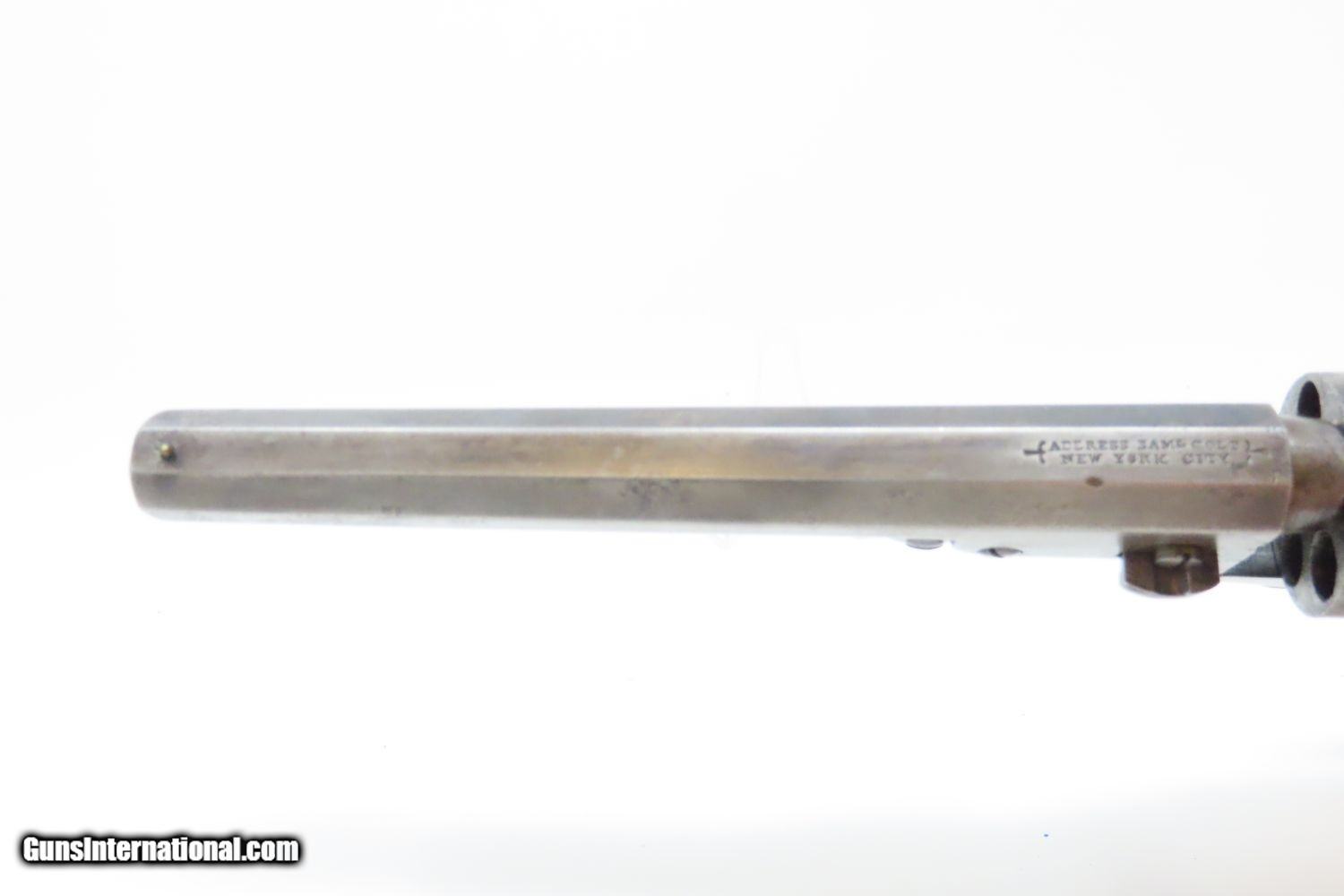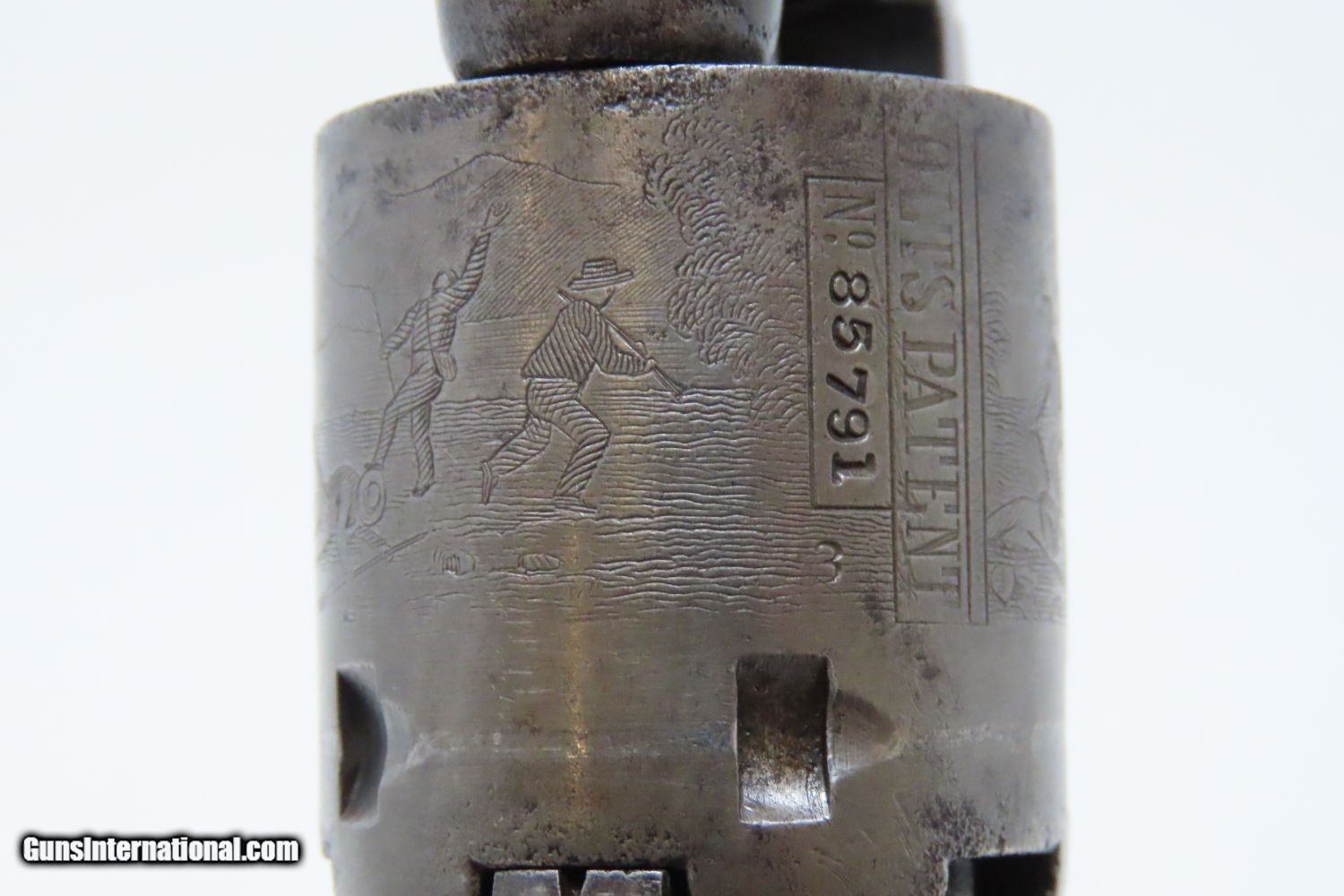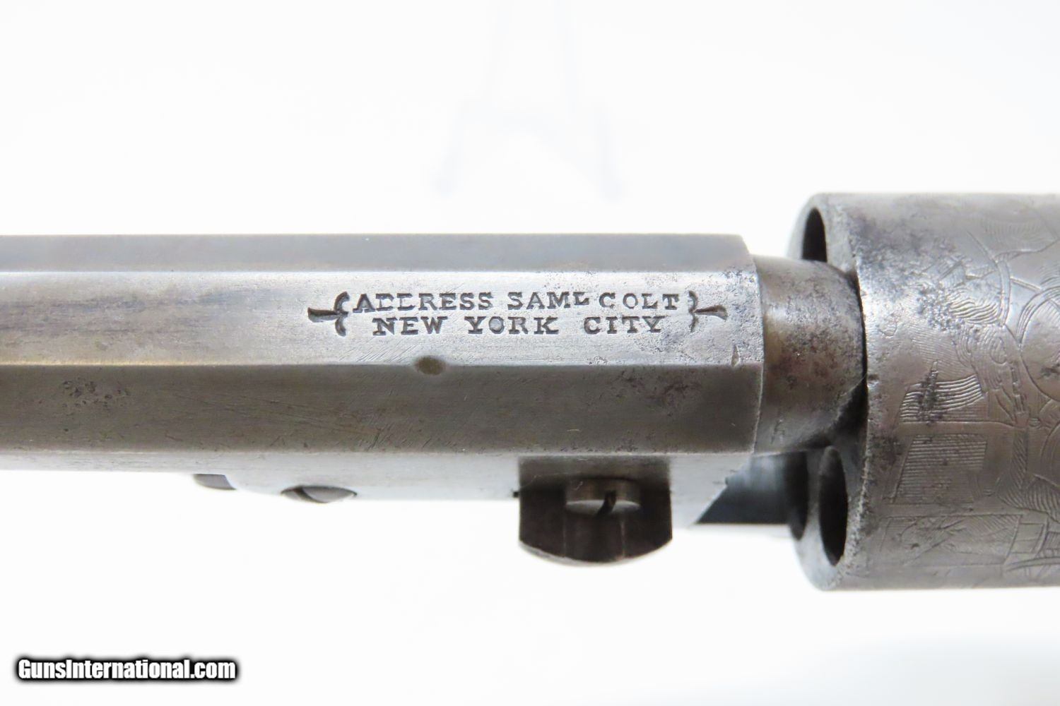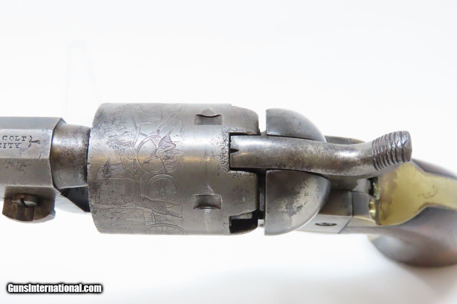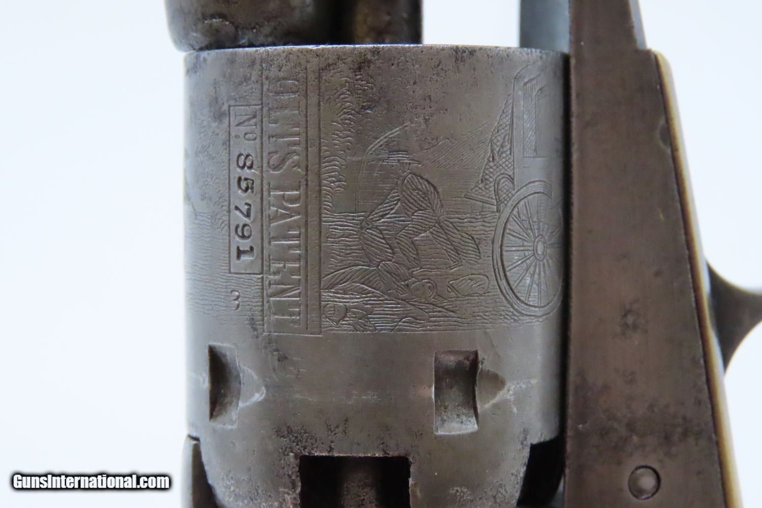 Description: ANTEBELLUM Antique COLT Model 1849 POCKET .31 Caliber PERCUSSION Revolver Manufactured In 1854! Here we present an antique percussion Colt Model 1849 Pocket Revolver, made in 1854 in Hartford, Connecticut. The Model 1849 Pocket, the replacement for the Baby Dragoon, was the most widely produced of any Colt percussion pistol. Nearly 340,000 were manufactured during its 23-year production run that ended in 1873. Over 280,000 of these were produced by Colt’s factory at Hartford by the end of the American Civil War in 1865. These were extremely popular and saw a lot of use on the battlefield, on the home front and in the West. These were some of the smallest, handiest pocket revolvers of the time. One of the most aesthetically pleasing aspects of the 1849 Pocket is its cylinder scene. Cylinder scenes during this period were common, especially for Colt, not only for their visual appeal, but because it made a revolver more difficult to forge. The scene on the 1849 Pocket is that of a stagecoach robbery. The focal point is the stagecoach drawn by four horses. A woman in a dress is seen framed in the doorway of the side of the coach. The driver is standing alongside wielding his pistol against multiple assailants as the horses rear and struggle against their harnesses. Several of the bandits lay dying on the ground, one tries to control the horses, two are running away and one is in the process of falling dead after being shot. Not a bad way to show interested buyers what a pistol like this would be good for. It did a fine job as a self-defense handgun for the average citizen in 19th Century America. The overall condition is very good. There are traces of the silver plate finish on the brass grip frame and trigger guard. The action is strong and tight all the way around. The bore is in good shape with good rifling. The walnut grip is firm with expected wear. Number match. The wagon robbery cylinder scene is quite clear! A very nice example of one of Samuel Colt’s most prolific inventions! Own the original! This is a legitimate antique and not a reproduction. Barrel is 6 inches. Caliber: .31 Percussion Overall condition as seen in photos. Very Fast. Very Safe. FREE SHIPPING WORLDWIDE. Delivered directly to your door by express mail! Guaranteed AUTHENTIC & Includes CERTIFICATE OF AUTHENTICITY. ancestryguns $1685 #210813 SOLD Antique: Yes |