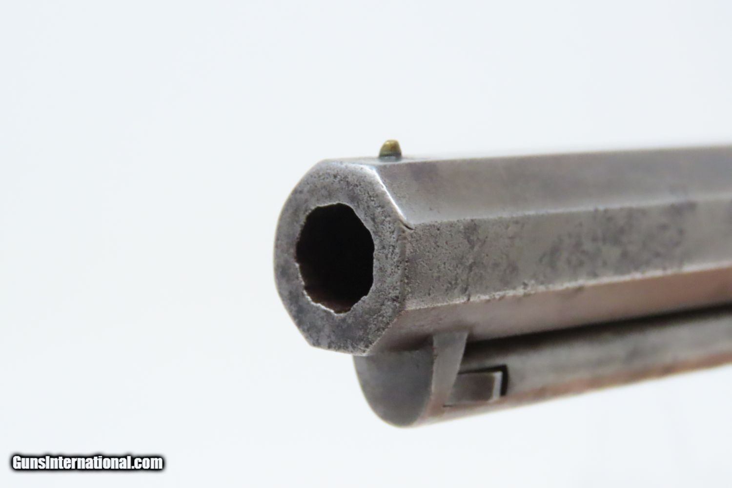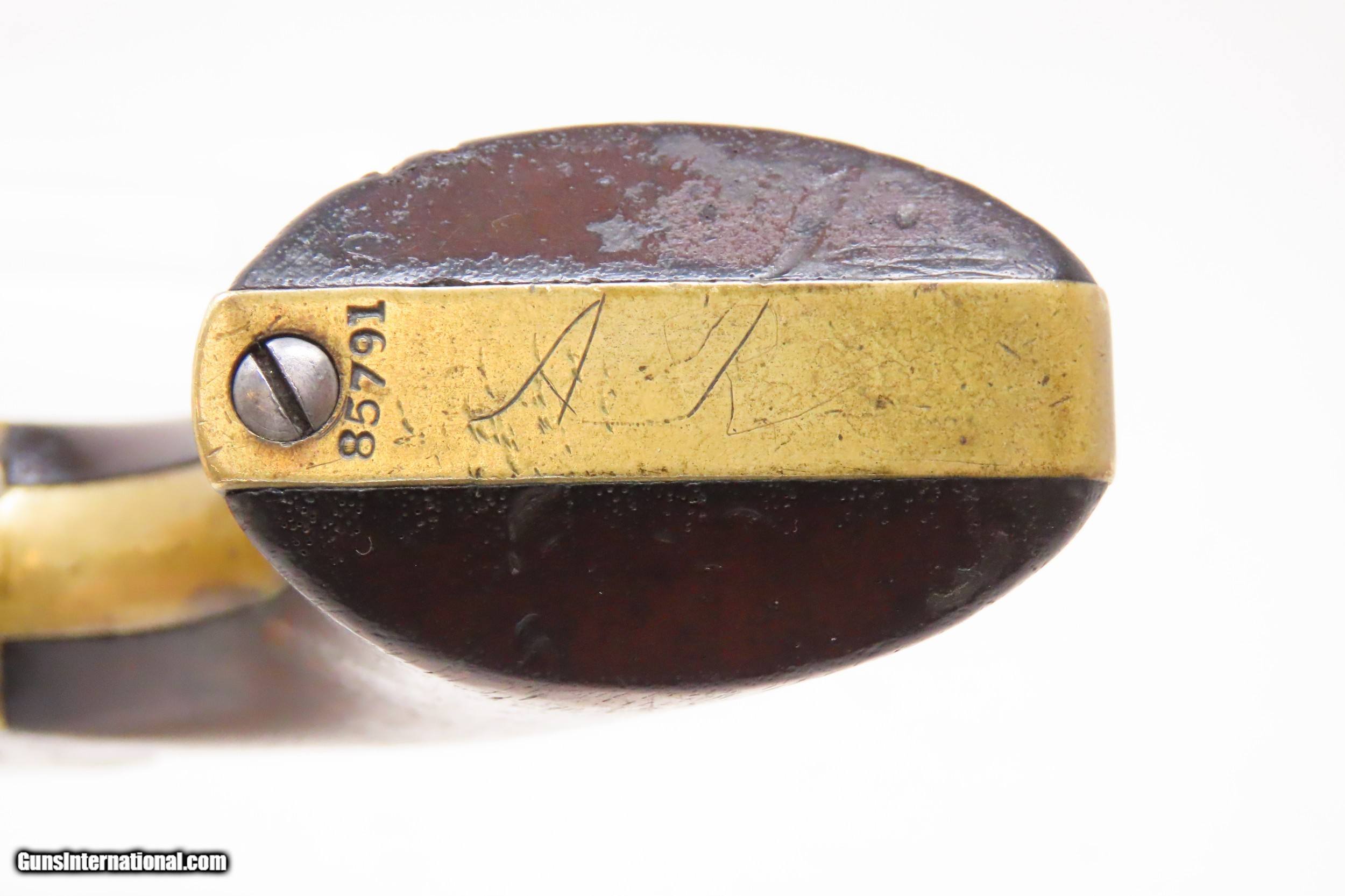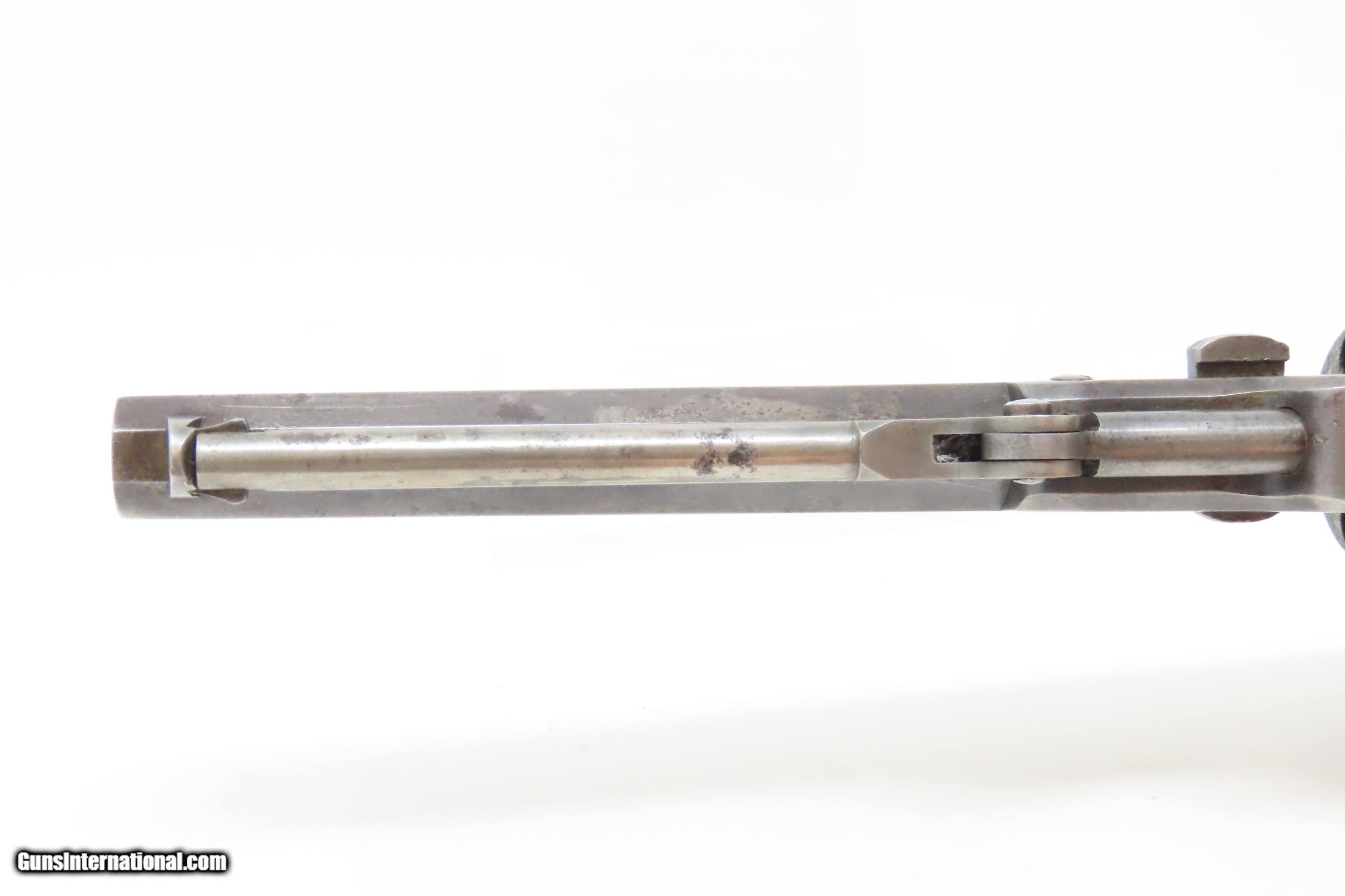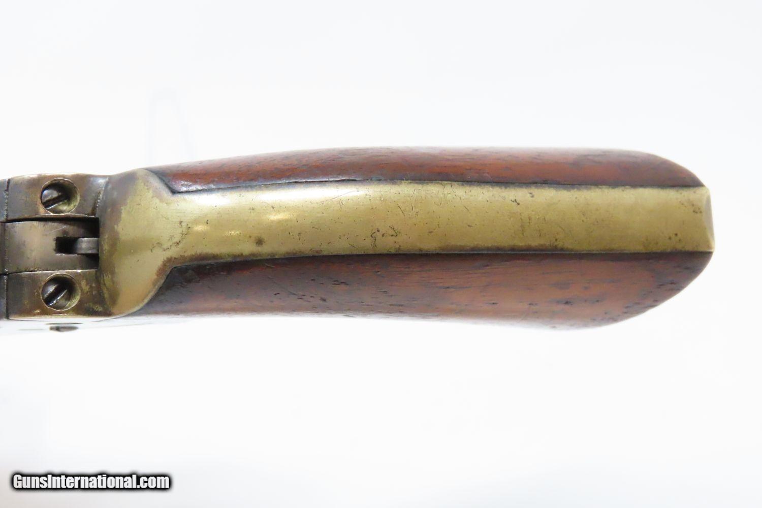 Description: ANTEBELLUM Antique COLT Model 1849 POCKET .31 Caliber PERCUSSION Revolver Manufactured In 1854! Here we present an antique percussion Colt Model 1849 Pocket Revolver, made in 1854 in Hartford, Connecticut. The Model 1849 Pocket, the replacement for the Baby Dragoon, was the most widely produced of any Colt percussion pistol. Nearly 340,000 were manufactured during its 23-year production run that ended in 1873. Over 280,000 of these were produced by Colt’s factory at Hartford by the end of the American Civil War in 1865. These were extremely popular and saw a lot of use on the battlefield, on the home front and in the West. These were some of the smallest, handiest pocket revolvers of the time. One of the most aesthetically pleasing aspects of the 1849 Pocket is its cylinder scene. Cylinder scenes during this period were common, especially for Colt, not only for their visual appeal, but because it made a revolver more difficult to forge. The scene on the 1849 Pocket is that of a stagecoach robbery. The focal point is the stagecoach drawn by four horses. A woman in a dress is seen framed in the doorway of the side of the coach. The driver is standing alongside wielding his pistol against multiple assailants as the horses rear and struggle against their harnesses. Several of the bandits lay dying on the ground, one tries to control the horses, two are running away and one is in the process of falling dead after being shot. Not a bad way to show interested buyers what a pistol like this would be good for. It did a fine job as a self-defense handgun for the average citizen in 19th Century America. The overall condition is very good. There are traces of the silver plate finish on the brass grip frame and trigger guard. The action is strong and tight all the way around. The bore is in good shape with good rifling. The walnut grip is firm with expected wear. Number match. The wagon robbery cylinder scene is quite clear! A very nice example of one of Samuel Colt’s most prolific inventions! Own the original! This is a legitimate antique and not a reproduction. Barrel is 6 inches. Caliber: .31 Percussion Overall condition as seen in photos. Very Fast. Very Safe. FREE SHIPPING WORLDWIDE. Delivered directly to your door by express mail! Guaranteed AUTHENTIC & Includes CERTIFICATE OF AUTHENTICITY. ancestryguns $1685 #210813 SOLD Antique: Yes |