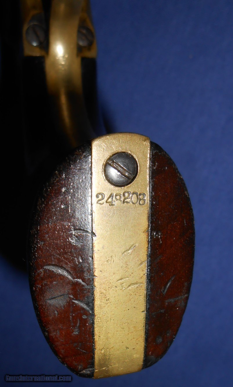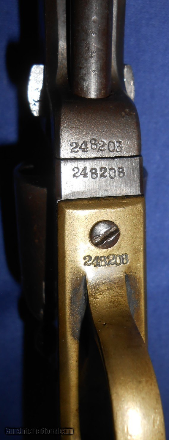 Description: ORIGINAL COLT MODEL 1849 CIVIL WAR ERA POCKET REVOLVER SERIAL NUMBER 248208 MFG. 1863. ALL CORRECT MATCHING NUMBERS INCLUDING THE WEDGE. OCTAGON 5" BARREL, BORE HAS STRONG RIFLING WITH EXPECTED PITTING THAT IS MOSTLY LIGHT IN NATURE. CYLINDER SHOWS A WORN STAGE COACH HOLDUP CYLINDER SCENE WITH CLEAR CHAMBERS & NIPPLES. METAL MOSTLY A SMOOTH EVEN PLUM BROWN PATINA HAVING TRACES OF BLUE ON PROTECTED AREAS. FRAME & LOADING LEVER STILL SHOW DARKENED CASE COLORS. BRASS TRIGGER GUARD & BACK STRAP A MELLOW OCHRE PATINA WITH SOME TRACES OF TARNISHED SILVER PLATE ON PROTECTED AREAS. ORIGINAL VARNISH FINISH WALNUT GRIPS RATE VERY GOOD NO CRACKS or CHIPS SHOWING SOME WEAR & HANDLING. ACTION SEEMS TO WORK OK WITH 2 CLICK HAMMER & SNUG CYLINDER LOCK-UP. OVERALL A VERY FAIRLY PRICED EXAMPLE FROM THE MIDDLE OF THE AMERICAN CIVIL WAR FOR YOUR COLLECTION.. $20.00 S&H DIRECT TO BUYER NO LICENSE NEEDED ANYWHERE THAT'S OK. ADDITIONAL QUESTIONS or PICS JUST ASK. SOLD Antique: Yes Handgun Caliber: .31 Manufacturer: COLT Model: 1849 Serial Number: 248208 Barrel Length: 5 Chambers: CLEAR Condition: VERY GOOD Metal Condition: ORIGINAL Wood Condition: ORIGINAL Bore Condition: SHARP RIFLING Barrel Type: OCTAGON Action: WORKING Finish: AGED ORIGINAL Manufacture Date: 1863 |