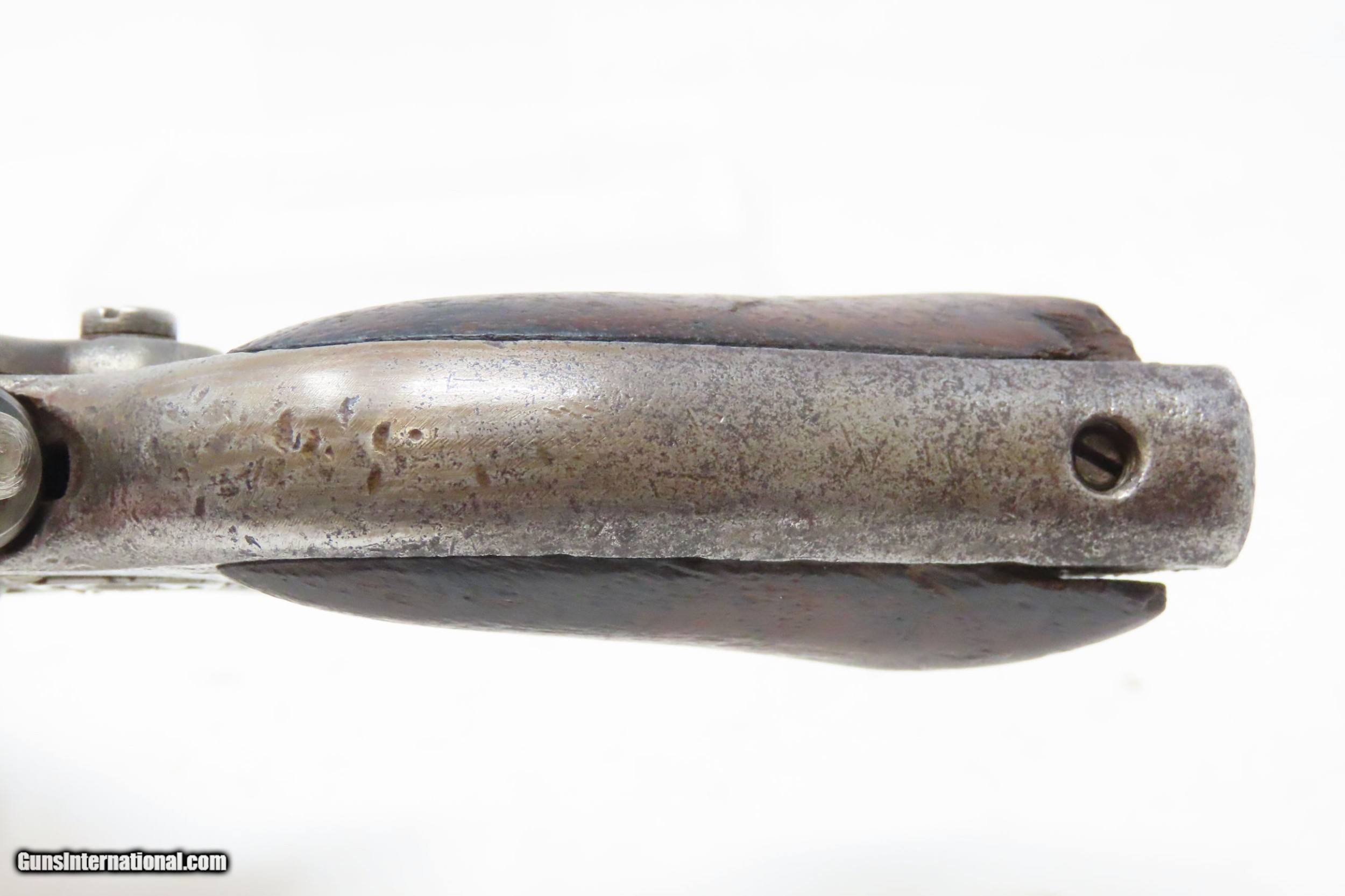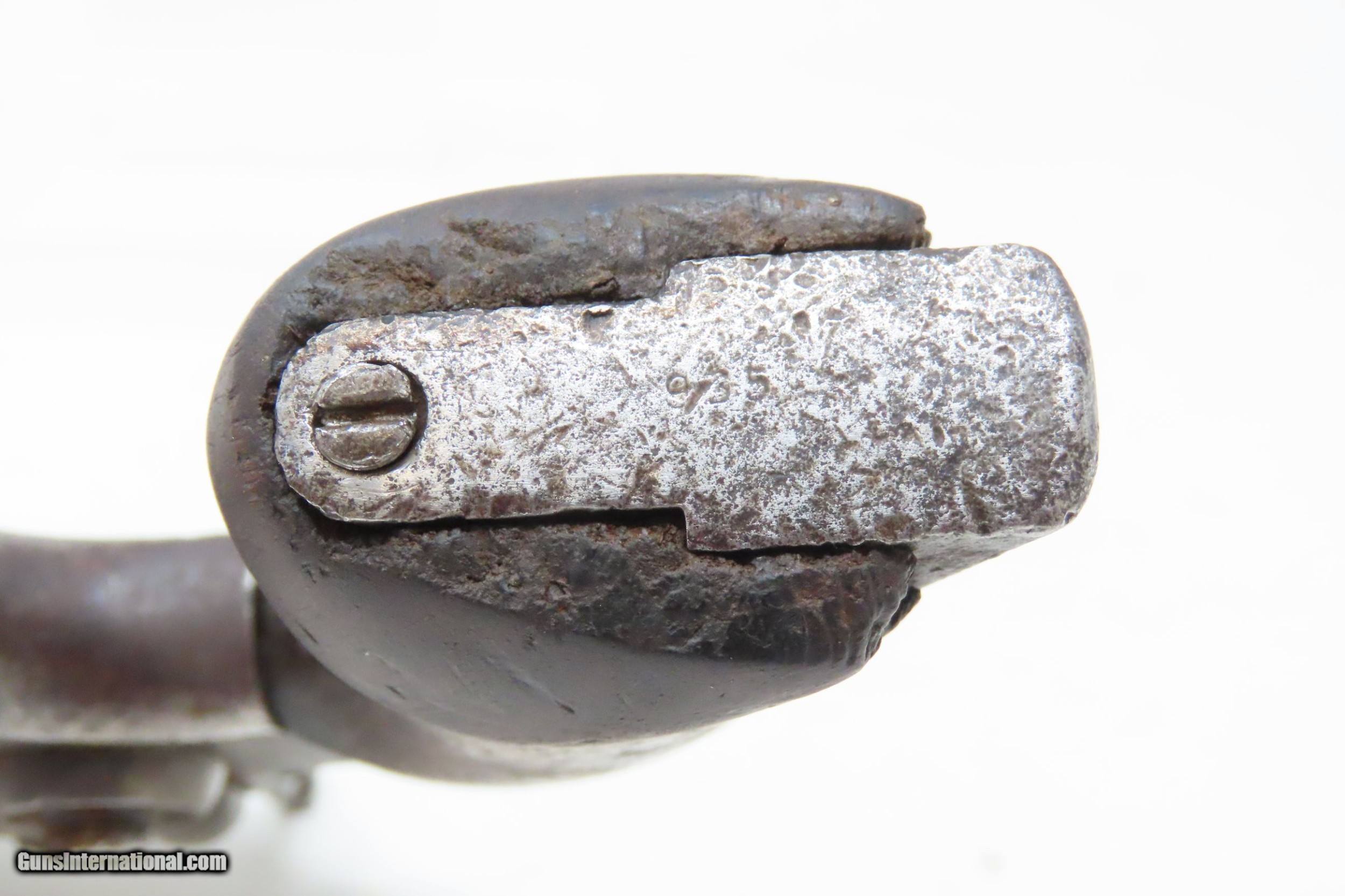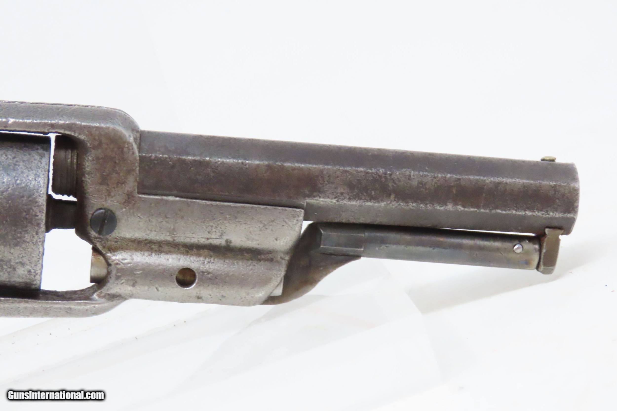Description: Antique CIVIL WAR Era COLT Model 1855 “ROOT” Side-Hammer POCKET Revolver First Year Production SIDE HAMMER Pocket Revolver Here we present an antique Colt Model 1855 “Root” Side-hammer Pocket Revolver, made in 1855 in Hartford, Connecticut. This Samuel Colt design was named for his factory superintendent Elisha K. Root and is a telling example of Colt’s desire to innovate, which was probably the single biggest factor in his success. Though the Colt 1849 Pocket had been introduced only 6 years prior, the “Colonel” attempted to make an improved pocket revolver. The Root features Colt’s debut of the “creeping” style of loading lever which allowed for better mechanical advantage when loading the gun, Colt’s first solid frame, a hammer mounted on the right side for access to the cylinder axis pin, and a cylinder axis pin which was the point at which the hand turned the cylinder (versus on the cylinder itself). Many good ideas were tested in this design, and some would prove worthy to be used in the future. The small parts used in the Root Revolver’s mechanism proved quite fragile, however upscaling them into the 1855 series of Revolving Rifles and Shotguns seemed to help. Colt is even known to have experimented with the Root design on a Dragoon pistol, a precursor to the 1860 Army. Overall, about 44,000 Root Revolvers were made from 1855-1870, much fewer than the 1849 Pocket with 340,000 produced. Though not a primary military arm during the American Civil War, handguns were commonly privately purchased by soldiers for use on the battlefield. Whether legend or fact, it is interesting to note something commonly read about pocket revolvers of the day: that while they could be used for self-defense against the enemy, many soldiers kept them on their person to defend themselves against an unwanted amputation in the primitive field hospitals that were notorious, even in their day. The overall condition is rough. Dark patina throughout. The loading lever assembly and one of the screws is a replacement. The action (hammer/trigger) will cock and the trigger will release, but the cylinder will not index. The bore is dark with visible rifling. The grip has been rounded at the toe, shows lots of wear, yet remains solid. Own the original! This is a legitimate antique and not a reproduction. Barrel is 3-1/2 inches. Caliber: .28 Percussion Overall condition as seen in photos. Very Fast. Very Safe. FREE SHIPPING WORLDWIDE. Delivered directly to your door by express mail! Guaranteed AUTHENTIC & Includes CERTIFICATE OF AUTHENTICITY. ancestryguns $1500 #220531 SOLD Antique: Yes |