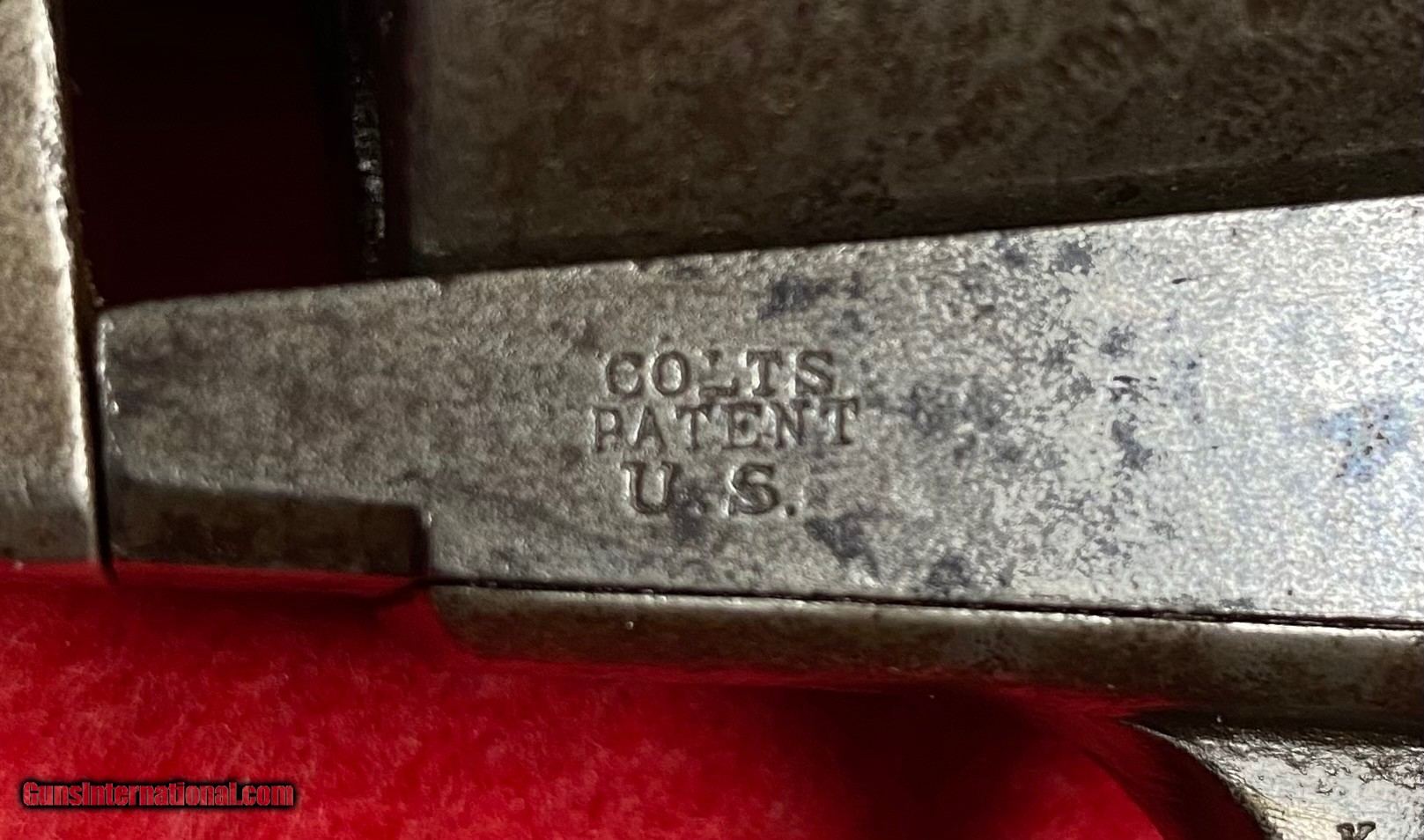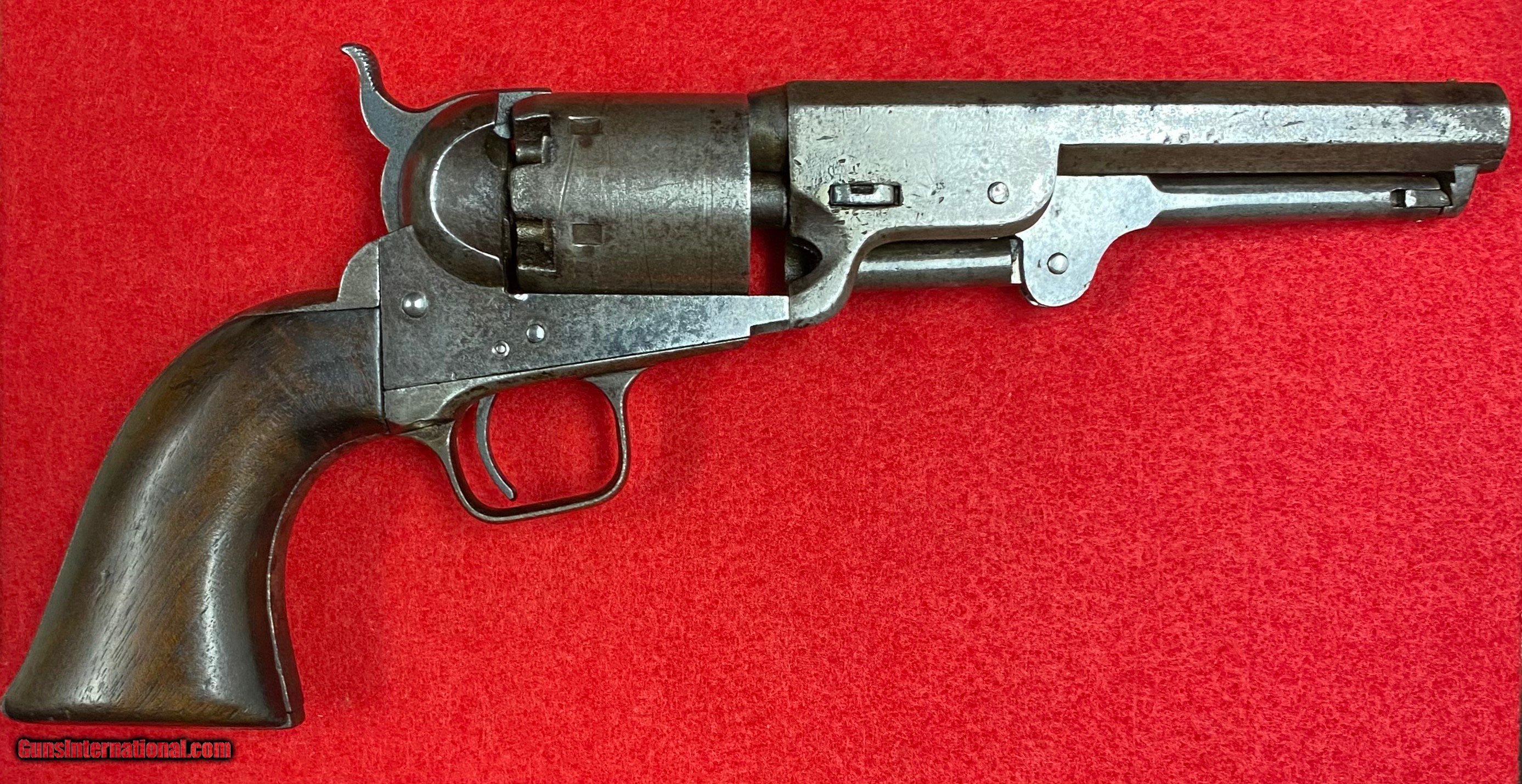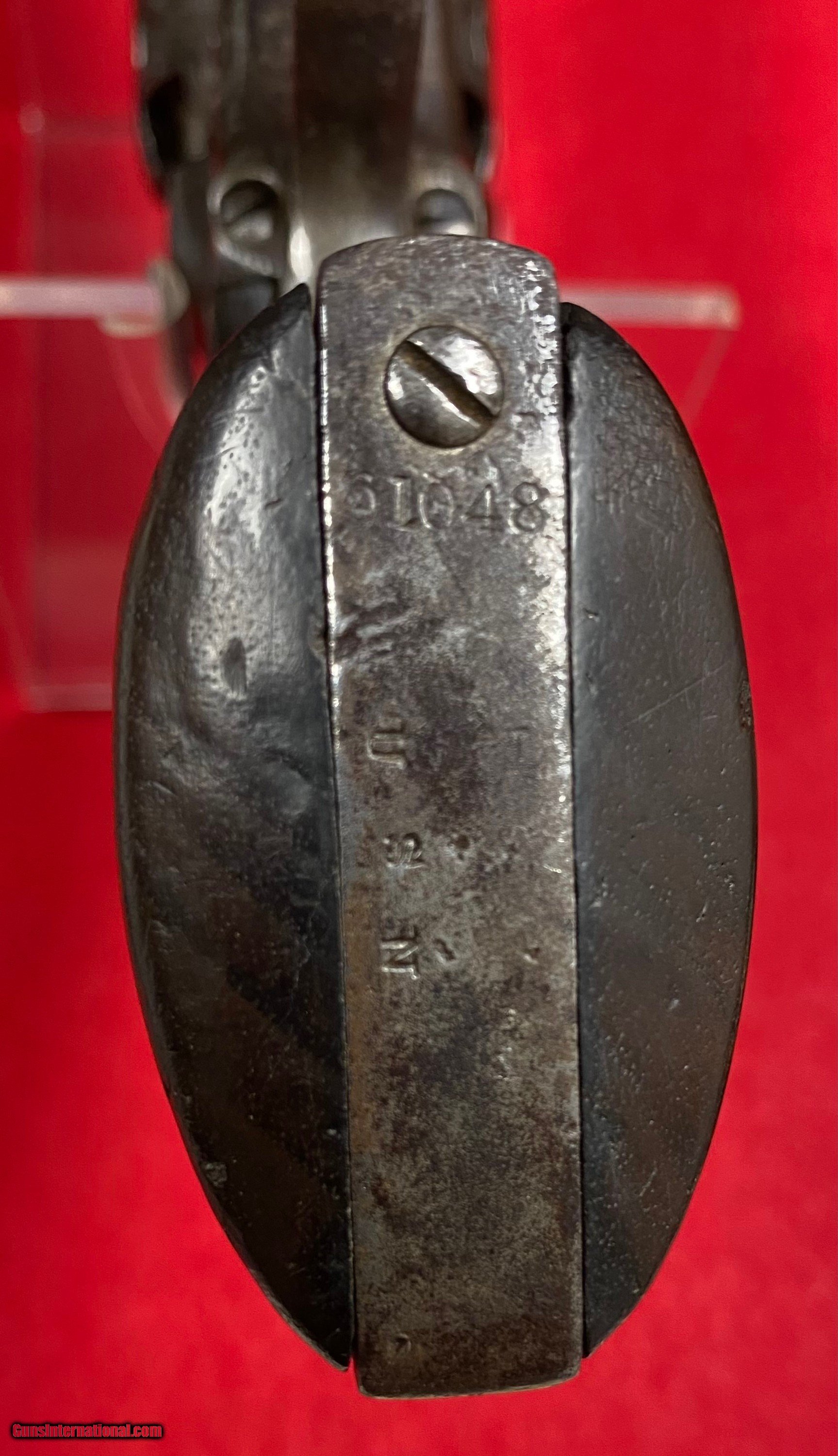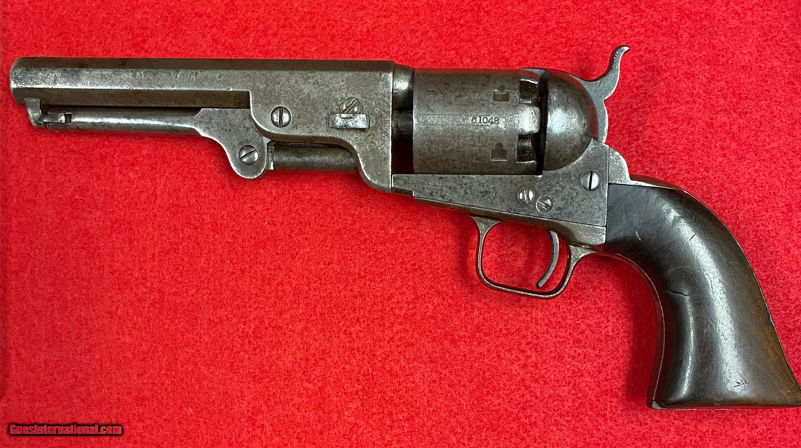 Description: Antique Colt 1851 Martially Marked Navy 3rd Model .36 percussion that was manufactured in 1856. All matching numbers on this Civil War era piece. Rare 168 year old gun that had its octagon barrel cut back from 7 1/2" to 5 1/2" somewhere during its early years. U.S. stamp clearly visible on left side of revolver. U.S.N. stamped on bottom of iron strap. Other Inspectors Stamps throughout the gun. Action functions fine with a tight lock up. All parts fit tightly with one another. Good bore with deep lands and grooves. Just a nice Civil War Era collectible. $35.00 insured shipping. SOLD Antique: Yes Handgun Caliber: .36 Manufacturer: Colt Model: 1851 Navy Serial Number: 61048 Barrel Length: 5 1/2” Chambers: Six Condition: Good Metal Condition: Good Wood Condition: Good Bore Condition: Good Action: SA Finish: Blue Sights: Fixed Manufacture Date: 1856 Item Location: WV |