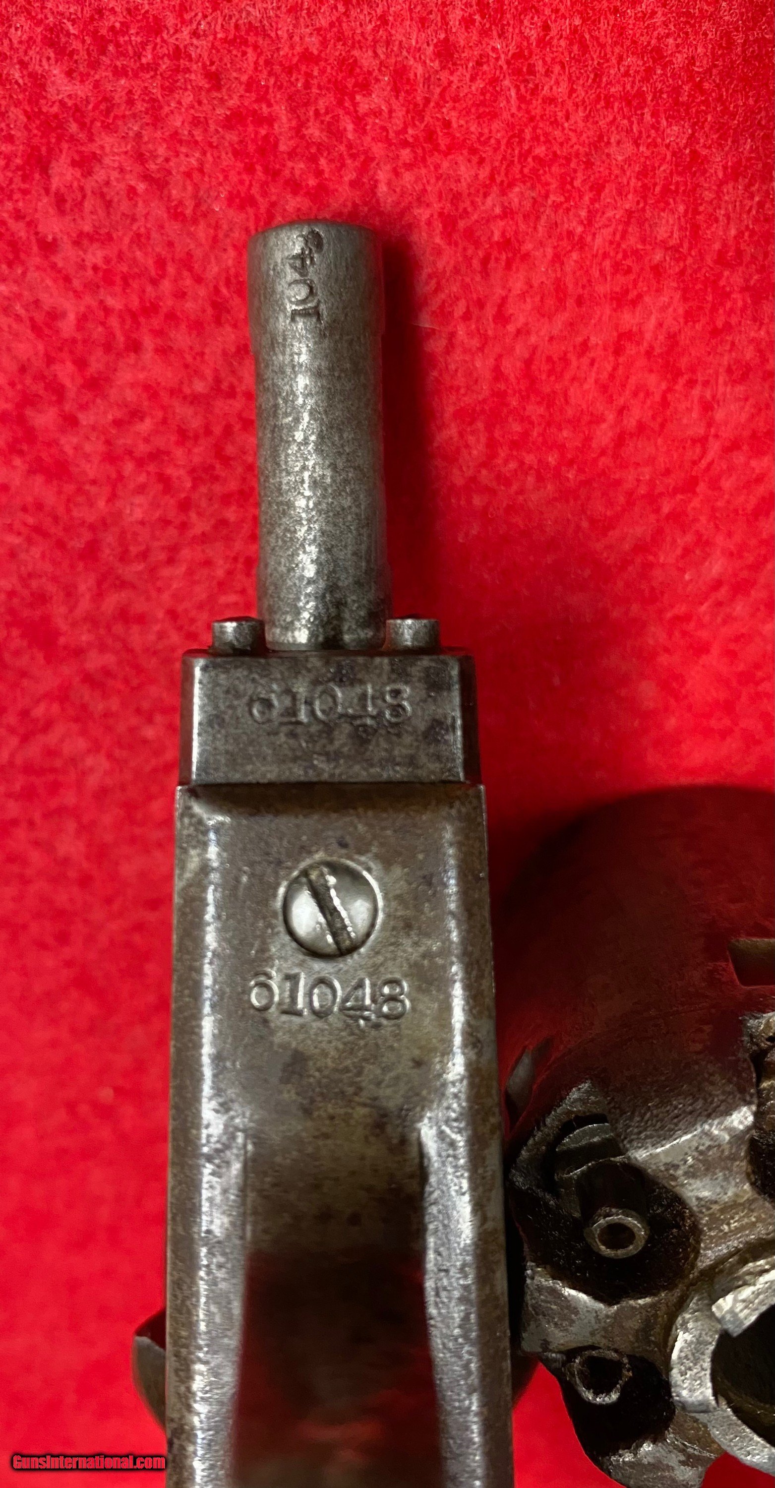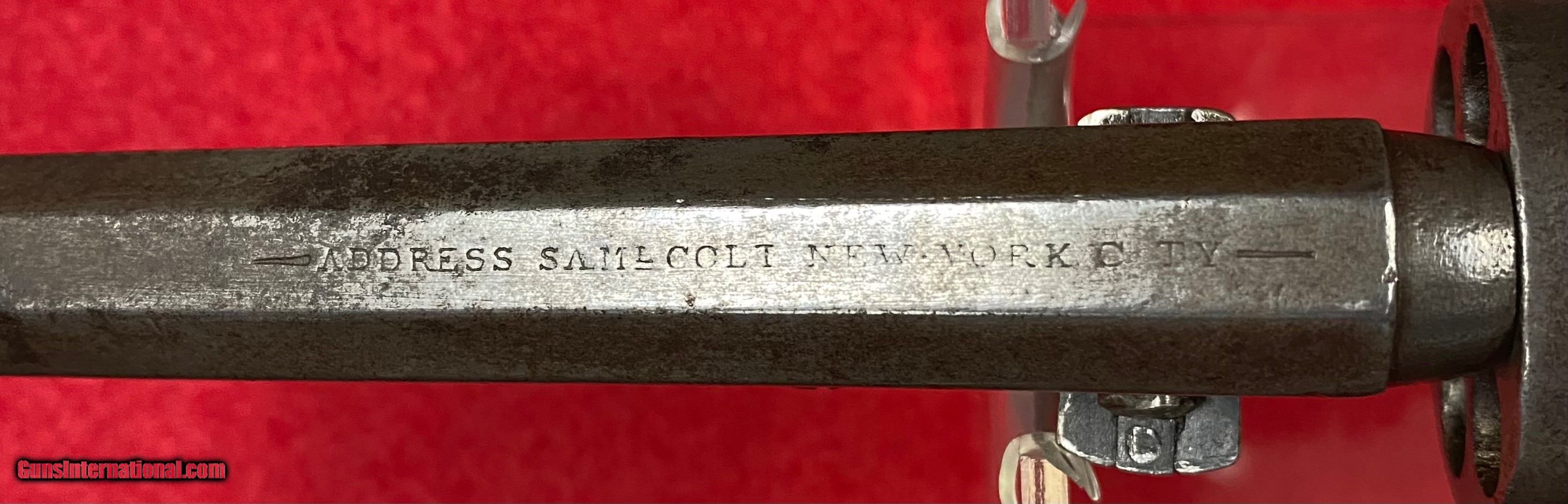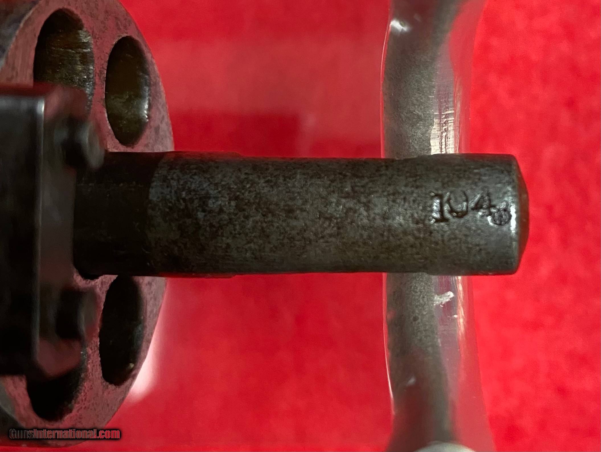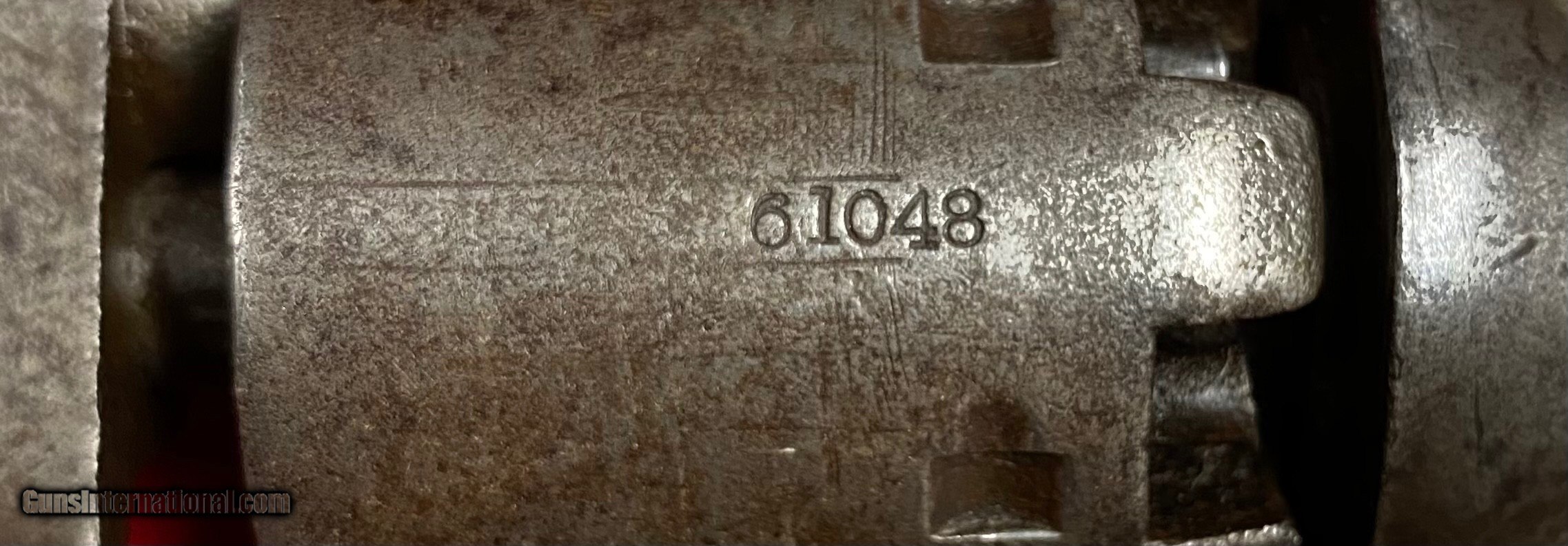 Description: Antique Colt 1851 Martially Marked Navy 3rd Model .36 percussion that was manufactured in 1856. All matching numbers on this Civil War era piece. Rare 168 year old gun that had its octagon barrel cut back from 7 1/2" to 5 1/2" somewhere during its early years. U.S. stamp clearly visible on left side of revolver. U.S.N. stamped on bottom of iron strap. Other Inspectors Stamps throughout the gun. Action functions fine with a tight lock up. All parts fit tightly with one another. Good bore with deep lands and grooves. Just a nice Civil War Era collectible. $35.00 insured shipping. SOLD Antique: Yes Handgun Caliber: .36 Manufacturer: Colt Model: 1851 Navy Serial Number: 61048 Barrel Length: 5 1/2” Chambers: Six Condition: Good Metal Condition: Good Wood Condition: Good Bore Condition: Good Action: SA Finish: Blue Sights: Fixed Manufacture Date: 1856 Item Location: WV |