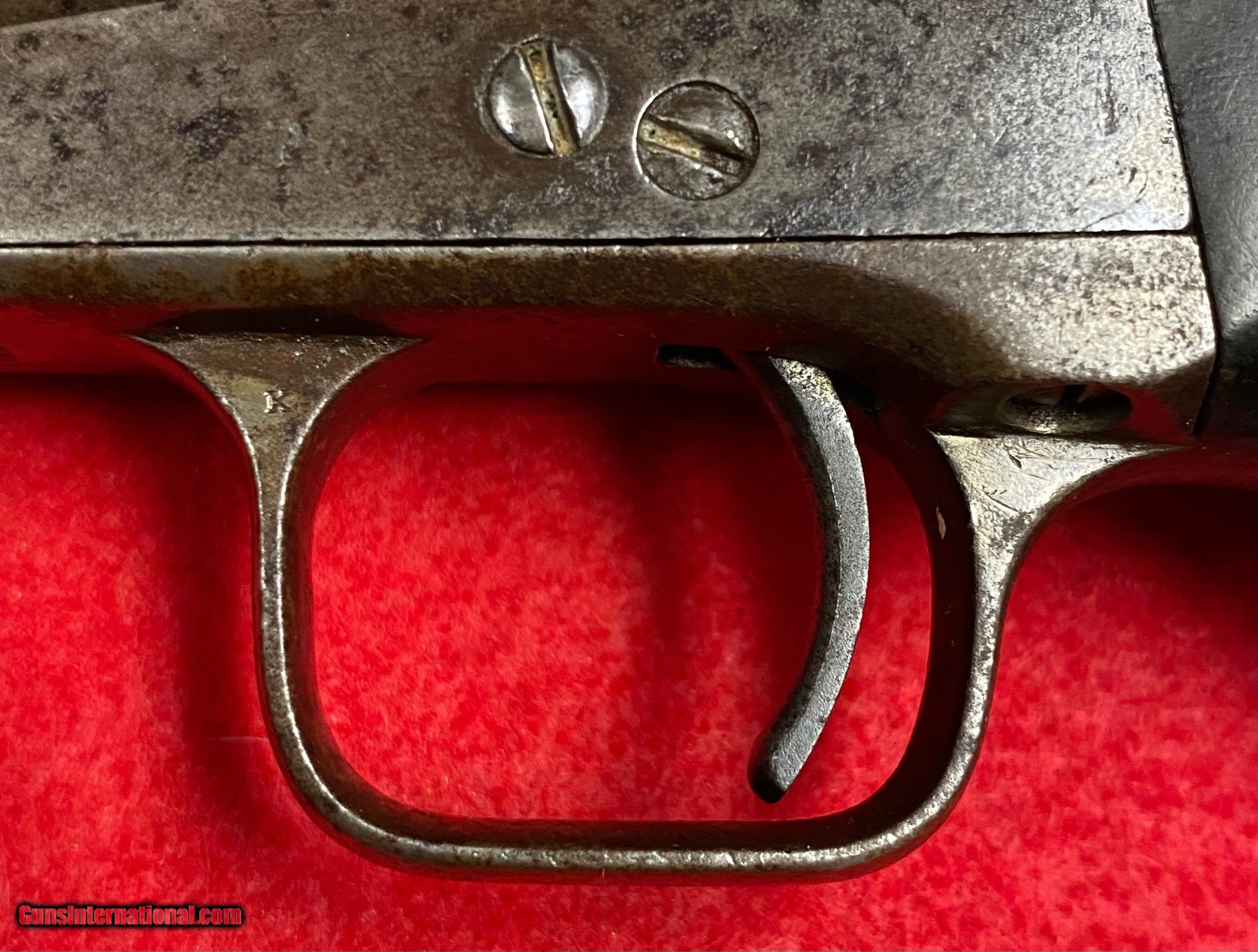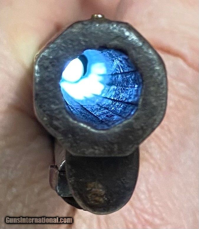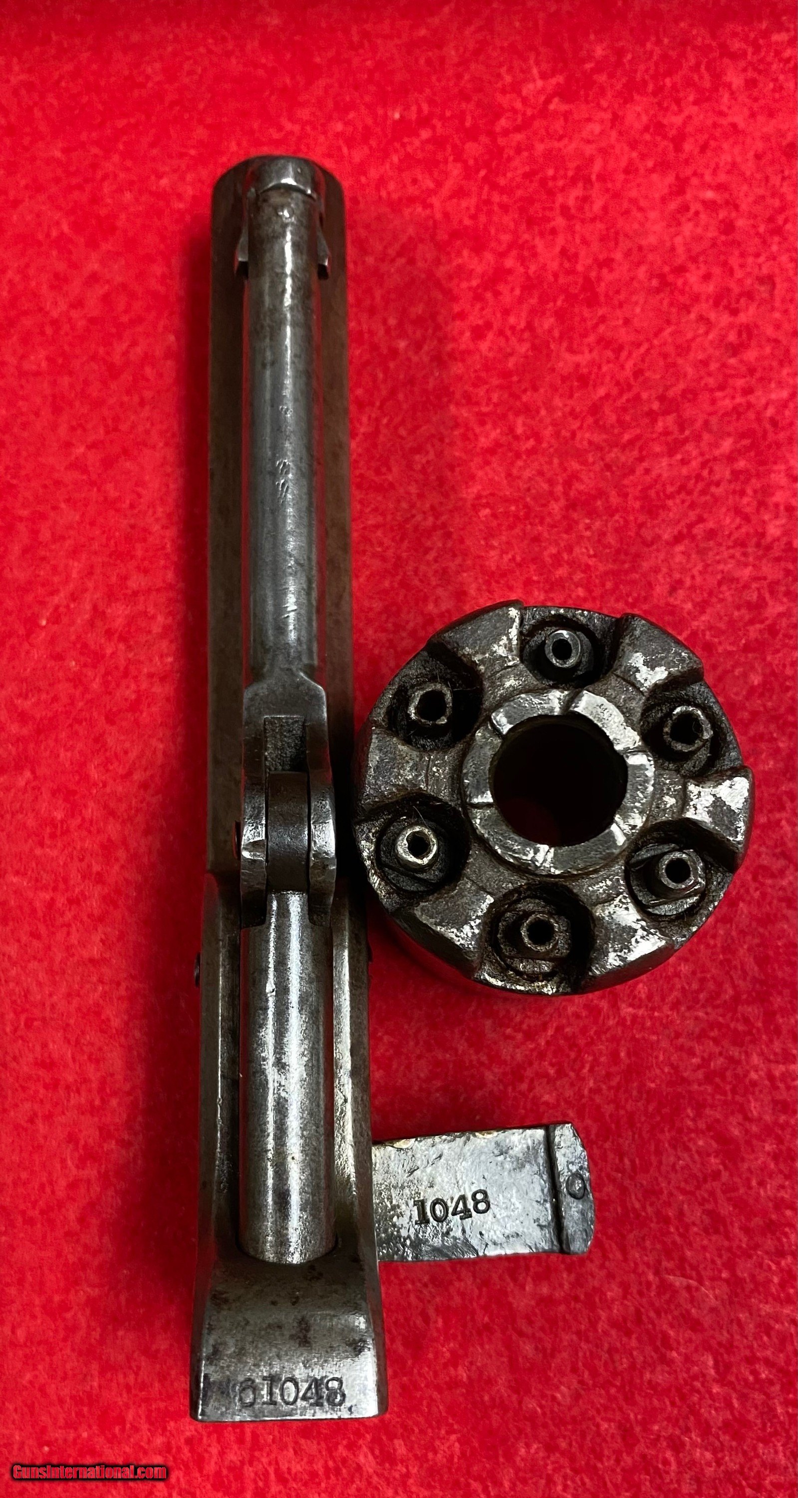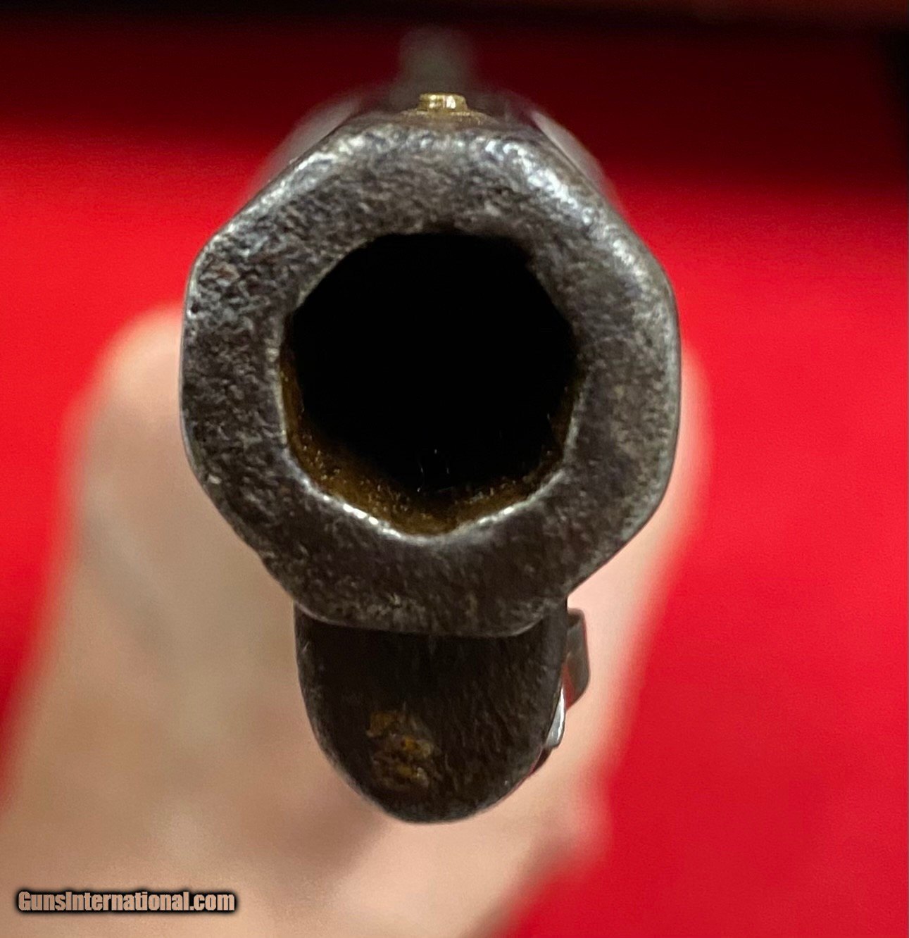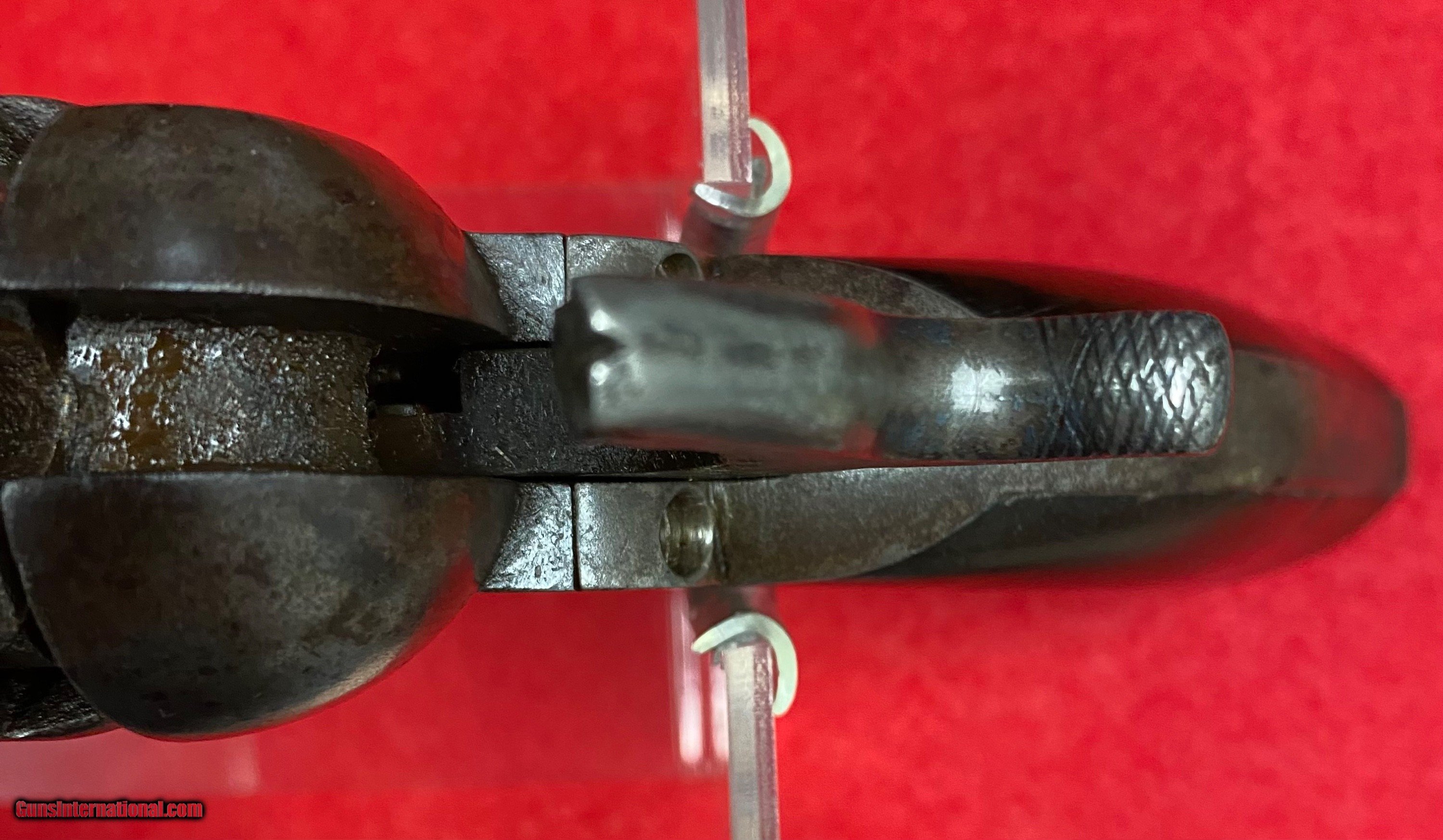 Description: Antique Colt 1851 Martially Marked Navy 3rd Model .36 percussion that was manufactured in 1856. All matching numbers on this Civil War era piece. Rare 168 year old gun that had its octagon barrel cut back from 7 1/2" to 5 1/2" somewhere during its early years. U.S. stamp clearly visible on left side of revolver. U.S.N. stamped on bottom of iron strap. Other Inspectors Stamps throughout the gun. Action functions fine with a tight lock up. All parts fit tightly with one another. Good bore with deep lands and grooves. Just a nice Civil War Era collectible. $35.00 insured shipping. SOLD Antique: Yes Handgun Caliber: .36 Manufacturer: Colt Model: 1851 Navy Serial Number: 61048 Barrel Length: 5 1/2” Chambers: Six Condition: Good Metal Condition: Good Wood Condition: Good Bore Condition: Good Action: SA Finish: Blue Sights: Fixed Manufacture Date: 1856 Item Location: WV |