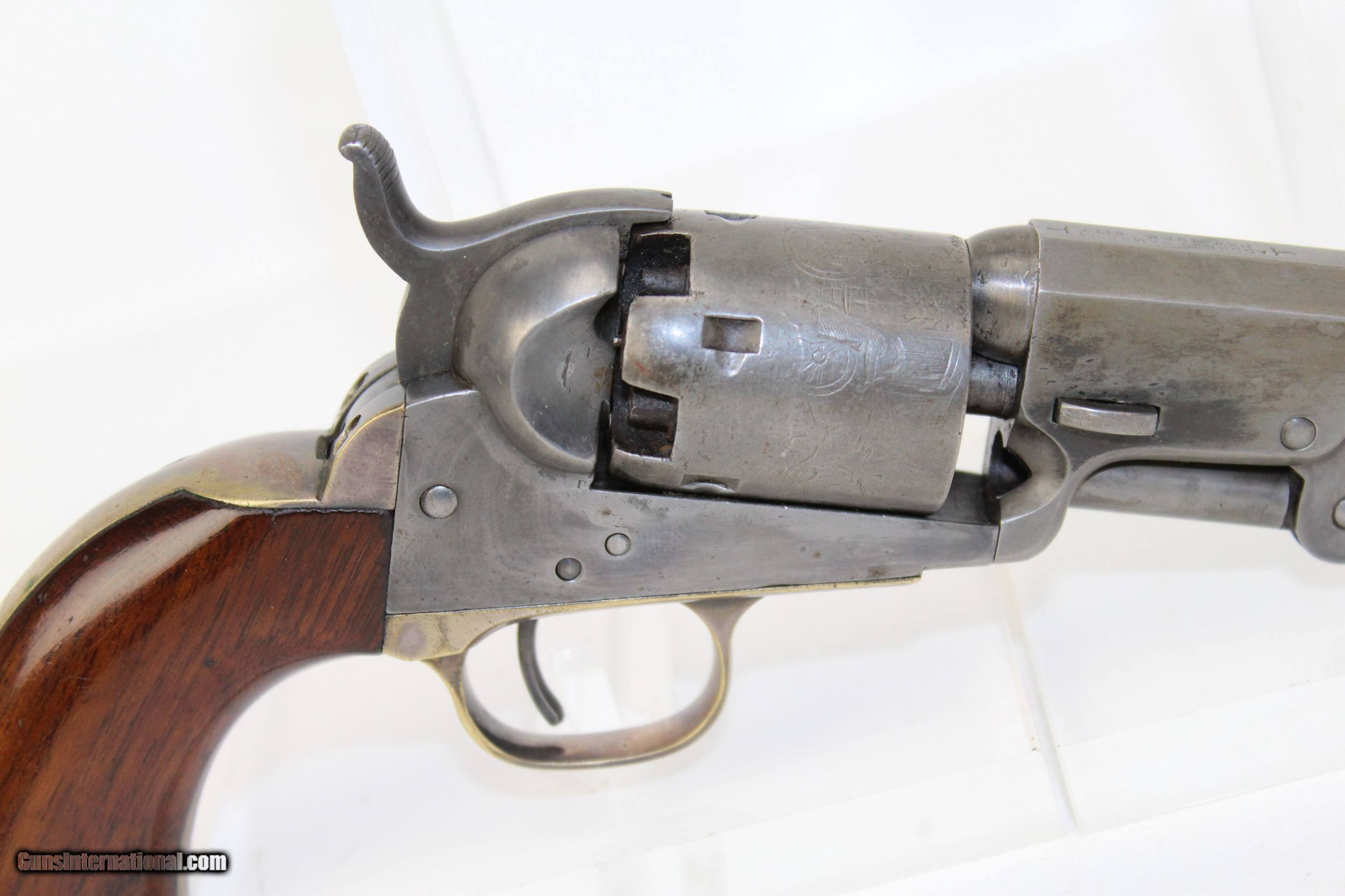Description: Antique Colt Model 1849 Pocket Revolver 19th Century Conceal and Carry Revolver Here we present an Antique Civil War Colt 1849 Pocket Revolver, made in 1858 in Hartford, Connecticut. Over 280,000 of these were produced by Colt’s factory at Hartford by the end of the American Civil War in 1865. These were very popular and saw a lot of use on the battlefield, on the home front and in the West. These were some of the smallest, handiest pocket revolvers of the time. One of the most aesthetically pleasing aspects of this pistol is its cylinder scene. Cylinder scenes during this period were common, especially for Colt, not only for their visual appeal, but because it made a revolver more difficult to forge. The scene on the 1849 Pocket is that of a stagecoach robbery. The focal point is the stagecoach drawn by four horses. A woman in a dress is seen framed in the doorway of the side of the coach. The driver is standing alongside wielding his pistol against multiple assailants as the horses rear and struggle against their harnesses. Several of the bandits lay dying on the ground, one tries to control the horses, two are running away and one is in the process of falling dead after being shot. Not a bad way to show interested buyers what a pistol like this would be good for. This Colt 1849 Pocket features a name inscribed on the backstrap: “A.M. Coffin”. The overall condition is very good. The steel surfaces have a smooth, light gray patina. The brass of the backstrap and trigger guard retain about 65% of the original silver finish. Case colors are still visible on the frame. The markings are clear and legible. The serial numbers match. The grips are in great shape. The bore is clear and bright with strong rifling. The action on this revolver is excellent. Own the original! This is a legitimate antique and not a reproduction. Barrel is 4 inches. Caliber: .31 Percussion Overall condition as seen in photos. Very Fast. Very Safe. FREE SHIPPING WORLDWIDE. Delivered directly to your door by express mail! Guaranteed AUTHENTIC & Includes CERTIFICATE OF AUTHENTICITY. ancestryguns $1600 #7226 SOLD Antique: Yes |