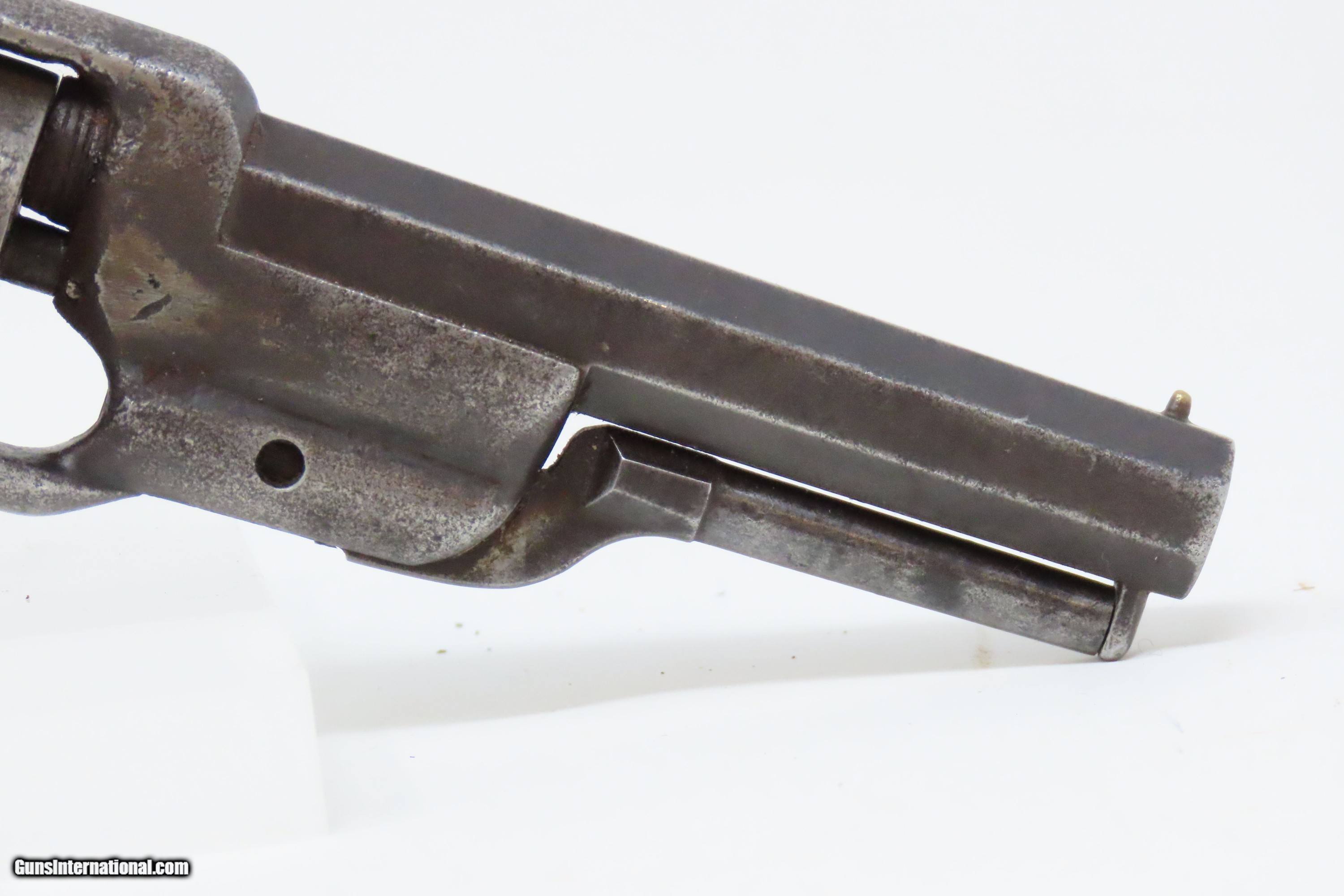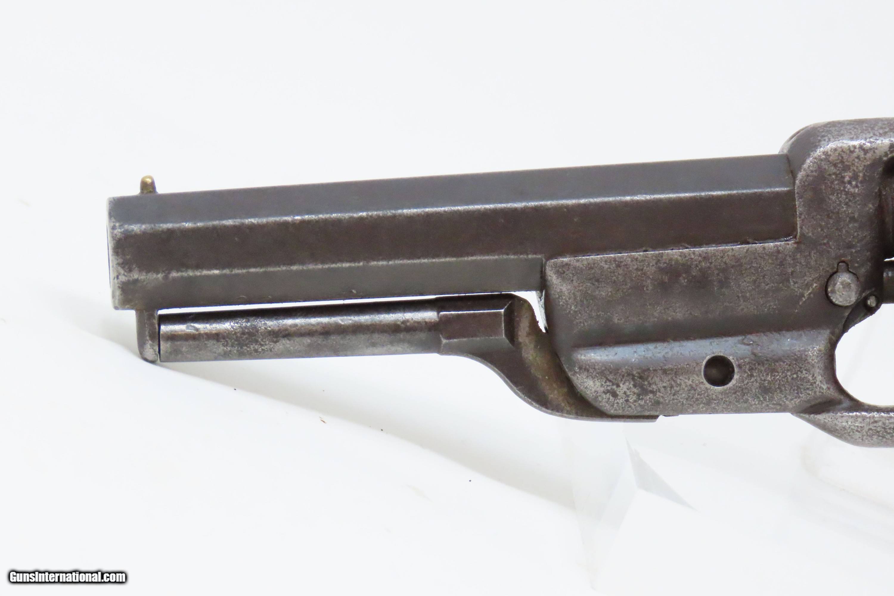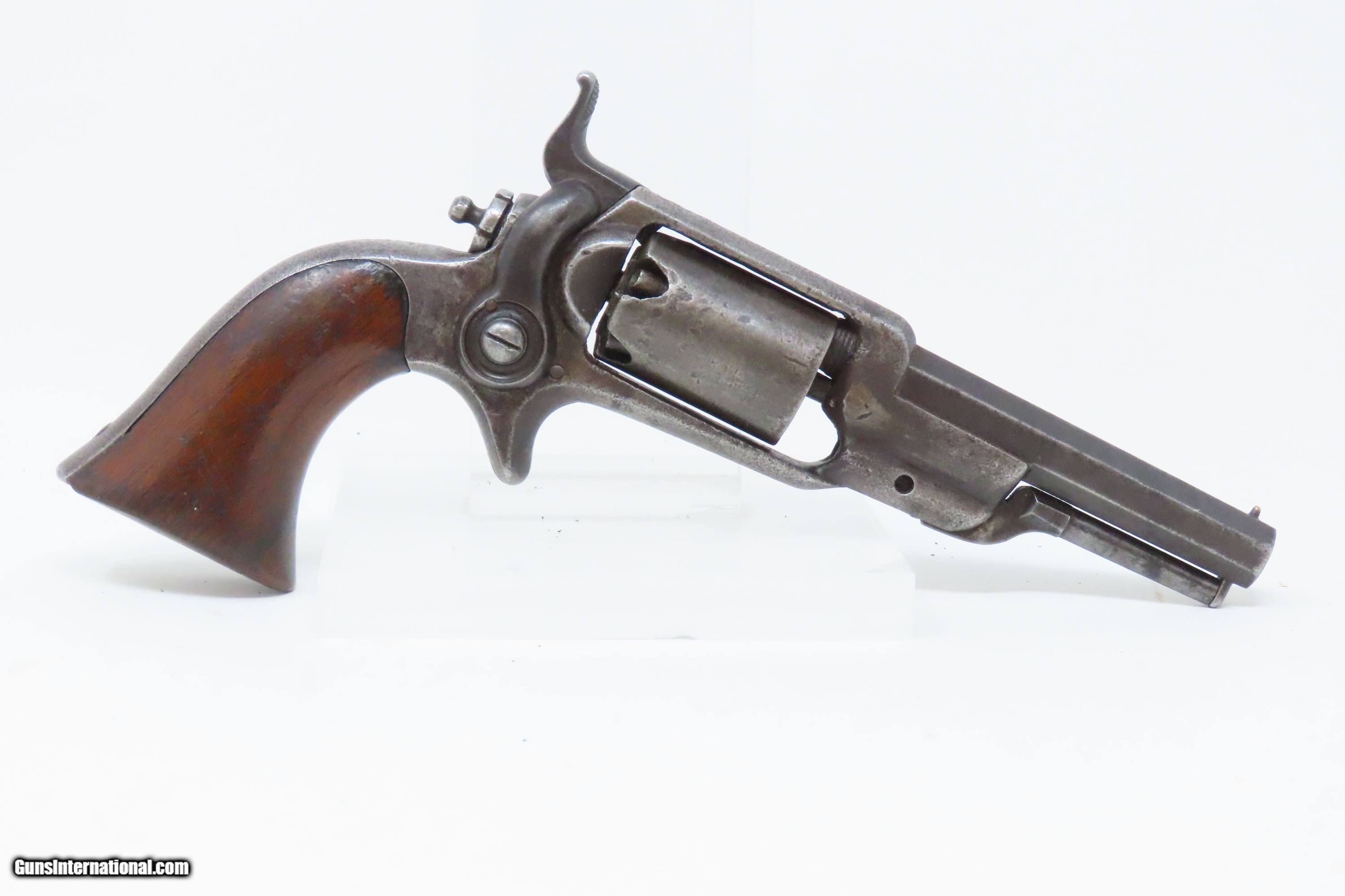 Description: Antique Pre-CIVIL WAR COLT Model 1855 “ROOT” Side-Hammer POCKET Revolver Second Year 1856 Production Side-hammer Revolver Here we present an antique Colt Model 1855 “Root” Side-hammer Pocket Revolver, made in 1856 in Hartford, Connecticut. This Samuel Colt design was named for his factory superintendent Elisha K. Root and is a telling example of Colt’s desire to innovate, which was probably the single biggest factor in his success. Though the Colt 1849 Pocket had been introduced only 6 years prior, the “Colonel” attempted to make an improved pocket revolver. The Root features Colt’s debut of the “creeping” style of loading lever which allowed for better mechanical advantage when loading the gun, Colt’s first solid frame, a hammer mounted on the right side for access to the cylinder axis pin, and a cylinder axis pin which was the point at which the hand turned the cylinder (versus on the cylinder itself). Many good ideas were tested in this design and some would prove worthy to be used in the future. The small parts used in the Root Revolver’s mechanism proved quite fragile, however upscaling them into the 1855 series of Revolving Rifles and Shotguns seemed to help. Colt is even known to have experimented with the Root design on a Dragoon pistol, a precursor to the 1860 Army. Overall, about 44,000 Root Revolvers were made from 1855-1870, much fewer than the 1849 Pocket with 340,000 produced. Though not a primary military arm during the American Civil War, handguns were commonly privately purchased by soldiers for use on the battlefield. Whether legend or fact, it is interesting to note something commonly read about pocket revolvers of the day: that while they could be used for self-defense against the enemy, many soldiers kept them on their person to defend themselves against an unwanted amputation in the primitive field hospitals that were notorious, even in their day. The overall condition is good. Gray, weathered patina throughout. The action is excellent with good cylinder index and lockup. The bore is in good shape with strong rifling. The grip has a small grafted repair at the toe and remains solid. Numbers match. Own the original! This is a legitimate antique and not a reproduction. Barrel is 3-1/2 inches. Caliber: .28 Percussion Overall condition as seen in photos. Very Fast. Very Safe. FREE SHIPPING WORLDWIDE. Delivered directly to your door by express mail! Guaranteed AUTHENTIC & Includes CERTIFICATE OF AUTHENTICITY. ancestryguns $2200 #228512 SOLD Antique: Yes |