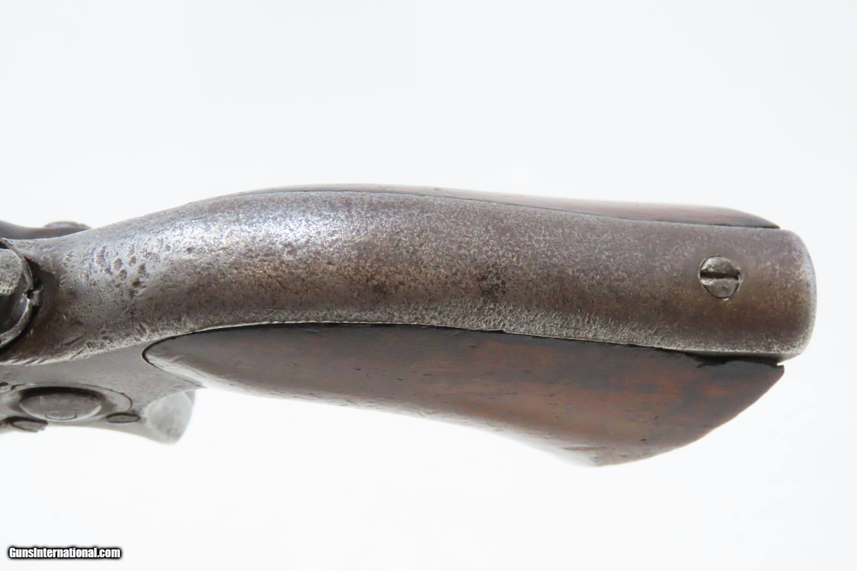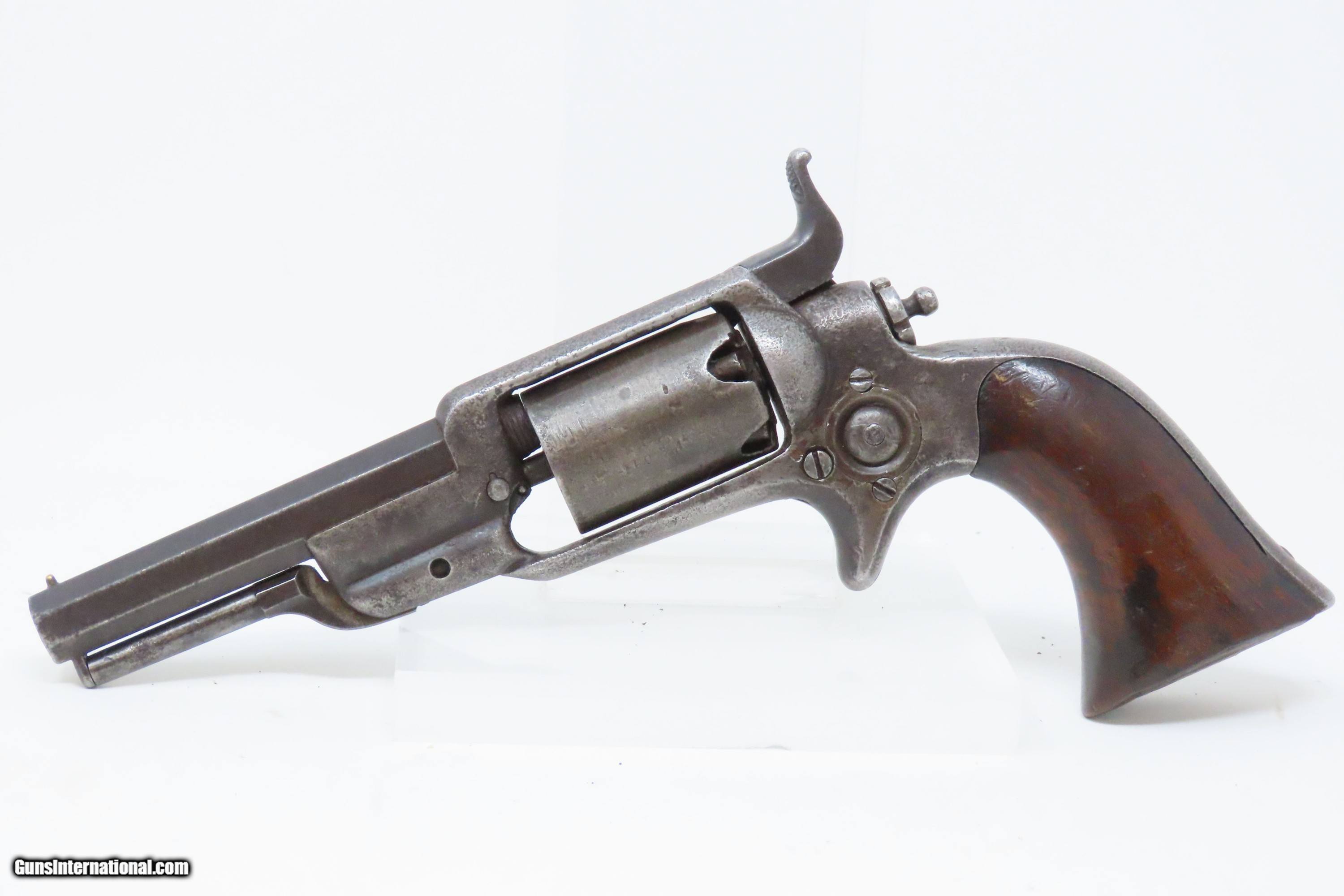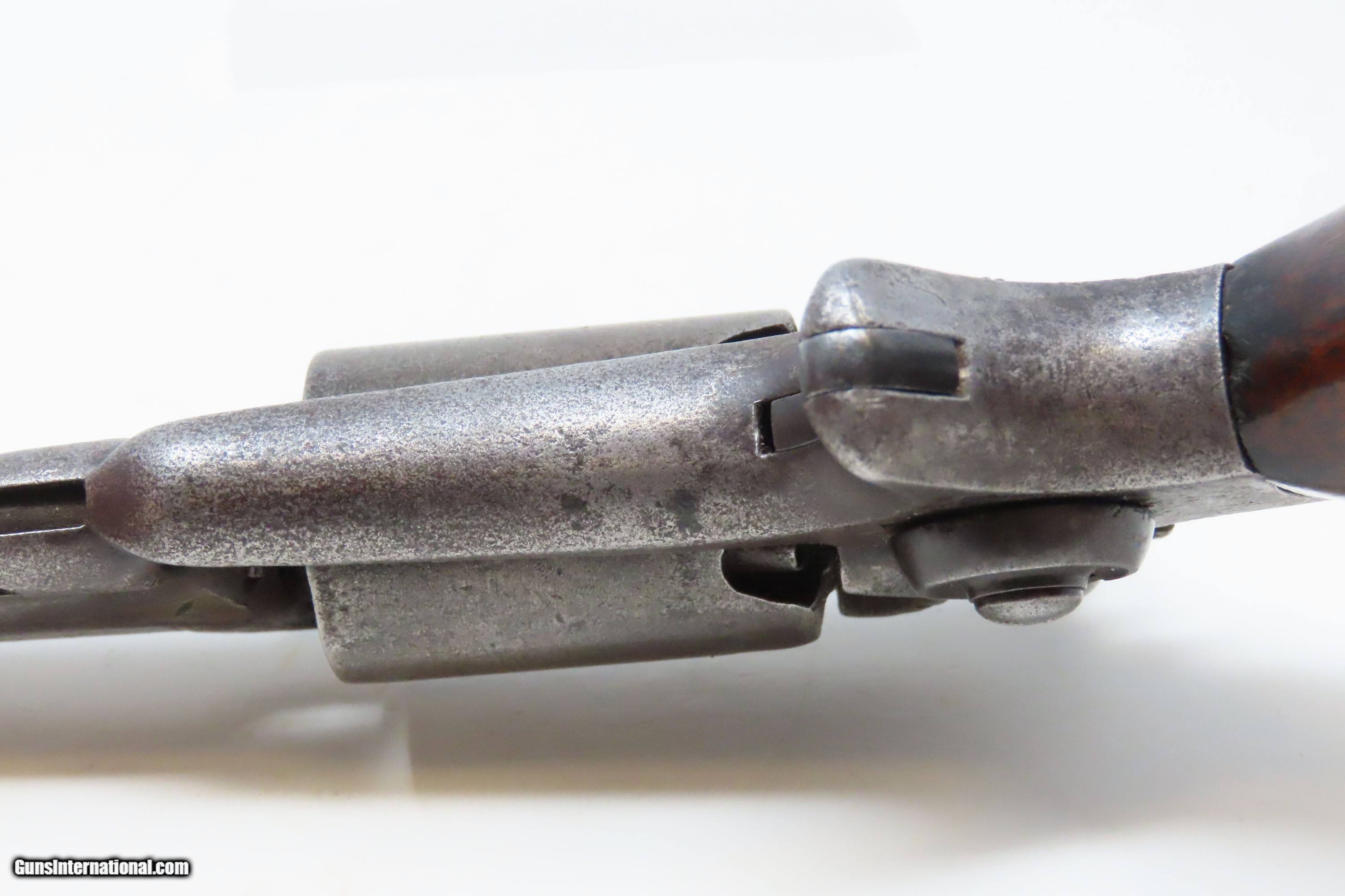 Description: Antique Pre-CIVIL WAR COLT Model 1855 “ROOT” Side-Hammer POCKET Revolver Second Year 1856 Production Side-hammer Revolver Here we present an antique Colt Model 1855 “Root” Side-hammer Pocket Revolver, made in 1856 in Hartford, Connecticut. This Samuel Colt design was named for his factory superintendent Elisha K. Root and is a telling example of Colt’s desire to innovate, which was probably the single biggest factor in his success. Though the Colt 1849 Pocket had been introduced only 6 years prior, the “Colonel” attempted to make an improved pocket revolver. The Root features Colt’s debut of the “creeping” style of loading lever which allowed for better mechanical advantage when loading the gun, Colt’s first solid frame, a hammer mounted on the right side for access to the cylinder axis pin, and a cylinder axis pin which was the point at which the hand turned the cylinder (versus on the cylinder itself). Many good ideas were tested in this design and some would prove worthy to be used in the future. The small parts used in the Root Revolver’s mechanism proved quite fragile, however upscaling them into the 1855 series of Revolving Rifles and Shotguns seemed to help. Colt is even known to have experimented with the Root design on a Dragoon pistol, a precursor to the 1860 Army. Overall, about 44,000 Root Revolvers were made from 1855-1870, much fewer than the 1849 Pocket with 340,000 produced. Though not a primary military arm during the American Civil War, handguns were commonly privately purchased by soldiers for use on the battlefield. Whether legend or fact, it is interesting to note something commonly read about pocket revolvers of the day: that while they could be used for self-defense against the enemy, many soldiers kept them on their person to defend themselves against an unwanted amputation in the primitive field hospitals that were notorious, even in their day. The overall condition is good. Gray, weathered patina throughout. The action is excellent with good cylinder index and lockup. The bore is in good shape with strong rifling. The grip has a small grafted repair at the toe and remains solid. Numbers match. Own the original! This is a legitimate antique and not a reproduction. Barrel is 3-1/2 inches. Caliber: .28 Percussion Overall condition as seen in photos. Very Fast. Very Safe. FREE SHIPPING WORLDWIDE. Delivered directly to your door by express mail! Guaranteed AUTHENTIC & Includes CERTIFICATE OF AUTHENTICITY. ancestryguns $2200 #228512 SOLD Antique: Yes |