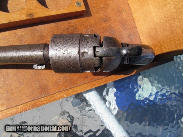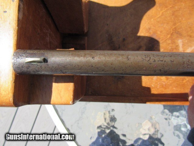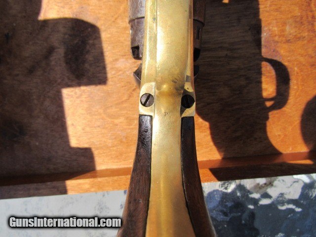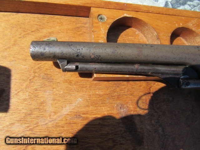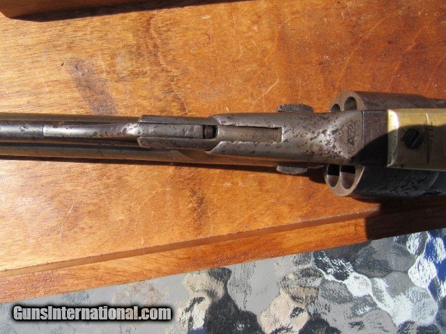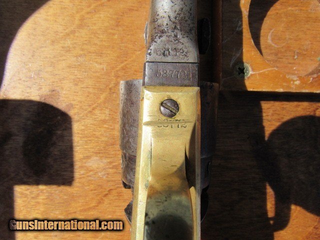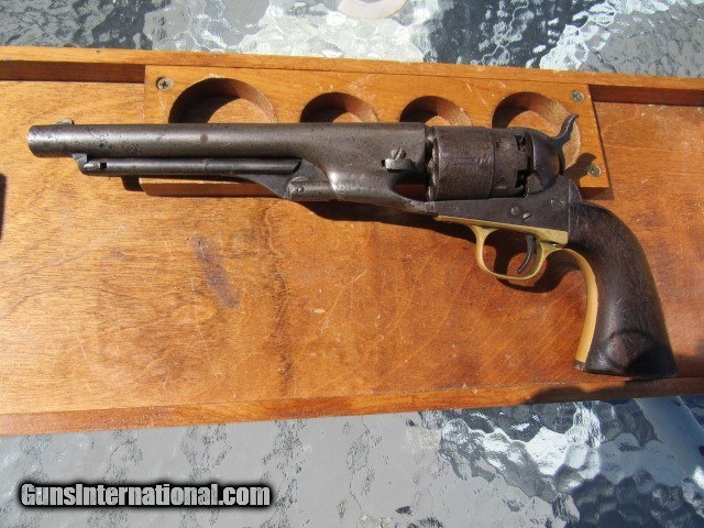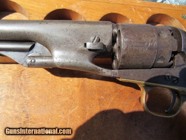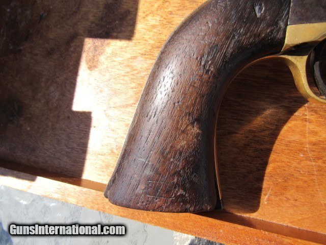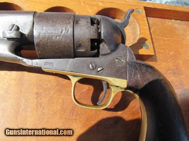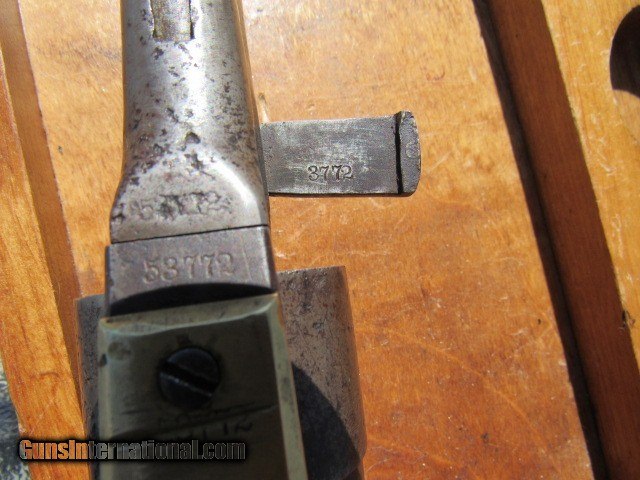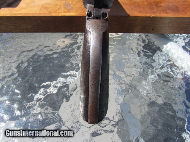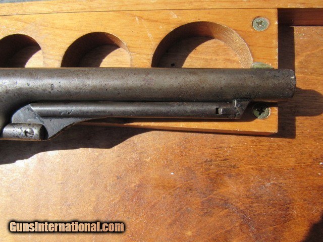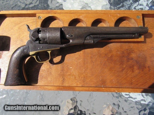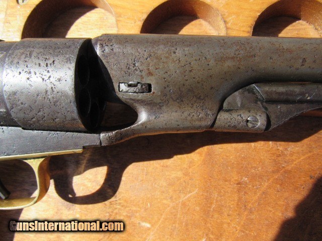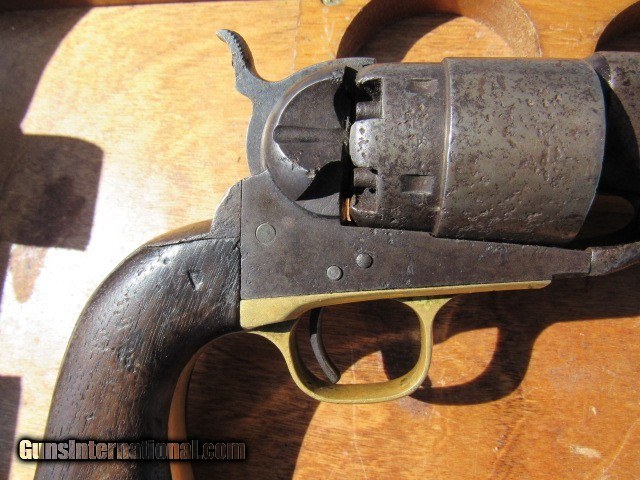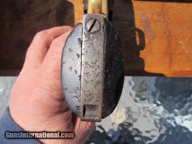 Description: Antique 1862 production original Colt Model 1860 Army 44 caliber percussion revolver with 8" barrel. This revolver is all original and all serial numbered parts match, including the wedge and cylinder pin. Serial number 53772. Barrel is marked with the New York address but marking is weak. Frame has a clear "COLTS PATENT" marking and the patent information clearly shows on the cylinder along with the partial serial number. 6 shot cylinder with all original nipples in good condition. Original walnut grips show wear but never sanded, cleaned or refinished. Cartouche on left grip is no longer legible due to wear. "JT" on right grip for John Taylor can still be made out. Upper portion of left grip also has a script "B" in a box so possible issue/marking of Company B, 10th Illinois Cavalry, which had several Colts in this serial number range. Brass trigger guard has turned a pleasing mellow ochre, never having been cleaned. Action locks up tightly and times perfectly. Strong hammer spring. Bore is near excellent having only slightly worn rifling and no areas of black powder roughness. Cylinder and most metal surfaces shows pitting and dings. Frame retains smoky traces of original case colors. All in all it grades NRA Antique Good and is a nice representation of the model. Interesting damage to the serial number on the brass trigger guard - appears to be a slash from a sword undertaken during hand-to-hand or close quarters battle. I picture the shooter firing all of his loads, not having time to reload, and putting up his hand holding the revolver to block a sword blow from his opponent. To me this is the only logical explanation - if someone stole the arm, they would have obliterated all the serial numbers, not just one. At any rate, I left it alone as it adds to the mystery and "battle charm" of the revolver. TERMS: No international sales. Antique so it can ship directly to you assuming your local laws allow it. Please be aware of what is legal in your state. 3 day non-firing inspection. Buyer pays return shipping. Payment by bank check, personal check or money order. Also now accepting payments through Zelle. All major credit cards accepted with 4% convenience fee added. Ships by UPS Ground with tracking. Always interested in used long guns and used antique handguns so please contact me if you have anything for sale or trade. 315.251.4799 with questions or concerns. Please keep in mind that I work a full time job during the week and may not be able to immediately respond to your text, phone, or email message. Thanks for looking! FREE SHIPPING! SOLD Antique: Yes Handgun Caliber: .44 Manufacturer: Colt Model: 1860 Army Serial Number: 53772 Barrel Length: 8" round Action: Single Action Revolver Manufacture Date: 1862 Item Location: New York |