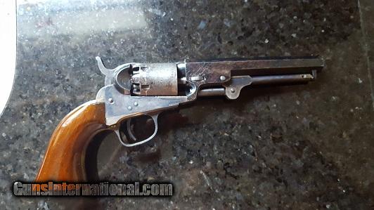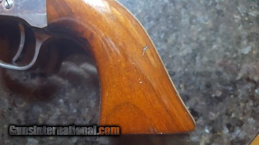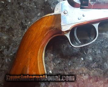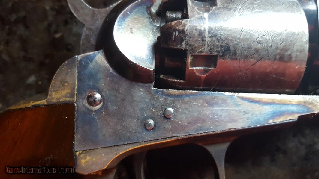 Description: Absolutely Beautiful Colt Model 1849 Pocket. Serial number 215814 was produced during the war in 1862. The pictures will really do the describing. Nipples and safety pin are perfect (note photo). Hardly used revolver. The case colors are as vibrant as I have seen.... the screws are excellent. Gun has a 5" barrel and large trigger guard. All edges and markings are crisp and sharp. Excellent++ Civil War Era Revolver. For the Colt Collector and/or the Civil War arms collector. 3450.00. Buyer pays 48.00 insurance and shipping. Honoring 3 day inspection. SOLD Antique: Yes Manufacturer: Colt Model: 1849 Pocket Caliber Info: .31 Barrels: 5 |