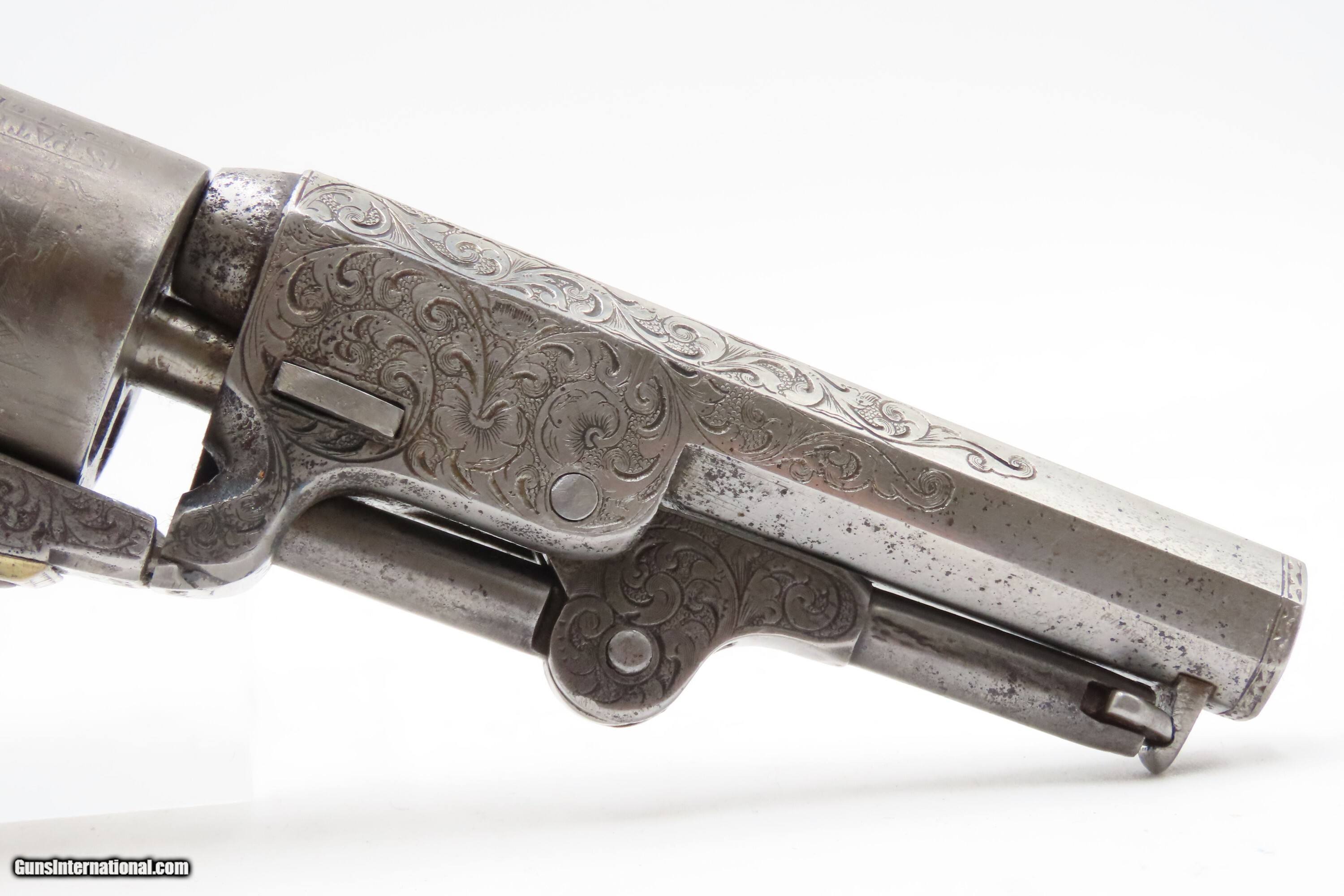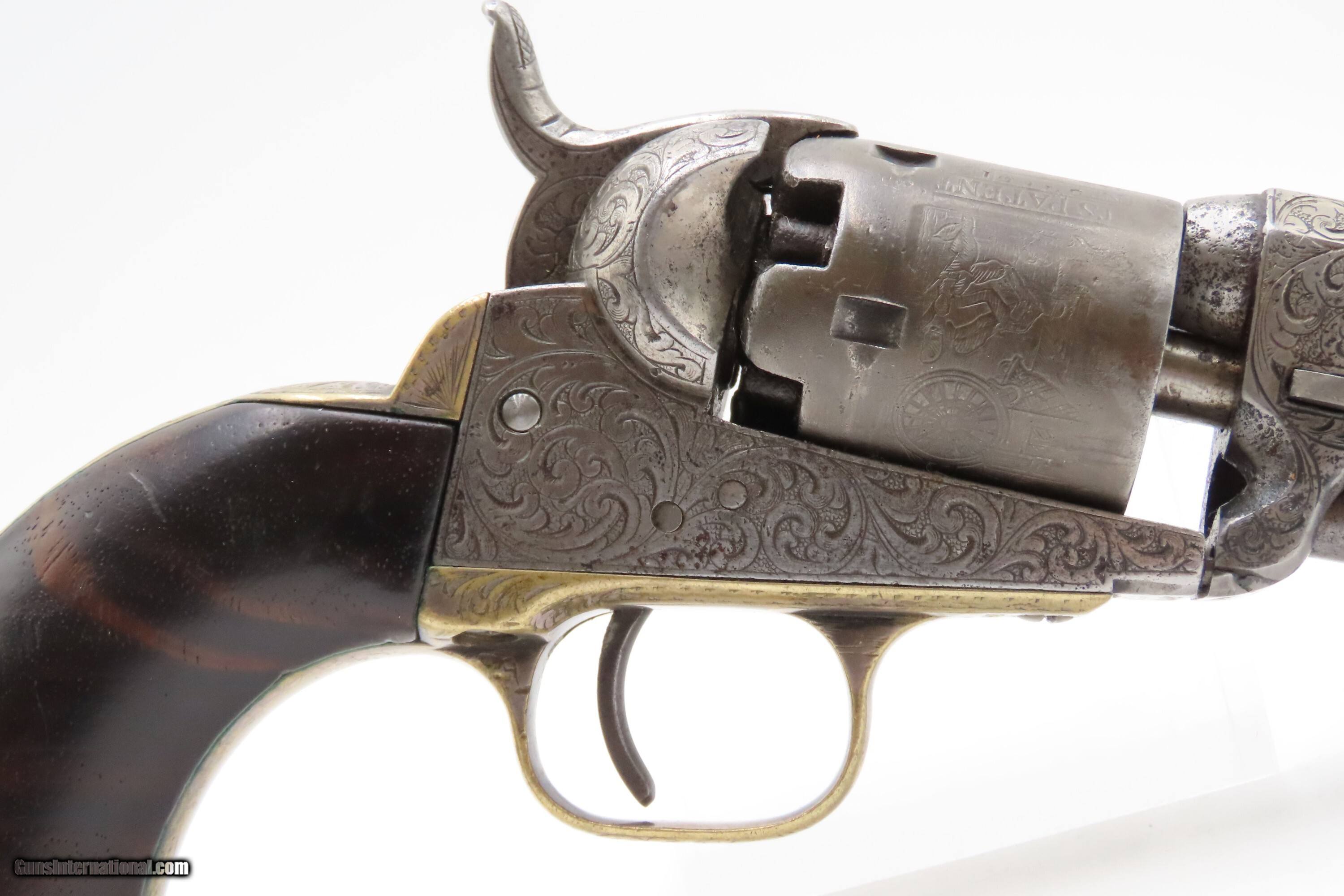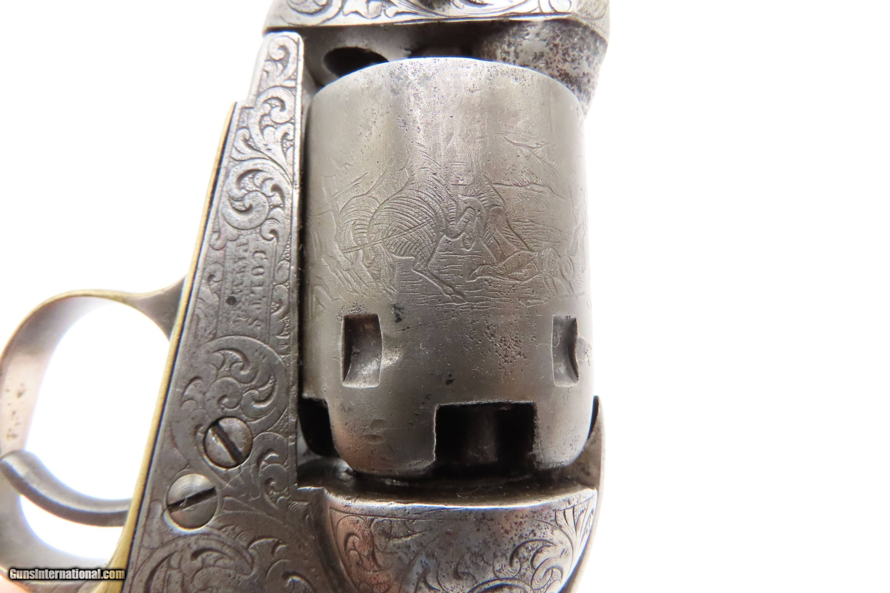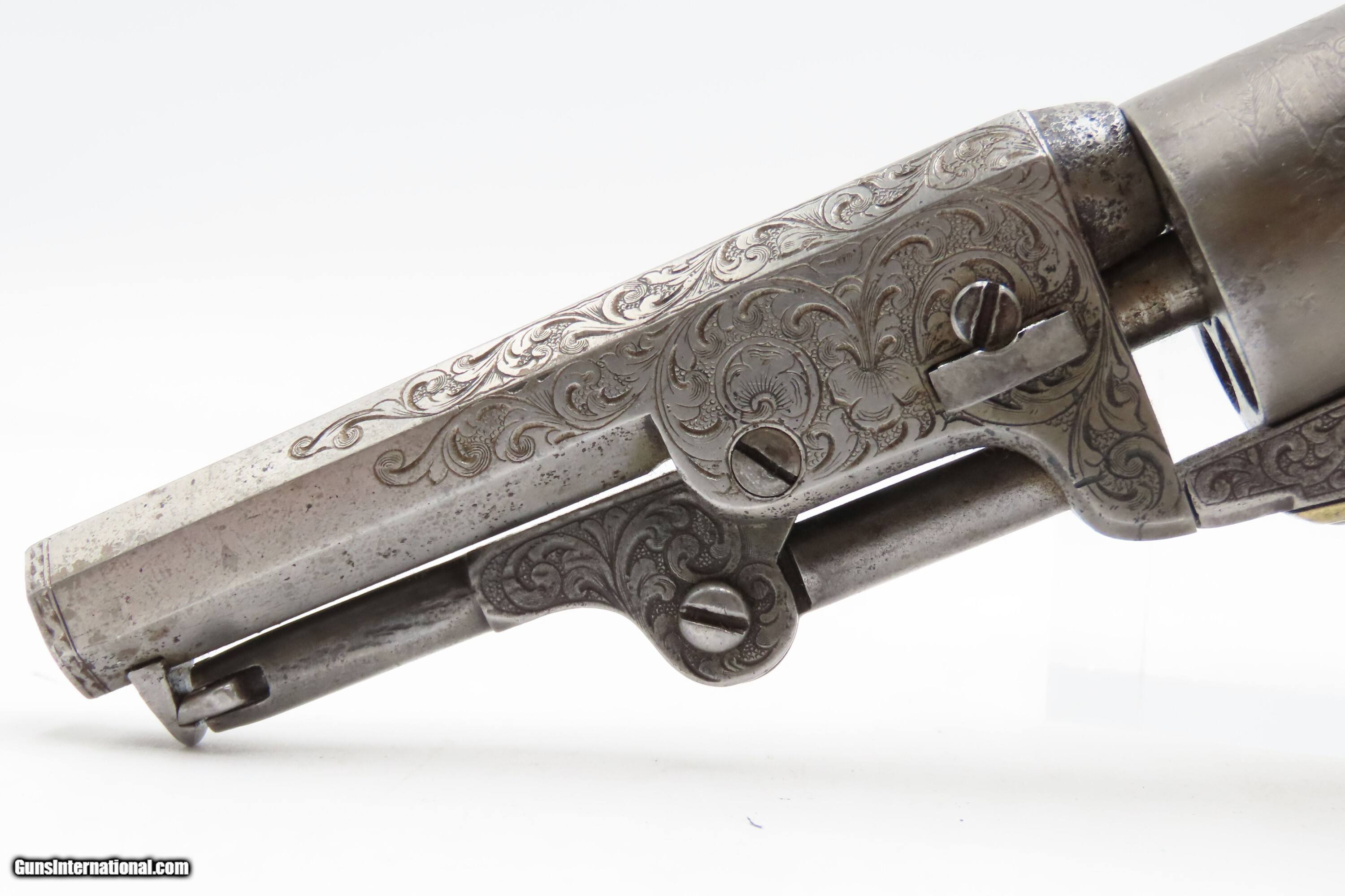 Description: CASED 1852 GUSTAVE YOUNG Era Factory Engraved COLT M1849 Revolver CIVIL WAR Antique .31 PERCUSSION Pocket Revolver ACCESSORIES Here Ancestry Guns presents an antique Cased & Factory Engraved Gustave Young Era Colt Model 1849 Percussion Pocket Revolver with Accessories, made in Hartford, Connecticut. Manufactured in 1852 while Gustave Young's shop was Colt's main contractor for engraving. It features the classic Gustave Young type fine floral scroll engraving with beaded backgrounds and foliate accents popularized by Young and other German trained engravers working for Colt in the 1850s and 1860s. Young ranks among the most well-known nineteenth-century engravers of American firearms and is today most recognized for his work with Colt. He immigrated to the United States from Germany in 1852, engraving for Colt from 1852 to 1858. He became a naturalized citizen in 1858. After a hiatus in Germany, he rejoined Colt somewhere around 1860. Young also engraved for the New Haven Arms Company, Smith & Wesson, as well as other arms makers. The Model 1849 Pocket, the replacement for the Baby Dragoon, was the most widely produced of any Colt percussion pistol. Nearly 340,000 were manufactured during its 23-year production run that ended in 1873. Over 280,000 of these were produced by Colt’s factory at Hartford by the end of the American Civil War in 1865. These were very popular and saw a lot of use on the battlefield, on the home front and in the West. These were some of the smallest, handiest pocket revolvers of the time. One of the most aesthetically pleasing aspects of this pistol is its cylinder scene. Cylinder scenes during this period were common, especially for Colt, not only for their visual appeal, but because it made a revolver more difficult to forge. The scene on the 1849 Pocket is that of a stagecoach robbery. The focal point is the stagecoach drawn by four horses. A woman in a dress is seen framed in the doorway of the side of the coach. The driver is standing alongside wielding his pistol against multiple assailants as the horses rear and struggle against their harnesses. Several of the bandits lay dying on the ground, one tries to control the horses, two are running away and one is in the process of falling dead after being shot. Not a bad way to show interested buyers what a pistol like this would be good for. It did a fine job as a self-defense handgun for the average citizen in 19th Century America. This revolver features the classic Gustave Young type fine floral scroll engraving with beaded backgrounds and animal mask and foliate accents popularized by Young and other German trained engravers working for Colt in the 1850s and 1860s. The “COLTS/PATENT” marking is inscribed among the scrollwork on the left rather than the usual stamped marking, with a standard two-line New York barrel address. There are matching visible serial numbers marked on the barrel, frame, cylinder, trigger guard, and butt, with matching “4601” on the loading lever. The factory dot marking designating the revolver for engraving and/or special finishing is marked above or below three of the main serial numbers. The back strap has a blank inscription section. Also included is a hardwood case with felt lined fitted interior containing a double sided eagle powder flask, two cavity bullet mold marked “COLTS/PATENT” on the sprue cutter, Eley London cap tin, lead balls, and a key. The overall condition is good. Original gray patina. Some original silver is present on the trigger guard and backstrap. The action is strong. The bore is semi-bright, slightly dimming at the muzzle with nice rifling. Markings are legible. Numbers match, except the replacement wedge is un-numbered. The cylinder is re-numbered. Solid grip, contains average wear. The engravings are sharp. Factory dot marked. The case and accessories are good. This is a very attractive revolver with early style Germanic scroll engraving possibly by the master, Gustave Young. Own the original! This is a legitimate antique and not a reproduction. Barrel is 4 inches. Caliber: .31 Percussion Overall condition as seen in photos. Very Fast. Very Safe. FREE SHIPPING WORLDWIDE. Delivered directly to your door by express mail! Guaranteed AUTHENTIC & Includes CERTIFICATE OF AUTHENTICITY. $9600 #259650 Antique: Yes Price: $9,600.00 Buy Now Pay with