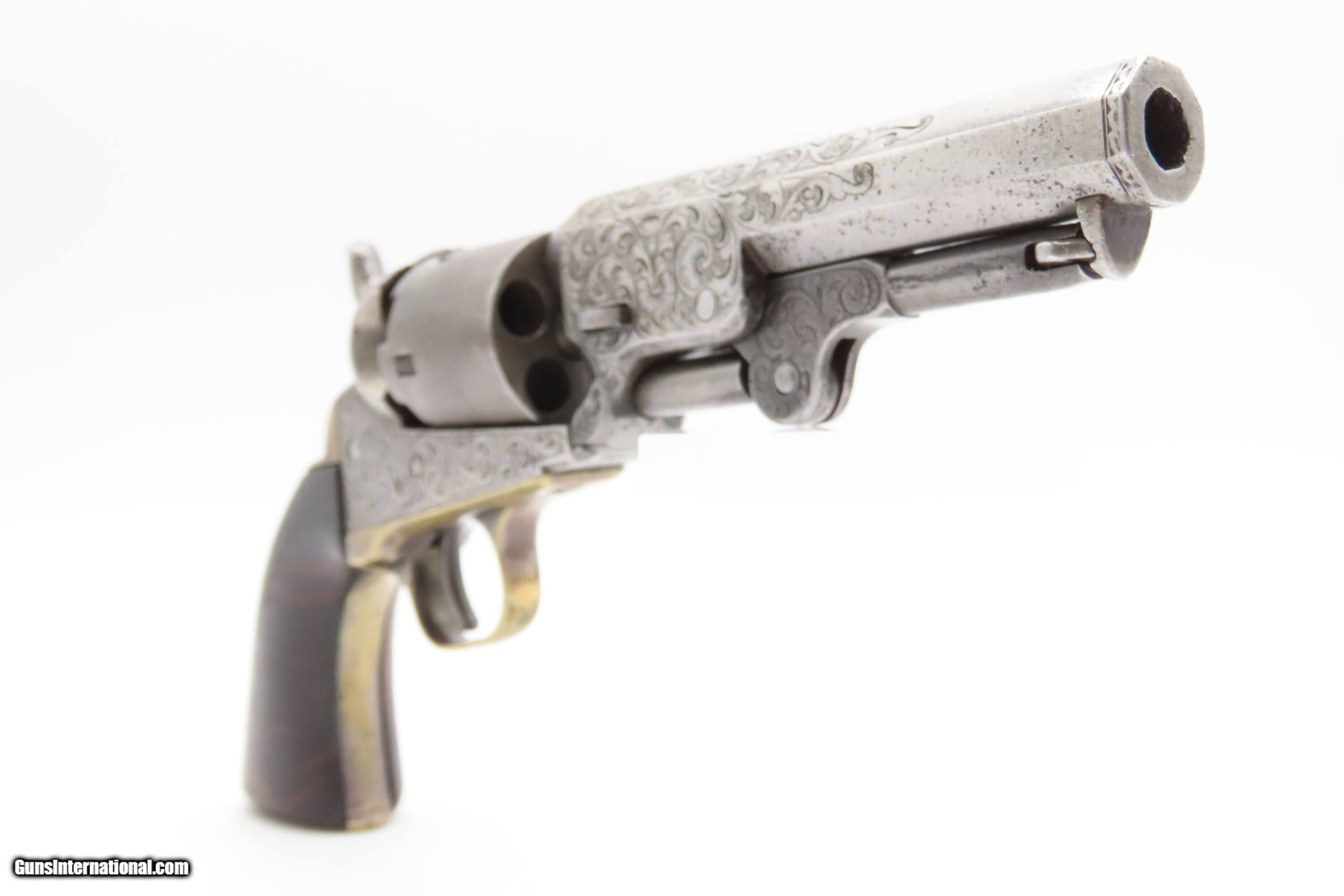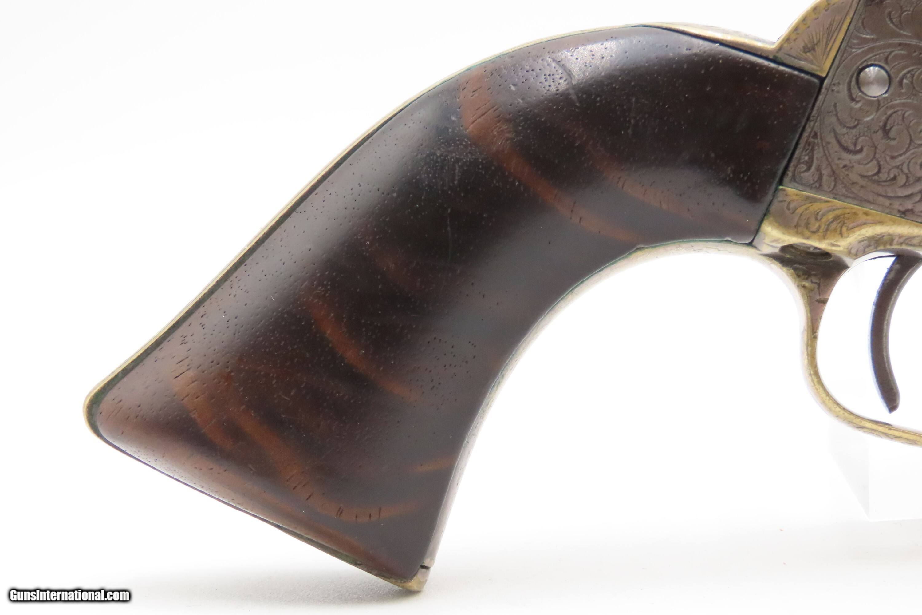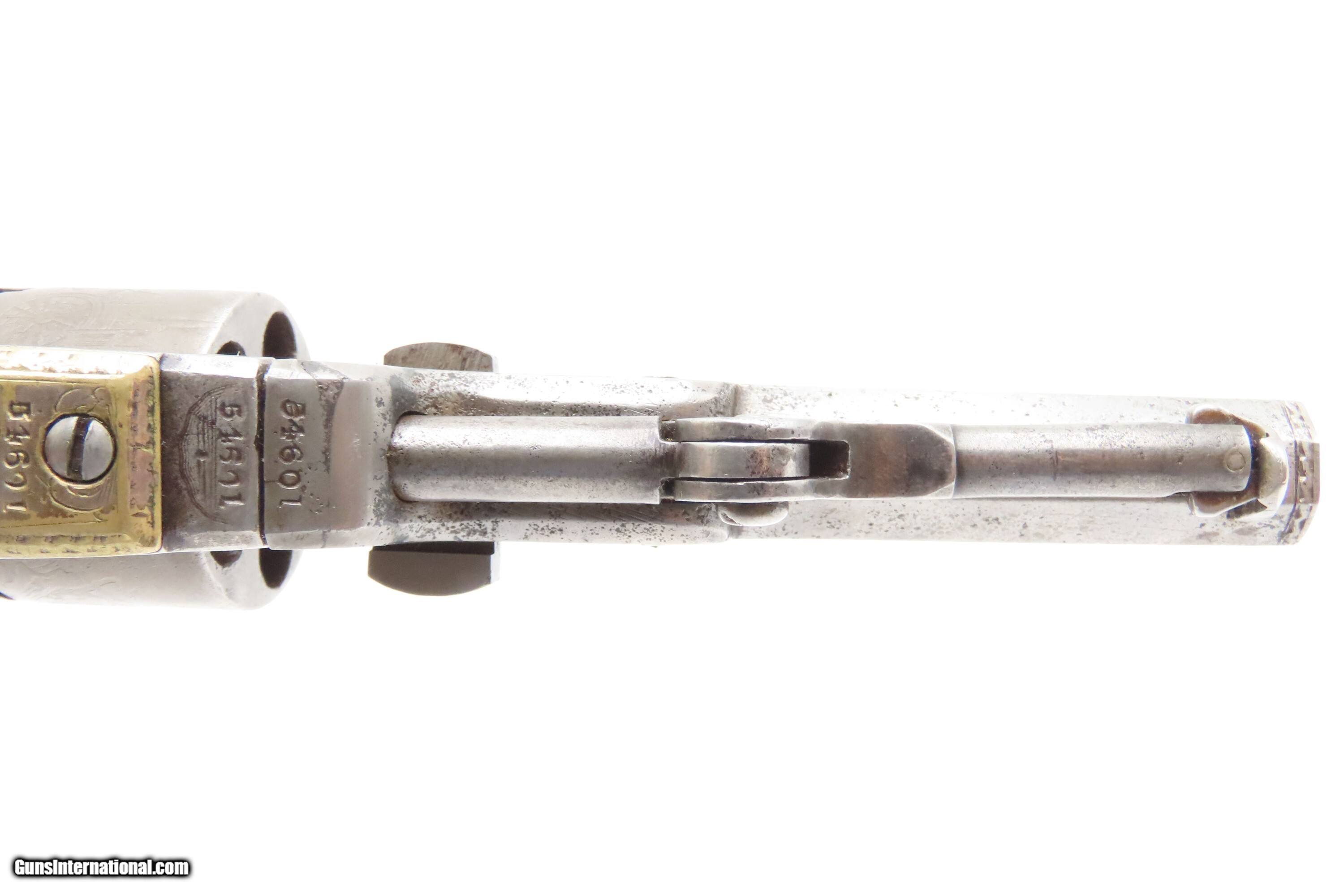 Description: CASED 1852 GUSTAVE YOUNG Era Factory Engraved COLT M1849 Revolver CIVIL WAR Antique .31 PERCUSSION Pocket Revolver ACCESSORIES Here Ancestry Guns presents an antique Cased & Factory Engraved Gustave Young Era Colt Model 1849 Percussion Pocket Revolver with Accessories, made in Hartford, Connecticut. Manufactured in 1852 while Gustave Young's shop was Colt's main contractor for engraving. It features the classic Gustave Young type fine floral scroll engraving with beaded backgrounds and foliate accents popularized by Young and other German trained engravers working for Colt in the 1850s and 1860s. Young ranks among the most well-known nineteenth-century engravers of American firearms and is today most recognized for his work with Colt. He immigrated to the United States from Germany in 1852, engraving for Colt from 1852 to 1858. He became a naturalized citizen in 1858. After a hiatus in Germany, he rejoined Colt somewhere around 1860. Young also engraved for the New Haven Arms Company, Smith & Wesson, as well as other arms makers. The Model 1849 Pocket, the replacement for the Baby Dragoon, was the most widely produced of any Colt percussion pistol. Nearly 340,000 were manufactured during its 23-year production run that ended in 1873. Over 280,000 of these were produced by Colt’s factory at Hartford by the end of the American Civil War in 1865. These were very popular and saw a lot of use on the battlefield, on the home front and in the West. These were some of the smallest, handiest pocket revolvers of the time. One of the most aesthetically pleasing aspects of this pistol is its cylinder scene. Cylinder scenes during this period were common, especially for Colt, not only for their visual appeal, but because it made a revolver more difficult to forge. The scene on the 1849 Pocket is that of a stagecoach robbery. The focal point is the stagecoach drawn by four horses. A woman in a dress is seen framed in the doorway of the side of the coach. The driver is standing alongside wielding his pistol against multiple assailants as the horses rear and struggle against their harnesses. Several of the bandits lay dying on the ground, one tries to control the horses, two are running away and one is in the process of falling dead after being shot. Not a bad way to show interested buyers what a pistol like this would be good for. It did a fine job as a self-defense handgun for the average citizen in 19th Century America. This revolver features the classic Gustave Young type fine floral scroll engraving with beaded backgrounds and animal mask and foliate accents popularized by Young and other German trained engravers working for Colt in the 1850s and 1860s. The “COLTS/PATENT” marking is inscribed among the scrollwork on the left rather than the usual stamped marking, with a standard two-line New York barrel address. There are matching visible serial numbers marked on the barrel, frame, cylinder, trigger guard, and butt, with matching “4601” on the loading lever. The factory dot marking designating the revolver for engraving and/or special finishing is marked above or below three of the main serial numbers. The back strap has a blank inscription section. Also included is a hardwood case with felt lined fitted interior containing a double sided eagle powder flask, two cavity bullet mold marked “COLTS/PATENT” on the sprue cutter, Eley London cap tin, lead balls, and a key. The overall condition is good. Original gray patina. Some original silver is present on the trigger guard and backstrap. The action is strong. The bore is semi-bright, slightly dimming at the muzzle with nice rifling. Markings are legible. Numbers match, except the replacement wedge is un-numbered. The cylinder is re-numbered. Solid grip, contains average wear. The engravings are sharp. Factory dot marked. The case and accessories are good. This is a very attractive revolver with early style Germanic scroll engraving possibly by the master, Gustave Young. Own the original! This is a legitimate antique and not a reproduction. Barrel is 4 inches. Caliber: .31 Percussion Overall condition as seen in photos. Very Fast. Very Safe. FREE SHIPPING WORLDWIDE. Delivered directly to your door by express mail! Guaranteed AUTHENTIC & Includes CERTIFICATE OF AUTHENTICITY. $9600 #259650 Antique: Yes Price: $9,600.00 Buy Now Pay with
