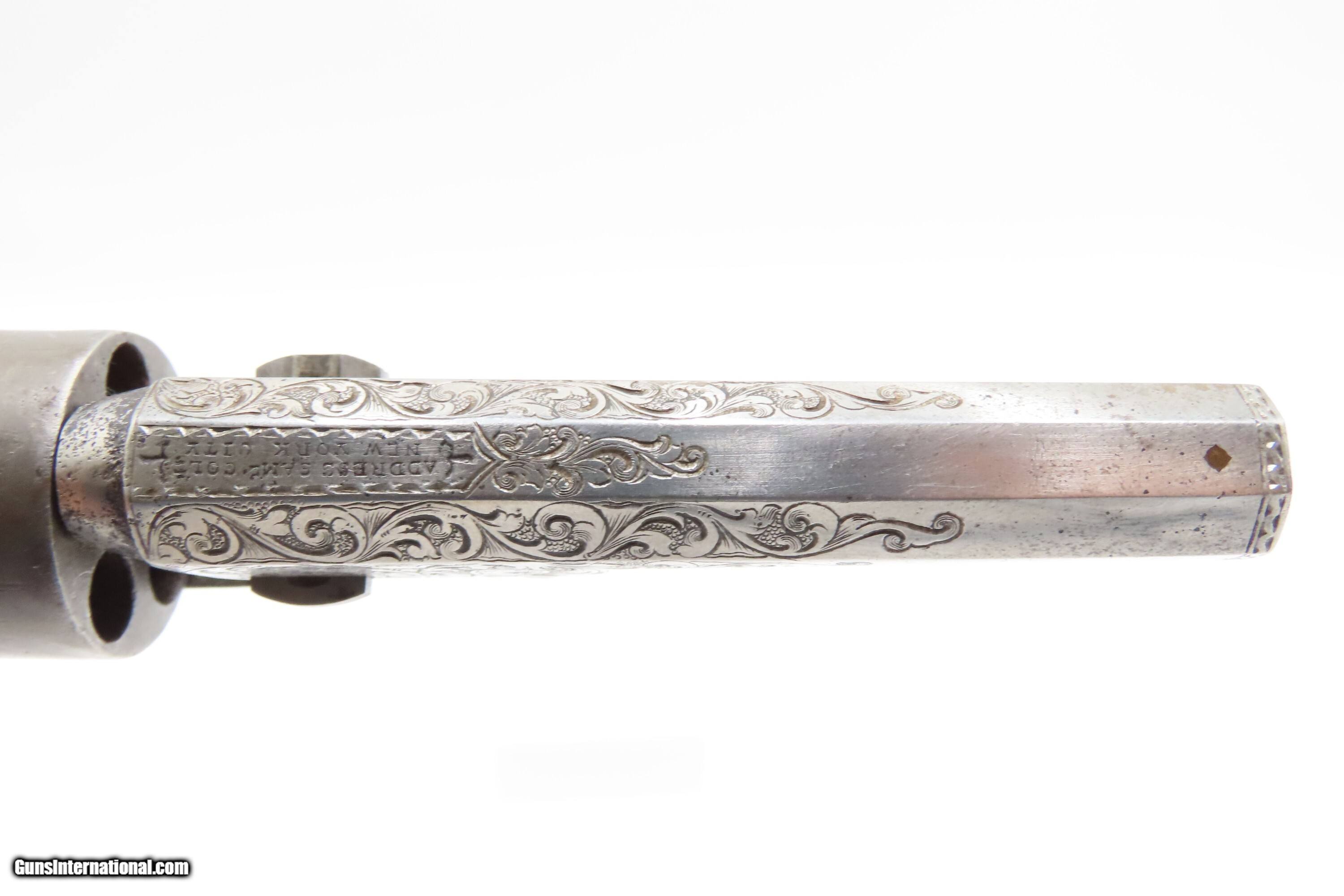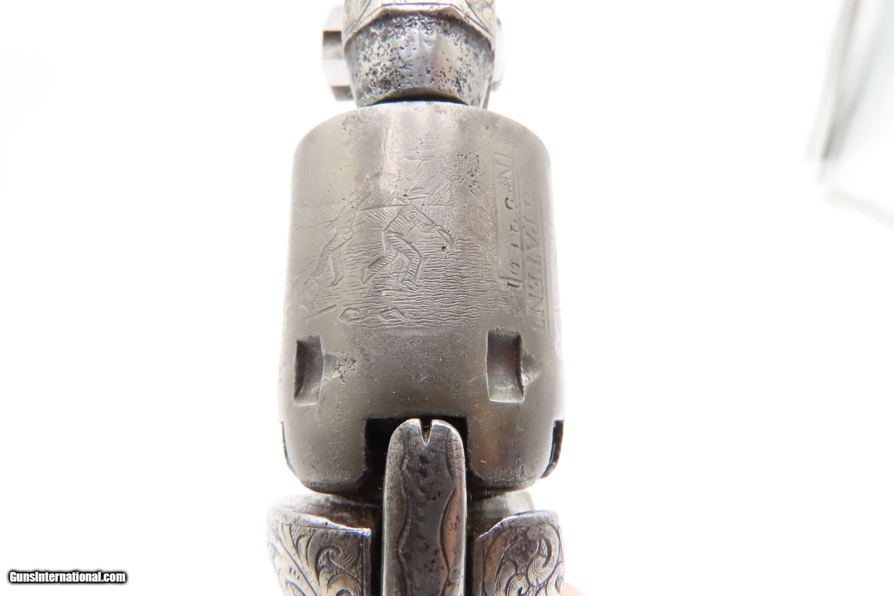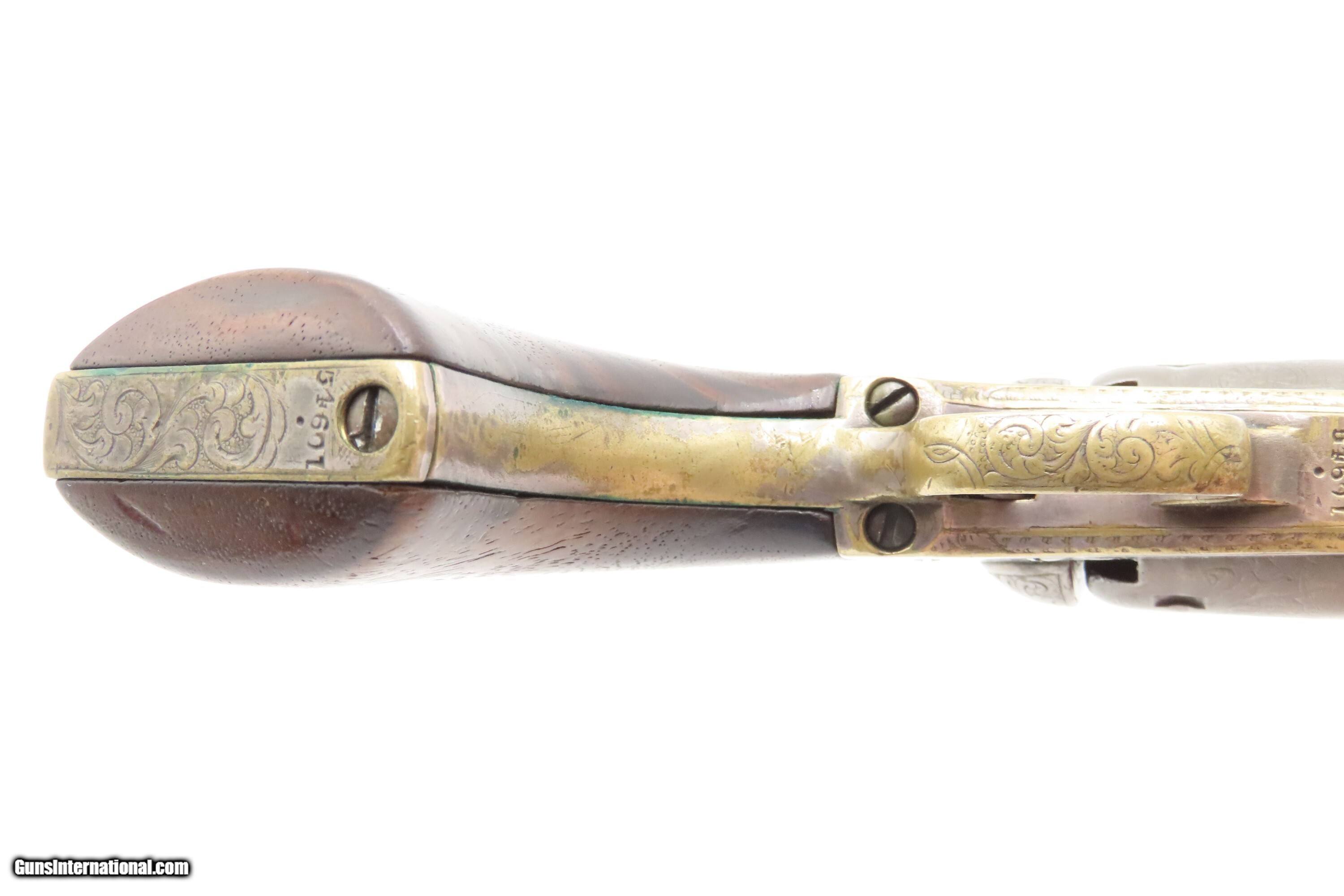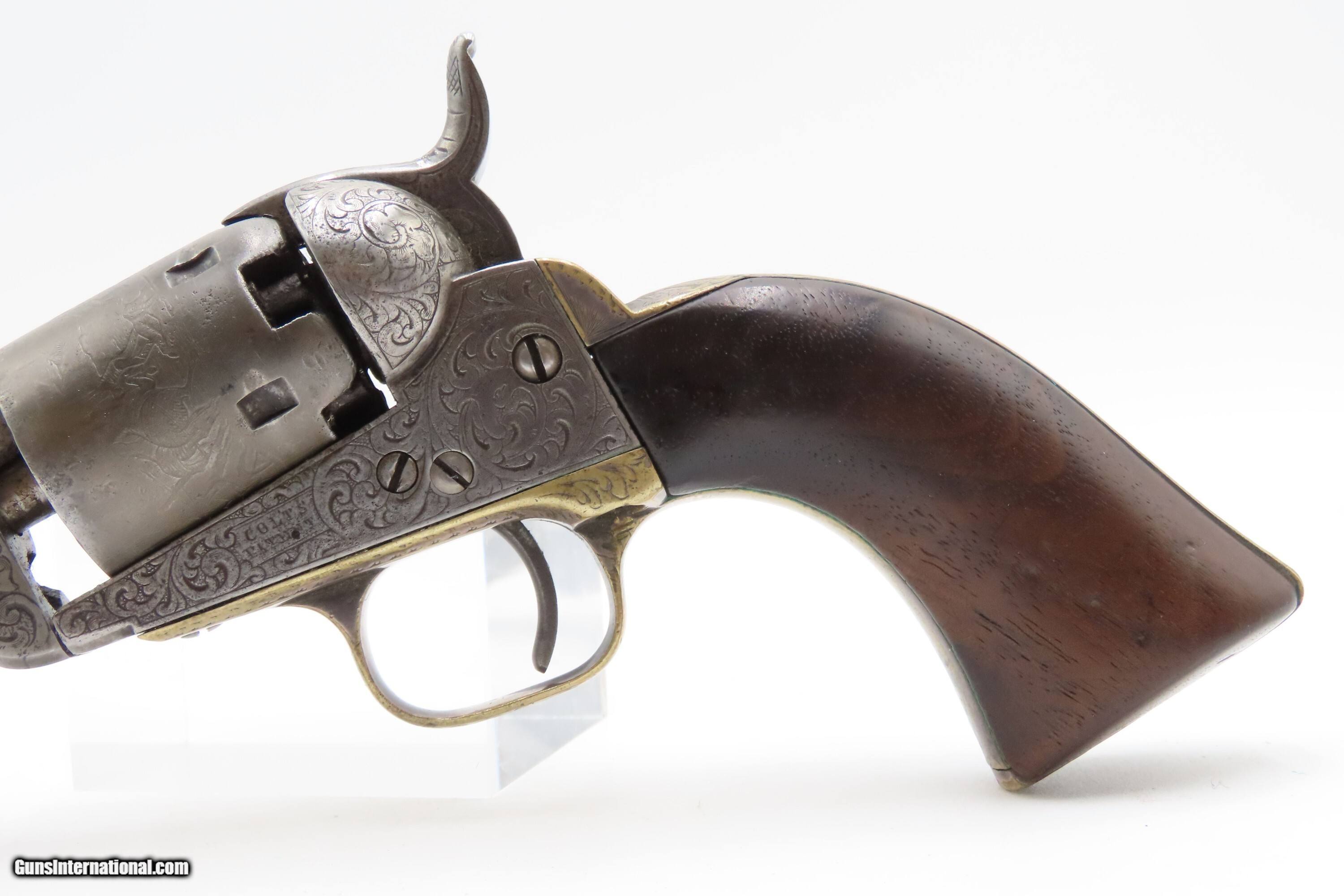 Description: CASED 1852 GUSTAVE YOUNG Era Factory Engraved COLT M1849 Revolver CIVIL WAR Antique .31 PERCUSSION Pocket Revolver ACCESSORIES Here Ancestry Guns presents an antique Cased & Factory Engraved Gustave Young Era Colt Model 1849 Percussion Pocket Revolver with Accessories, made in Hartford, Connecticut. Manufactured in 1852 while Gustave Young's shop was Colt's main contractor for engraving. It features the classic Gustave Young type fine floral scroll engraving with beaded backgrounds and foliate accents popularized by Young and other German trained engravers working for Colt in the 1850s and 1860s. Young ranks among the most well-known nineteenth-century engravers of American firearms and is today most recognized for his work with Colt. He immigrated to the United States from Germany in 1852, engraving for Colt from 1852 to 1858. He became a naturalized citizen in 1858. After a hiatus in Germany, he rejoined Colt somewhere around 1860. Young also engraved for the New Haven Arms Company, Smith & Wesson, as well as other arms makers. The Model 1849 Pocket, the replacement for the Baby Dragoon, was the most widely produced of any Colt percussion pistol. Nearly 340,000 were manufactured during its 23-year production run that ended in 1873. Over 280,000 of these were produced by Colt’s factory at Hartford by the end of the American Civil War in 1865. These were very popular and saw a lot of use on the battlefield, on the home front and in the West. These were some of the smallest, handiest pocket revolvers of the time. One of the most aesthetically pleasing aspects of this pistol is its cylinder scene. Cylinder scenes during this period were common, especially for Colt, not only for their visual appeal, but because it made a revolver more difficult to forge. The scene on the 1849 Pocket is that of a stagecoach robbery. The focal point is the stagecoach drawn by four horses. A woman in a dress is seen framed in the doorway of the side of the coach. The driver is standing alongside wielding his pistol against multiple assailants as the horses rear and struggle against their harnesses. Several of the bandits lay dying on the ground, one tries to control the horses, two are running away and one is in the process of falling dead after being shot. Not a bad way to show interested buyers what a pistol like this would be good for. It did a fine job as a self-defense handgun for the average citizen in 19th Century America. This revolver features the classic Gustave Young type fine floral scroll engraving with beaded backgrounds and animal mask and foliate accents popularized by Young and other German trained engravers working for Colt in the 1850s and 1860s. The “COLTS/PATENT” marking is inscribed among the scrollwork on the left rather than the usual stamped marking, with a standard two-line New York barrel address. There are matching visible serial numbers marked on the barrel, frame, cylinder, trigger guard, and butt, with matching “4601” on the loading lever. The factory dot marking designating the revolver for engraving and/or special finishing is marked above or below three of the main serial numbers. The back strap has a blank inscription section. Also included is a hardwood case with felt lined fitted interior containing a double sided eagle powder flask, two cavity bullet mold marked “COLTS/PATENT” on the sprue cutter, Eley London cap tin, lead balls, and a key. The overall condition is good. Original gray patina. Some original silver is present on the trigger guard and backstrap. The action is strong. The bore is semi-bright, slightly dimming at the muzzle with nice rifling. Markings are legible. Numbers match, except the replacement wedge is un-numbered. The cylinder is re-numbered. Solid grip, contains average wear. The engravings are sharp. Factory dot marked. The case and accessories are good. This is a very attractive revolver with early style Germanic scroll engraving possibly by the master, Gustave Young. Own the original! This is a legitimate antique and not a reproduction. Barrel is 4 inches. Caliber: .31 Percussion Overall condition as seen in photos. Very Fast. Very Safe. FREE SHIPPING WORLDWIDE. Delivered directly to your door by express mail! Guaranteed AUTHENTIC & Includes CERTIFICATE OF AUTHENTICITY. $9600 #259650 Antique: Yes Price: $9,600.00 Buy Now Pay with