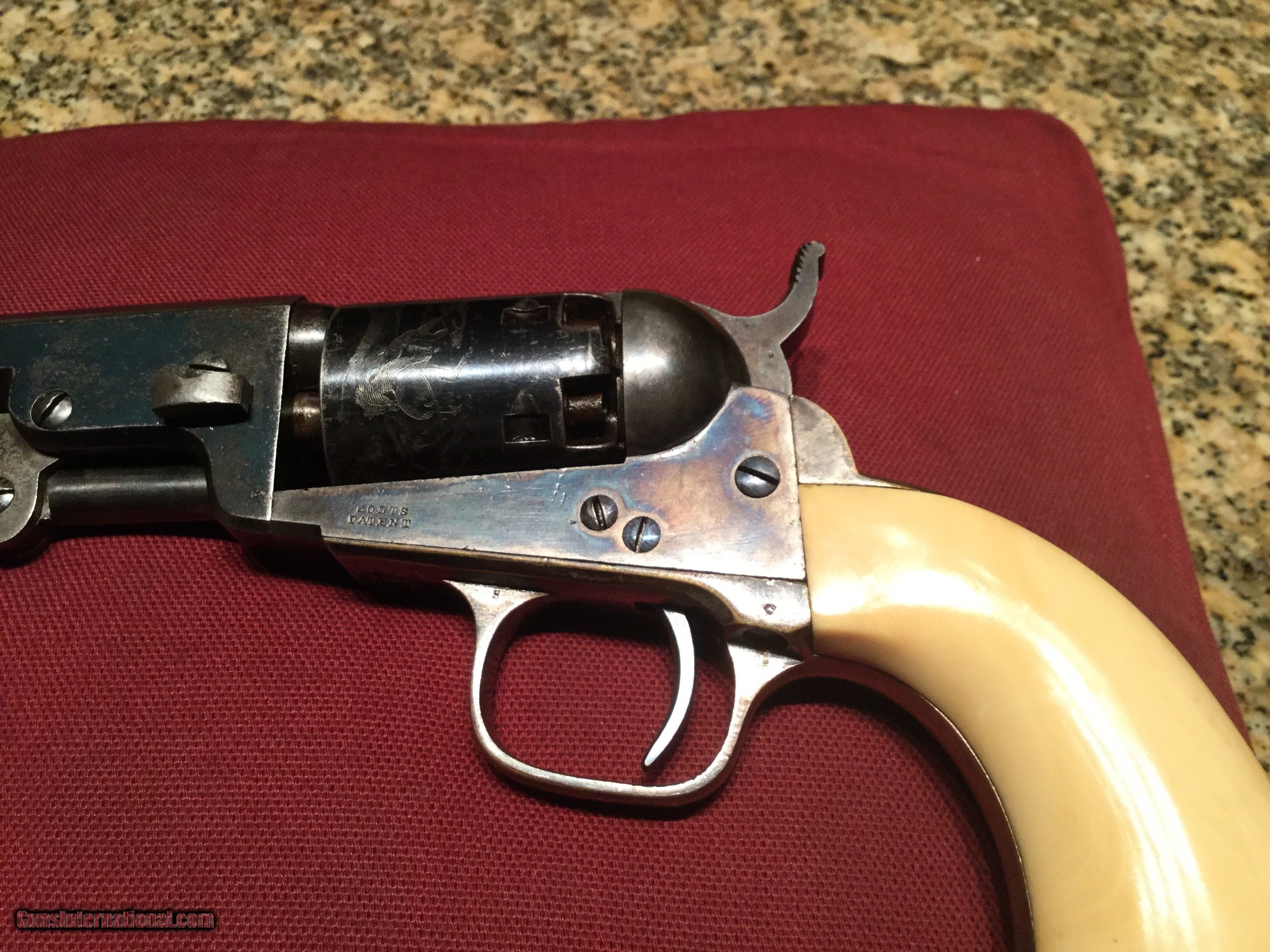 Description: SALE PENDING 3/14/2020 Cased 1849 Colt Pocket with Ivory Grips manufactured in 1863. Overall, this is a 90+% Revolver. Ivory grips are near mint. Barrel blue is 95% with slight flaking beginning on left side. Cylinder scene and cylinder blue 90+% with minor typical drag marks. The bore suggests little or no use. Case colors cannot be given a number but the photos tell the story. Trigger guard and backstrap retain about 75% of silver but tarnished and dark. Case is excellent with small crack in left front of lid and normal interior wear. Includes Colt’s Patent Flask with significant lacquer remaining with shallow dent on reverse side. Bullet mold shows dings and some loss of blue. Tin of percussion caps, key and some cast projectiles also included. This is a fine, well cared for revolver in an overall lovely cased set. Willing to split up and sell revolver, case and accessories separately. Please call for additional info, pictures or offers. SOLD Antique: Yes |