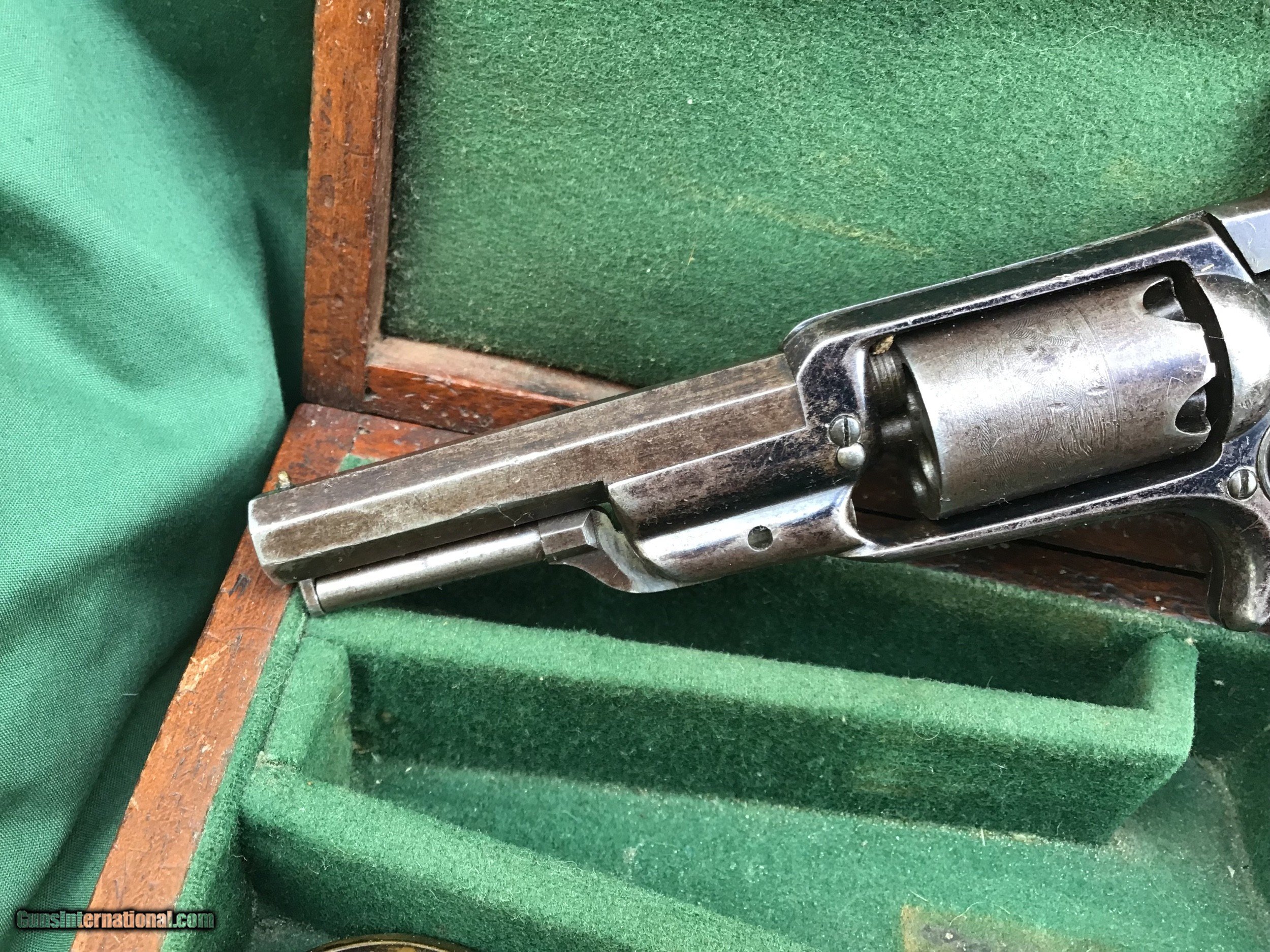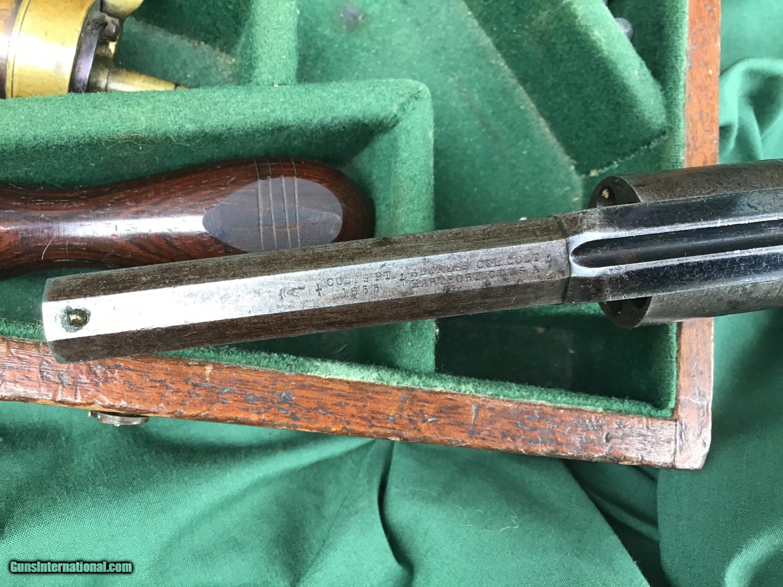 Description: Sold Cased Colt Root in .28 Caliber. All matching serial numbers on frame, barrel, and cylinder. Nice cylinder scene. This Root still functions nicely. Over 60% original blue remaining on this Root. Nice grips, a tiny chip bottom front of the grip (see pic). Octagon barrel has nice barrel address still present. Case comes with screwdriver, powder flask, nipples, and some bullets. All in all an above average Colt Root with condition and one that still works. Please feel free to ask questions. SOLD Antique: Yes |