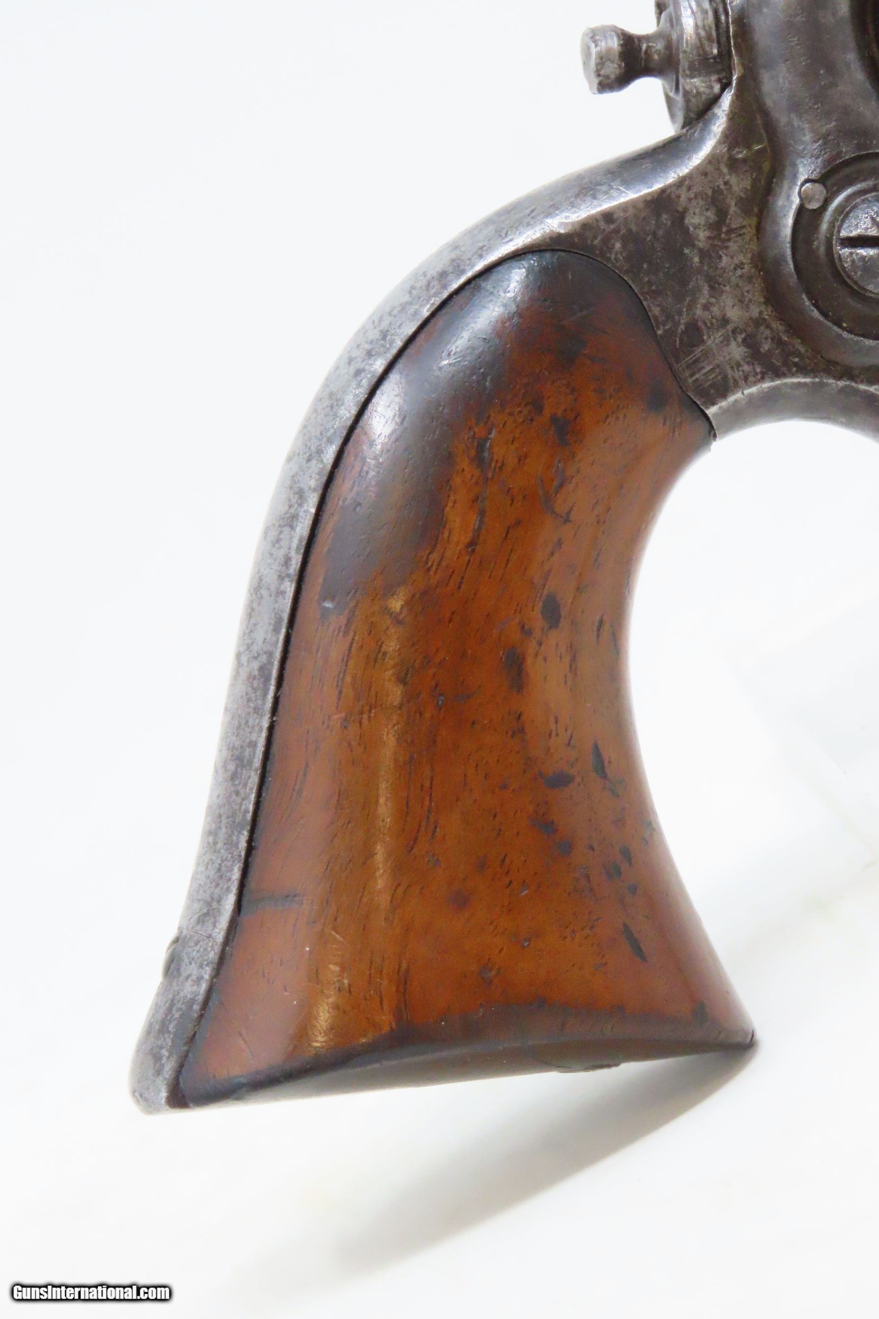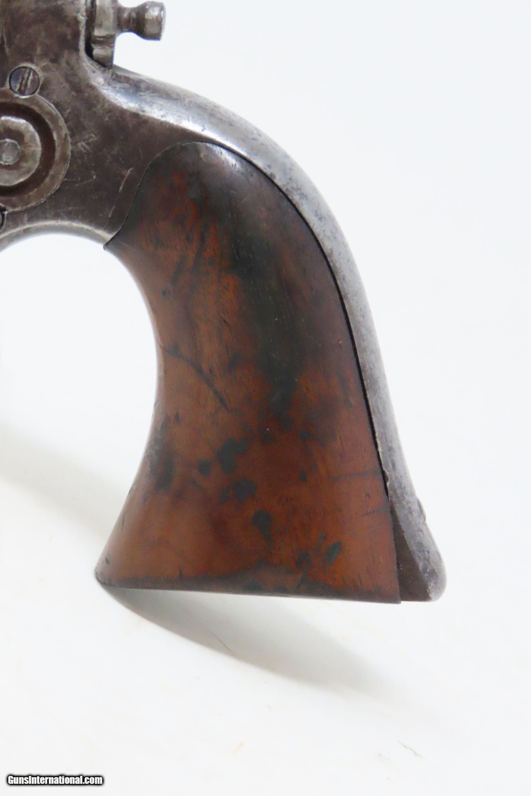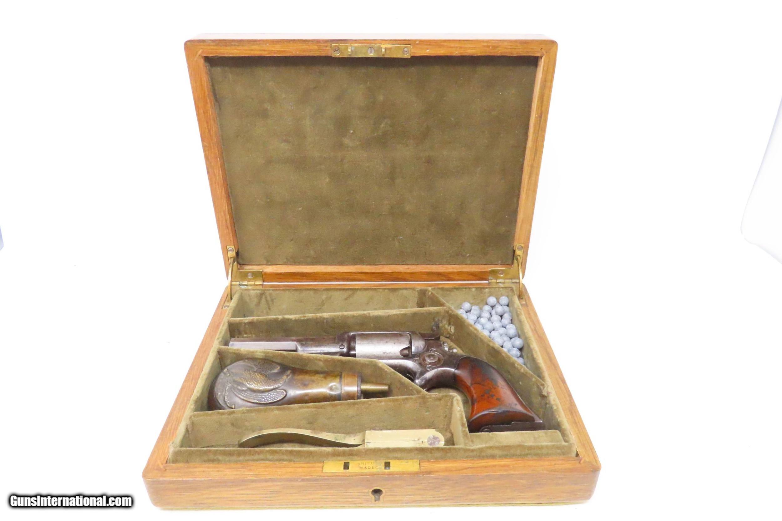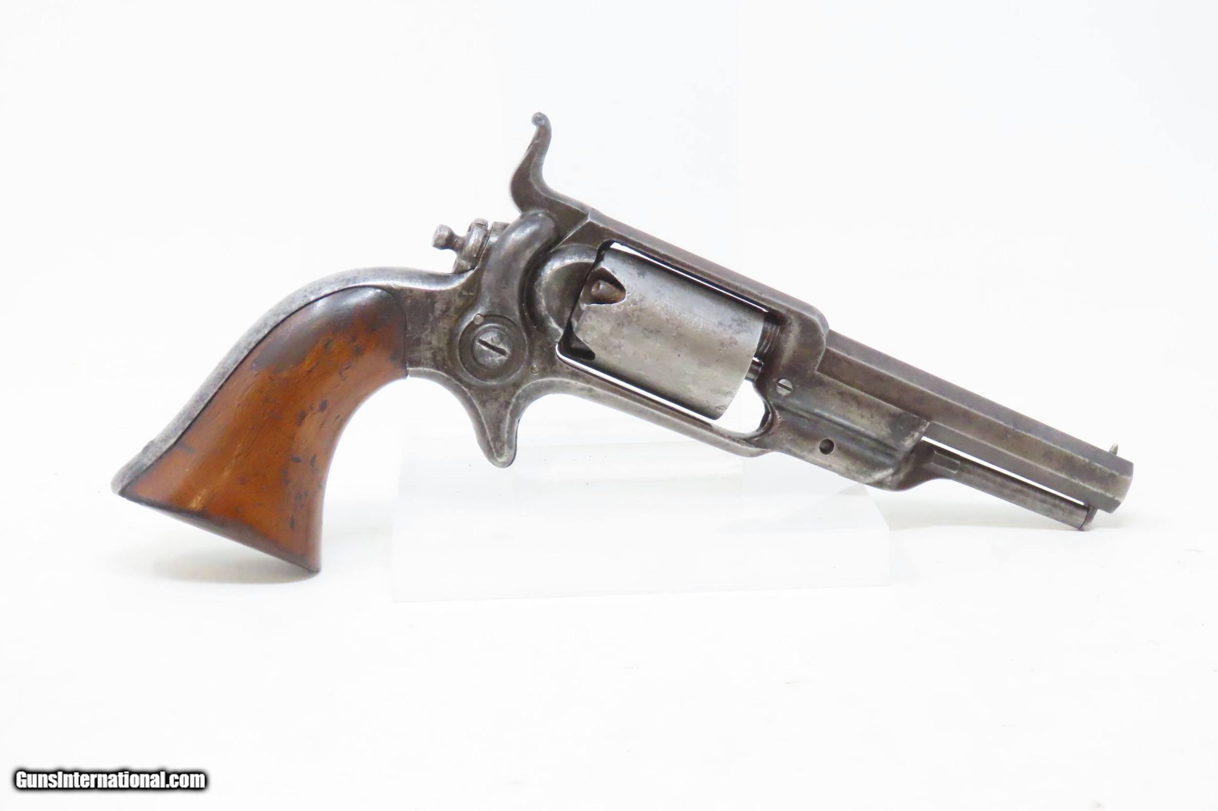 Description: CASED Pre-CIVIL WAR Era COLT Model 1855 “ROOT” Side-Hammer POCKET Revolver FIRST YEAR PRODUCTION Revolver with ACCESSORIES Here we present an antique Colt Model 1855 “Root” Side-hammer Pocket Revolver, made in 1855 in Hartford, Connecticut. This Samuel Colt design was named for his factory superintendent Elisha K. Root and is a telling example of Colt’s desire to innovate, which was probably the single biggest factor in his success. Though the Colt 1849 Pocket had been introduced only 6 years prior, the “Colonel” attempted to make an improved pocket revolver. The Root features Colt’s debut of the “creeping” style of loading lever which allowed for better mechanical advantage when loading the gun, Colt’s first solid frame, a hammer mounted on the right side for access to the cylinder axis pin, and a cylinder axis pin which was the point at which the hand turned the cylinder (versus on the cylinder itself). Many good ideas were tested in this design, and some would prove worthy to be used in the future. The small parts used in the Root Revolver’s mechanism proved quite fragile, however upscaling them into the 1855 series of Revolving Rifles and Shotguns seemed to help. Colt is even known to have experimented with the Root design on a Dragoon pistol, a precursor to the 1860 Army. Overall, about 44,000 Root Revolvers were made from 1855-1870, much fewer than the 1849 Pocket with 340,000 produced. Though not a primary military arm during the American Civil War, handguns were commonly privately purchased by soldiers for use on the battlefield. Whether legend or fact, it is interesting to note something commonly read about pocket revolvers of the day: that while they could be used for self-defense against the enemy, many soldiers kept them on their person to defend themselves against an unwanted amputation in the primitive field hospitals that were notorious, even in their day. The overall condition is good. Faint cylinder scene. The action is strong. The bore is clean with sharp rifling. The grip is solid. Own the original! This is a legitimate antique and not a reproduction. Barrel is 3-1/2 inches. Caliber: .28 Percussion Overall condition as seen in photos. Very Fast. Very Safe. FREE SHIPPING WORLDWIDE. Delivered directly to your door by express mail! Guaranteed AUTHENTIC & Includes CERTIFICATE OF AUTHENTICITY. ancestryguns $4415 #226063 SOLD Antique: Yes |