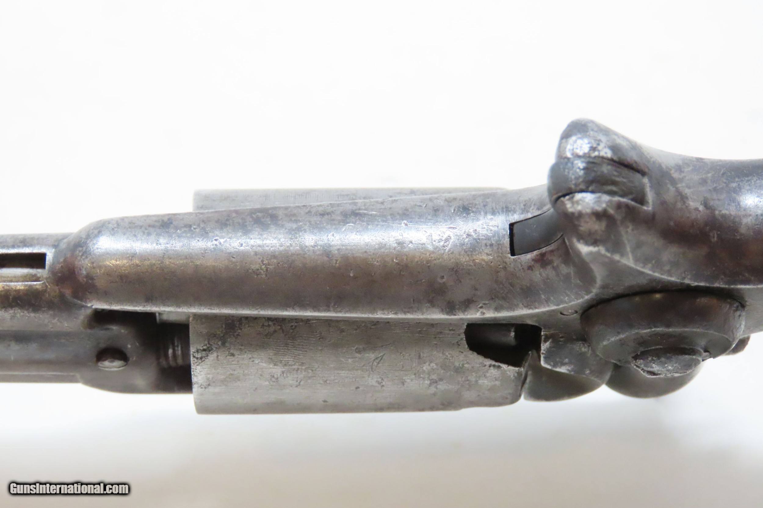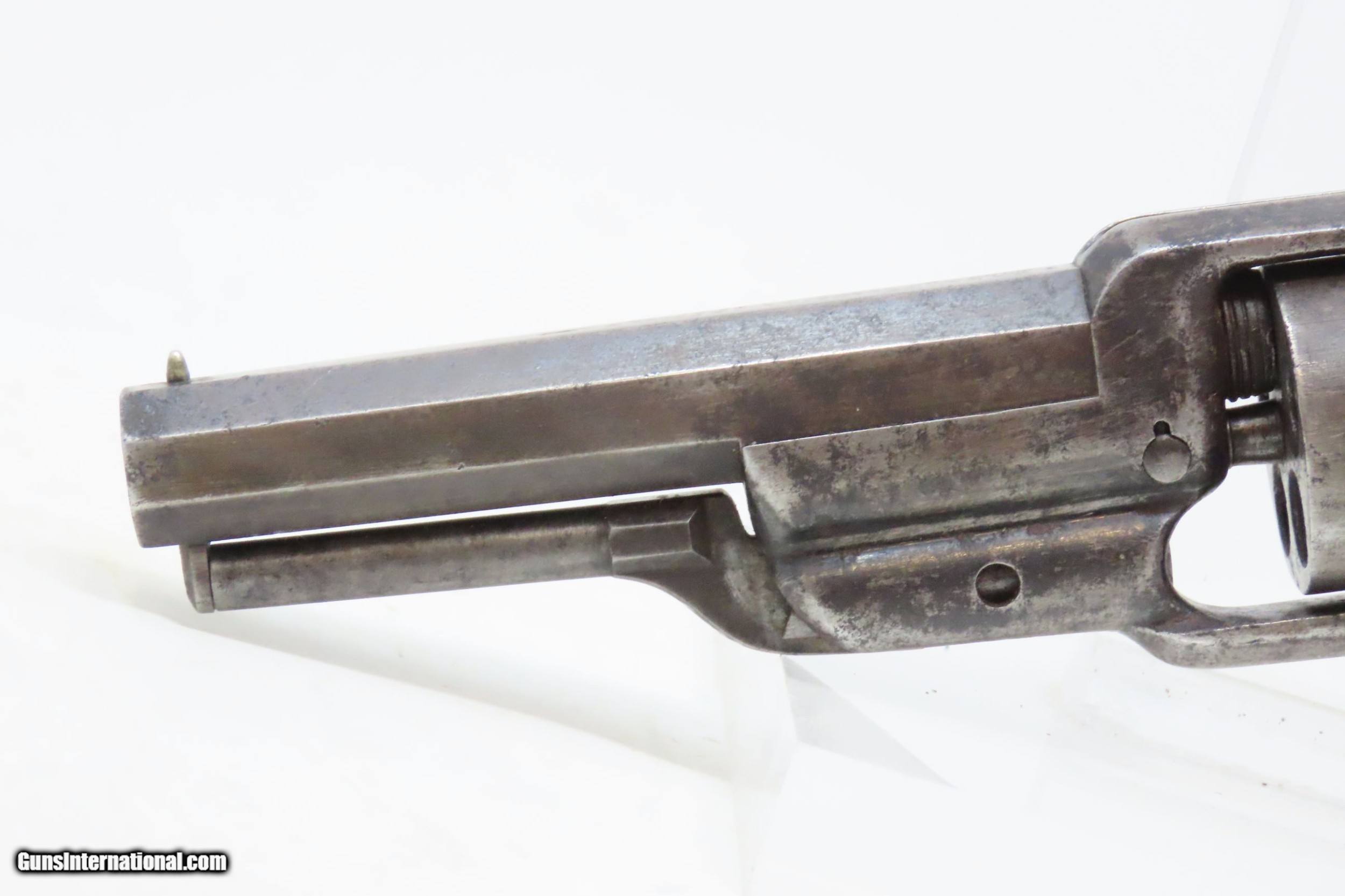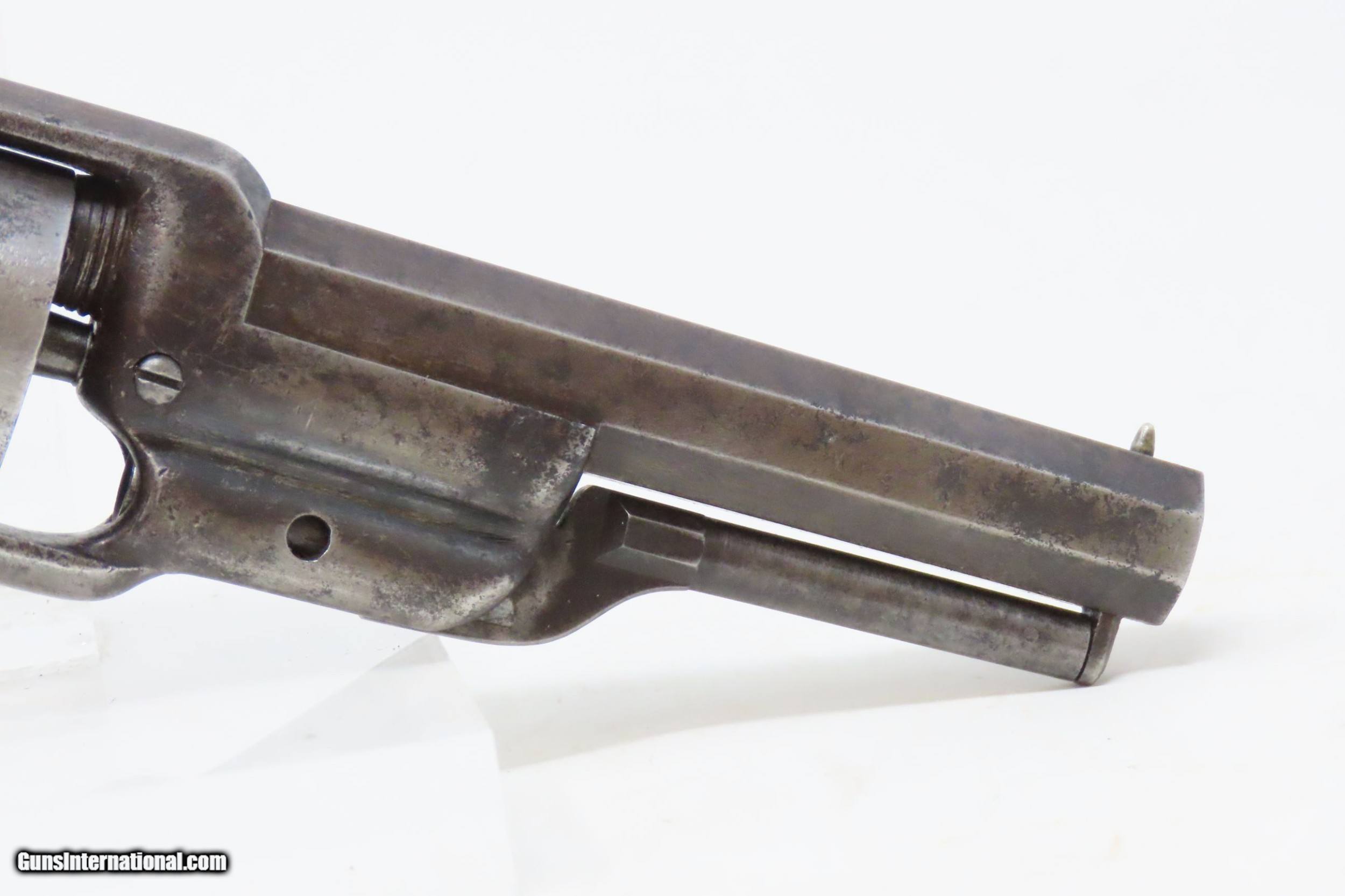 Description: CASED Pre-CIVIL WAR Era COLT Model 1855 “ROOT” Side-Hammer POCKET Revolver FIRST YEAR PRODUCTION Revolver with ACCESSORIES Here we present an antique Colt Model 1855 “Root” Side-hammer Pocket Revolver, made in 1855 in Hartford, Connecticut. This Samuel Colt design was named for his factory superintendent Elisha K. Root and is a telling example of Colt’s desire to innovate, which was probably the single biggest factor in his success. Though the Colt 1849 Pocket had been introduced only 6 years prior, the “Colonel” attempted to make an improved pocket revolver. The Root features Colt’s debut of the “creeping” style of loading lever which allowed for better mechanical advantage when loading the gun, Colt’s first solid frame, a hammer mounted on the right side for access to the cylinder axis pin, and a cylinder axis pin which was the point at which the hand turned the cylinder (versus on the cylinder itself). Many good ideas were tested in this design, and some would prove worthy to be used in the future. The small parts used in the Root Revolver’s mechanism proved quite fragile, however upscaling them into the 1855 series of Revolving Rifles and Shotguns seemed to help. Colt is even known to have experimented with the Root design on a Dragoon pistol, a precursor to the 1860 Army. Overall, about 44,000 Root Revolvers were made from 1855-1870, much fewer than the 1849 Pocket with 340,000 produced. Though not a primary military arm during the American Civil War, handguns were commonly privately purchased by soldiers for use on the battlefield. Whether legend or fact, it is interesting to note something commonly read about pocket revolvers of the day: that while they could be used for self-defense against the enemy, many soldiers kept them on their person to defend themselves against an unwanted amputation in the primitive field hospitals that were notorious, even in their day. The overall condition is good. Faint cylinder scene. The action is strong. The bore is clean with sharp rifling. The grip is solid. Own the original! This is a legitimate antique and not a reproduction. Barrel is 3-1/2 inches. Caliber: .28 Percussion Overall condition as seen in photos. Very Fast. Very Safe. FREE SHIPPING WORLDWIDE. Delivered directly to your door by express mail! Guaranteed AUTHENTIC & Includes CERTIFICATE OF AUTHENTICITY. ancestryguns $4415 #226063 SOLD Antique: Yes |