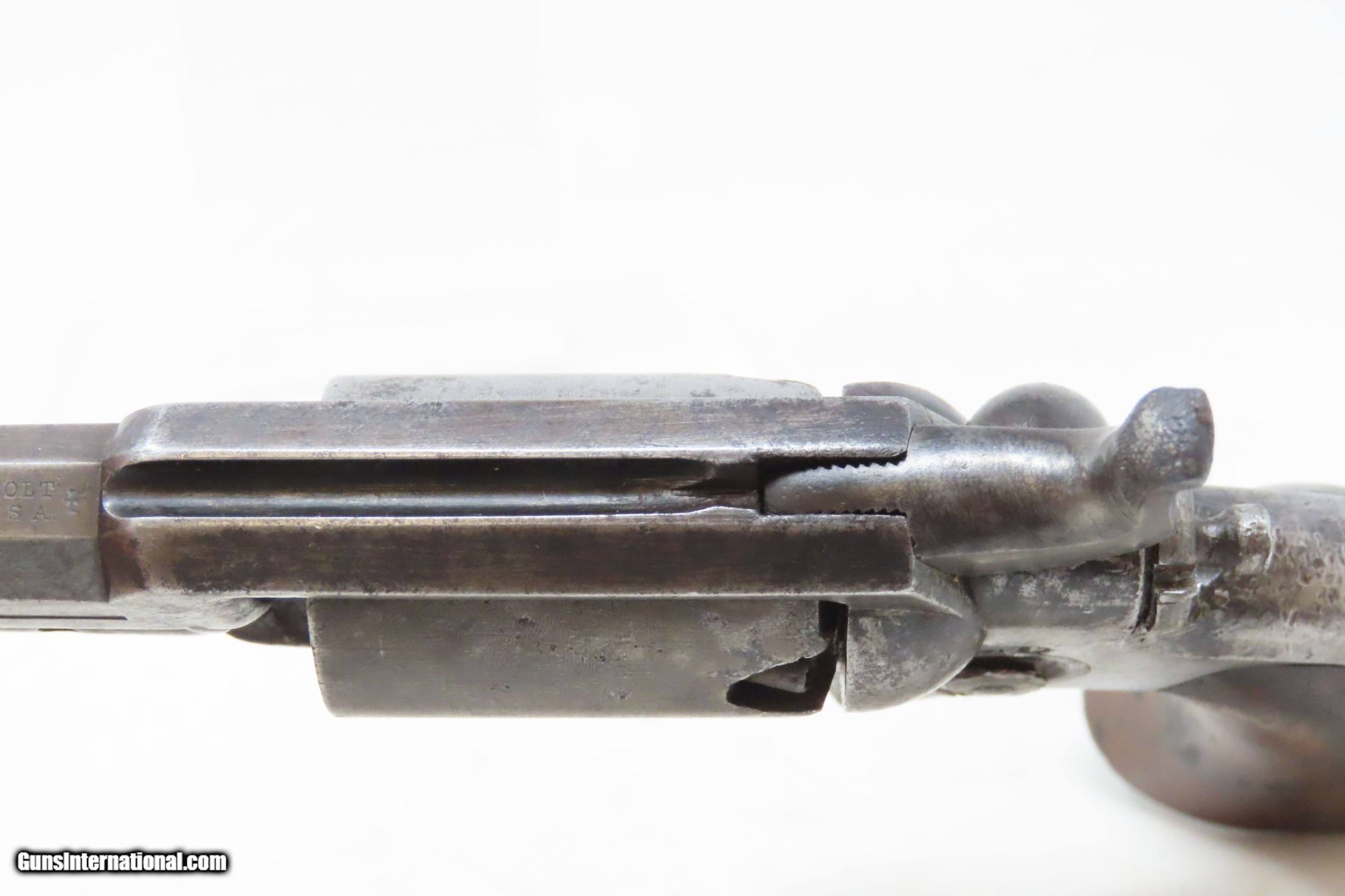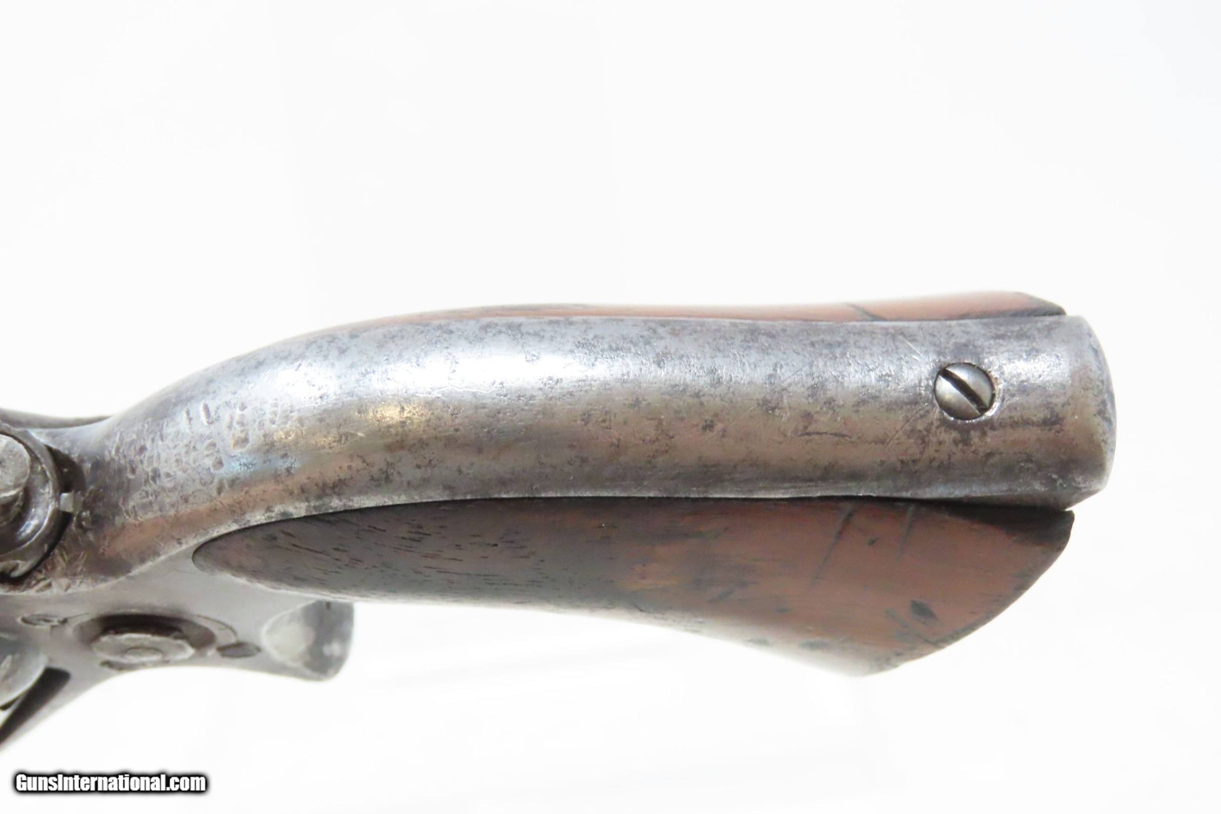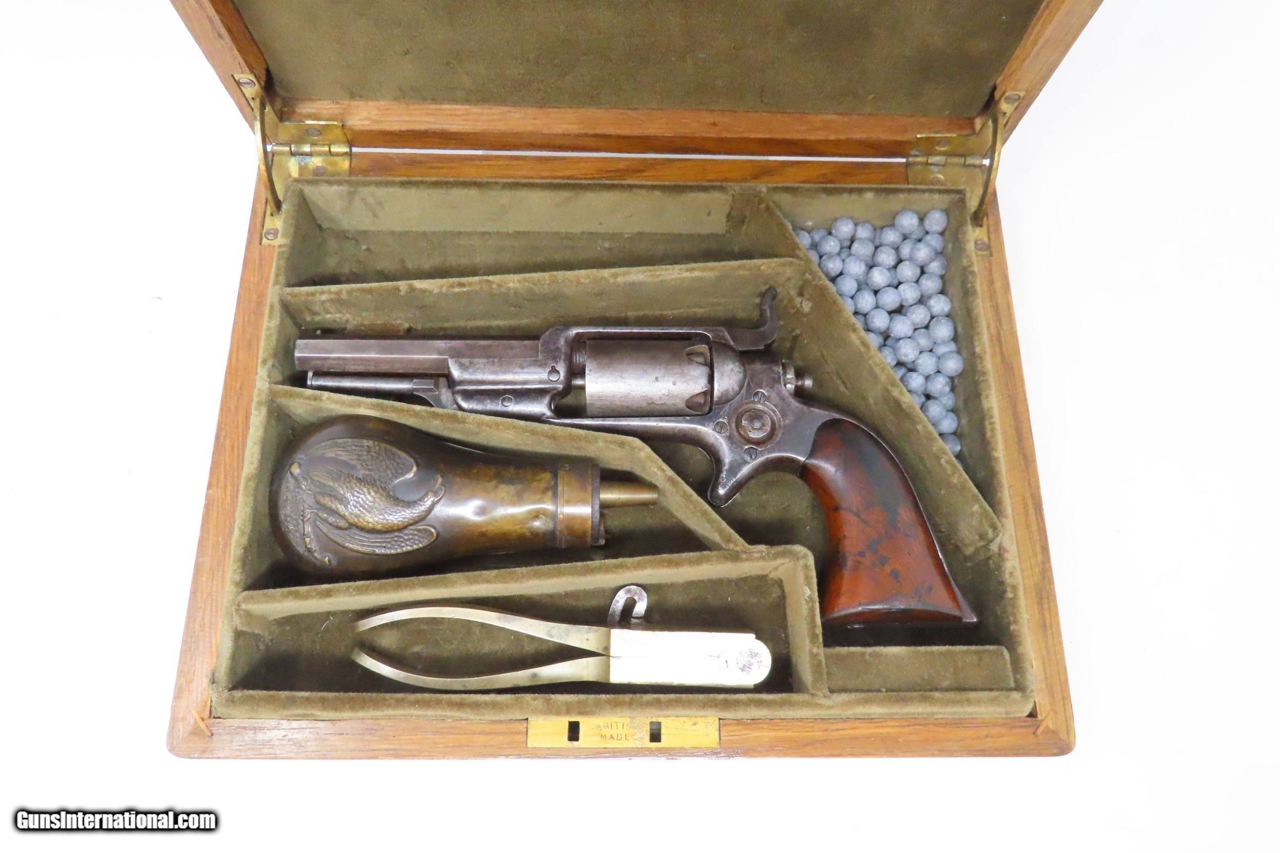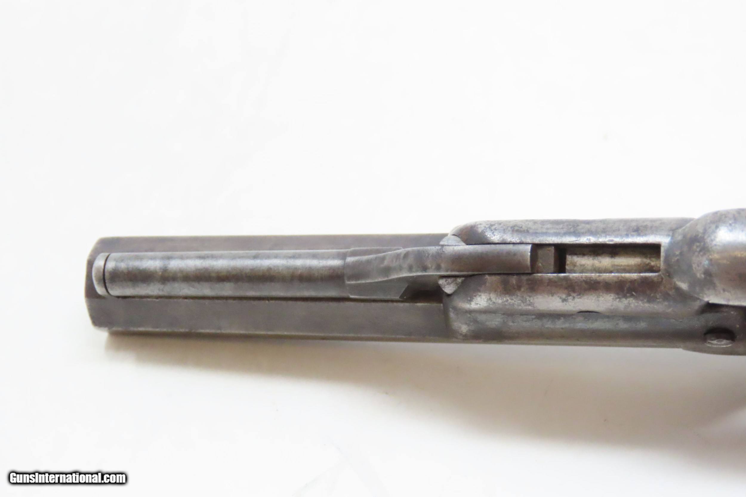 Description: CASED Pre-CIVIL WAR Era COLT Model 1855 “ROOT” Side-Hammer POCKET Revolver FIRST YEAR PRODUCTION Revolver with ACCESSORIES Here we present an antique Colt Model 1855 “Root” Side-hammer Pocket Revolver, made in 1855 in Hartford, Connecticut. This Samuel Colt design was named for his factory superintendent Elisha K. Root and is a telling example of Colt’s desire to innovate, which was probably the single biggest factor in his success. Though the Colt 1849 Pocket had been introduced only 6 years prior, the “Colonel” attempted to make an improved pocket revolver. The Root features Colt’s debut of the “creeping” style of loading lever which allowed for better mechanical advantage when loading the gun, Colt’s first solid frame, a hammer mounted on the right side for access to the cylinder axis pin, and a cylinder axis pin which was the point at which the hand turned the cylinder (versus on the cylinder itself). Many good ideas were tested in this design, and some would prove worthy to be used in the future. The small parts used in the Root Revolver’s mechanism proved quite fragile, however upscaling them into the 1855 series of Revolving Rifles and Shotguns seemed to help. Colt is even known to have experimented with the Root design on a Dragoon pistol, a precursor to the 1860 Army. Overall, about 44,000 Root Revolvers were made from 1855-1870, much fewer than the 1849 Pocket with 340,000 produced. Though not a primary military arm during the American Civil War, handguns were commonly privately purchased by soldiers for use on the battlefield. Whether legend or fact, it is interesting to note something commonly read about pocket revolvers of the day: that while they could be used for self-defense against the enemy, many soldiers kept them on their person to defend themselves against an unwanted amputation in the primitive field hospitals that were notorious, even in their day. The overall condition is good. Faint cylinder scene. The action is strong. The bore is clean with sharp rifling. The grip is solid. Own the original! This is a legitimate antique and not a reproduction. Barrel is 3-1/2 inches. Caliber: .28 Percussion Overall condition as seen in photos. Very Fast. Very Safe. FREE SHIPPING WORLDWIDE. Delivered directly to your door by express mail! Guaranteed AUTHENTIC & Includes CERTIFICATE OF AUTHENTICITY. ancestryguns $4415 #226063 SOLD Antique: Yes |