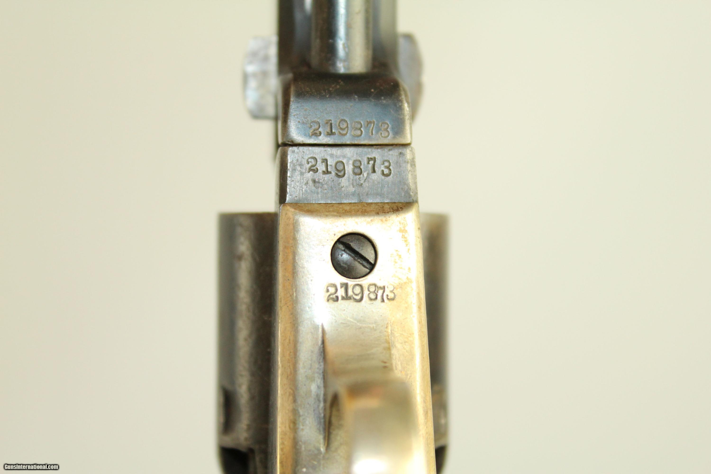 Description: CIVIL WAR Antique COLT 1849 Pocket Revolver War-Time Production Made in 1862 Here we present an antique Colt 1849 Pocket Revolver, made in 1862 in Hartford, Connecticut. Over 280,000 of these were produced by Colt’s factory at Hartford by the end of the American Civil War in 1865. These were very popular and saw a lot of use on the battlefield, on the home front and in the West. These were some of the smallest, handiest pocket revolvers of the time. One of the most aesthetically pleasing aspects of this revolver is its cylinder scene. Cylinder scenes during this period were common, especially for Colt, not only for their visual appeal, but because it made a revolver more difficult to forge. The scene on the 1849 Pocket is that of a stagecoach robbery. The focal point is the stagecoach drawn by four horses. A woman in a dress is seen framed in the doorway of the side of the coach. The driver is standing alongside wielding his pistol against multiple assailants as the horses rear and struggle against their harnesses. Several of the bandits lay dying on the ground, one tries to control the horses, two are running away and one is in the process of falling dead after being shot. Not a bad way to show interested buyers what a pistol like this would be good for. Though not a primary military arm during the American Civil War, handguns were commonly privately purchased by soldiers for use on the battlefield. Whether legend or fact, it is interesting to note something commonly read about pocket revolvers of the day: that while they could be used for self-defense against the enemy, many soldiers kept them on their person to defend themselves against an unwanted amputation in the primitive field hospitals that were notorious, even in their day. This specimen is in very good overall condition. The markings are clear and legible. The walnut grips are in very good condition. The action is fine. Bore is in very good condition. All serial numbers match. Own the original! This is a legitimate antique and not a reproduction. Barrel is 6 inches in length. Caliber: .31 percussion The bore is in very good condition and the firing mechanism is excellent. Overall condition as seen in photos. Here is a very affordable war-time production Colt 1849 Pocket. Very Fast. Very Safe. FREE SHIPPING WORLDWIDE. Delivered directly to your door by express mail! Guaranteed AUTHENTIC & Includes CERTIFICATE OF AUTHENTICITY. ancestryguns $1100 #21864 SOLD Antique: Yes |
