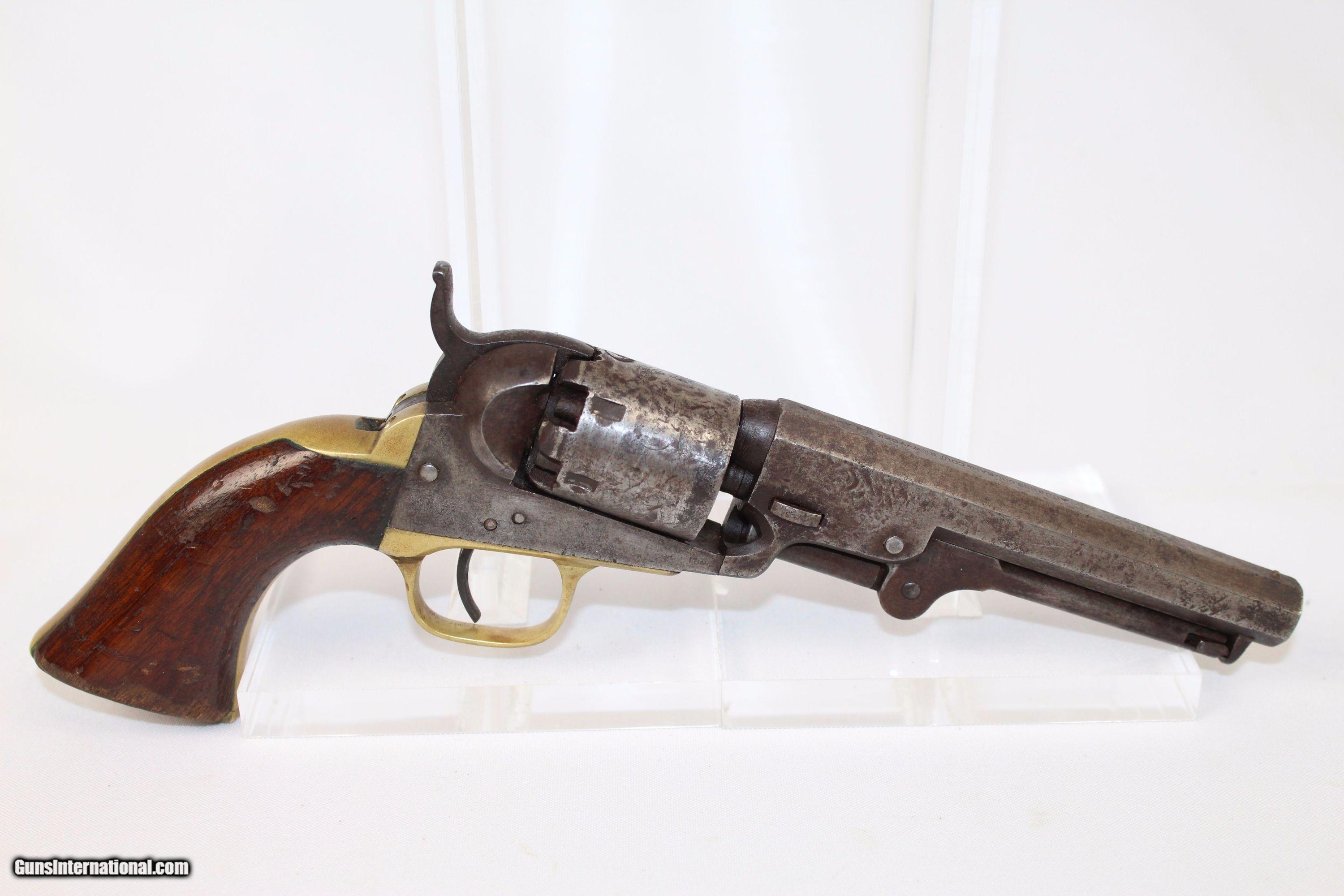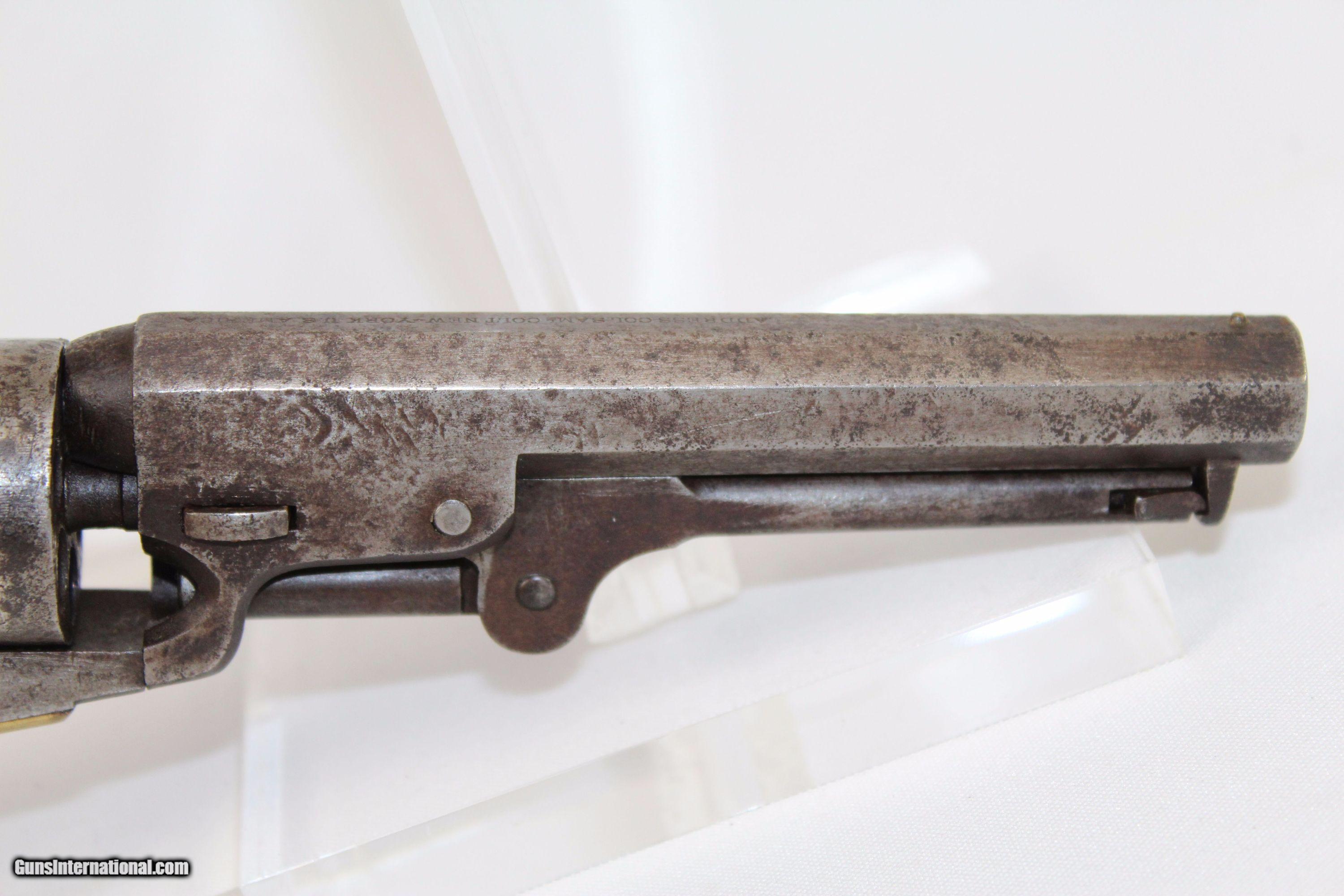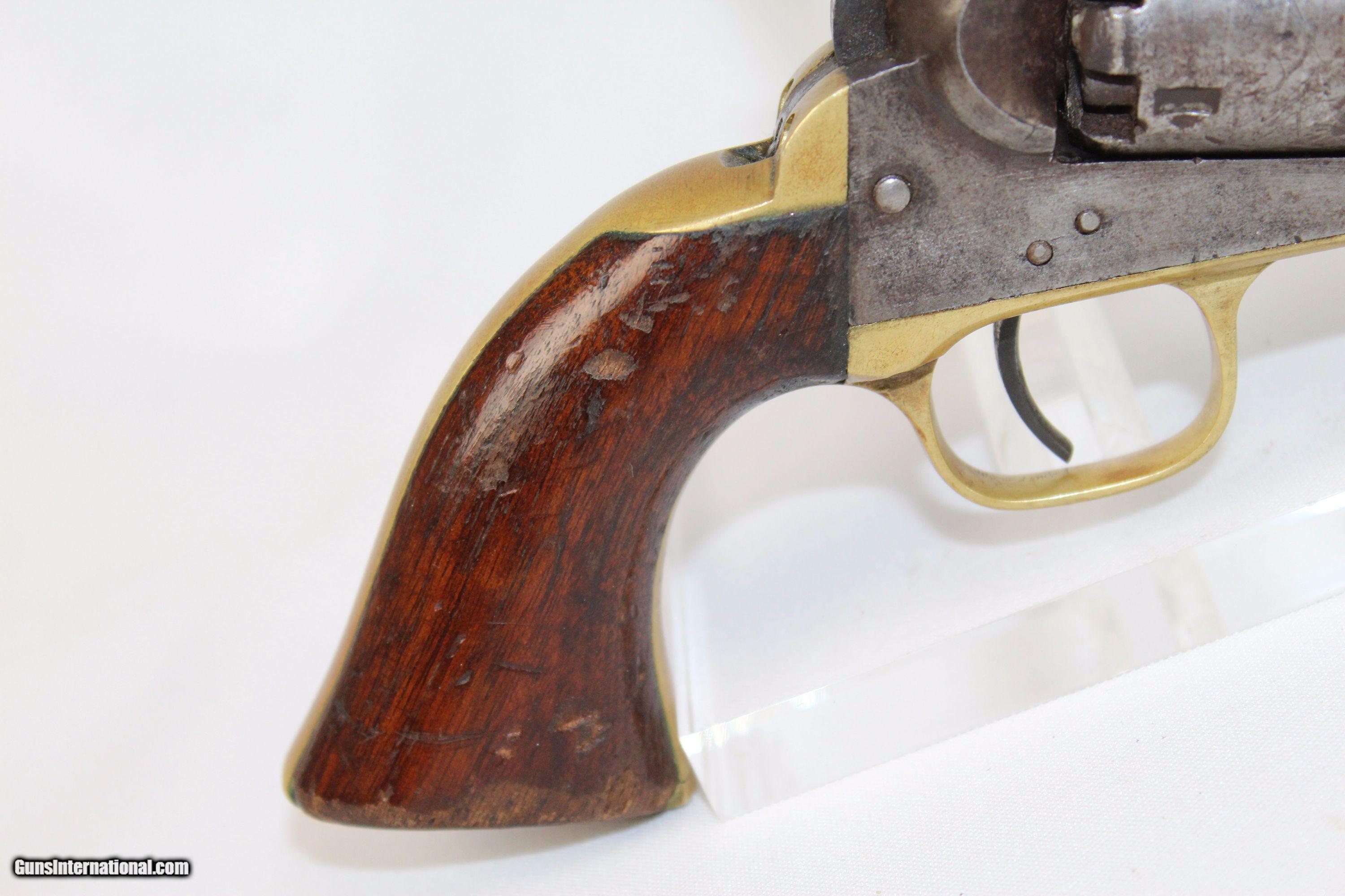 Description: CIVIL WAR Antique COLT 1849 Pocket Revolver Made During the War in 1863 Here we present an antique Colt 1849 Pocket Revolver, made in 1863 in Hartford, Connecticut. Over 280,000 of these were produced by Colt’s factory at Hartford by the end of the American Civil War in 1865. These were very popular and saw a lot of use on the battlefield, on the home front and in the West. These were some of the smallest, handiest pocket revolvers of the time. Though not a primary military arm during the American Civil War, handguns were commonly privately purchased by soldiers for use on the battlefield. Whether legend or fact, it is interesting to note something commonly read about pocket revolvers of the day: that while they could be used for self-defense against the enemy, many soldiers kept them on their person to defend themselves against an unwanted amputation in the primitive field hospitals that were notorious, even in their day. The overall condition is good. The metal surfaces have a dark patina. The markings are clear and legible. The serial numbers match. The grips show a good amount of wear and are solid. The bore is in very good shape. The action is strong. Here is a great example of a Civil War Colt Revolver! Own the original! This is a legitimate antique and not a reproduction. Barrel is 5 inches. Caliber: .31 Percussion Overall condition as seen in photos. Very Fast. Very Safe. FREE SHIPPING WORLDWIDE. Delivered directly to your door by express mail! Guaranteed AUTHENTIC & Includes CERTIFICATE OF AUTHENTICITY. ancestryguns $1200 #5274 SOLD Antique: Yes |