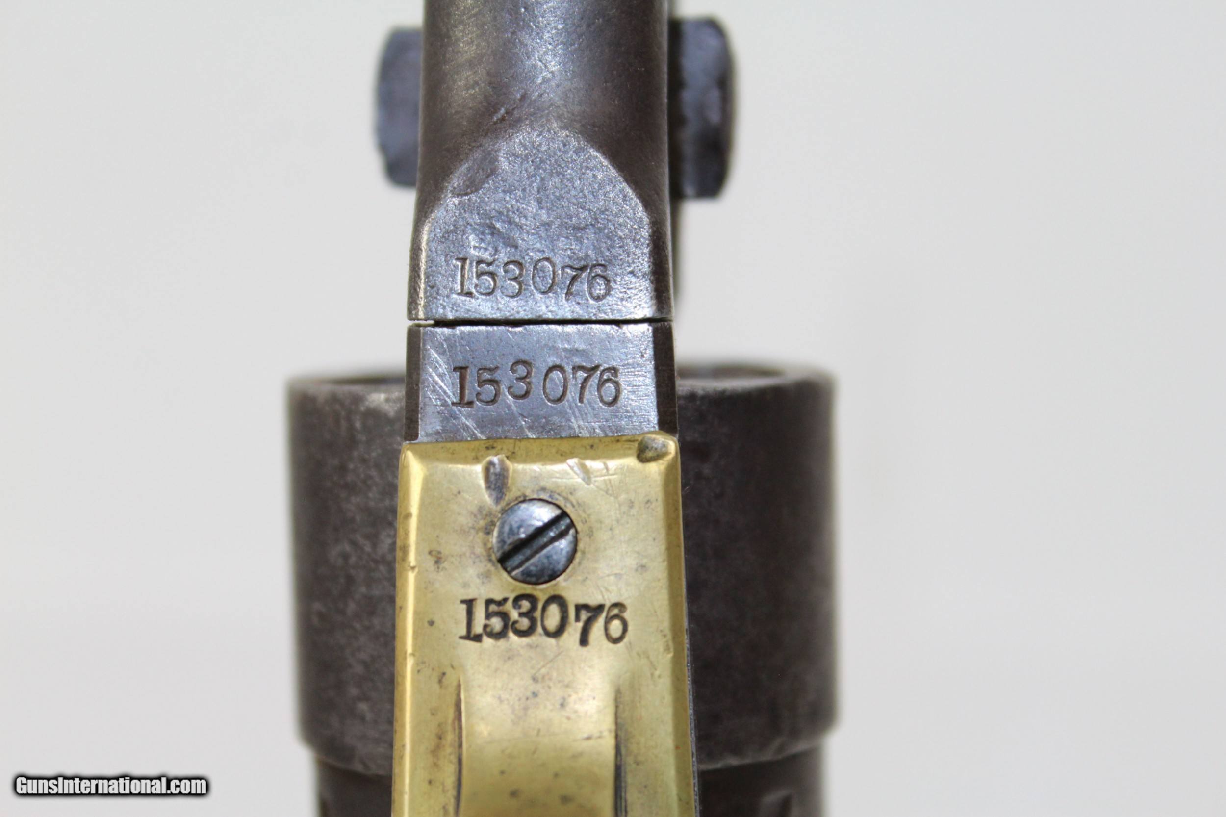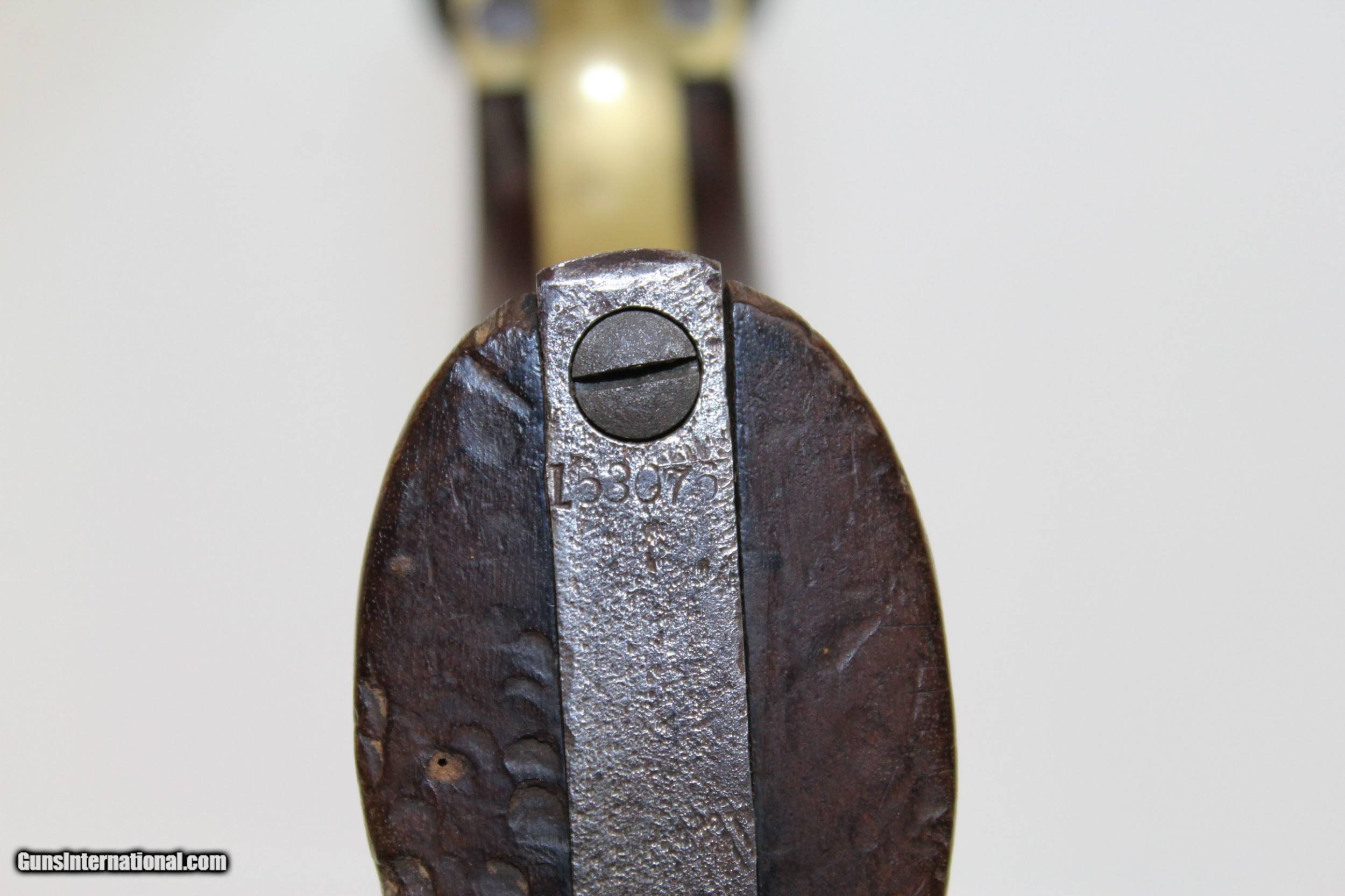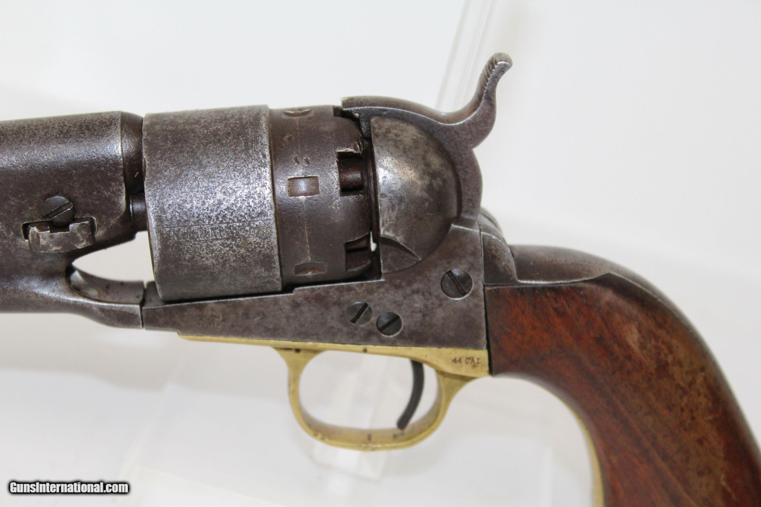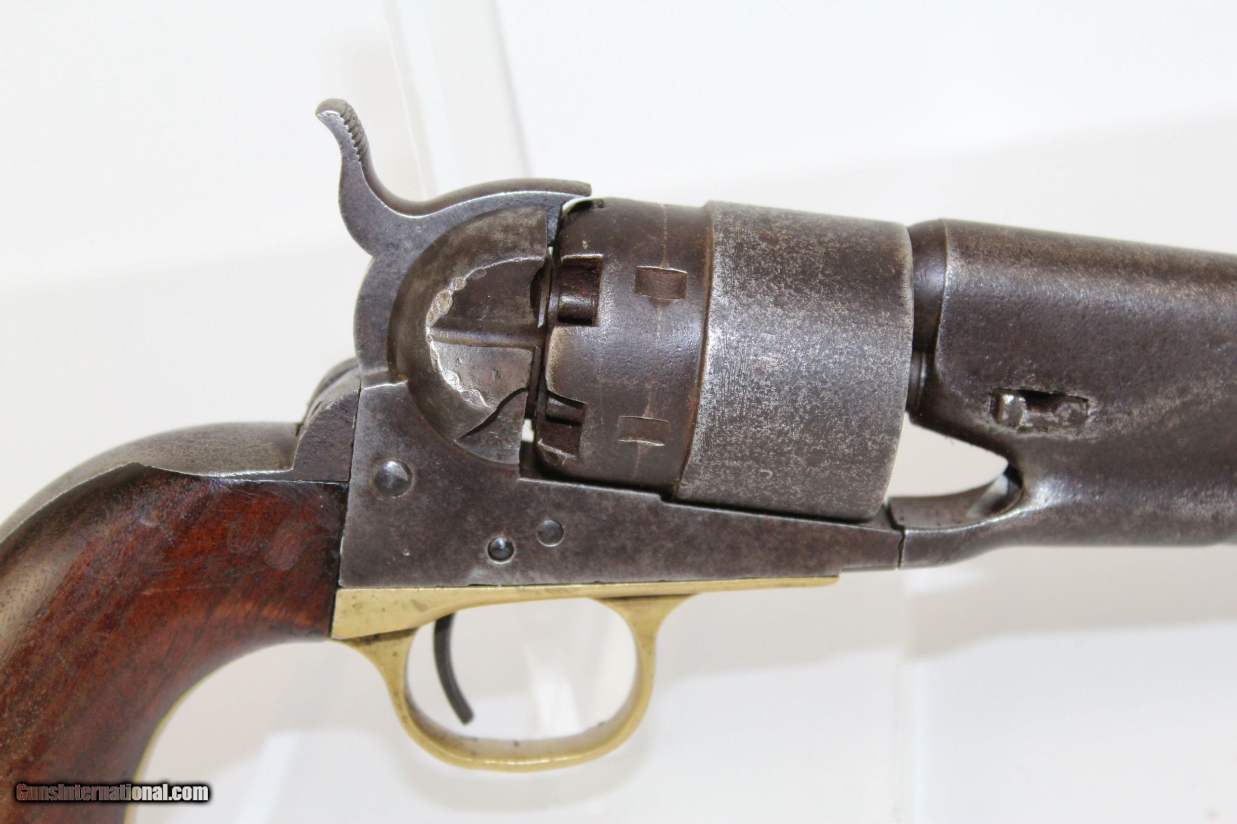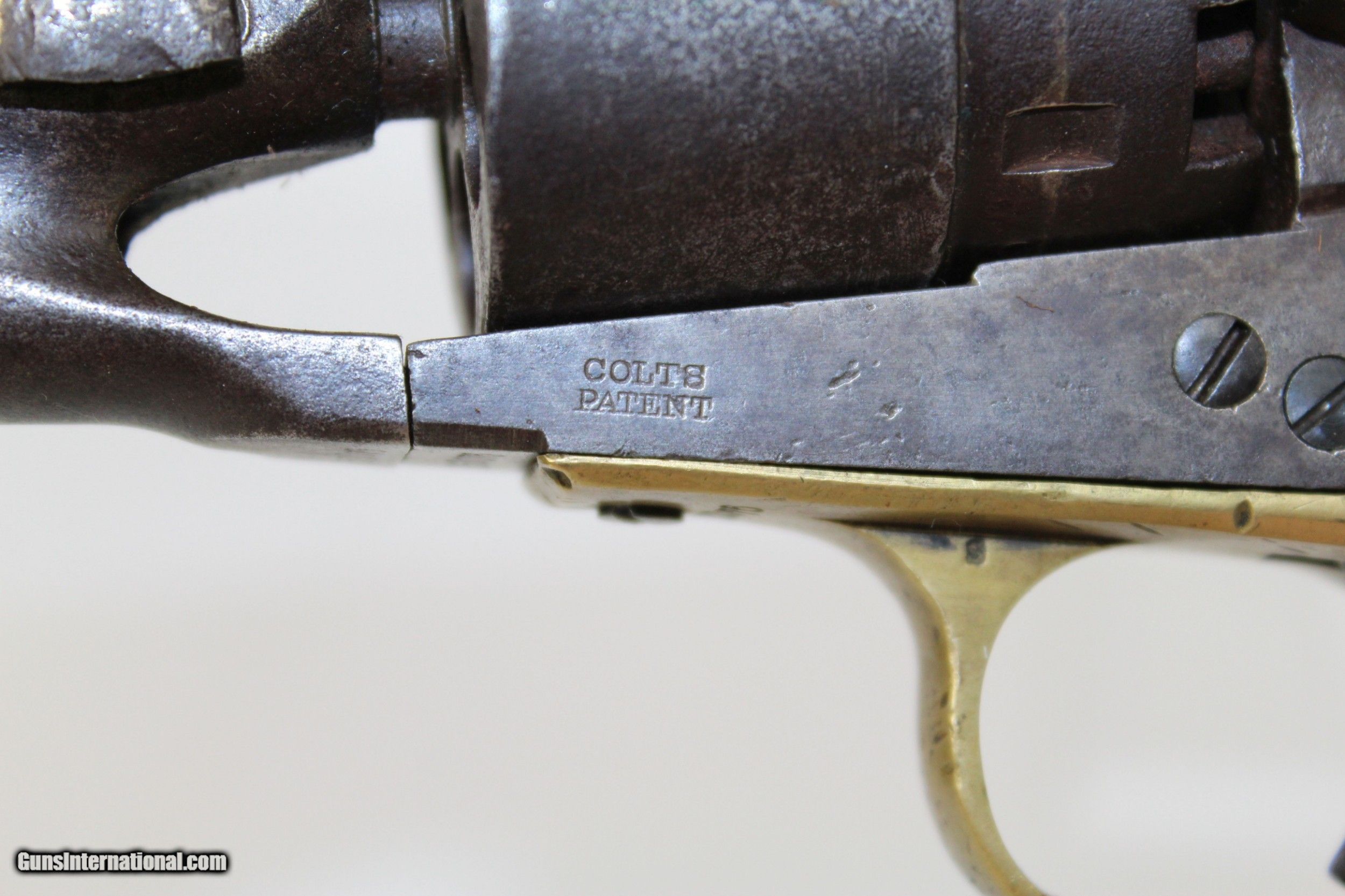 Description: CIVIL WAR Antique Colt 1860 Model ARMY Revolver With RARE, FINE “J.D. AVY & CO NEWARK” Holster Here we present an antique Colt Model 1860 Army Percussion Revolver, made in 1865 in Hartford, Connecticut. The Model 1860 was the single most used pistol of the American Civil War. Over 200,000 were made from 1860 to 1873, and 156,000 were made by the end of the war in 1865. The 1860 Army was Samuel Colt’s finest achievement to that point, having finally developed a large caliber revolver that weighed about 2 lbs. 10 oz. to the famous Dragoon’s 4 lbs. 4 oz., and was adopted en masse by the U.S. government with huge contracts. The revolver was well balanced in hand but had a long enough barrel to be effective when utilized as a carbine with the attachable shoulder stock. This revolver represented unprecedented firepower from a handgun in the field at the time and was especially suited to Cavalry. The Confederacy, lacking in manufacturing capabilities though they were, managed to produce limited numbers of copies, and battlefield pickups of the 1860 Army were highly coveted. The 1860 Army went on to serve the U.S. military even after the Civil War and into the Indian Wars, until production of Colt’s 1873 Single Action Army created new waves in the revolver market, and again achieved great success in the military and commercial markets. This Colt 1860 Army Revolver was made in the last year of the American Civil War, 1865. It comes in a fine, original and very rare “J.D. AVY & CO. NEWARK, NJ” military flap holster. The top of the barrel is marked “ADDRESS COL. SAM COLT NEW YORK, US AMERICA”. The left side of the frame is marked “COLT’S PATENT/44 CAL”. The cylinder is marked “SEPT. 10TH.1850”. The overall condition is good. The metal surfaces are covered in a smooth, dark gray patina. The markings are clear and legible. The serial numbers match. The walnut grips are in good shape. The bore is clear with good rifling. The action on this revolver is excellent. Holster is fine. Here is an excellent set for your Civil War collecting! Own the original! This is a legitimate antique and not a reproduction. Barrel is 8 inches. Caliber: .44 Percussion Overall condition as seen in photos. Very Fast. Very Safe. FREE SHIPPING WORLDWIDE. Delivered directly to your door by express mail! Guaranteed AUTHENTIC & Includes CERTIFICATE OF AUTHENTICITY. ancestryguns $3450 #7007 SOLD Antique: Yes |