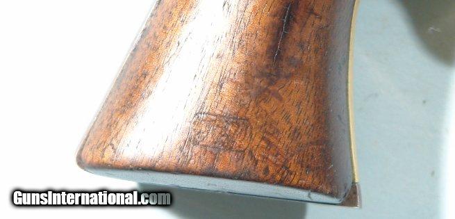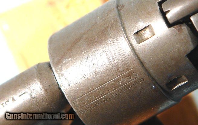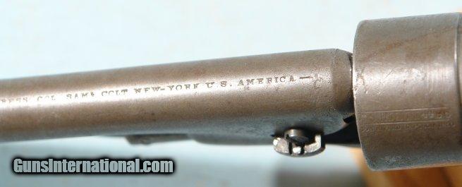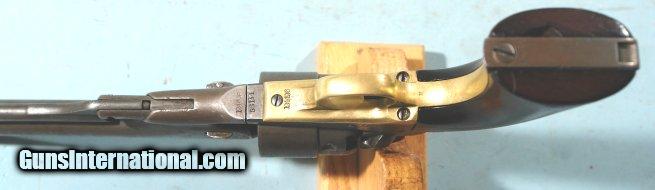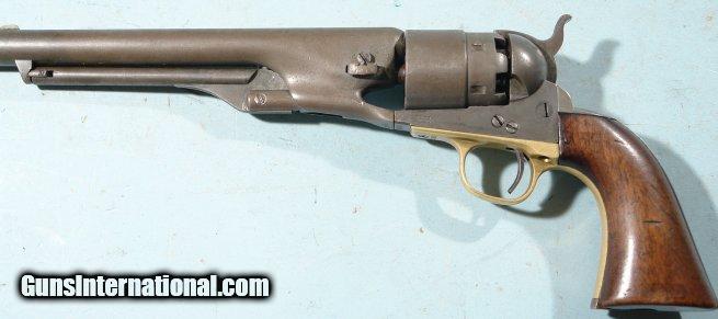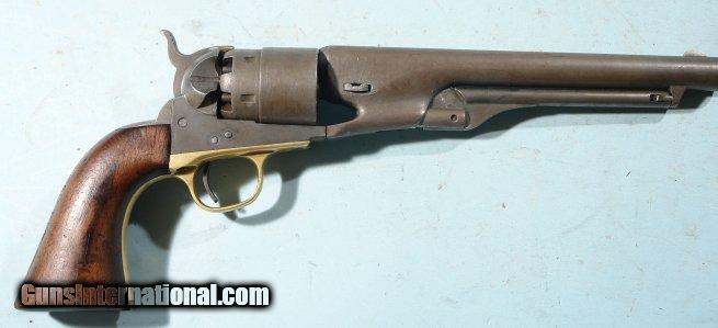 Description: CIVIL WAR COLT U.S. MODEL 1860 ARMY .44 CAL. REVOLVER. Six shot with 8” barrel having the “ADDRESS COL. SAML. COLT NEW YORK CITY U.S. AMERICA” barrel address. All original except wedge screw with serial numbers not matching. Frame serial numbered in the 5x,xxx range and remaining numbers matching in the 124,xxx range and matching. Original un-numbered wedge. Very good overall with medium grey metal finish. Excellent markings and very good cylinder scene. Working order and nice bore and chambers. Extra nice grips with excellent inspector’s cartouches and the original finish. SOLD Antique: Yes |