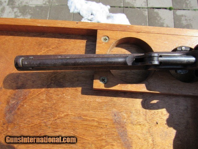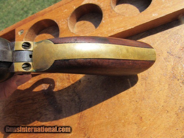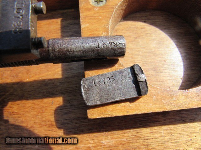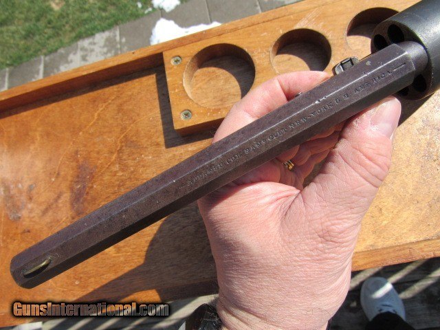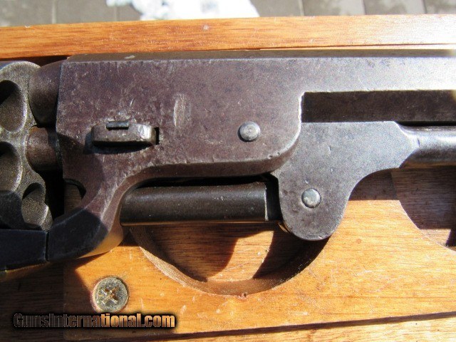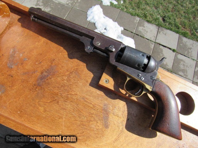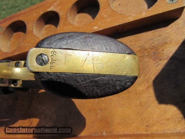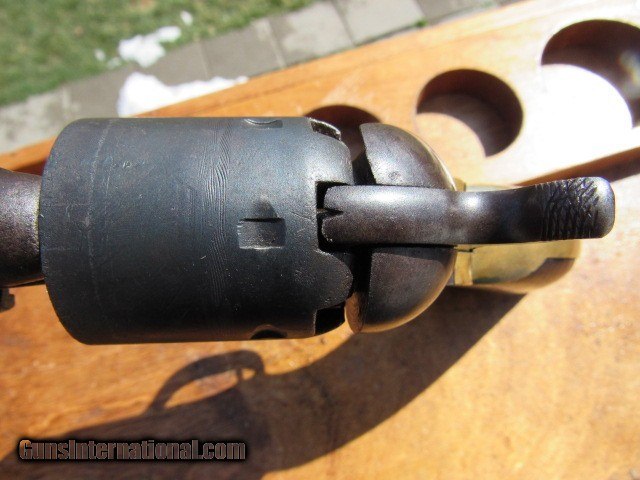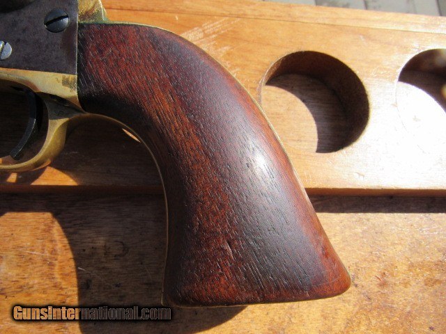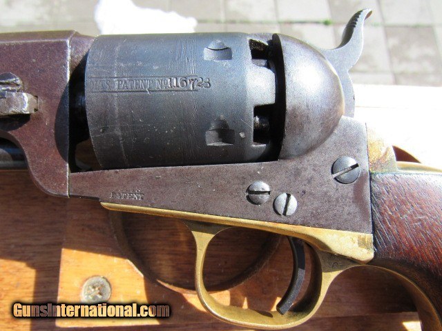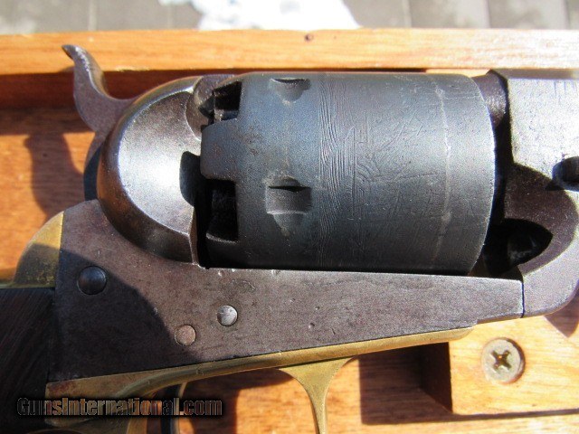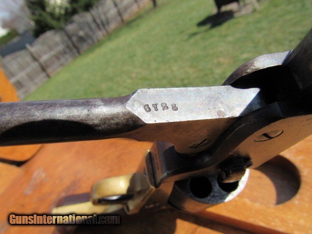 Description: DESCRIPTION: Civil War Era Colt 1851 Navy 36 caliber percussion revolver, serial # 116728 which by the Springfield Research Survey is very close to several 1851 Navy Revolvers issued to the 10th Illinois Volunteer Cavalry, made at the end of 1861, with standard 7.5" octagon barrel, walnut grips, brass trigger guard and back strap, case hardened frame and loading lever, blued barrel, brass insert front sight, 6-shot cylinder, single action. CONDITION: Barrel, frame and loading rod have turned a mix of plum and patina with scattered dings, scratches and pinprick oxidation, retaining about 10% of the original coverage. Cylinder shows an old cold blue but has all 6 original nipples intact and exhibits 75% of the engagement scene with clear patent and serial number. Barrel address complete and crisp. Brass trigger guard and back strap are a nice mellow aged mustard color. Top of back strap just behind hammer shows some light initials and border scratched in no doubt early in its use as they are light and barely legible. Original walnut grips are in great shape with light wear and loss at front toes, never sanded or refinished, no cracks or repairs. Hammer screw and loading rod screw are replacements. Bore is very good with strong rifling and typical black powder fouling, no rings, no bulges, no pits or craters. Very slight wobble at cylinder pin. Frame-to-barrel fit is super tight. Action functions as it should and times nicely with both notches holding and having positive clicks. The best part is all of the numbers match - full serial # on grip, trigger guard, cylinder, frame and barrel; partial numbers on wedge, arbor and loading rod. Grades NRA Antique Good and is a nice example to add to your Civil War and/or Colt collection. TERMS: No international sales. Antique so it can ship directly to you assuming your local laws allow it. Payment by bank check, money order, personal check, or all major credit cards with 3% convenience fee. 3 day non-firing inspection. Buyer pays return shipping. Offers considered. Thanks for looking. Interested in buying single pieces and collections of old firearms, especially Winchester, Colt, S&W, Marlin, Savage and Remington. 315.251.4799 with questions or concerns. SOLD Antique: Yes Manufacturer: Colt Model: 1851 Navy Serial Number: 116728 Barrel Length: 7.5" Octagon Caliber Info: 36 Percussion Condition: Good Metal Condition: Good Wood Condition: Very good Bore Condition: Very Good Action: Single Action Revolver Triggers: Standard/plain Manufacture Date: 1861 Item Location: New York |