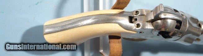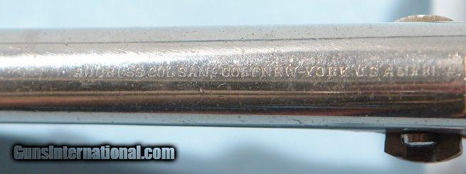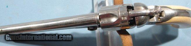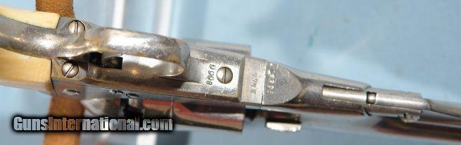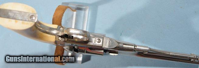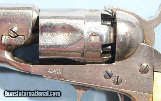 Description: CIVIL WAR ERA COLT 1862 POLICE .36 CAL. PERCUSSION FACTORY NICKEL PLATED 5 ½” REVOLVER CA. 1862. All original and matching and in brilliant condition with 995 plus near mint nickel and mint original factory ESA exempt antique grips original to the guns production date. Mint bore and chambers and perfect working order. Perfect markings and barrel address. Excellent screw heads with all the nickel finish. Really superb example and early nickel factory finish. SOLD Antique: Yes |