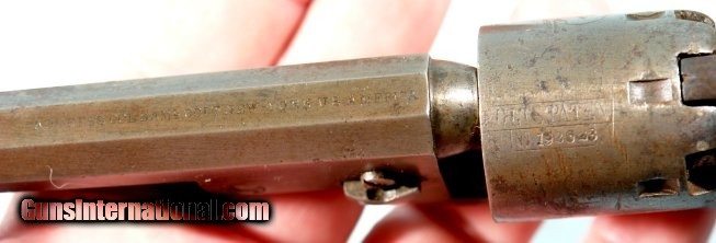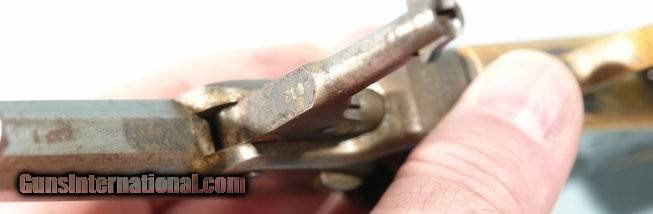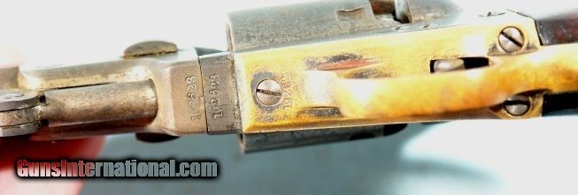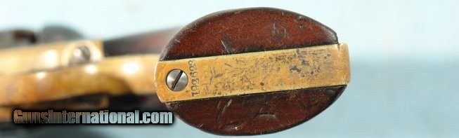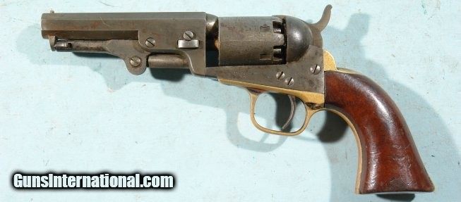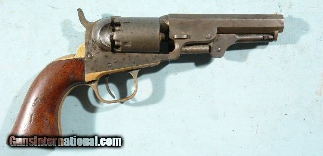 Description: CIVIL WAR ERA COLT MODEL 1849 PERCUSSION .31 CAL. 4” SIX SHOT POCKET REVOLVER MANUFACTURED IN 1861. All original and all matching (including wedge) in very good plus to fine condition. Excellent markings and good cylinder scene. Nice original blue grey patina. Crisp “COLTS/PATENT” stamp on frame and perfect one line “COL. SAML COLT” New York barrel address. Excellent original walnut grips with nearly all the finish. Tight working order and excellent bore. Nice example original to the last screw. Made during first year of the Civil War. SOLD Antique: Yes Handgun Caliber: .31 |