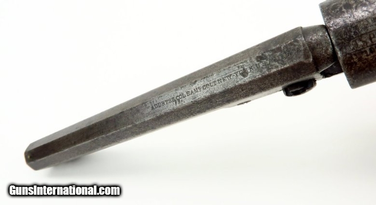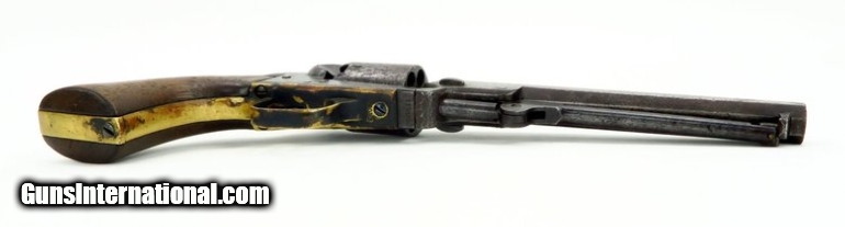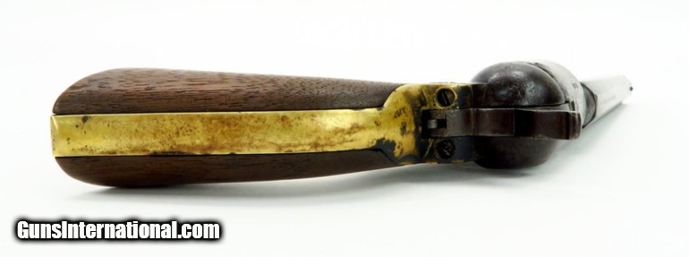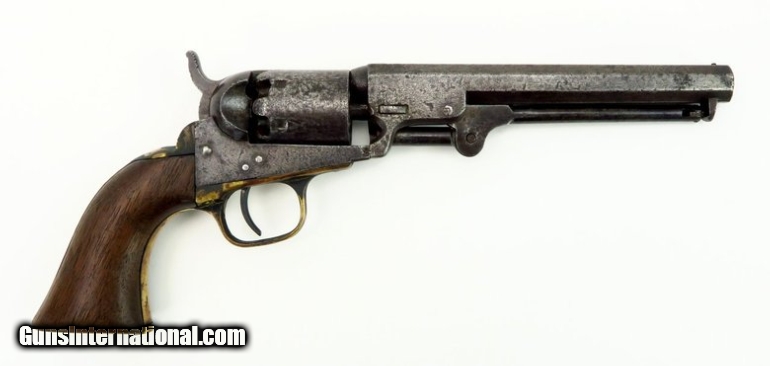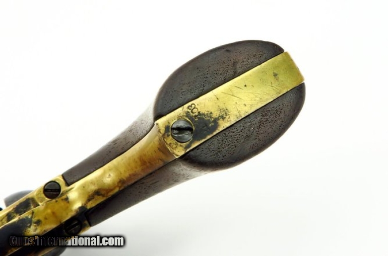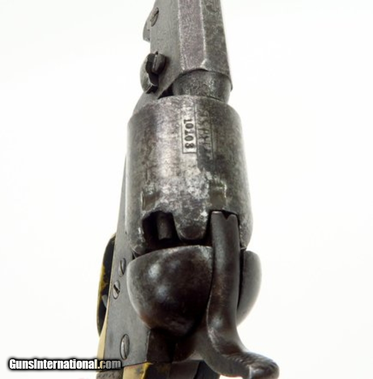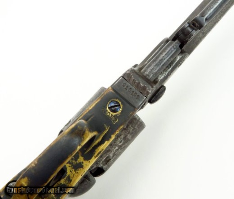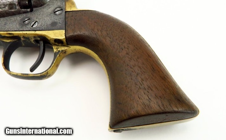Description: Colt 1849 Pocket. Made in 1862 with 6” barrel. Metal has some light pitting and numerous dings. Barrel serial number has been taken off in period of use. Action works perfectly. Grips are good plus. SOLD Antique: Yes |