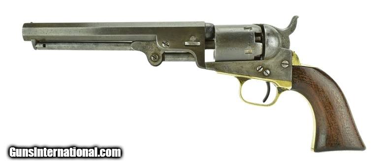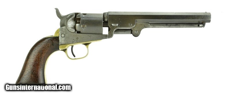 Colt 1849 Pocket Model Revolver. Unusual 6” barrel with two line New York address. Early style small notch loading aperture. Numbers are matching. Action works perfectly. Small “Colts Patent” stamp on frame. Grips are good plus and varnish is later applied. Overall good plus condition. Gun has an overall gray patina.