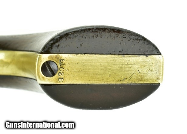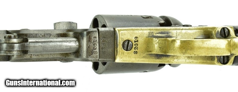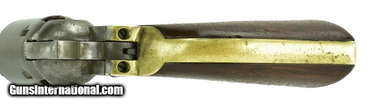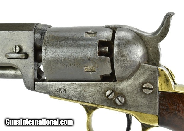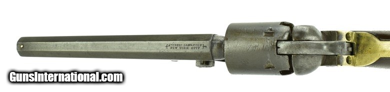 Description: Colt 1849 Pocket Model Revolver. Unusual 6” barrel with two line New York address. Early style small notch loading aperture. Numbers are matching. Action works perfectly. Small “Colts Patent” stamp on frame. Grips are good plus and varnish is later applied. Overall good plus condition. Gun has an overall gray patina.