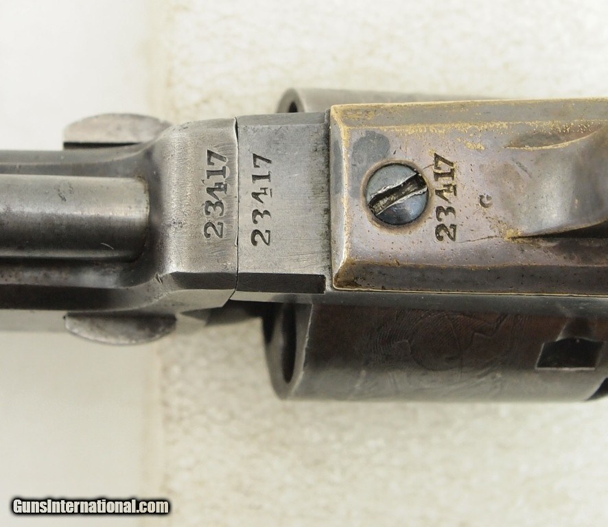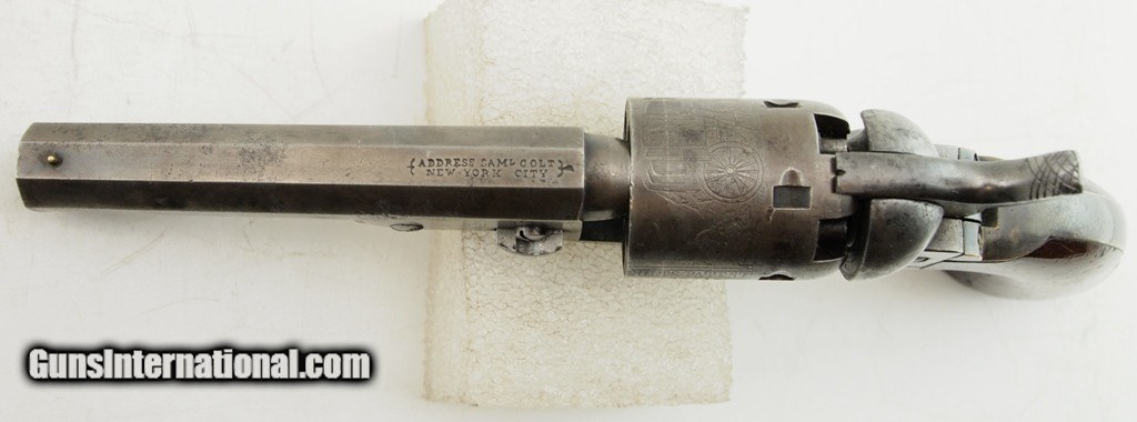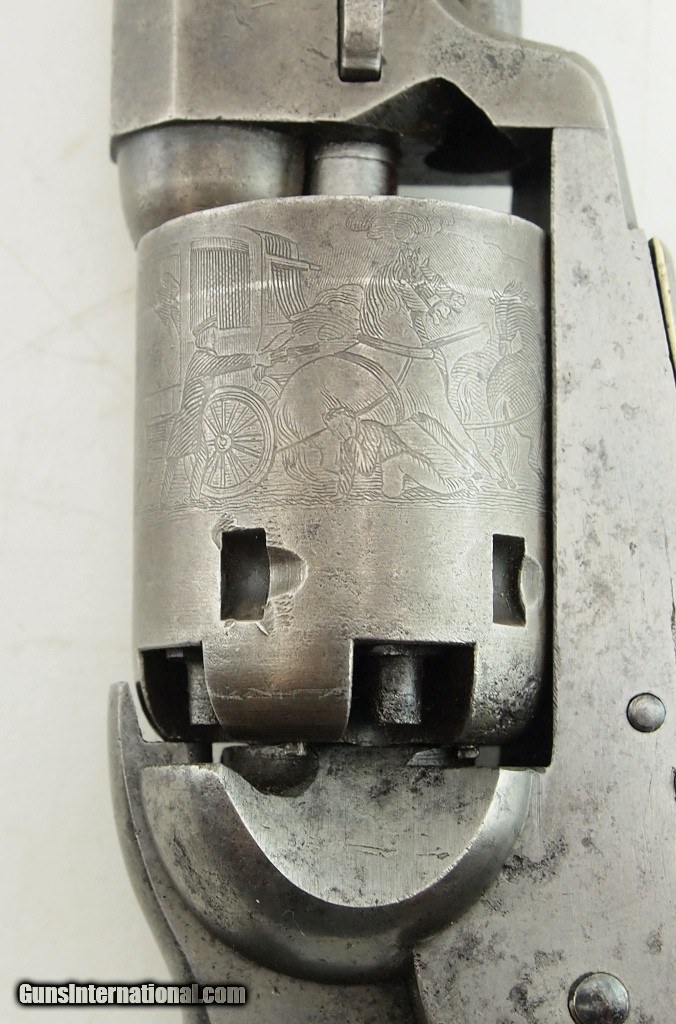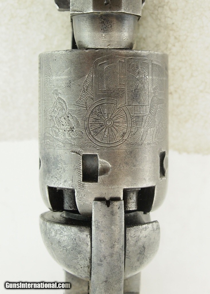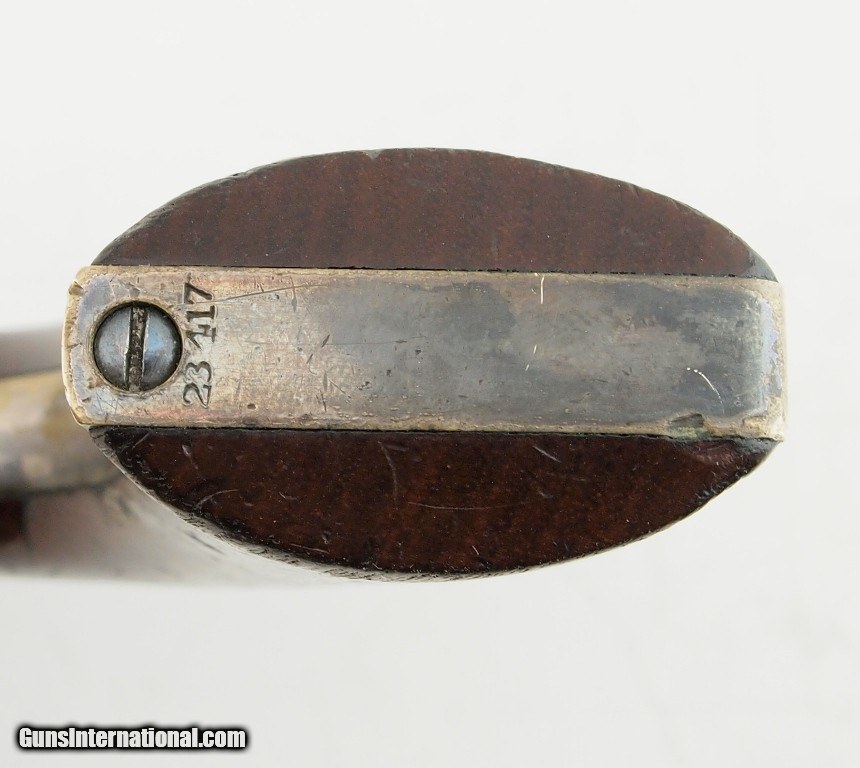 Description: Colt 1849 Pocket SA Antique MFG 1851 .31 Percussion, 4" octagonal bbl, hammer "V" notch rear sight, pin front sight, barrel - cylinder - frame are taking on a nice grey - brown patina, stamped on the top of the barrel is "ADDRESS SAML COLT" above "NEW YORK CITY" in parenthesis, cylinder is engraved in a western motif, serial numbers match on frame - cylinder - barrel - action, and smooth hardwood grips. This is a very nice piece. Add 3% for Credit Card Shipping $25.00 SOLD |