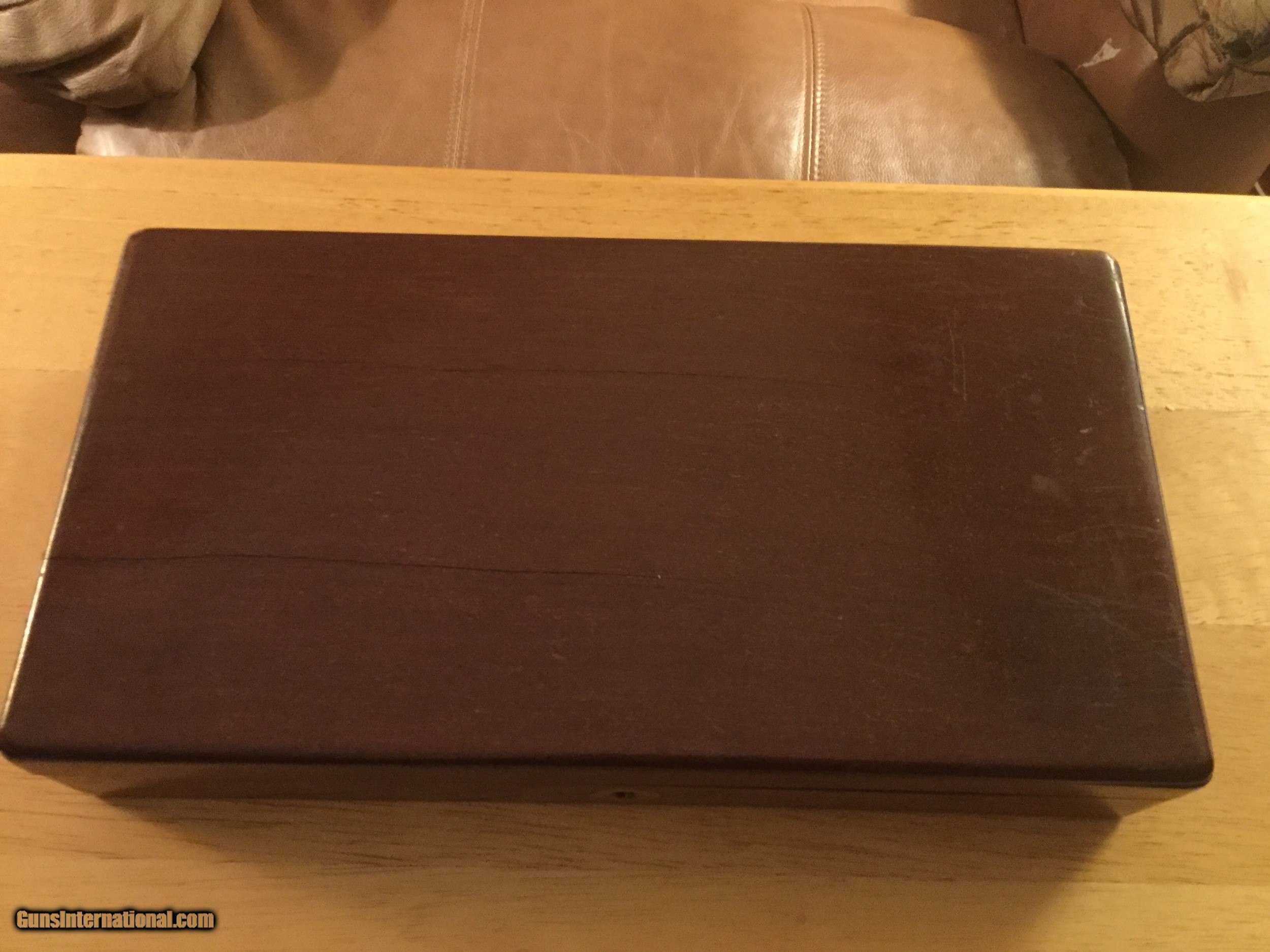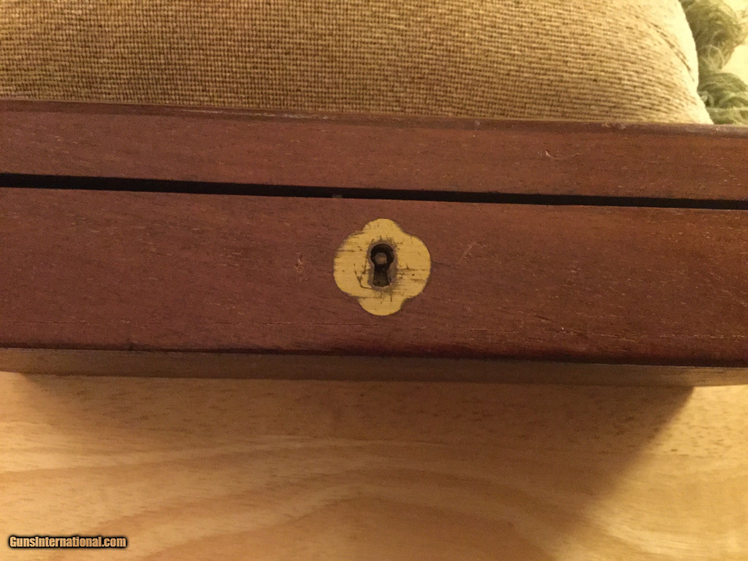 Description: SALE PENDING Hard to find small guard case for a 5” Colt 1849 Pocket. Case is in fine condition with only a slight crack in lid. Case interior exhibits typical stains with a small wear mark caused by revolver front sight. Lock escutcheon is intact but no key. SOLD Antique: Yes |