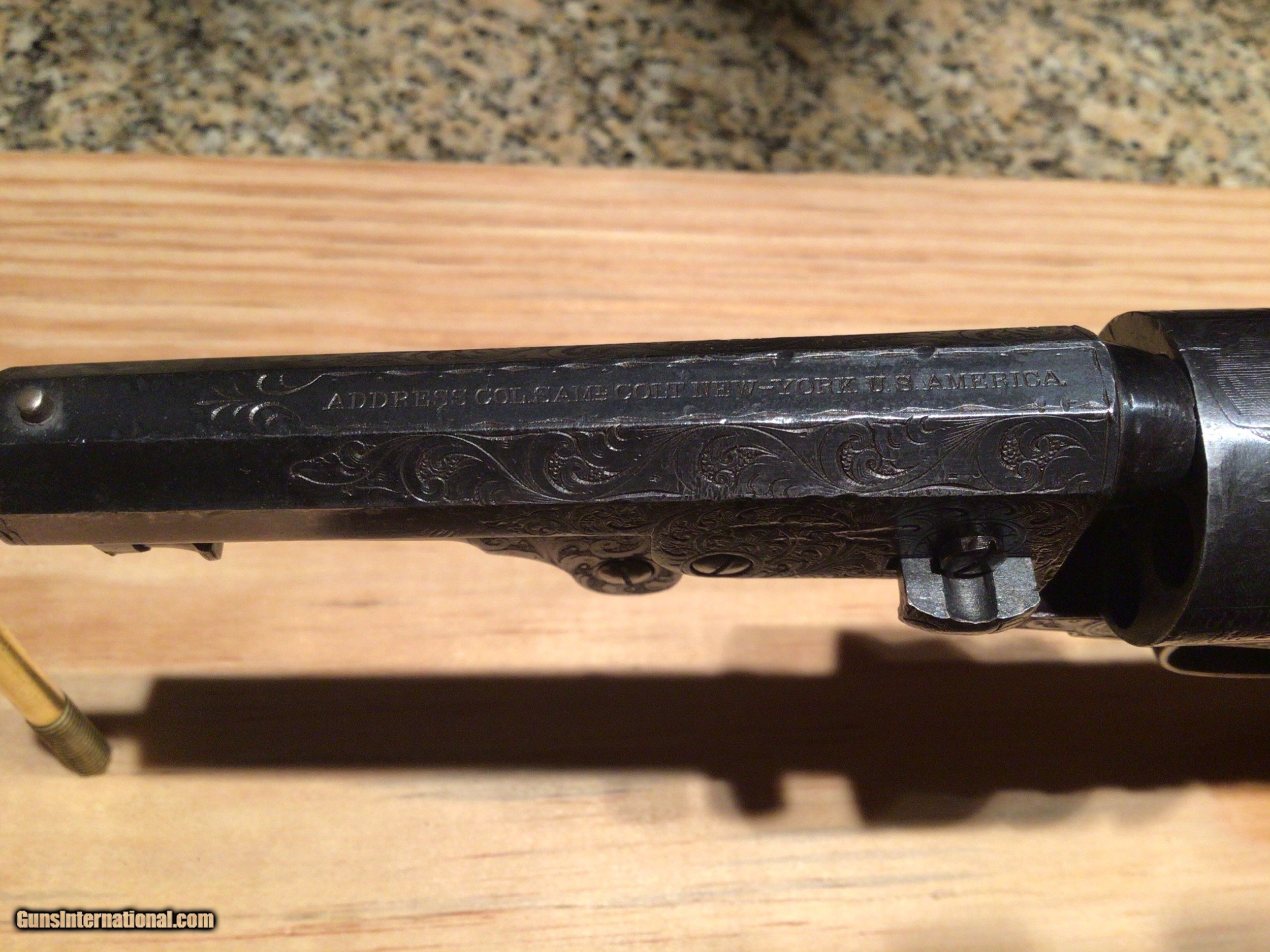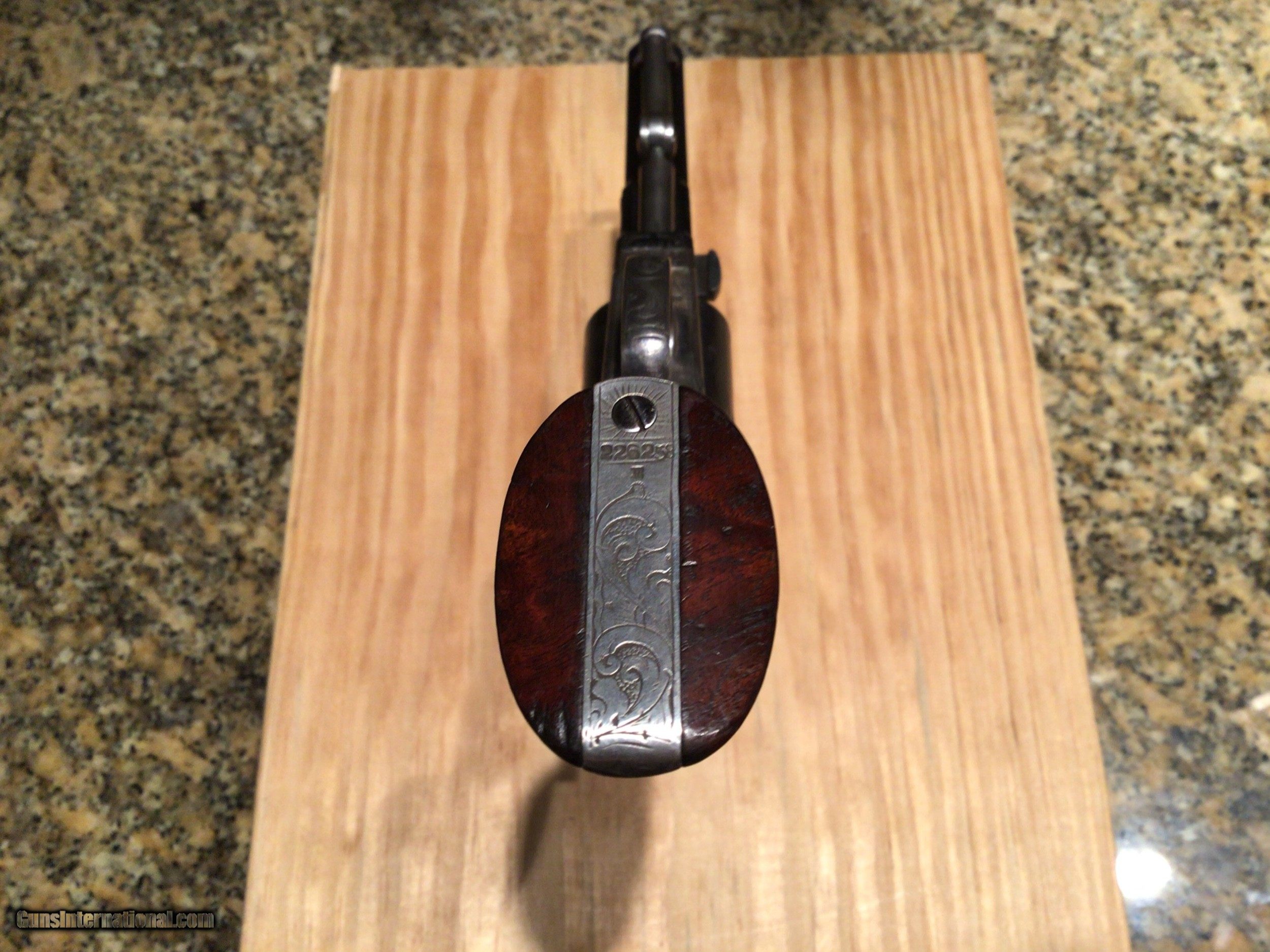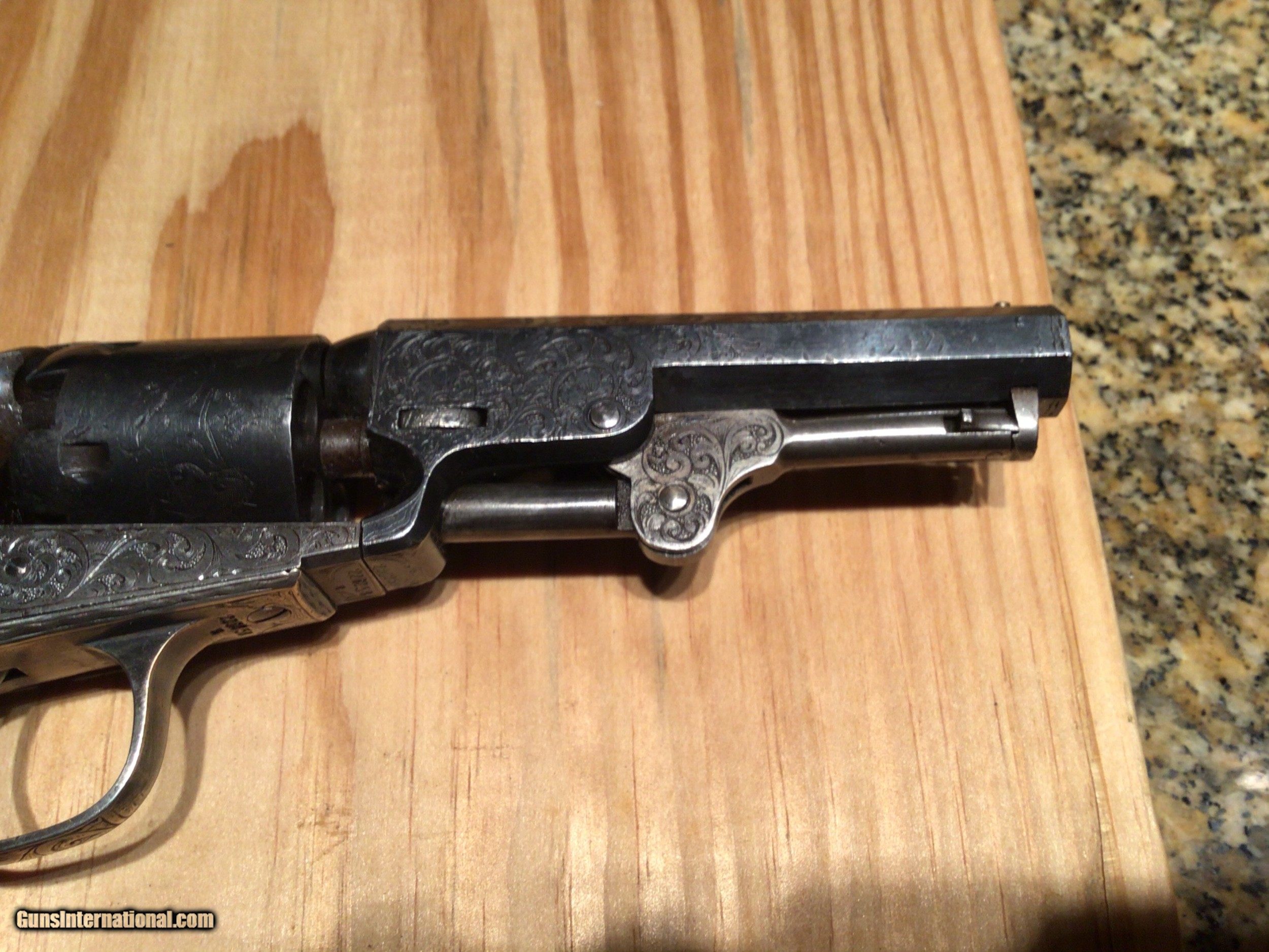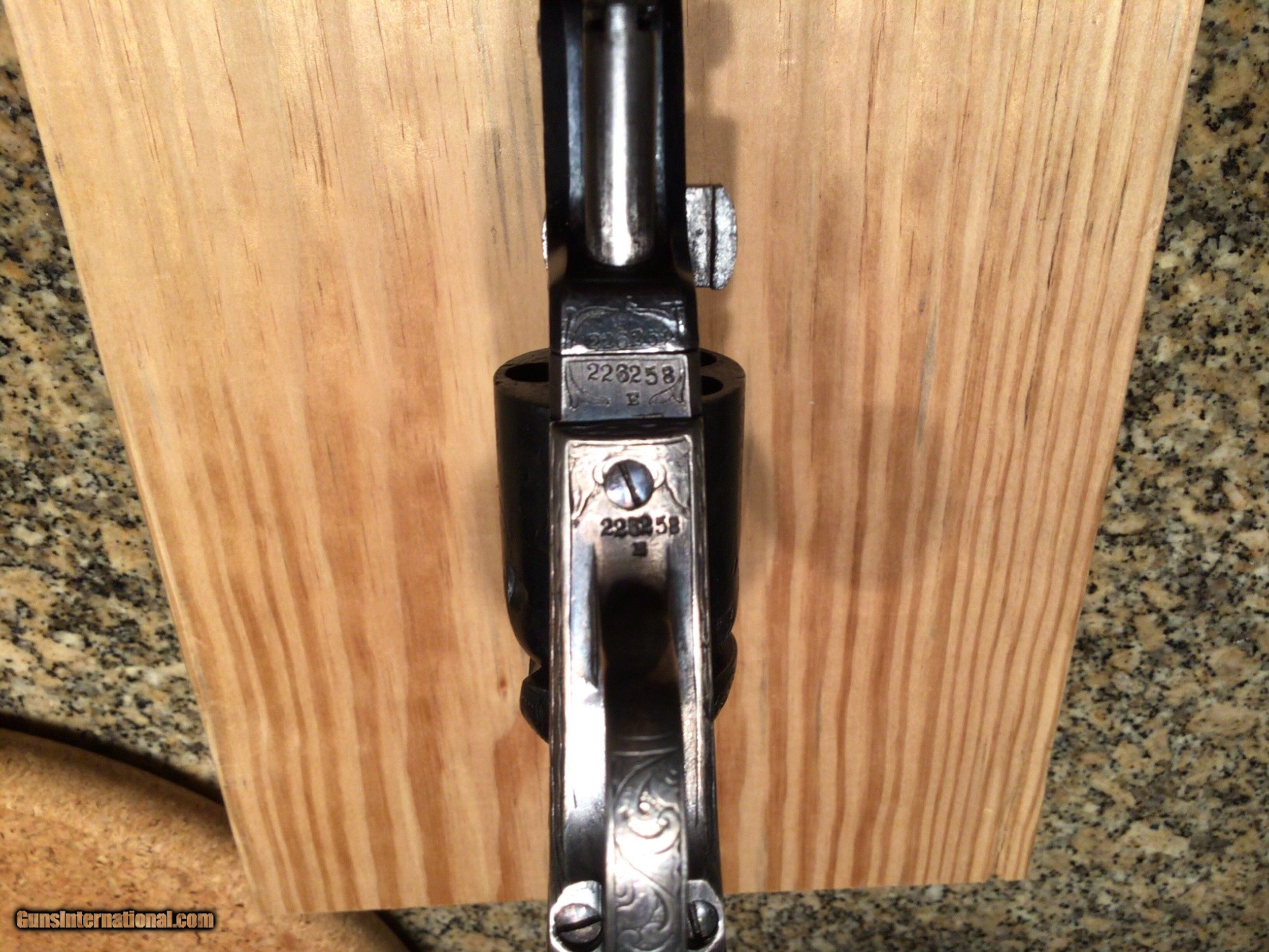 Description: SALE PENDING Engraved 4" Pocket Mfd in 1863 (large guard) S/N 226258 E. The "E" in later models was used to designate engraved. In earlier models the "E" was used to designate for London market. 95% blue on barrel and cylinder. Scene is 75%. Strong case colors on frame, loading lever and hammer with most of the silver remaining on trigger guard and back strap. Excellent engraved large guard. Reasonable offers will be considered. Call with questions or request for additional photos. SOLD Antique: Yes |