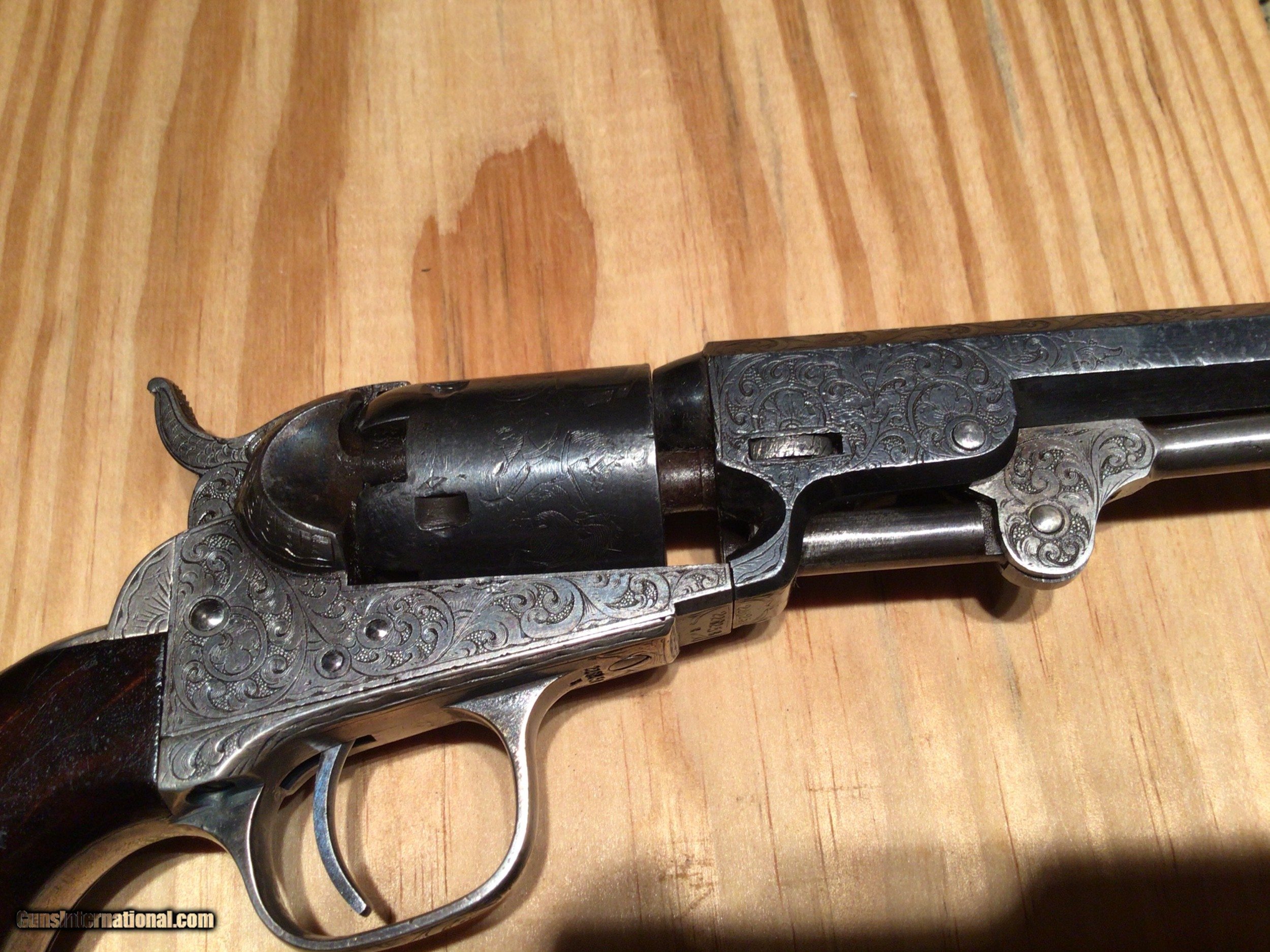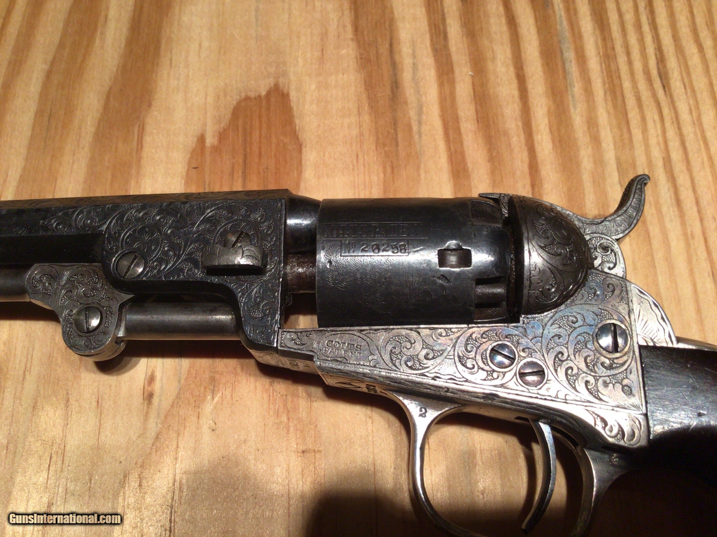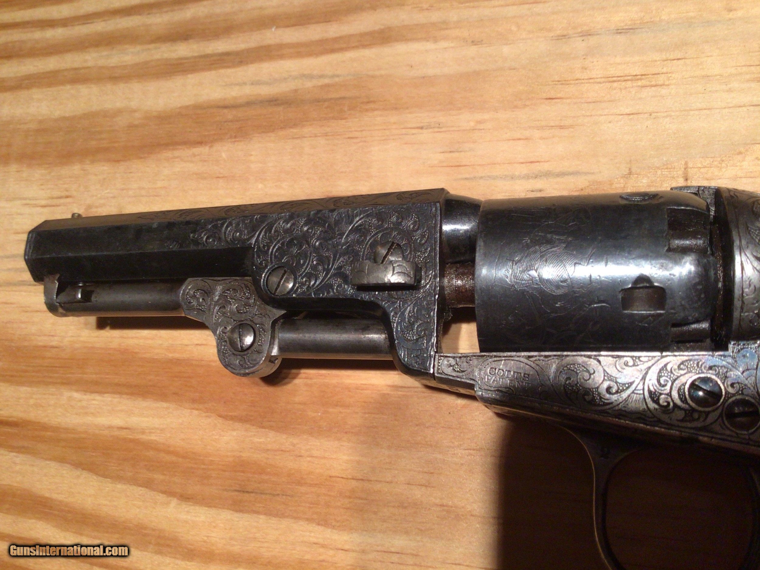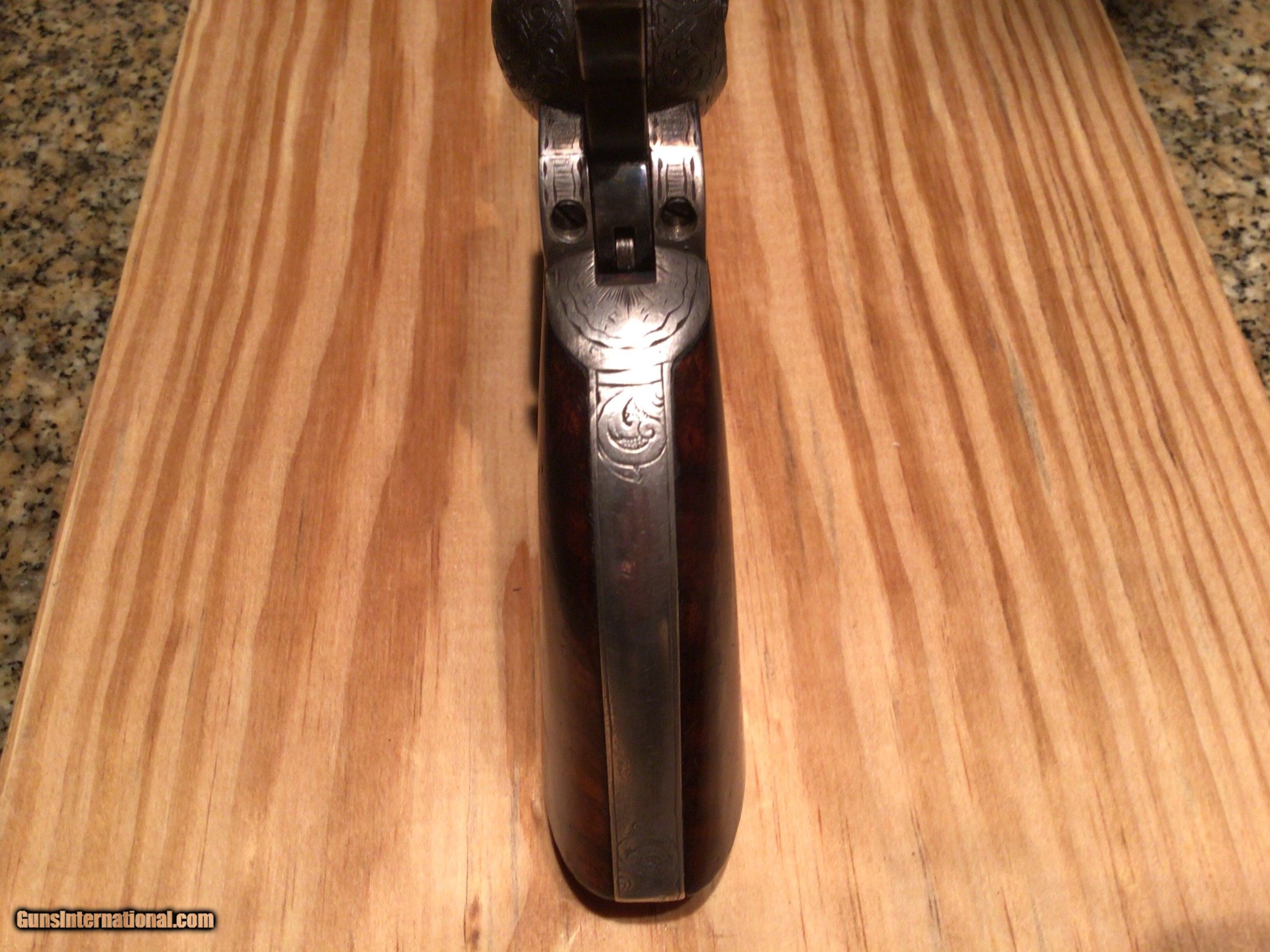 Description: SALE PENDING Engraved 4" Pocket Mfd in 1863 (large guard) S/N 226258 E. The "E" in later models was used to designate engraved. In earlier models the "E" was used to designate for London market. 95% blue on barrel and cylinder. Scene is 75%. Strong case colors on frame, loading lever and hammer with most of the silver remaining on trigger guard and back strap. Excellent engraved large guard. Reasonable offers will be considered. Call with questions or request for additional photos. SOLD Antique: Yes |