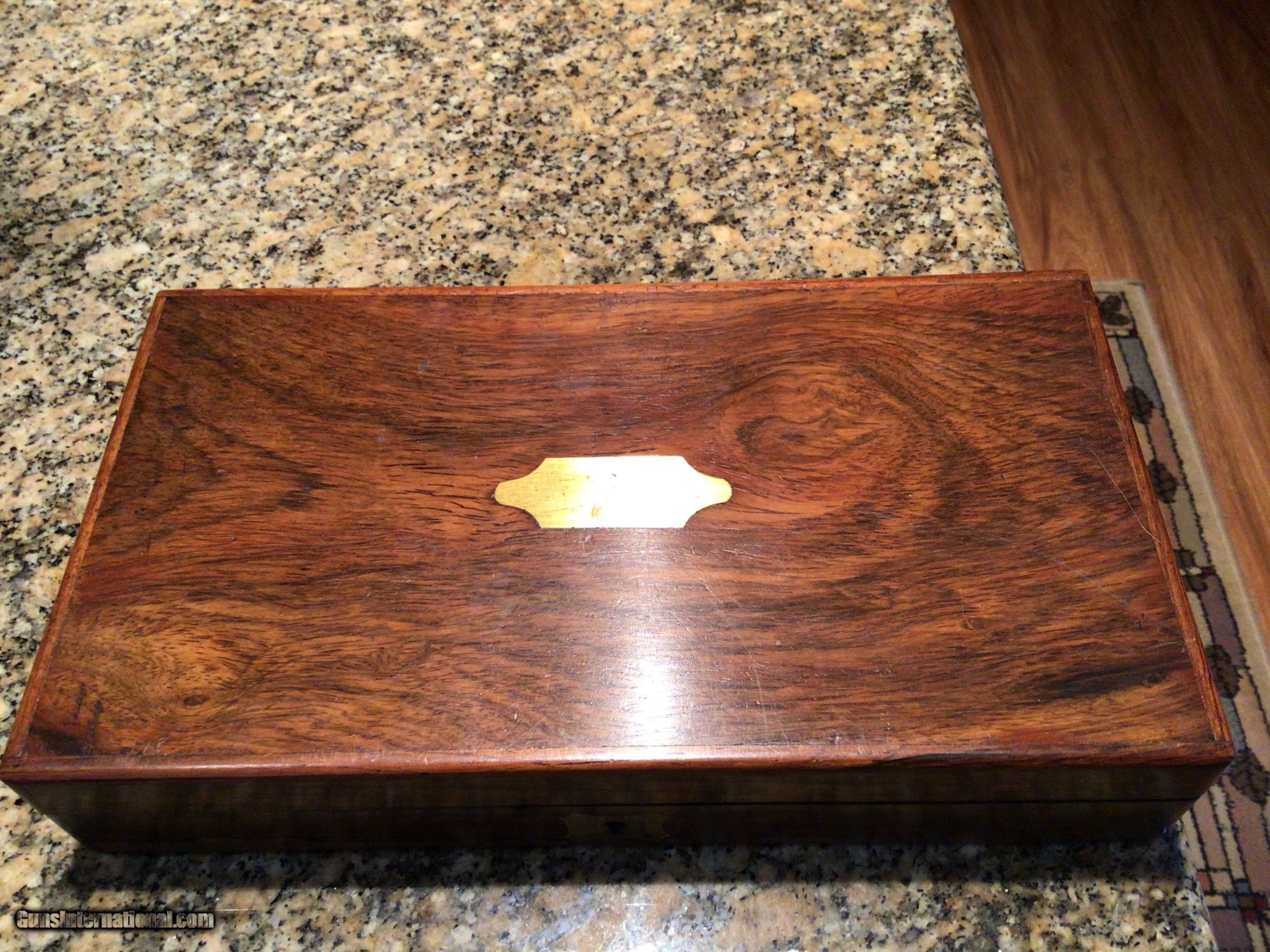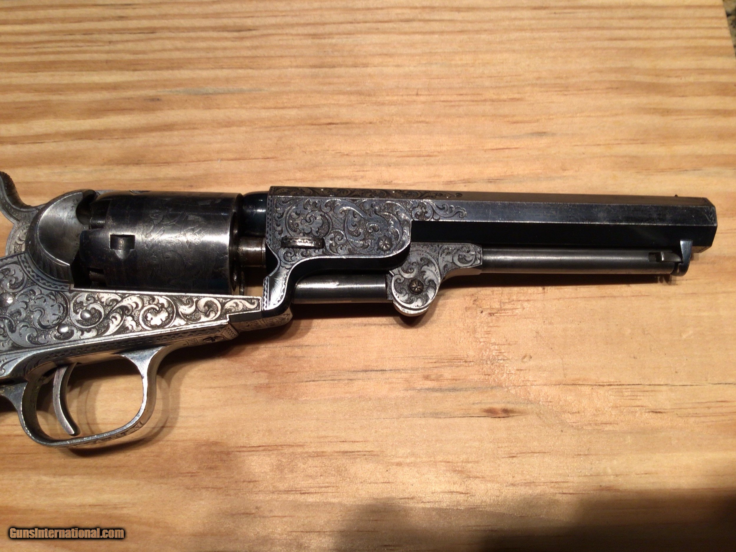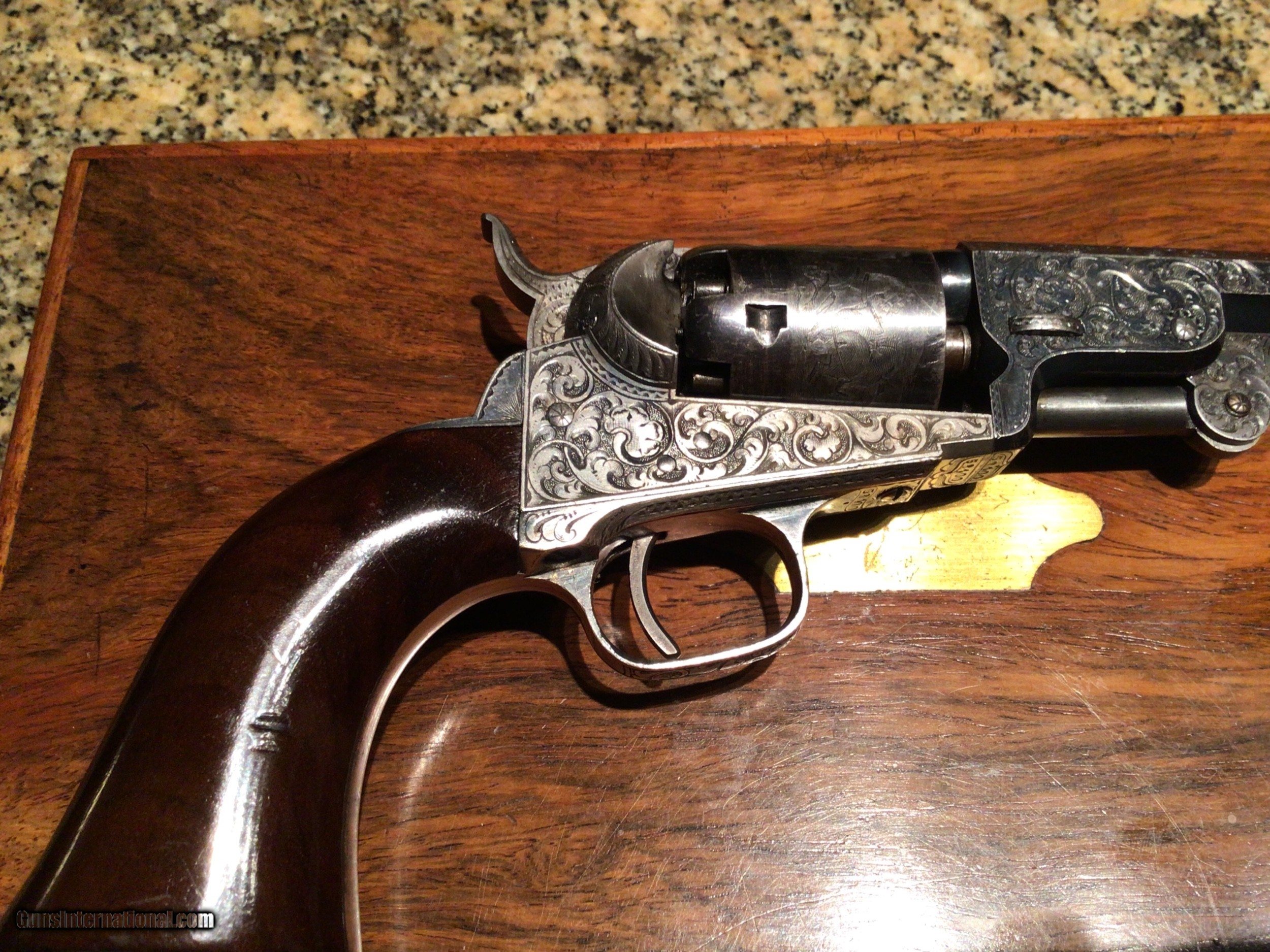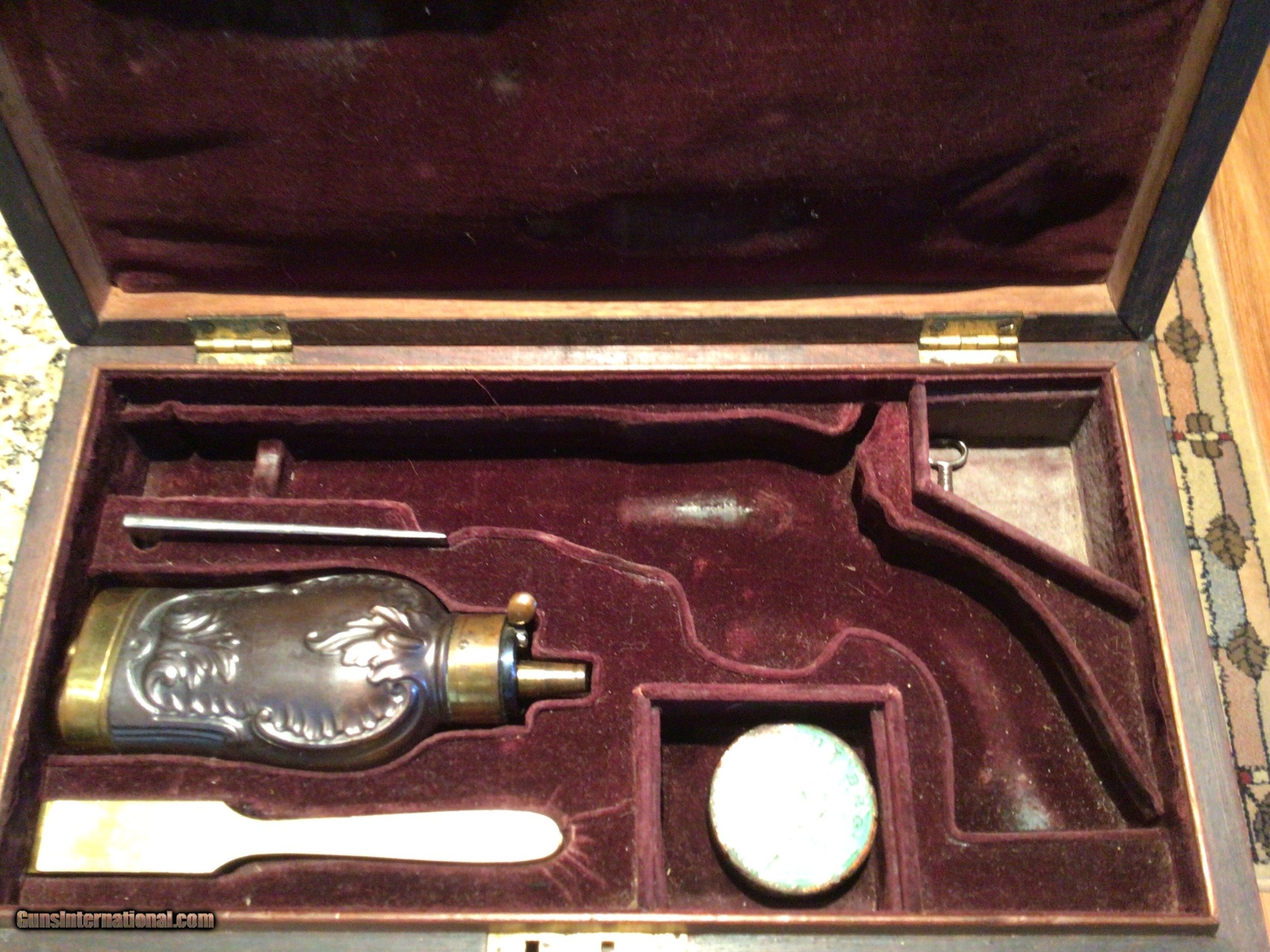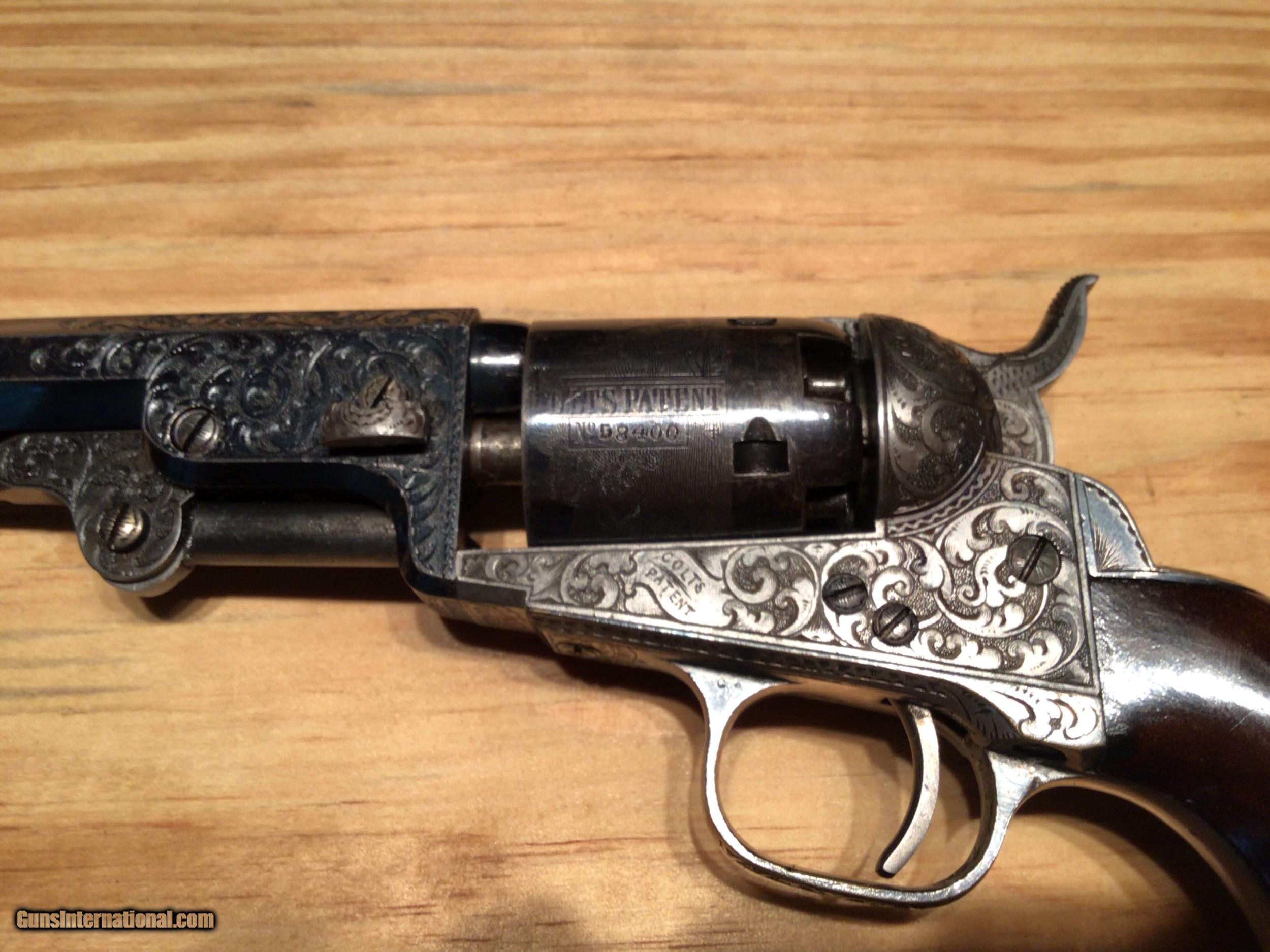 Description: 1849 Colt Pocket Revolver. Cased and engraved. This 5" Pocket is engraved and in a rare Rosewood French style casing, S/N 58400-Mfd in 1853.The revolver retains 95-98% original blue throughout with 95% silver remaining on BS and TG with some slight tarnishing on underside of butt. Case colors remain on frame, loading lever and flash shield. All engraving/markings are sharp and crisp. Cylinder scene is ~90%. Bore is clean with no pitting noted. Walnut grips are near perfect. All accessories are excellent. This quality set would normally be found only at a high level action house and comes with an outstanding provenance and no added premiums. You want a Crown Jewel for your collection? This Is it! Will consider all serious offers. Liquidating my collection. Questions and requests for additional photos welcomed. Price includes shipping in Contiguous US SOLD Antique: Yes |