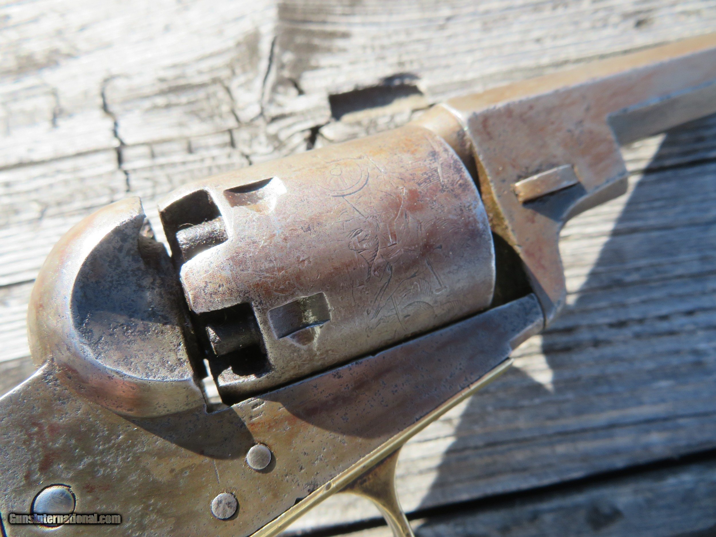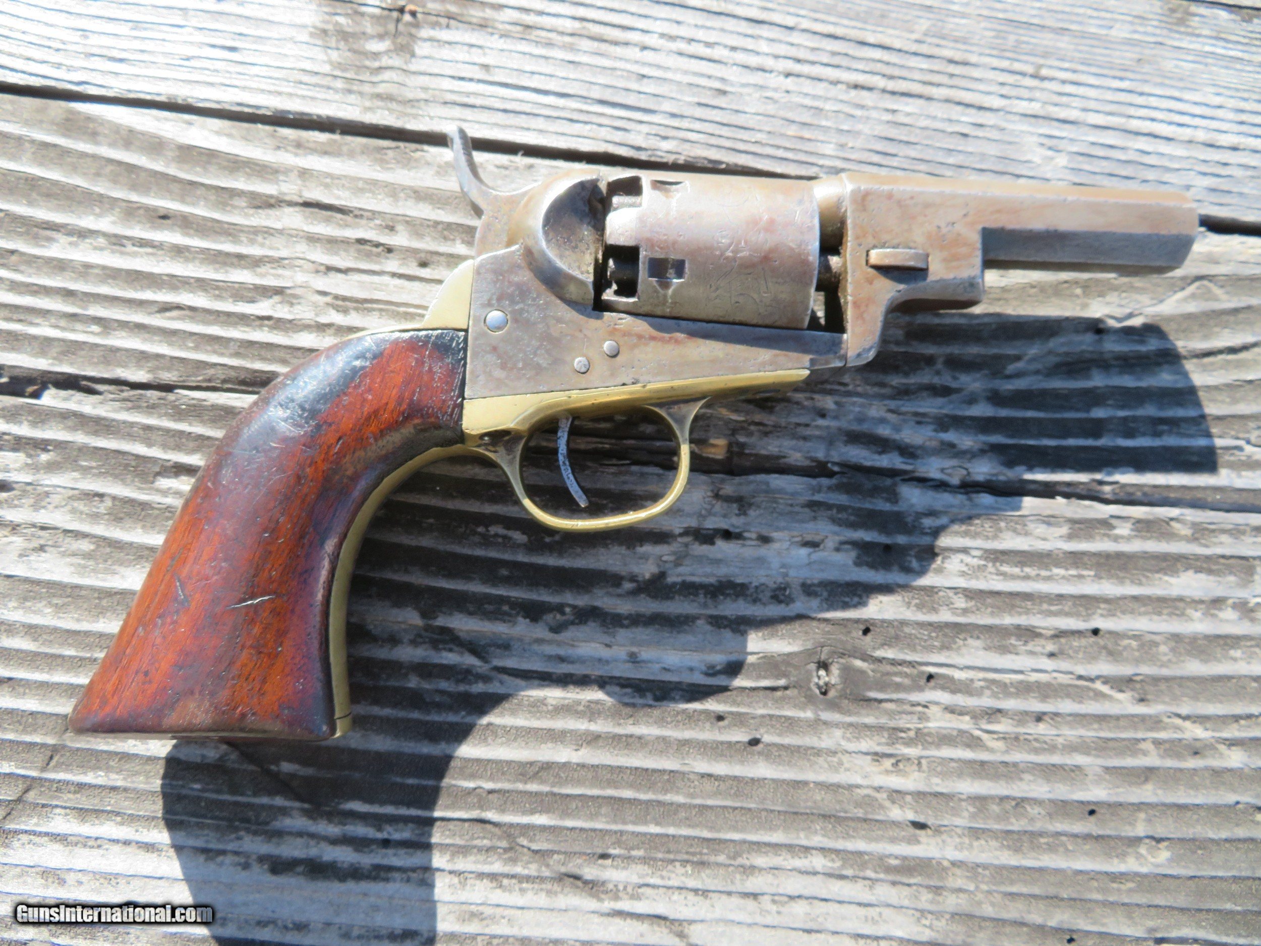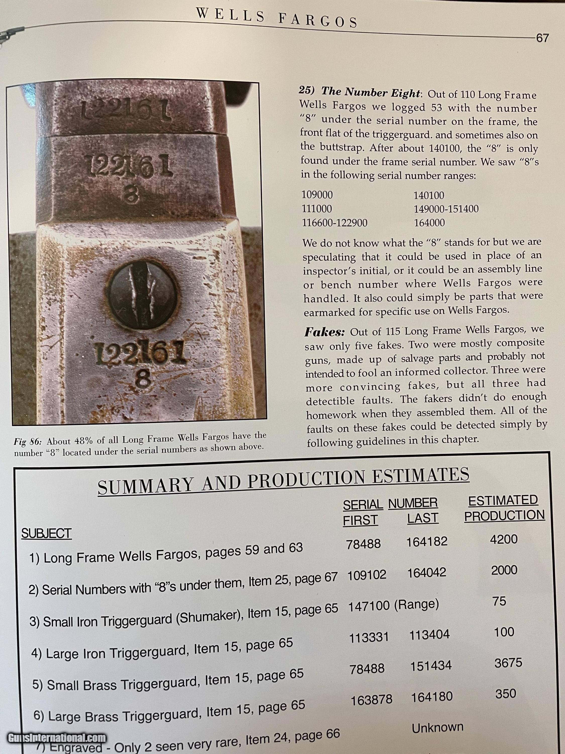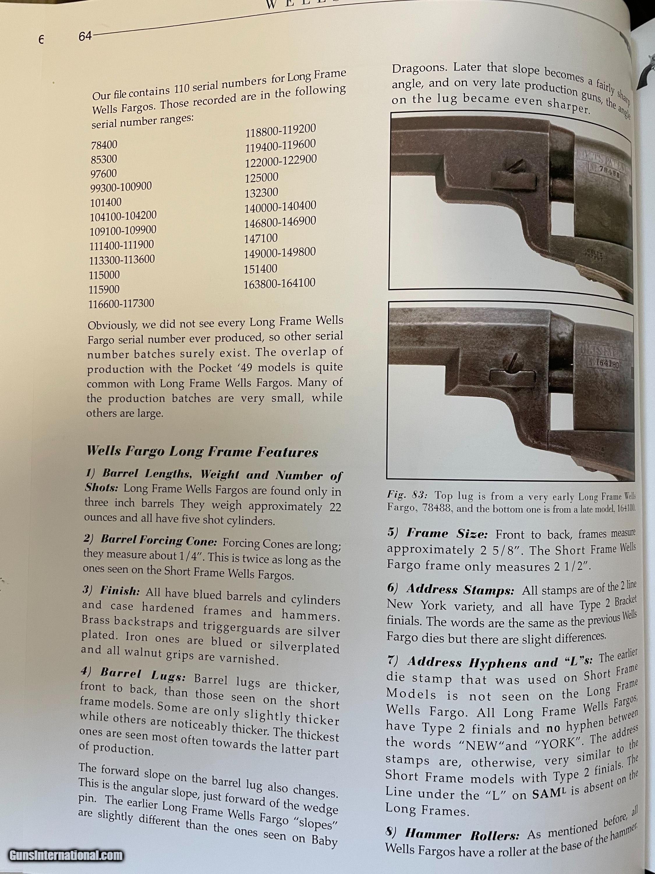Description: For sale is a Colt 1849 Wells Fargo Model. This particular Wells Fargo Serial No. 122208 falls into the serial number range of many well-known examples. Pages taken from the book "Colt's Pocket 49" show that this model of Wells Fargo is unique displaying an 8 on the frame, trigger guard, and buttstrap. Making this particular model 1 of only 2000 ever produced. The bore is frosty but excellent. The action on this old gal is amazing. Most actions on these Pocket 49's leave a lot to be desired, however, this one is excellent. Half cock allows the cylinder to rotate to load, and full cock indexes on all chambers and locks up tight. As the pictures show, the pistol wears a beautiful patina from years of age. The one-piece walnut grips are in very decent shape. All serial numbers match, aside from the wedge which is un numbered. The cylinder appears to match, but it is boogered up as this piece appears to be a heavy-use carry gun. Two Line New York Address. The cylinder scene is present. *Concerning the cylinder, I believe it to be an early replacement. Early, as in the week after the pistol was made. From my knowledge, Wells Fargos only shipped with a 5-shot cylinder. The owner of this particular piece opted to have a gunsmith or Colt fit his/her concealed carry pistol with a 6-shot cylinder for one extra round. A very fascinating piece to say the least, as not much has changed over the last 170 years! We are still trying to fit more rounds in our pistols and keep them the same size! I will negotiate or trade. Thanks SOLD Handgun Caliber: .31 Manufacturer: Colt Model: Model 1849 Serial Number: 122208 Barrel Length: 3 Chambers: 6 Condition: Average to Good Wood Condition: Good Bore Condition: Average Action: Single Action Manufacture Date: 1856 |