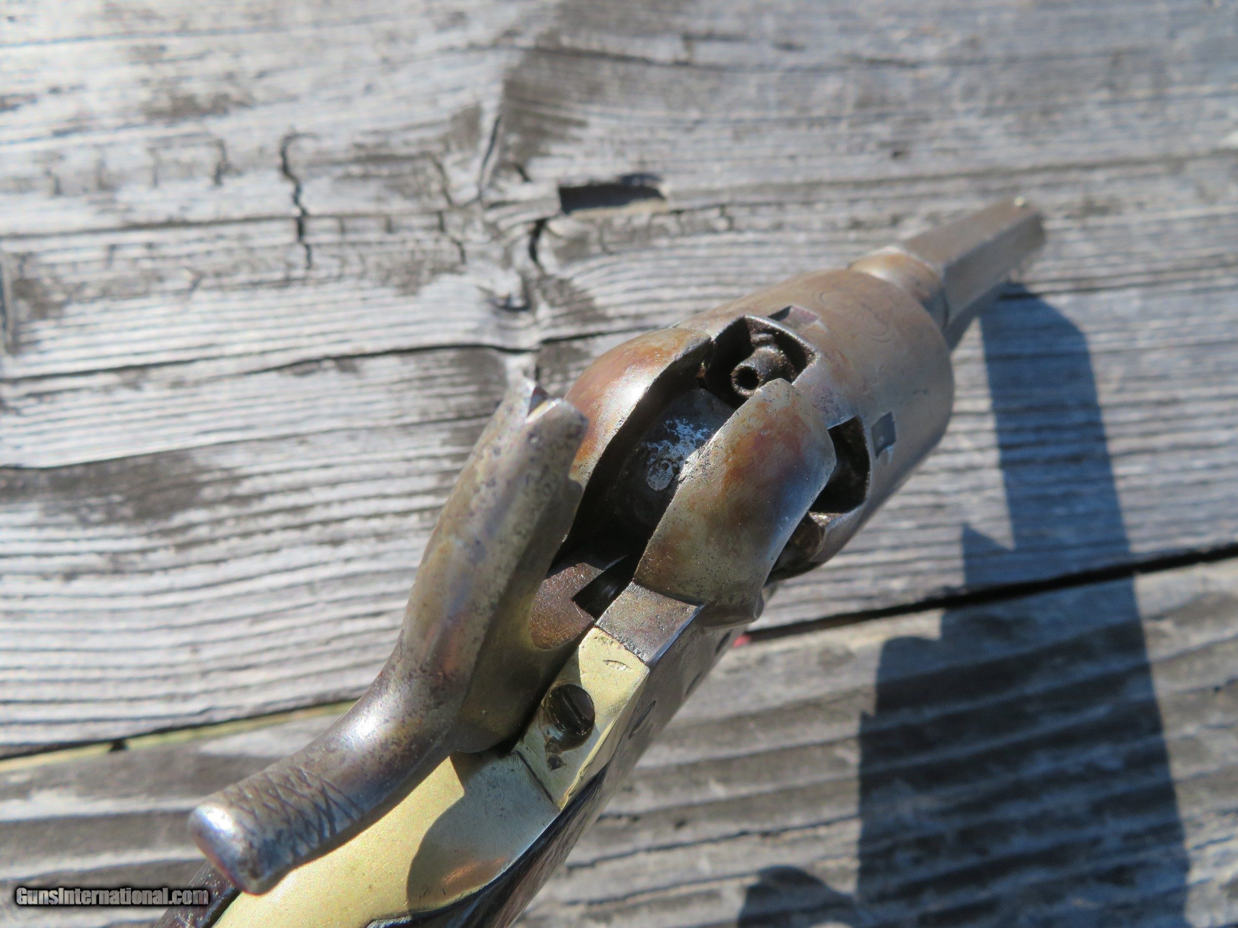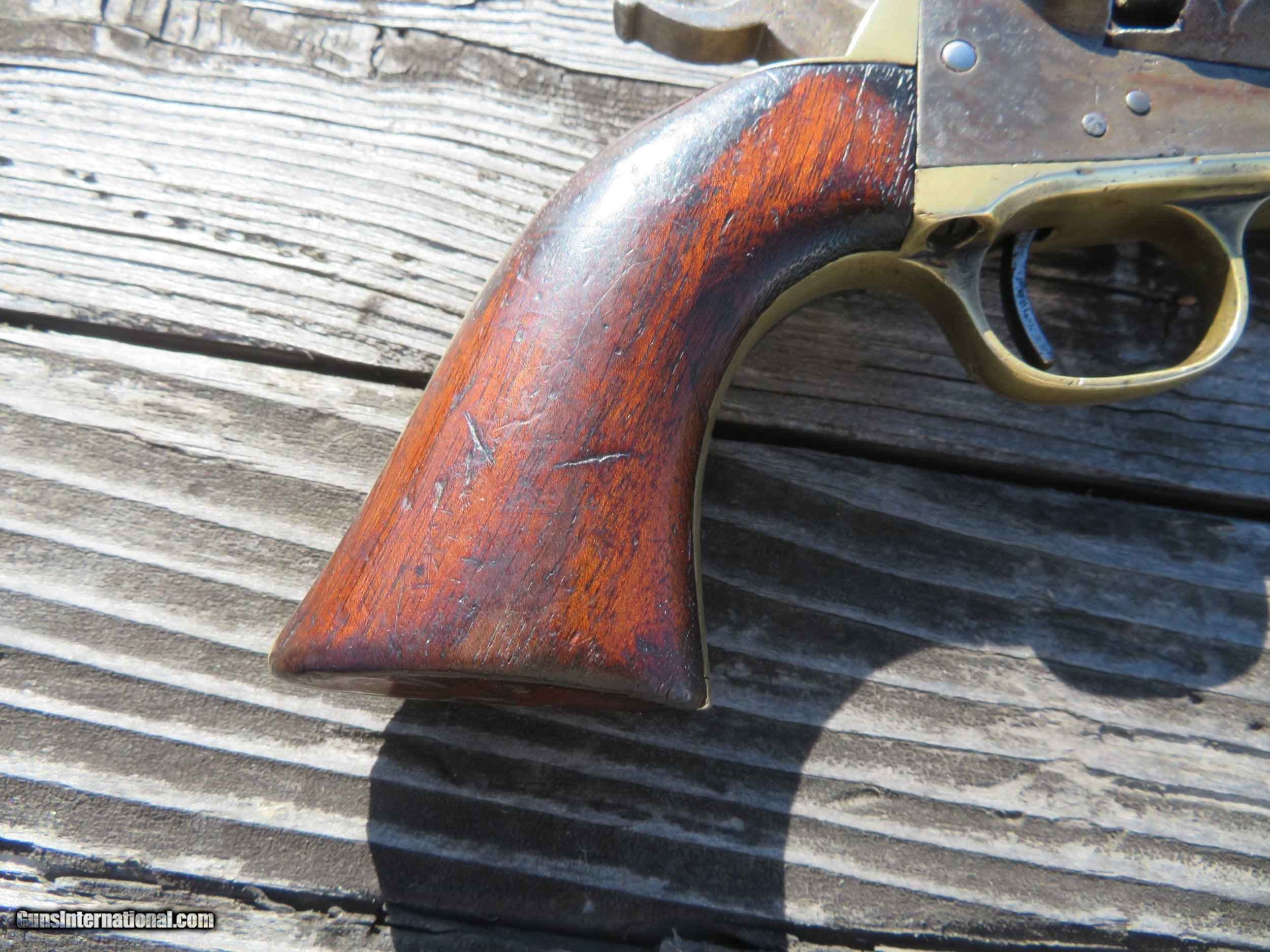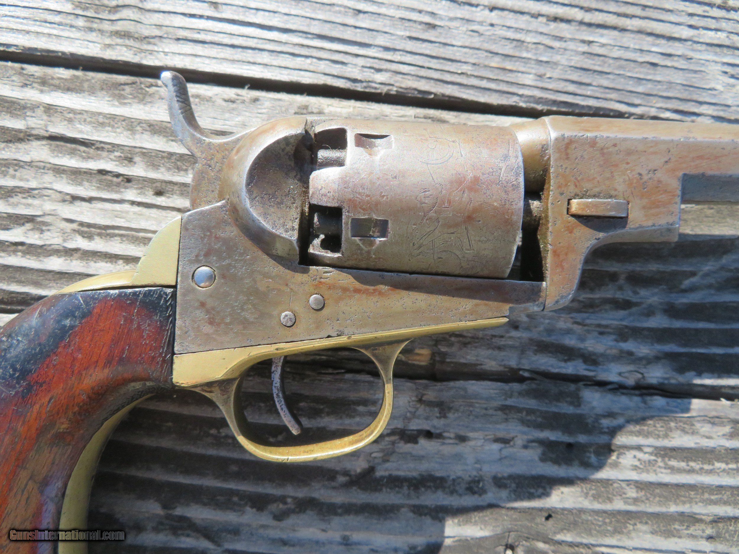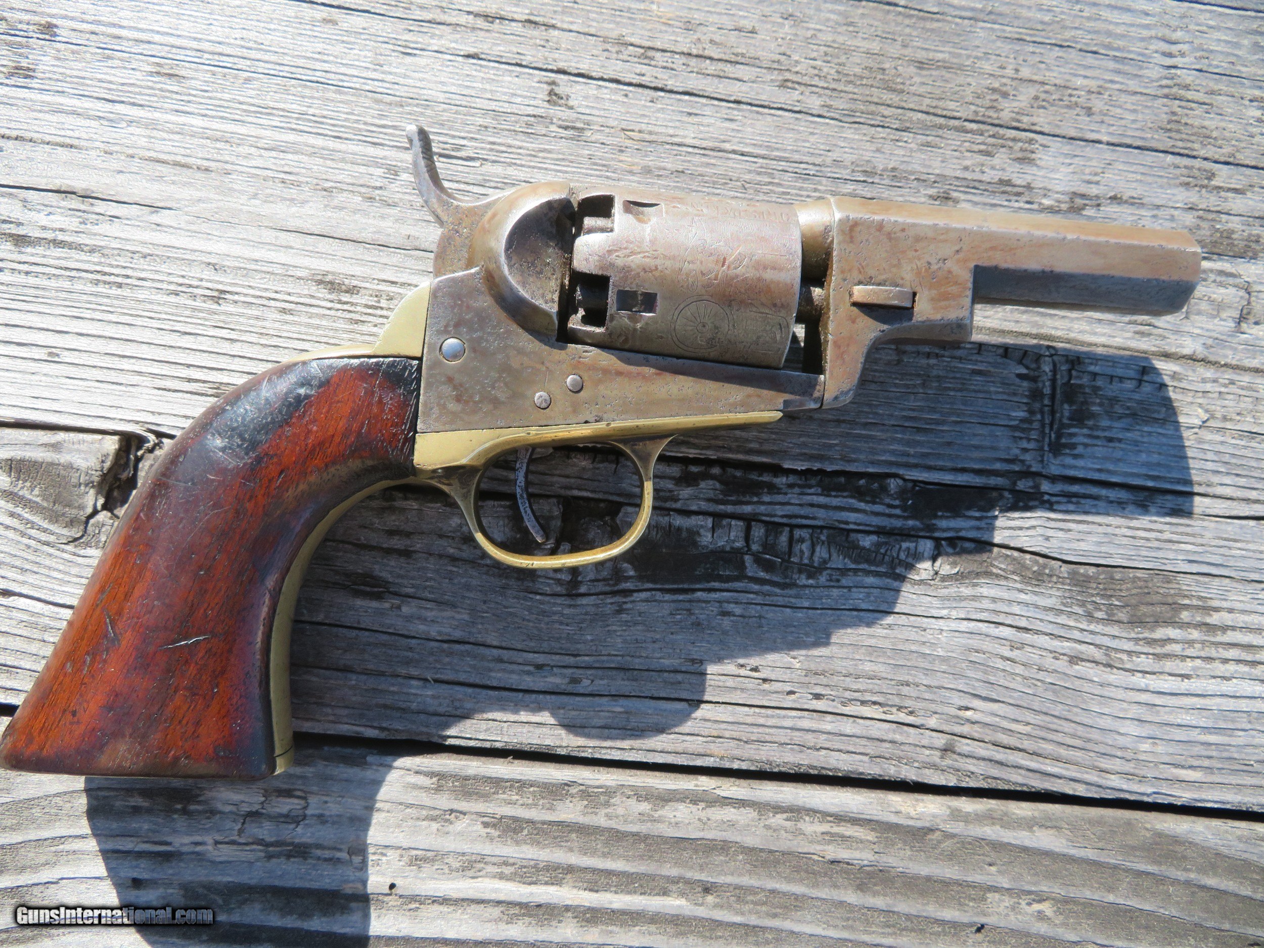 Description: For sale is a Colt 1849 Wells Fargo Model. This particular Wells Fargo Serial No. 122208 falls into the serial number range of many well-known examples. Pages taken from the book "Colt's Pocket 49" show that this model of Wells Fargo is unique displaying an 8 on the frame, trigger guard, and buttstrap. Making this particular model 1 of only 2000 ever produced. The bore is frosty but excellent. The action on this old gal is amazing. Most actions on these Pocket 49's leave a lot to be desired, however, this one is excellent. Half cock allows the cylinder to rotate to load, and full cock indexes on all chambers and locks up tight. As the pictures show, the pistol wears a beautiful patina from years of age. The one-piece walnut grips are in very decent shape. All serial numbers match, aside from the wedge which is un numbered. The cylinder appears to match, but it is boogered up as this piece appears to be a heavy-use carry gun. Two Line New York Address. The cylinder scene is present. *Concerning the cylinder, I believe it to be an early replacement. Early, as in the week after the pistol was made. From my knowledge, Wells Fargos only shipped with a 5-shot cylinder. The owner of this particular piece opted to have a gunsmith or Colt fit his/her concealed carry pistol with a 6-shot cylinder for one extra round. A very fascinating piece to say the least, as not much has changed over the last 170 years! We are still trying to fit more rounds in our pistols and keep them the same size! I will negotiate or trade. Thanks SOLD Handgun Caliber: .31 Manufacturer: Colt Model: Model 1849 Serial Number: 122208 Barrel Length: 3 Chambers: 6 Condition: Average to Good Wood Condition: Good Bore Condition: Average Action: Single Action Manufacture Date: 1856 |