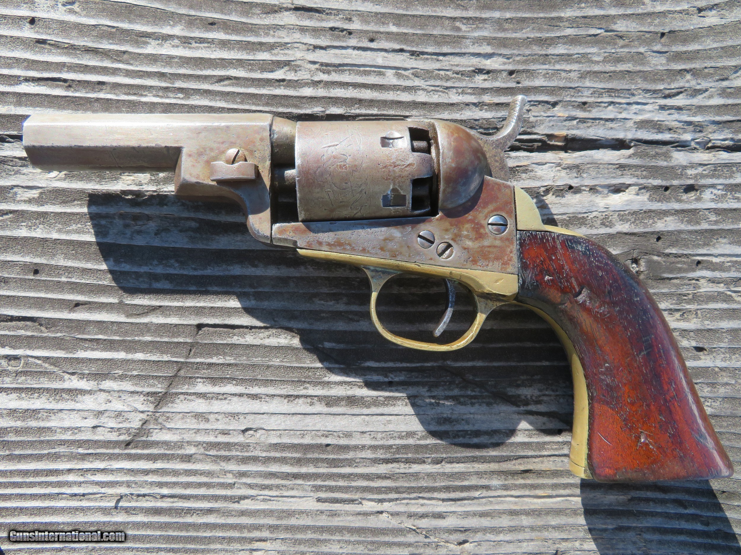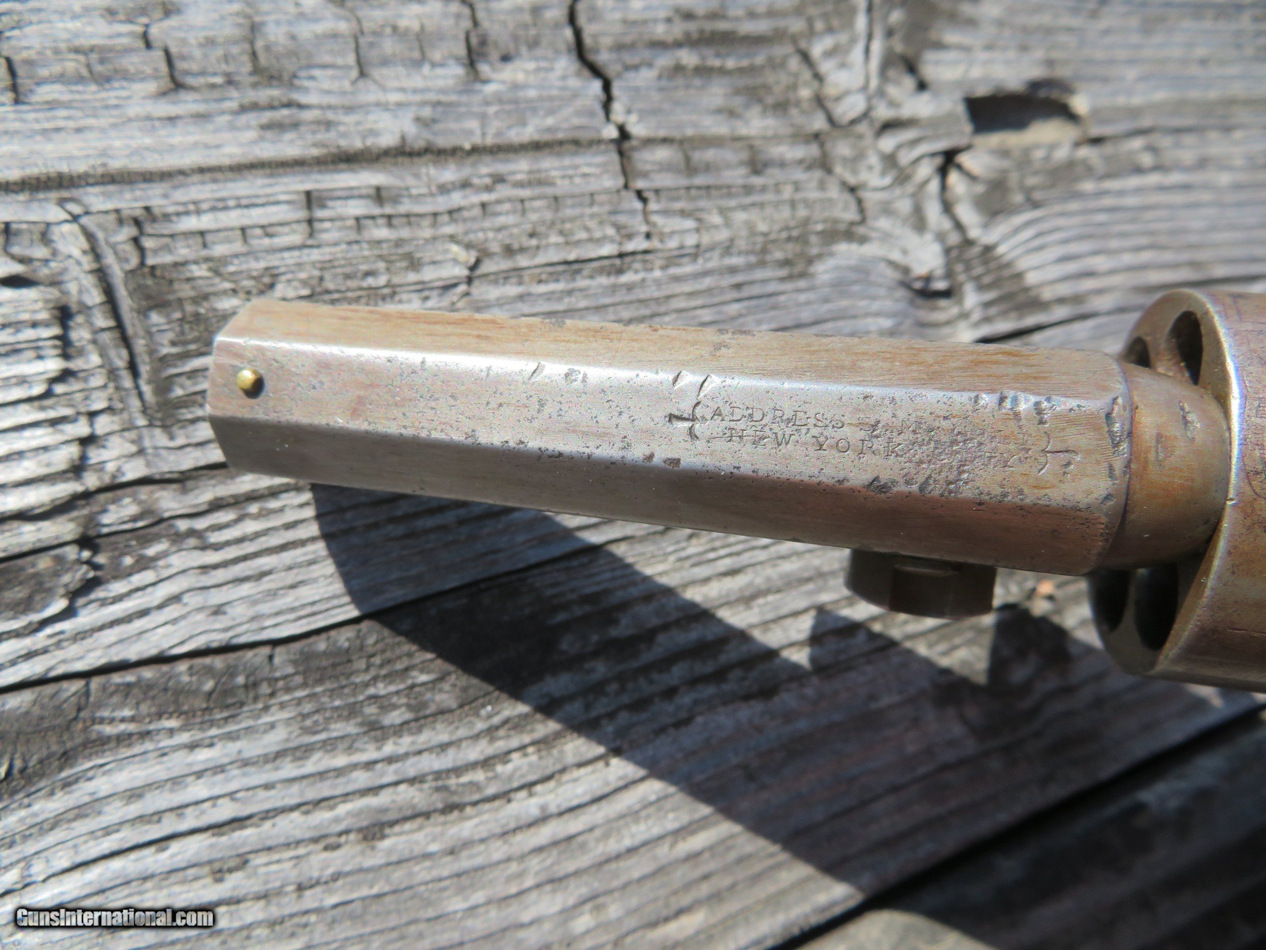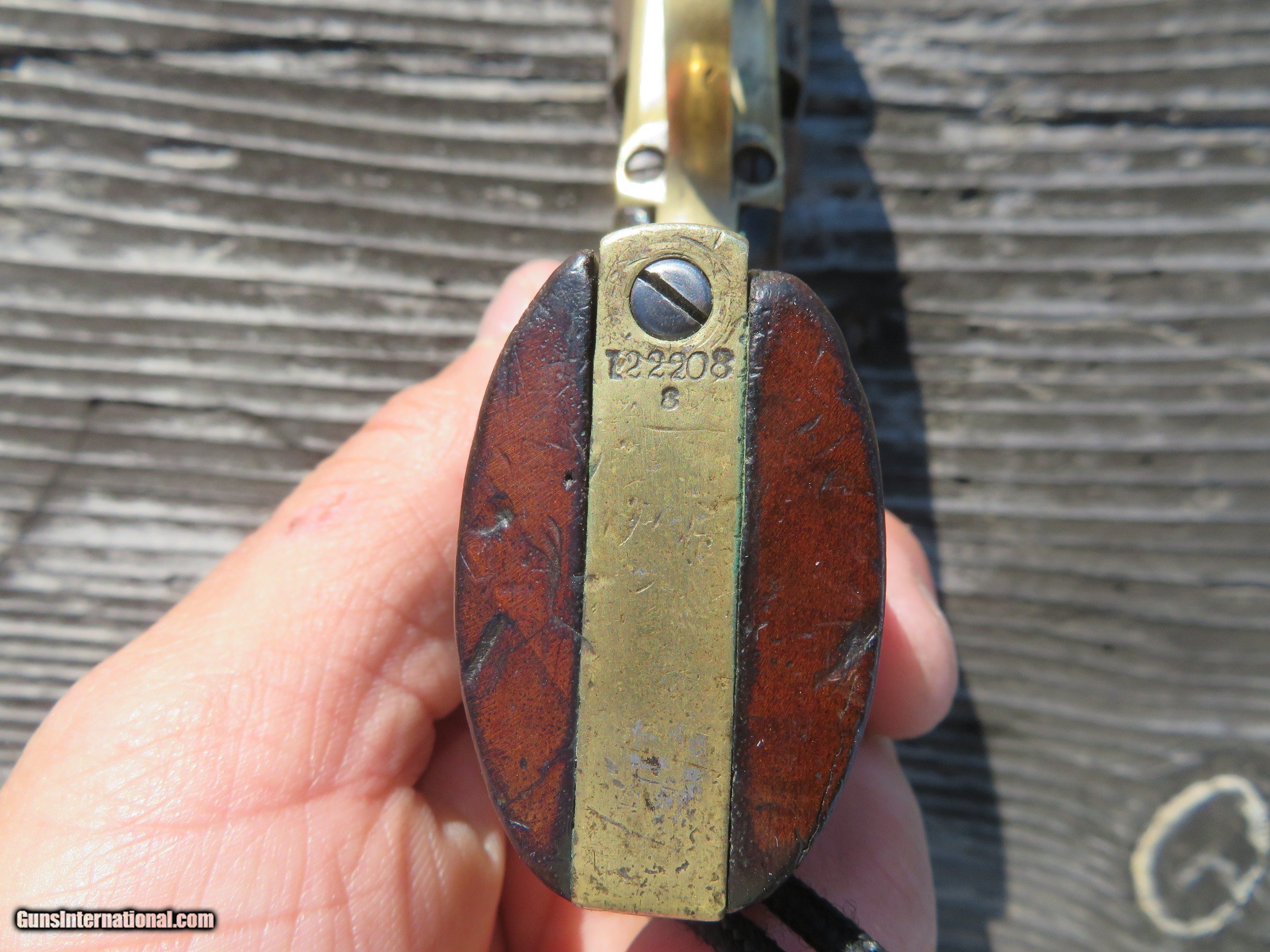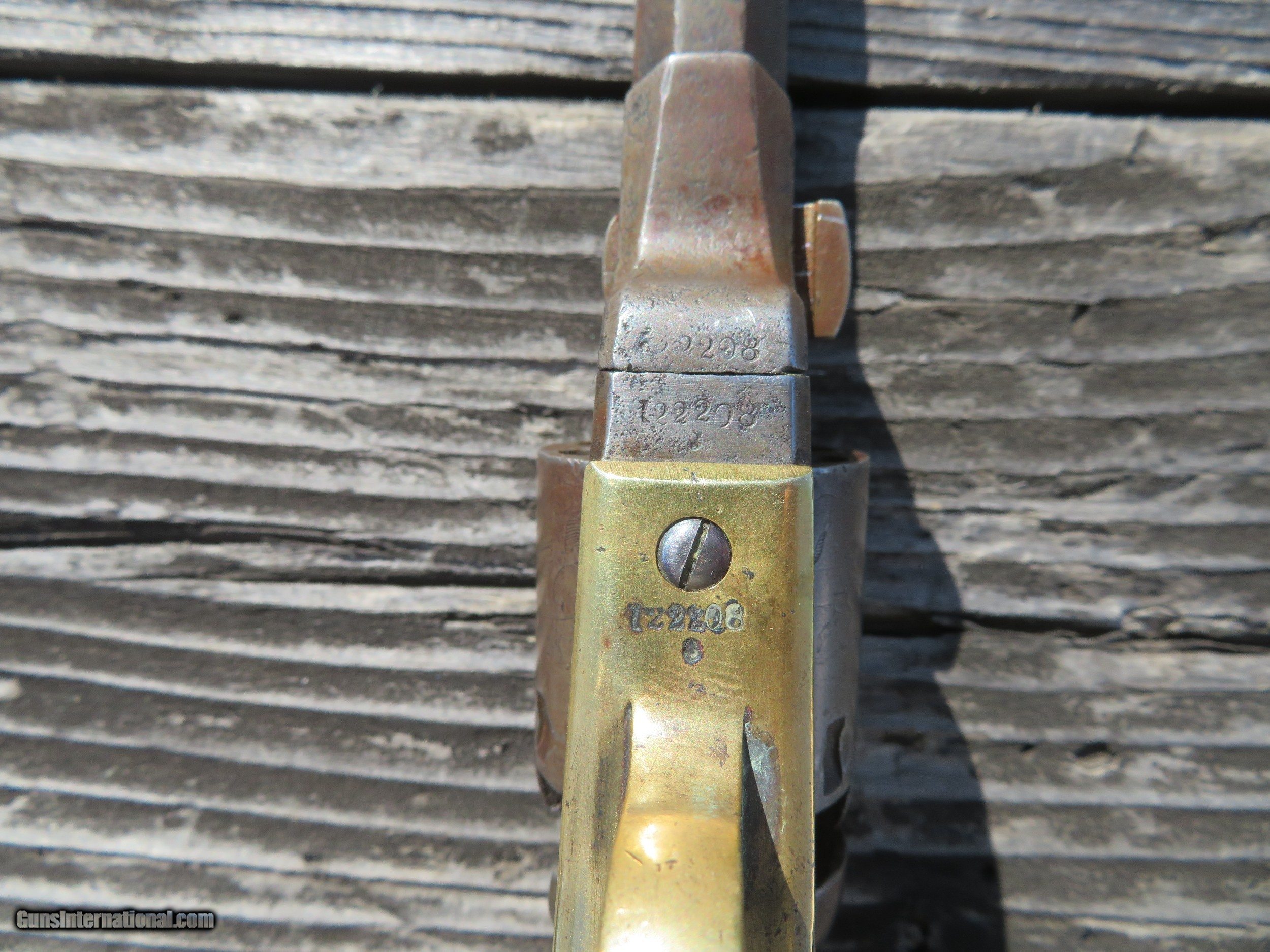 Description: For sale is a Colt 1849 Wells Fargo Model. This particular Wells Fargo Serial No. 122208 falls into the serial number range of many well-known examples. Pages taken from the book "Colt's Pocket 49" show that this model of Wells Fargo is unique displaying an 8 on the frame, trigger guard, and buttstrap. Making this particular model 1 of only 2000 ever produced. The bore is frosty but excellent. The action on this old gal is amazing. Most actions on these Pocket 49's leave a lot to be desired, however, this one is excellent. Half cock allows the cylinder to rotate to load, and full cock indexes on all chambers and locks up tight. As the pictures show, the pistol wears a beautiful patina from years of age. The one-piece walnut grips are in very decent shape. All serial numbers match, aside from the wedge which is un numbered. The cylinder appears to match, but it is boogered up as this piece appears to be a heavy-use carry gun. Two Line New York Address. The cylinder scene is present. *Concerning the cylinder, I believe it to be an early replacement. Early, as in the week after the pistol was made. From my knowledge, Wells Fargos only shipped with a 5-shot cylinder. The owner of this particular piece opted to have a gunsmith or Colt fit his/her concealed carry pistol with a 6-shot cylinder for one extra round. A very fascinating piece to say the least, as not much has changed over the last 170 years! We are still trying to fit more rounds in our pistols and keep them the same size! I will negotiate or trade. Thanks SOLD Handgun Caliber: .31 Manufacturer: Colt Model: Model 1849 Serial Number: 122208 Barrel Length: 3 Chambers: 6 Condition: Average to Good Wood Condition: Good Bore Condition: Average Action: Single Action Manufacture Date: 1856 |