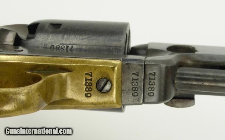 Colt 1851 Army/Navy U.S. revolver. All matching including the wedge. Cylinder scene is about 60-70% visible. All markings are sharp. Note: Grips have both cartouches but are very faint. Most Army issued Navies are well worn but this one is in very good condition. Gun has very good blue from an old refinish that looks good. Action works perfectly.