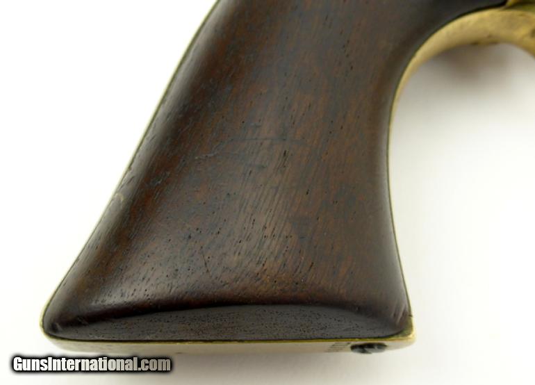 Description: Colt 1851 Army/Navy U.S. revolver. All matching including the wedge. Cylinder scene is about 60-70% visible. All markings are sharp. Note: Grips have both cartouches but are very faint. Most Army issued Navies are well worn but this one is in very good condition. Gun has very good blue from an old refinish that looks good. Action works perfectly. SOLD Antique: Yes |