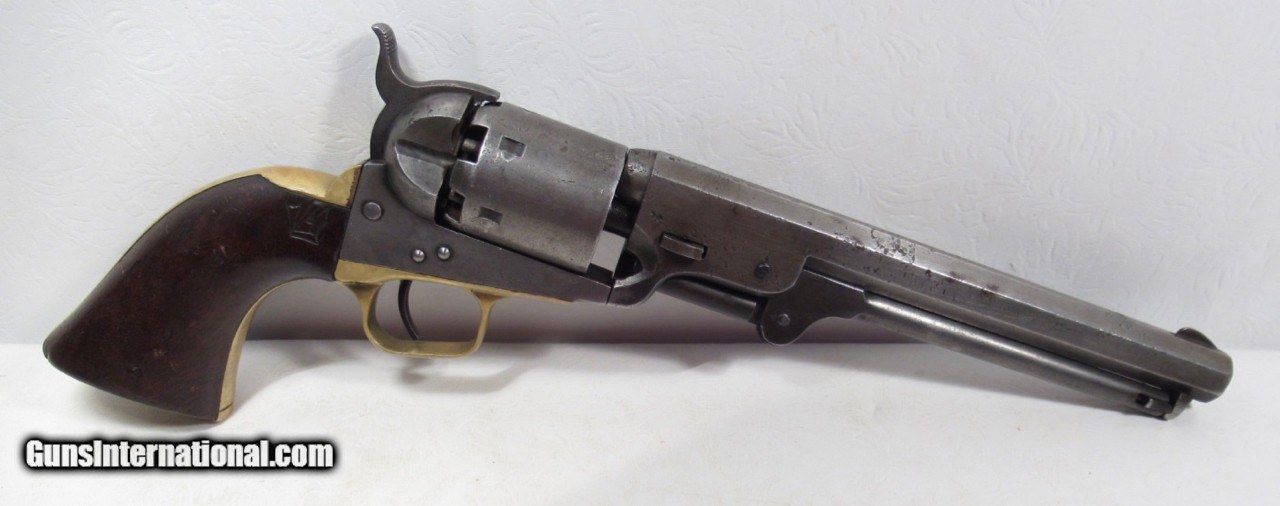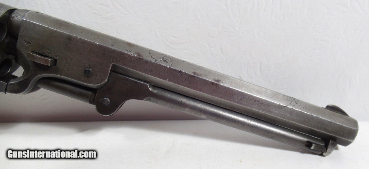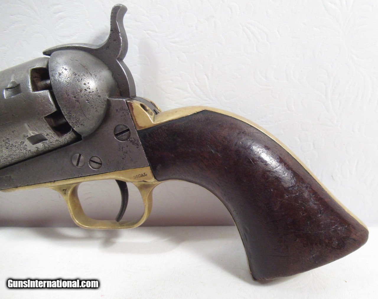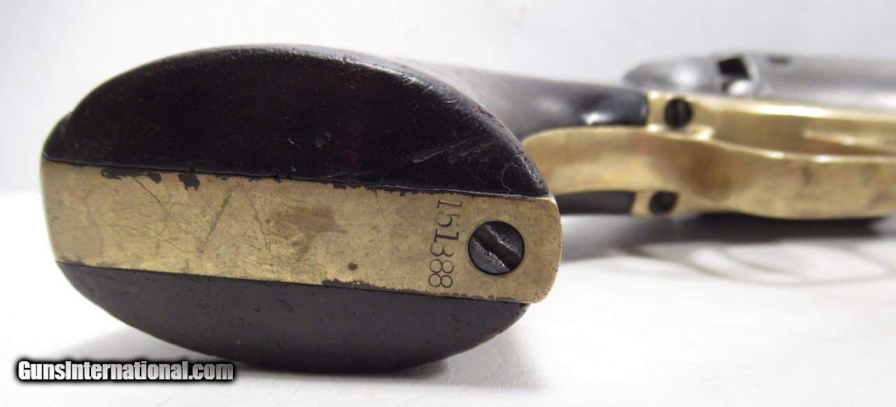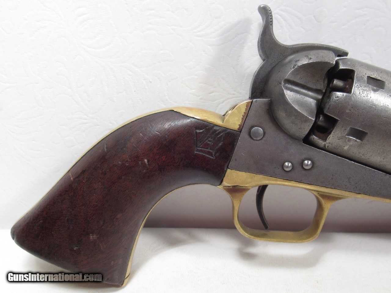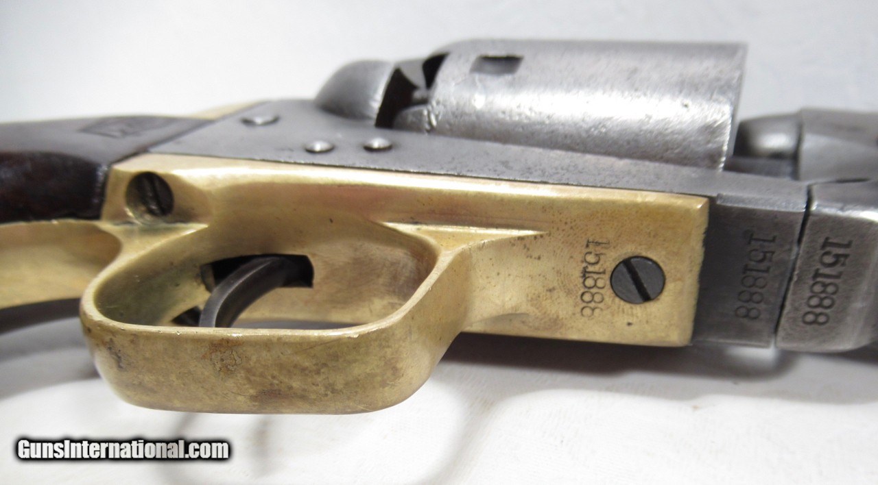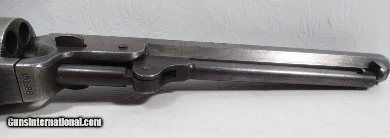 Description: ON HOLD--Colt 1851 Navy 36 Cal. Revolver; Serial No. 151888; Made 1863; Civil War Era; All Numbers Match except un-numbered wedge; Exterior pitting due to poor storage; Excellent Action; Very Strong Bore; Nice Grips; See All Photos for Condition; No Texts. Call or Email Only; PERSONAL PROPERTY of Harold Wieser; Price: $775 + $45 S&H Via FedEx Express; Price includes insured shipping; return policy: three days inspection from the date the item is received; full refund of shipping both ways ONLY IF THE ITEM IS MISREPRESENTED. SOLD Antique: Yes Manufacturer: Colt Model: 1851 Navy Serial Number: 151888 |