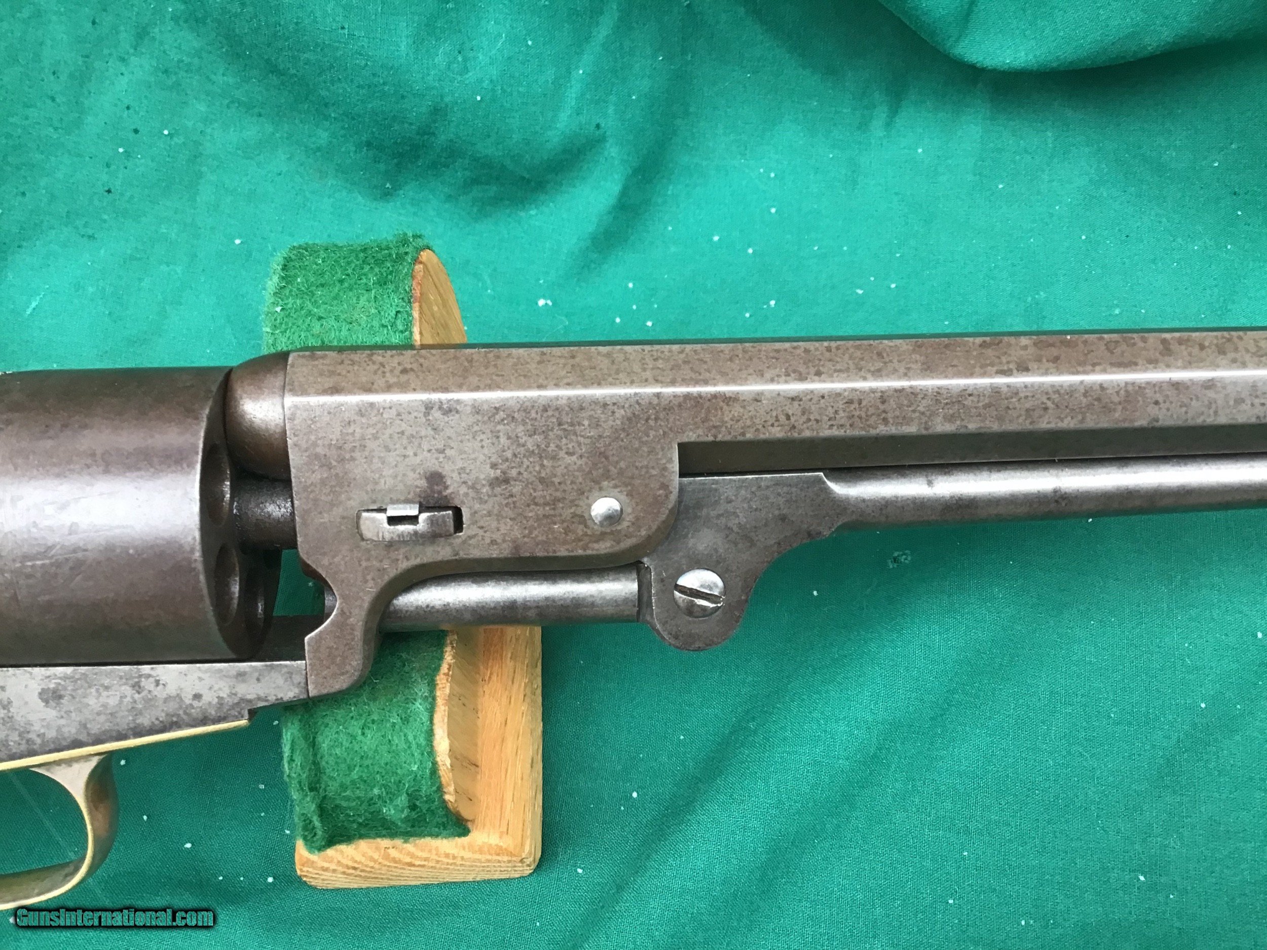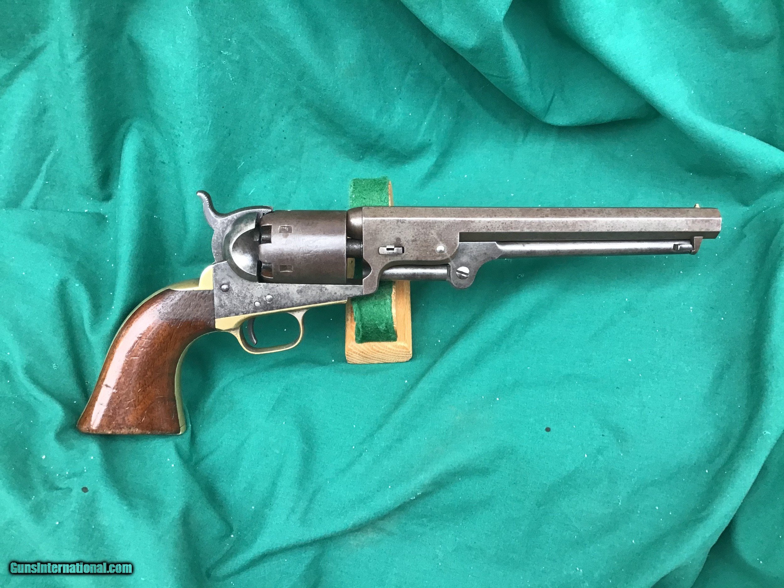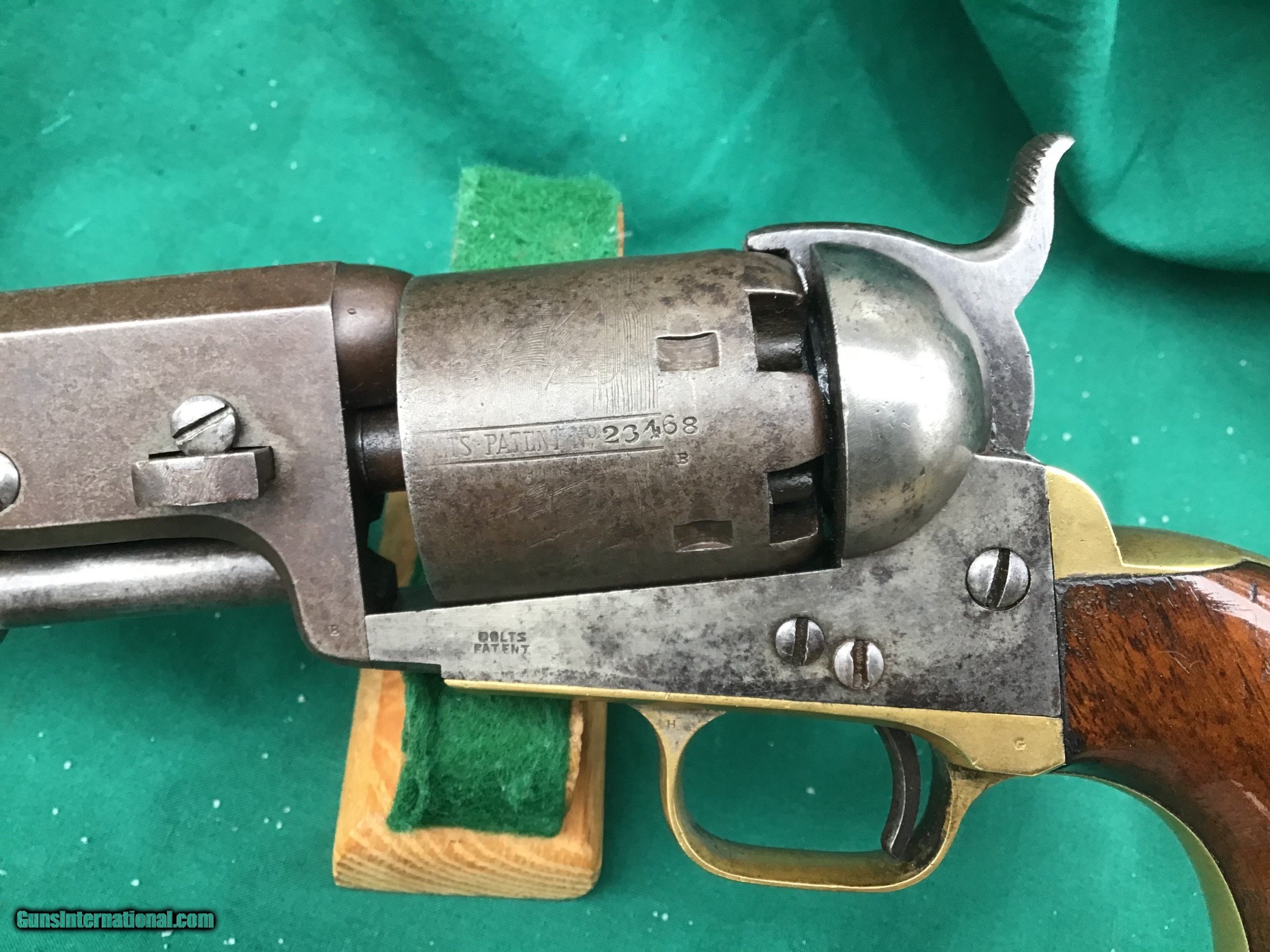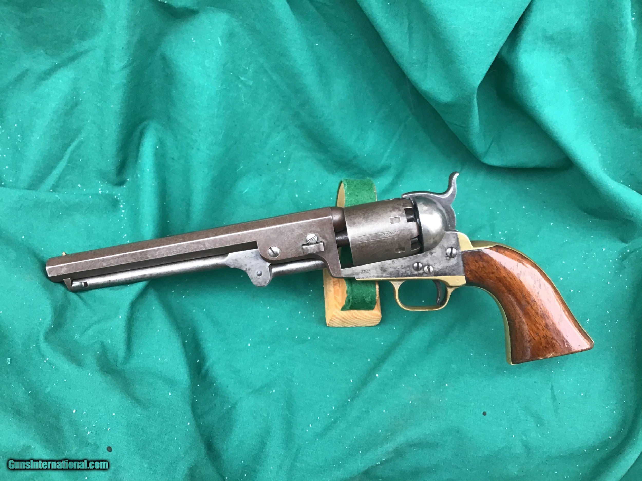 Description: Colt 1851 Navy Early 3rd Model Small Trigger Guard. .36 caliber. Serial number 23,468. All numbers match: frame, barrel, trigger guard, loading lever, cylinder, cylinder pin, backstrap, and wedge. Action functions nicely. Great cylinder scene. Grips are in very nice condition showing use but nothing out of the ordinary. Overall barrel condition is a nice even brown / gray patina. Frame has mainly molted out case colors. Very nice markings. Barrel has New York address. Just a nice untouched and all matching early Colt 1851 Navy. Antique and can be shipped directly to your doorsteps. Please feel free to ask questions. SOLD Antique: Yes |