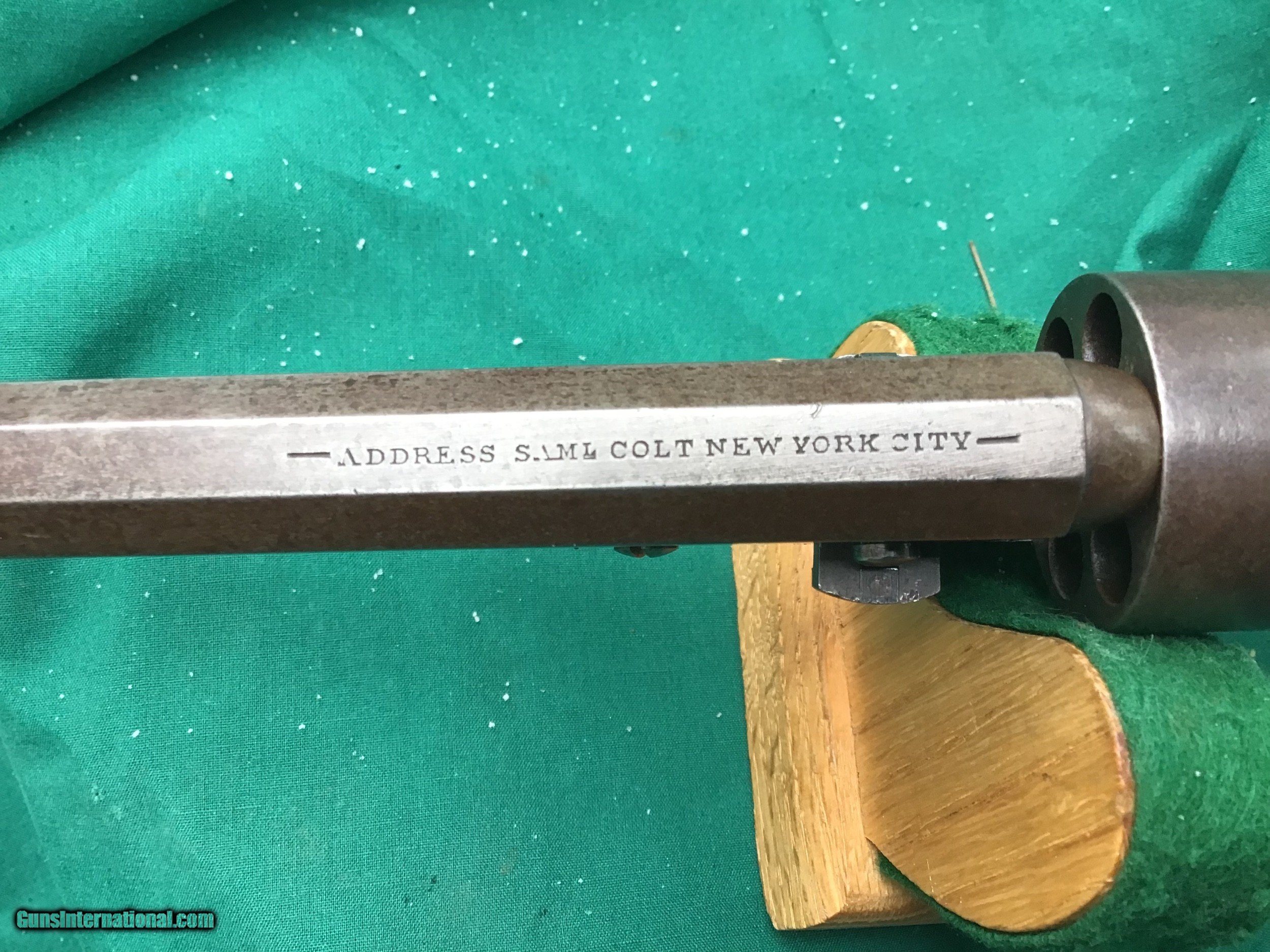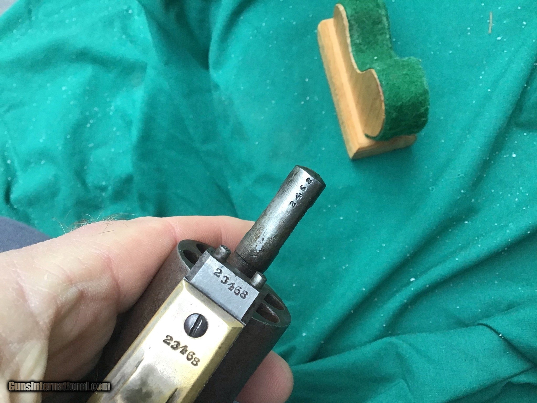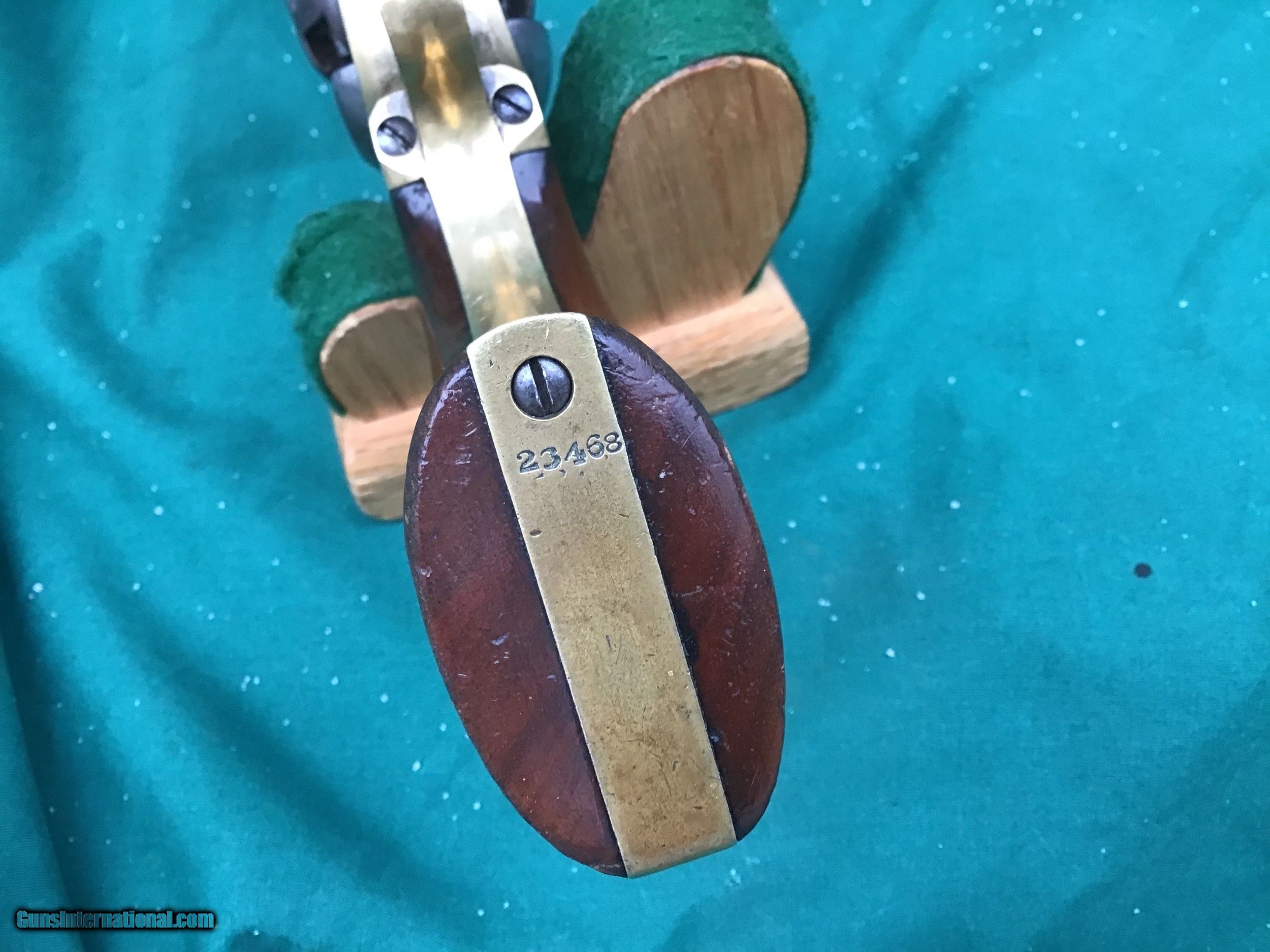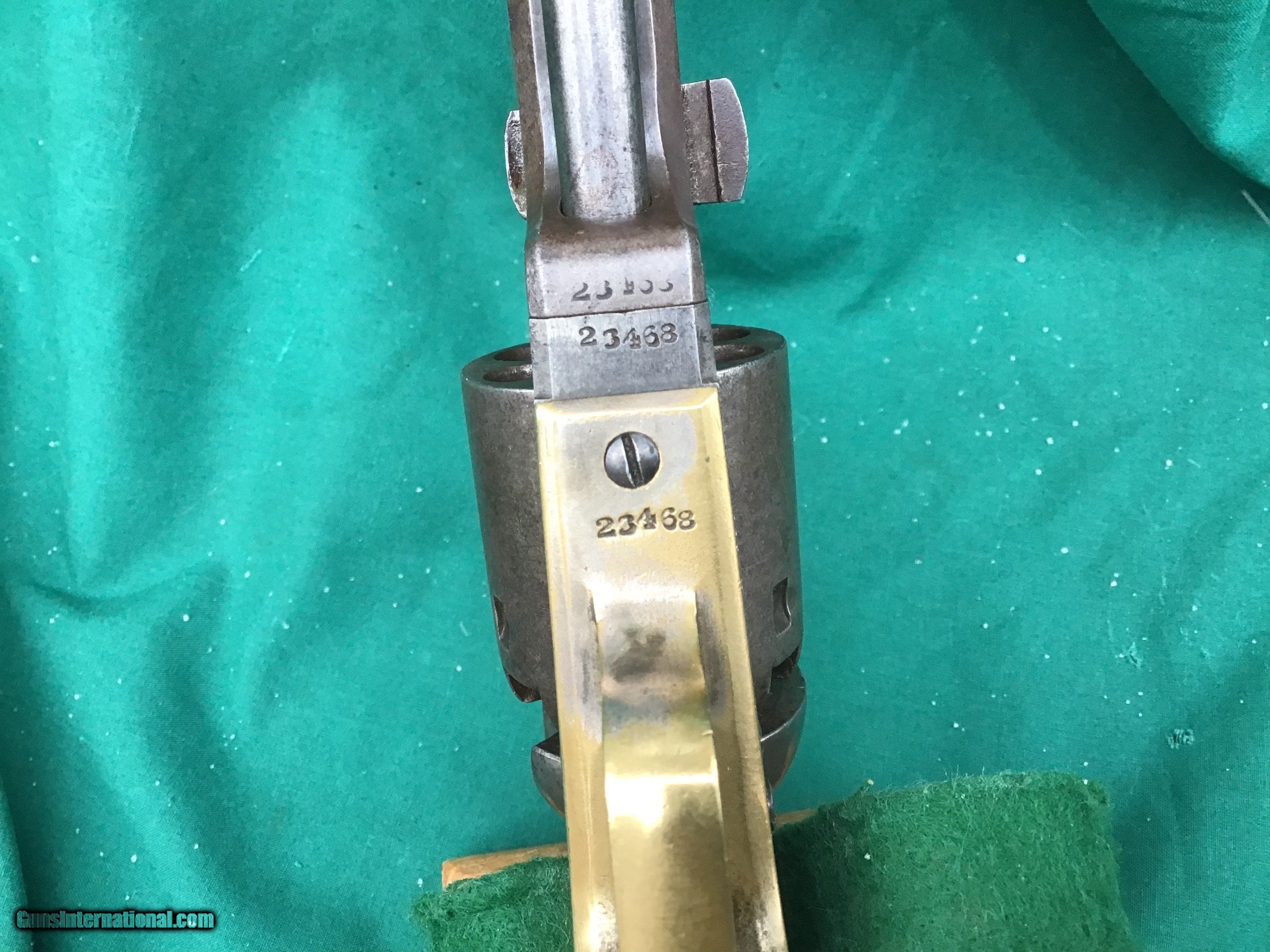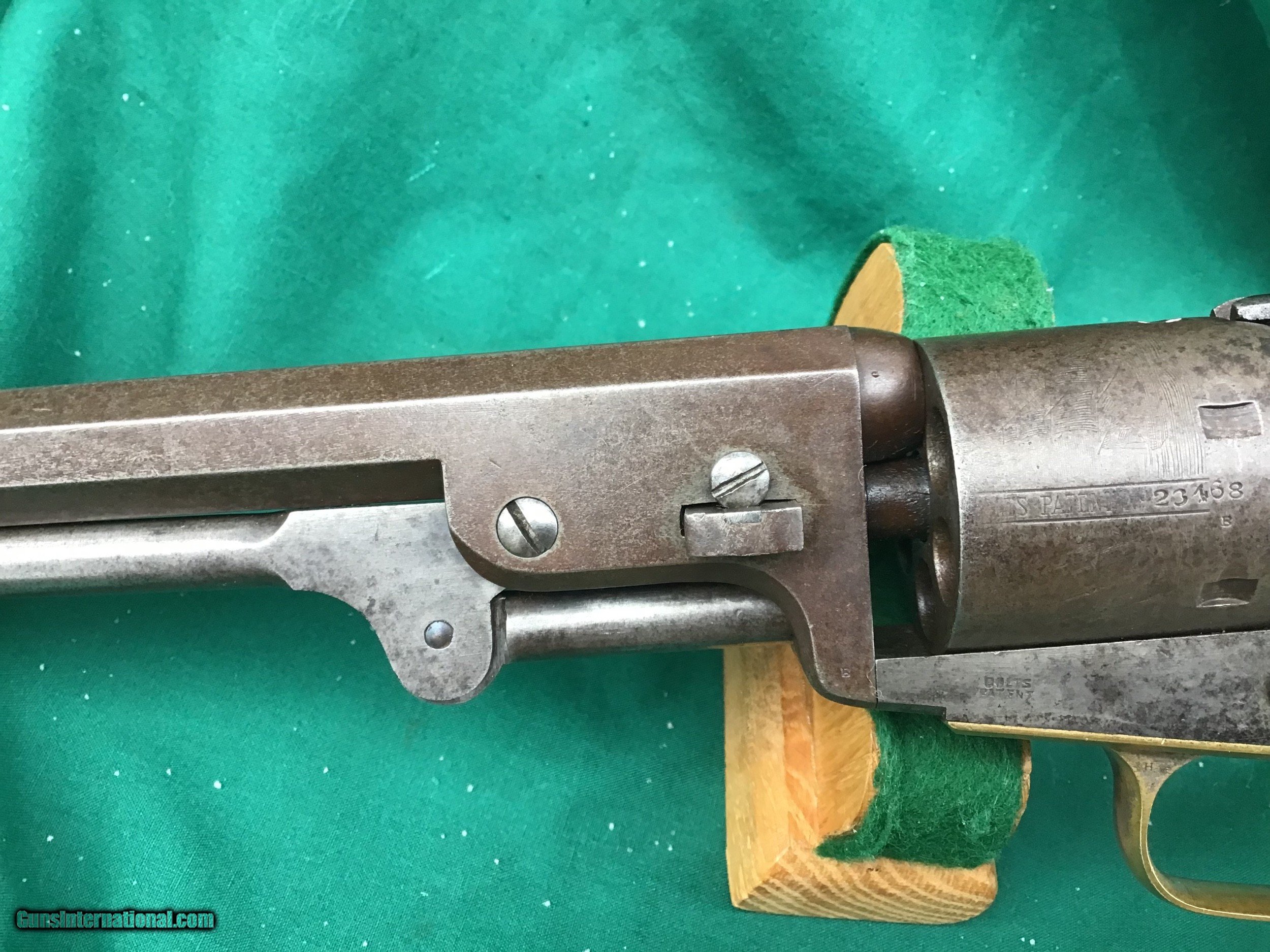 Description: Colt 1851 Navy Early 3rd Model Small Trigger Guard. .36 caliber. Serial number 23,468. All numbers match: frame, barrel, trigger guard, loading lever, cylinder, cylinder pin, backstrap, and wedge. Action functions nicely. Great cylinder scene. Grips are in very nice condition showing use but nothing out of the ordinary. Overall barrel condition is a nice even brown / gray patina. Frame has mainly molted out case colors. Very nice markings. Barrel has New York address. Just a nice untouched and all matching early Colt 1851 Navy. Antique and can be shipped directly to your doorsteps. Please feel free to ask questions. SOLD Antique: Yes |