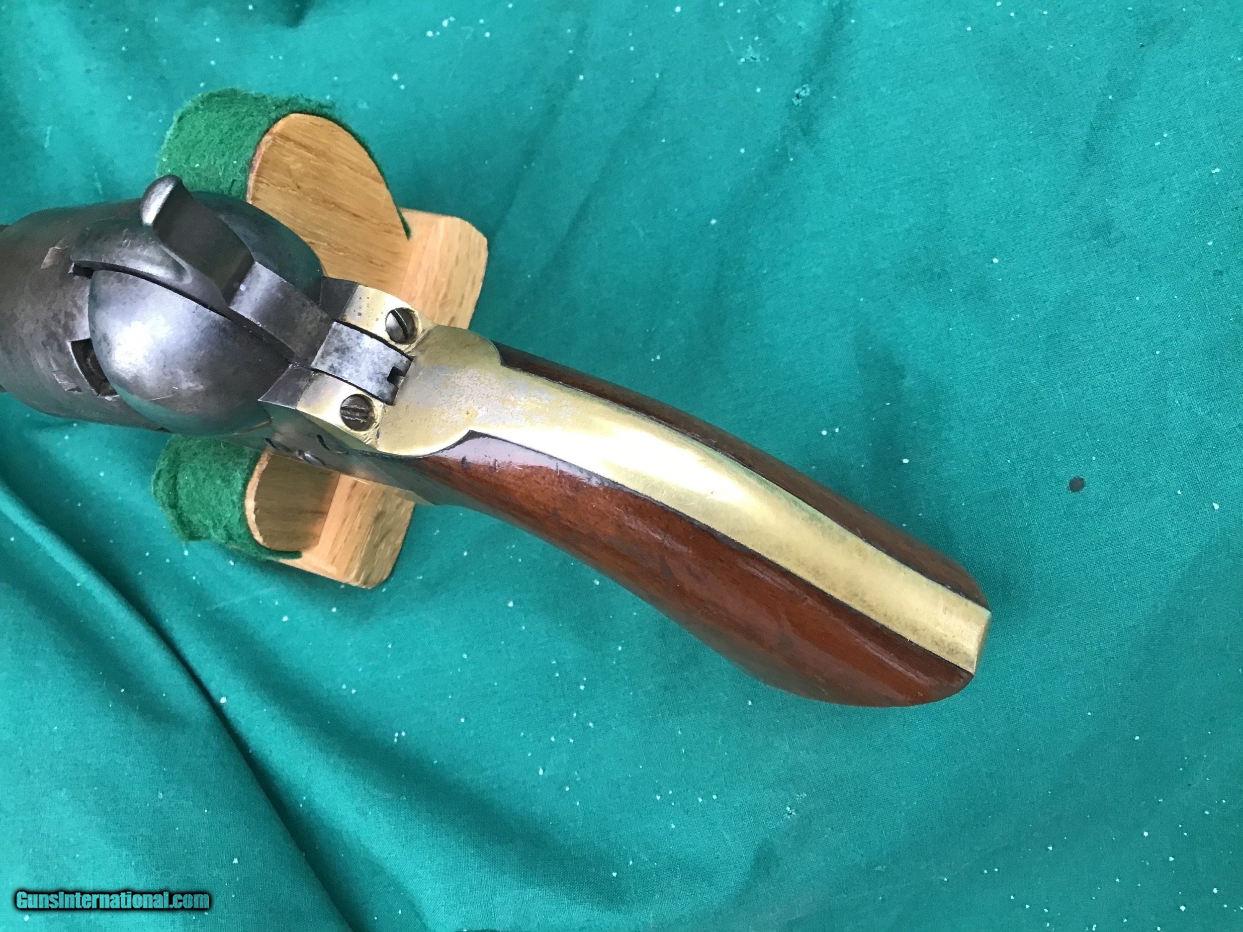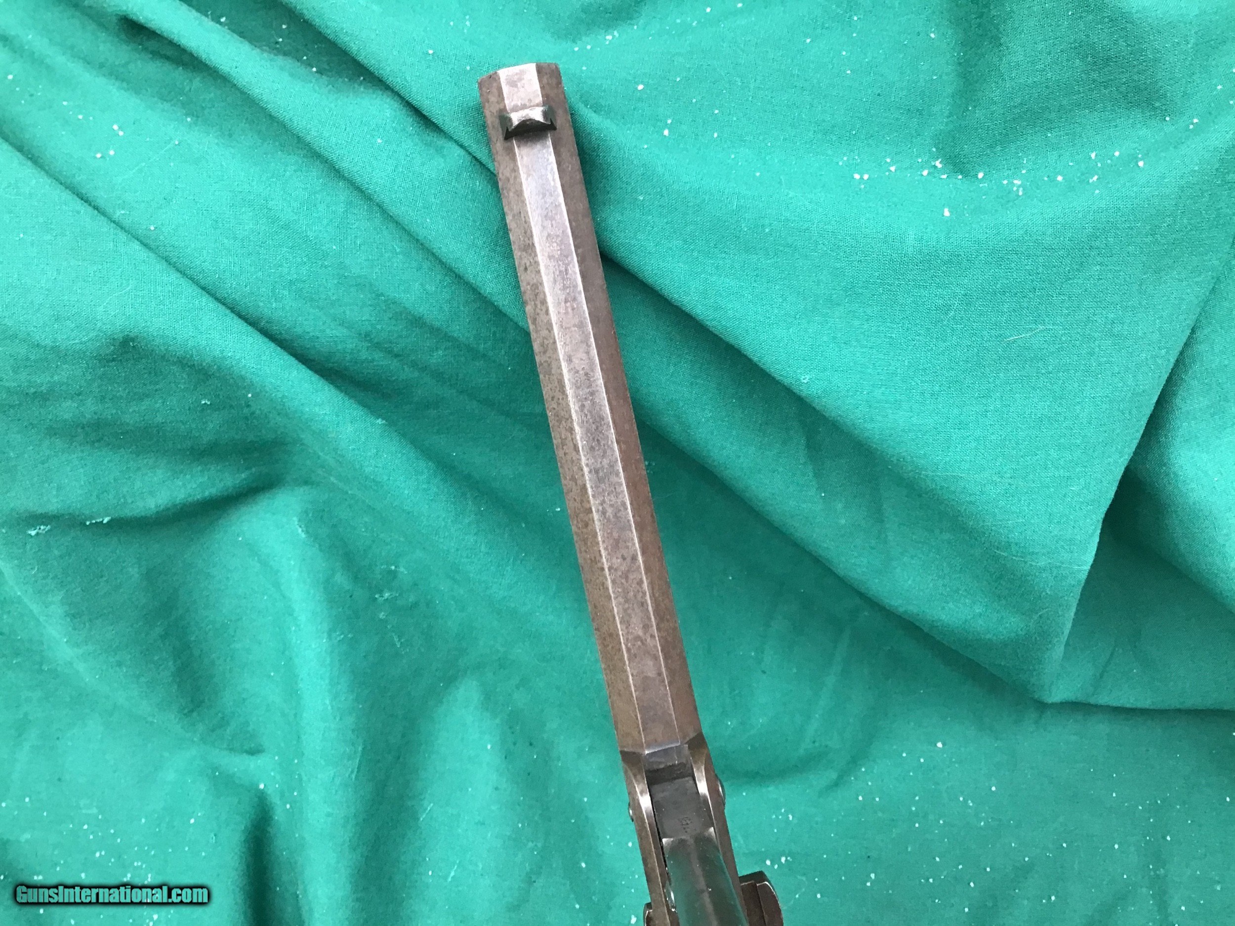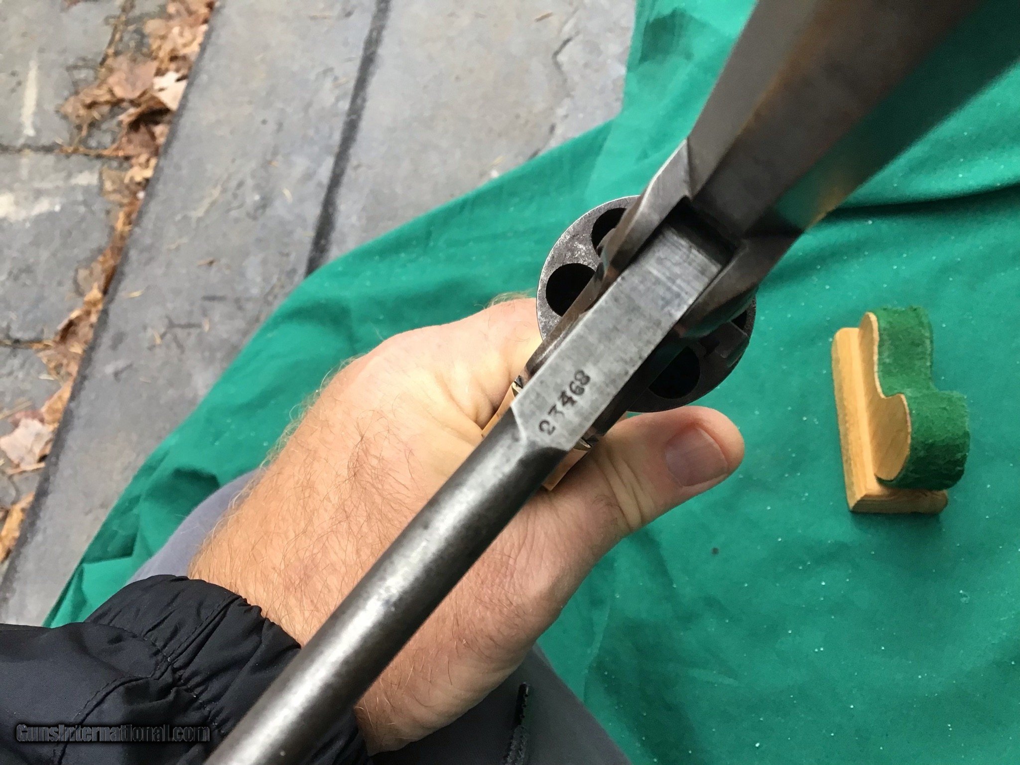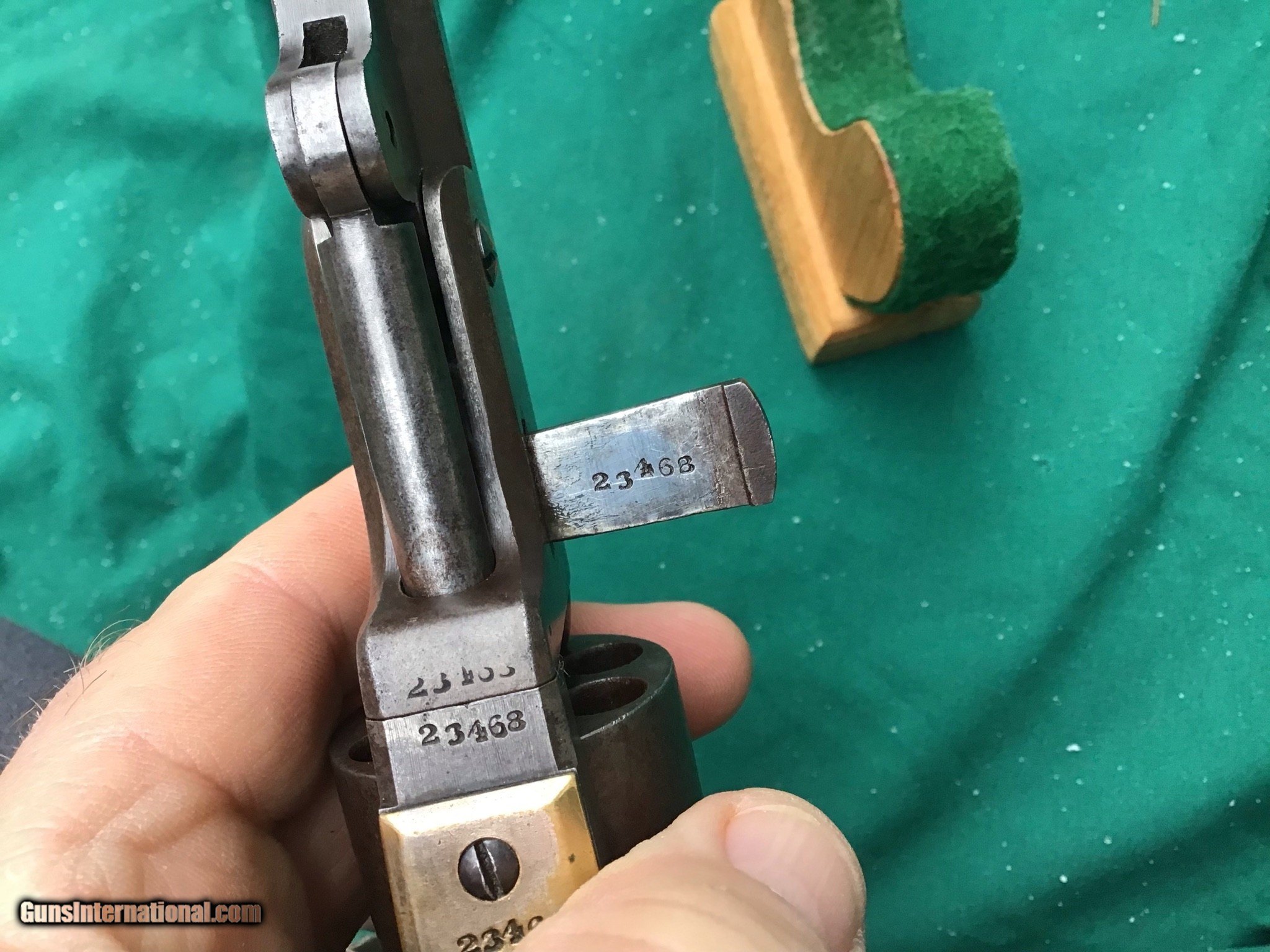 Description: Colt 1851 Navy Early 3rd Model Small Trigger Guard. .36 caliber. Serial number 23,468. All numbers match: frame, barrel, trigger guard, loading lever, cylinder, cylinder pin, backstrap, and wedge. Action functions nicely. Great cylinder scene. Grips are in very nice condition showing use but nothing out of the ordinary. Overall barrel condition is a nice even brown / gray patina. Frame has mainly molted out case colors. Very nice markings. Barrel has New York address. Just a nice untouched and all matching early Colt 1851 Navy. Antique and can be shipped directly to your doorsteps. Please feel free to ask questions. SOLD Antique: Yes |