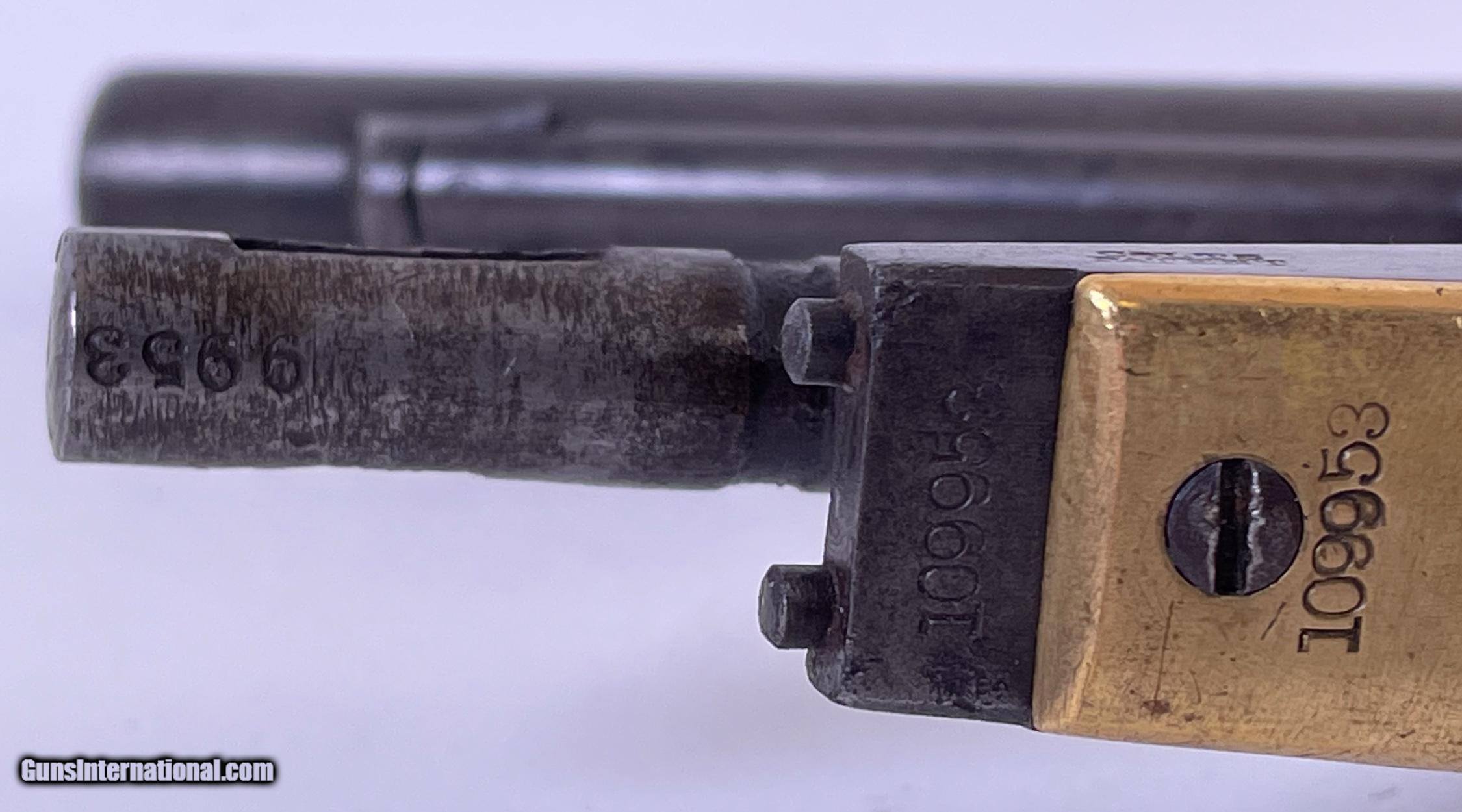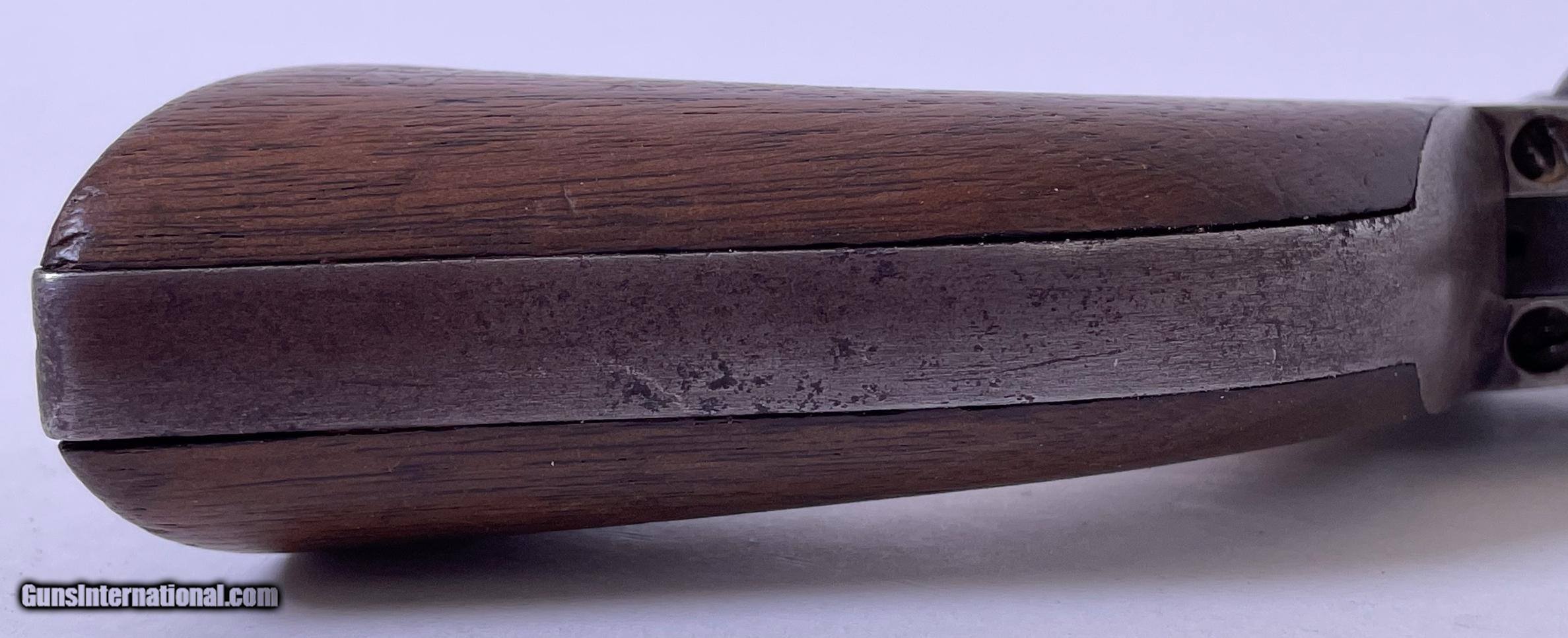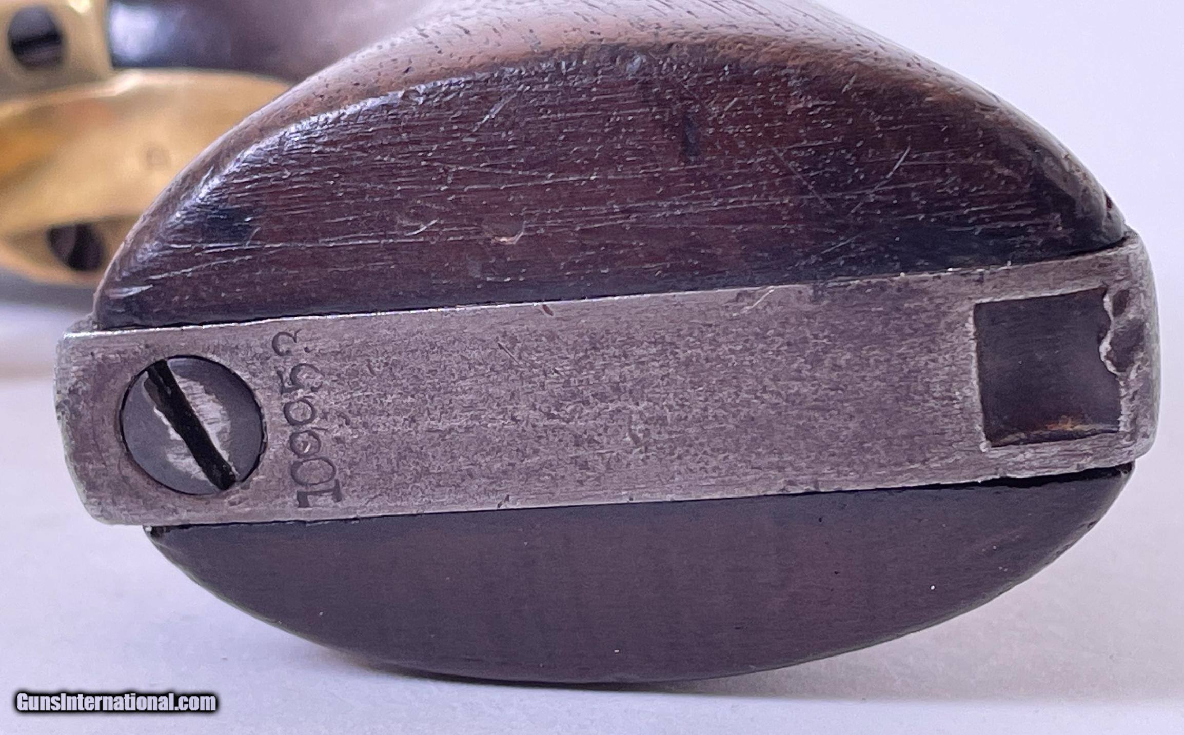 Description: All serial numbers match including the wedge. Made 1863 during the Civil War. Good bore and action 44 caliber percussion. See photos for condition. SOLD Antique: Yes Manufacturer: Colt Model: 1860 Army Serial Number: 109953 Barrel Length: 8 Manufacture Date: 1863 |